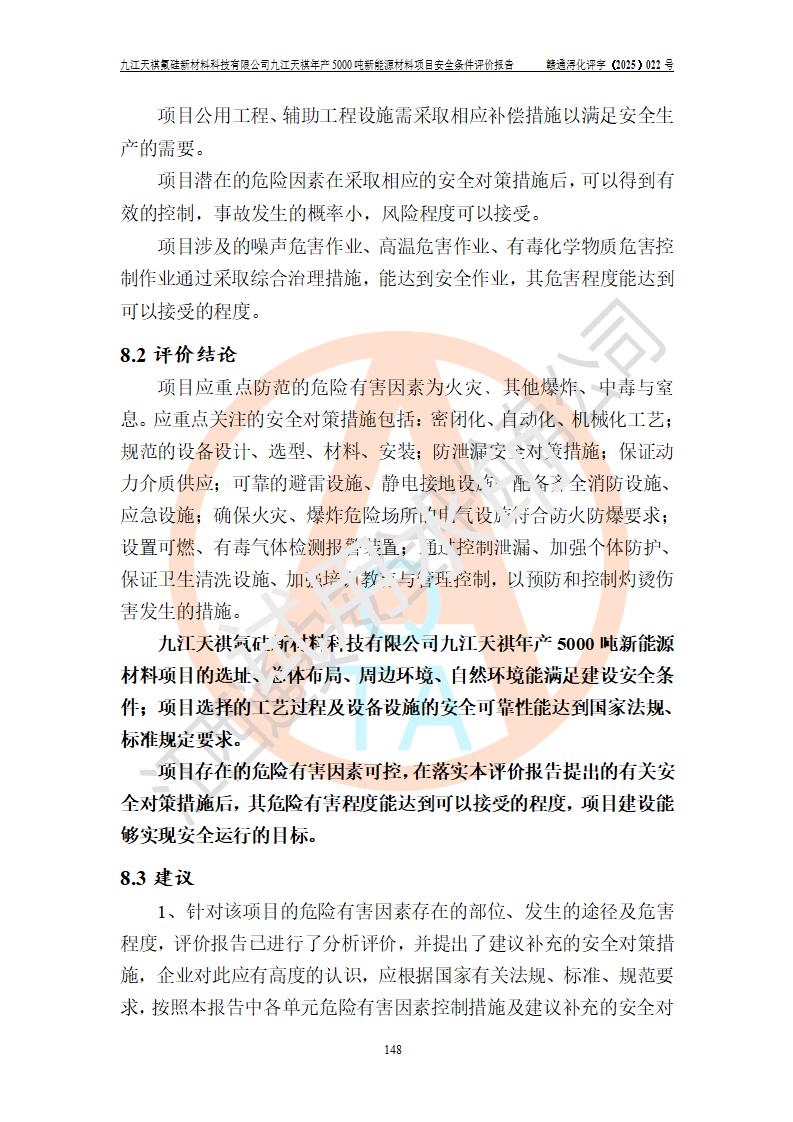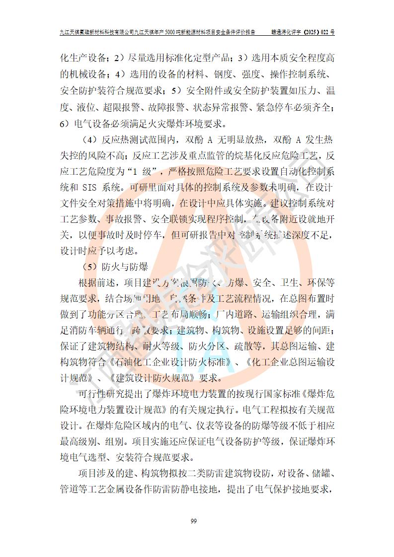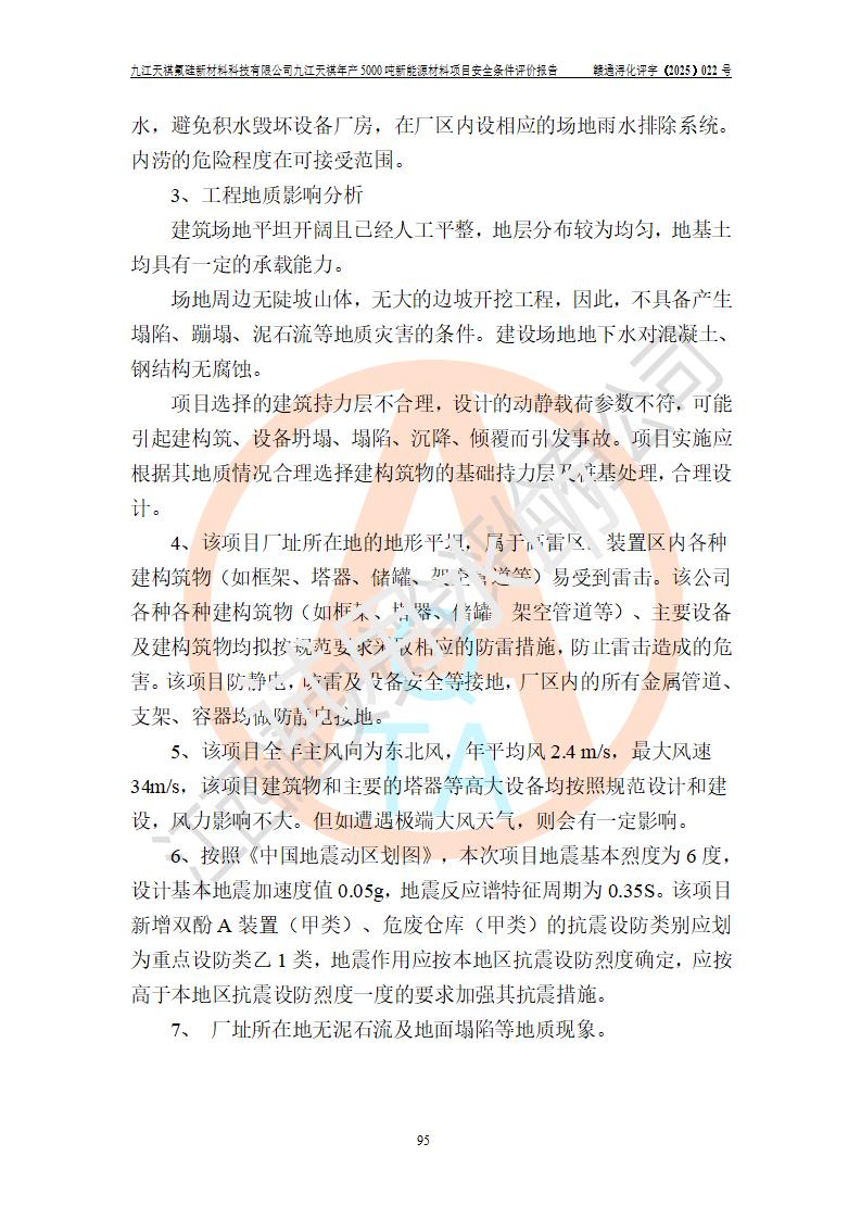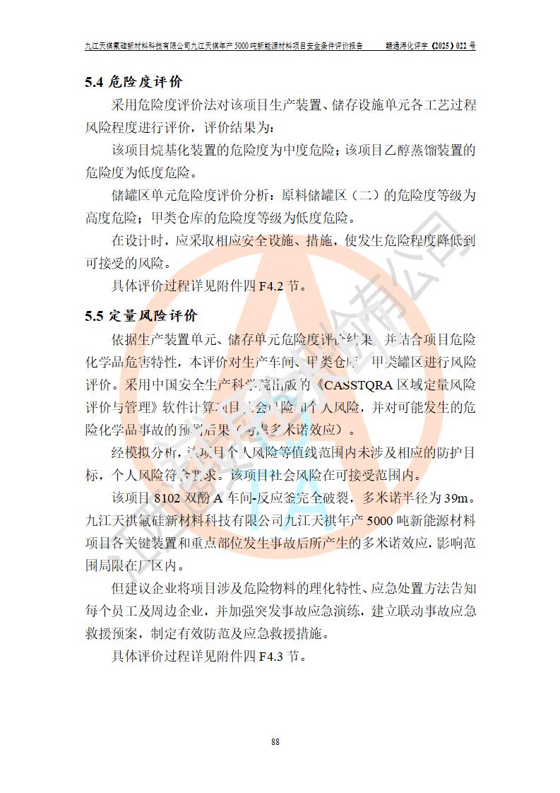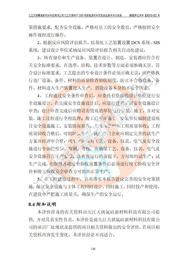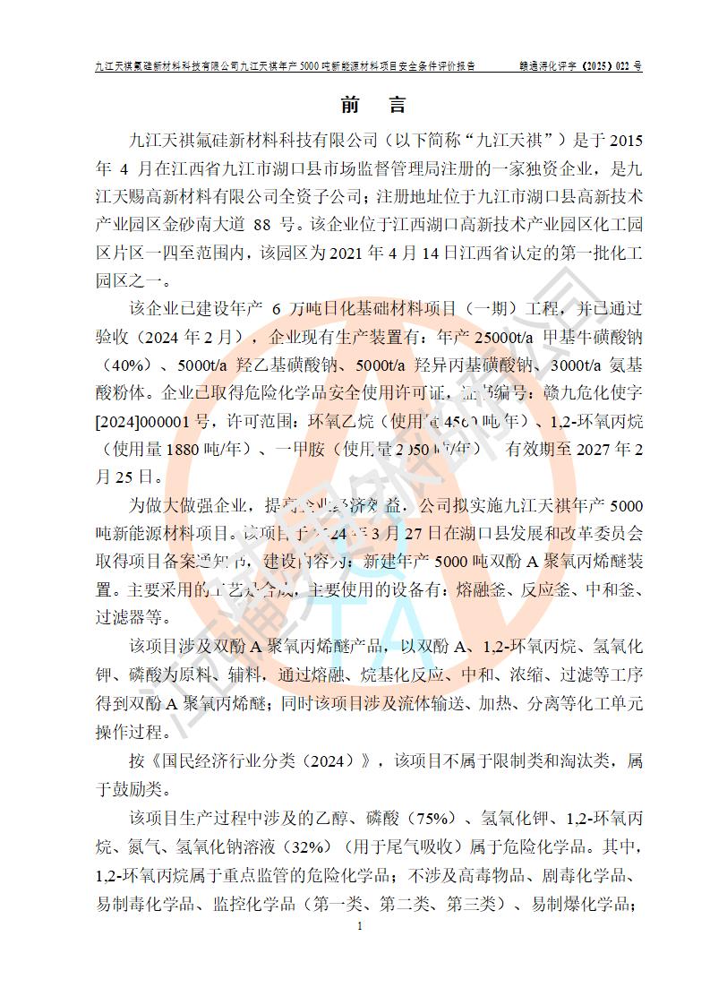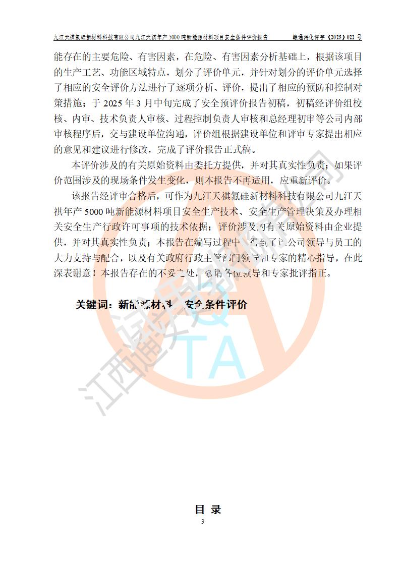 九江天祺氟硅新材料科技有限公司九江天祺年產5000 噸新能源材料項目安全條件評價報告