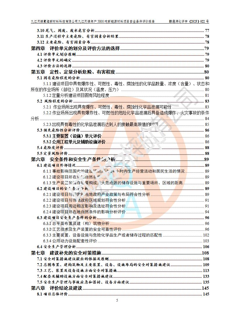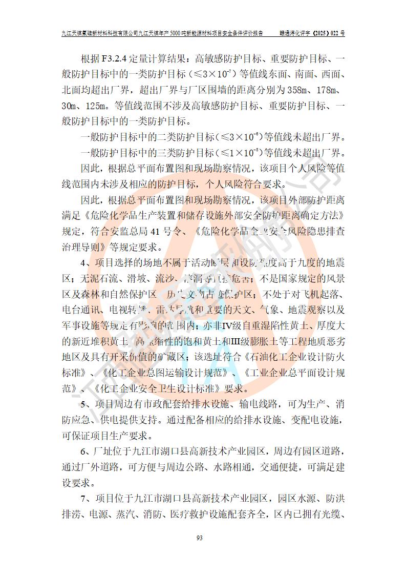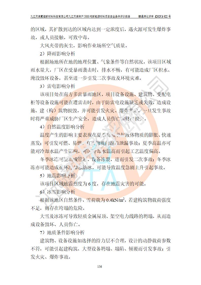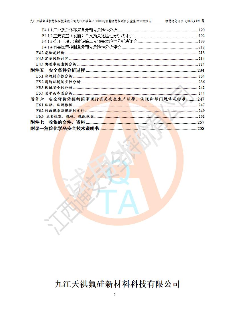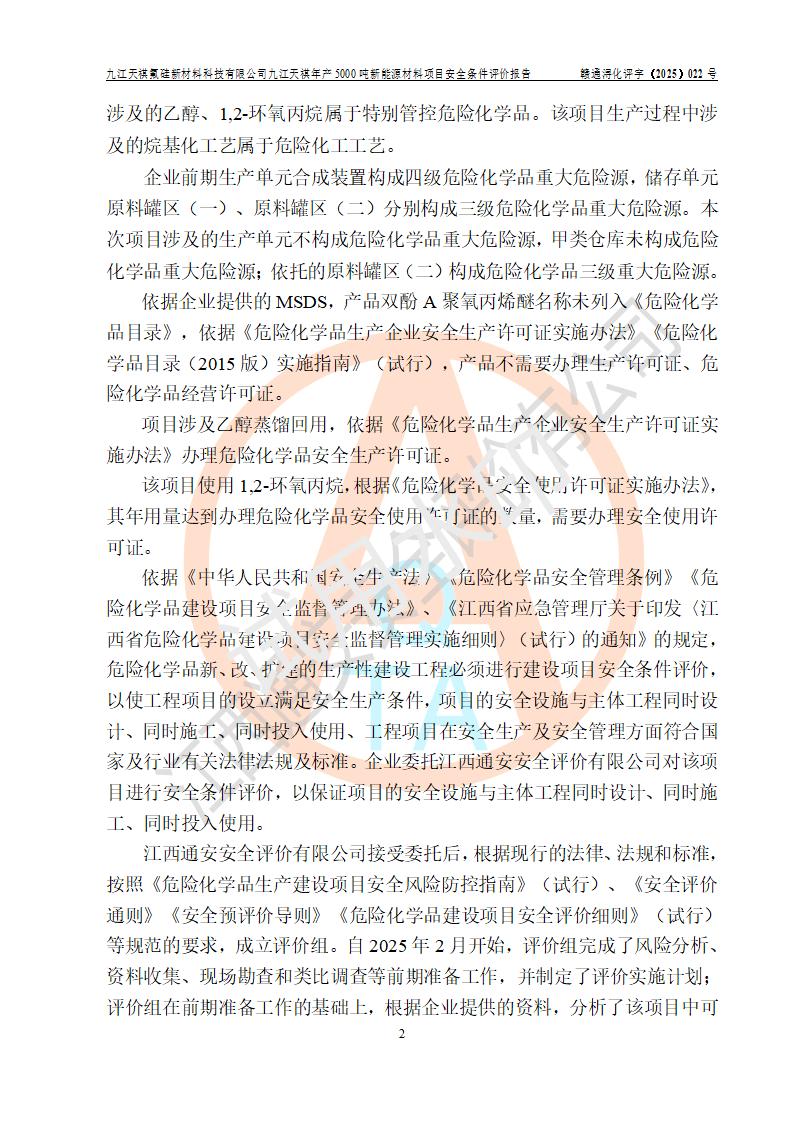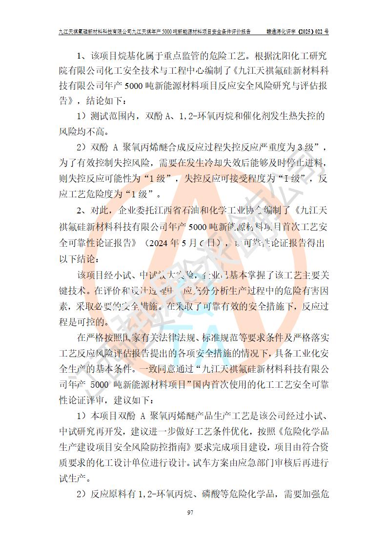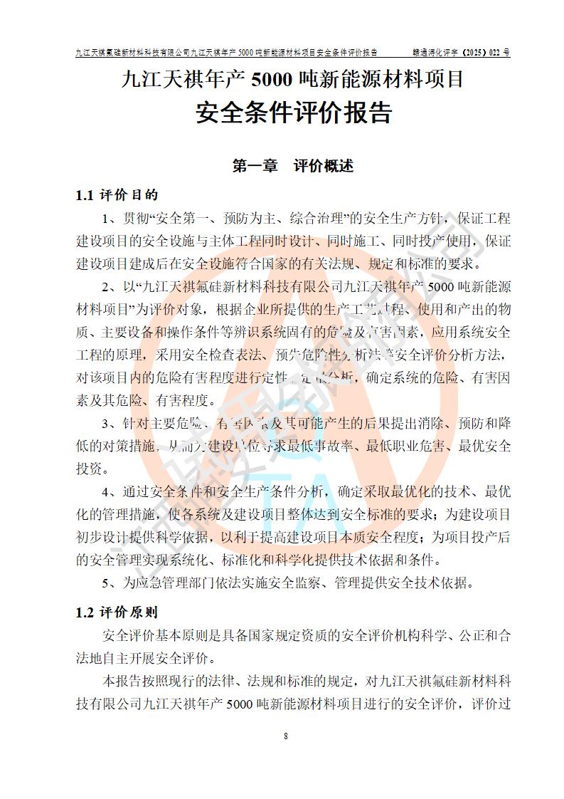 九江天祺氟硅新材料科技有限公司九江天祺年產5000 噸新能源材料項目安全條件評價報告