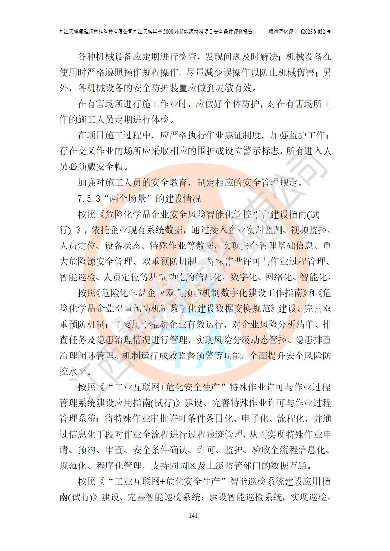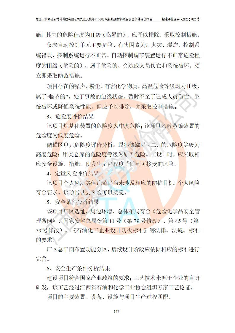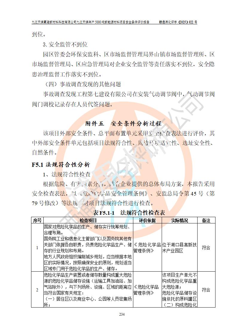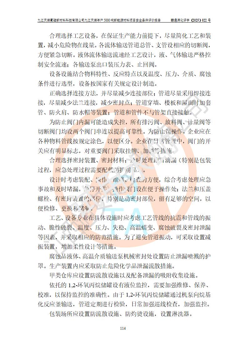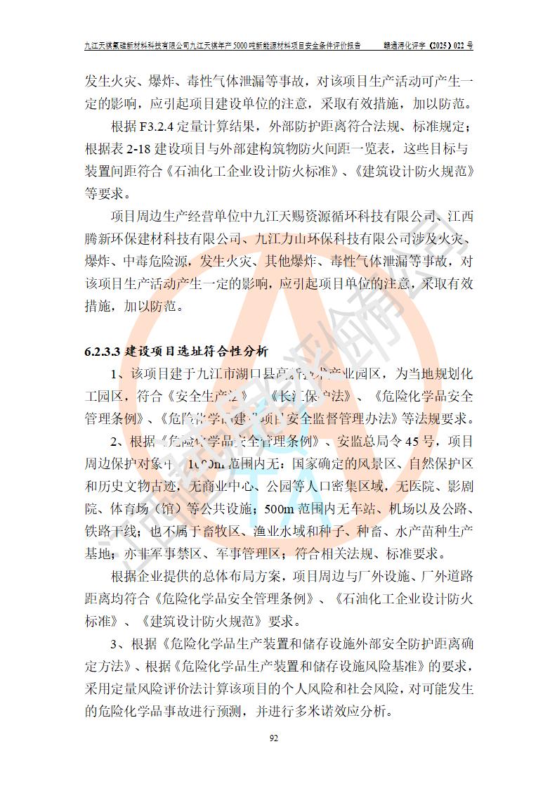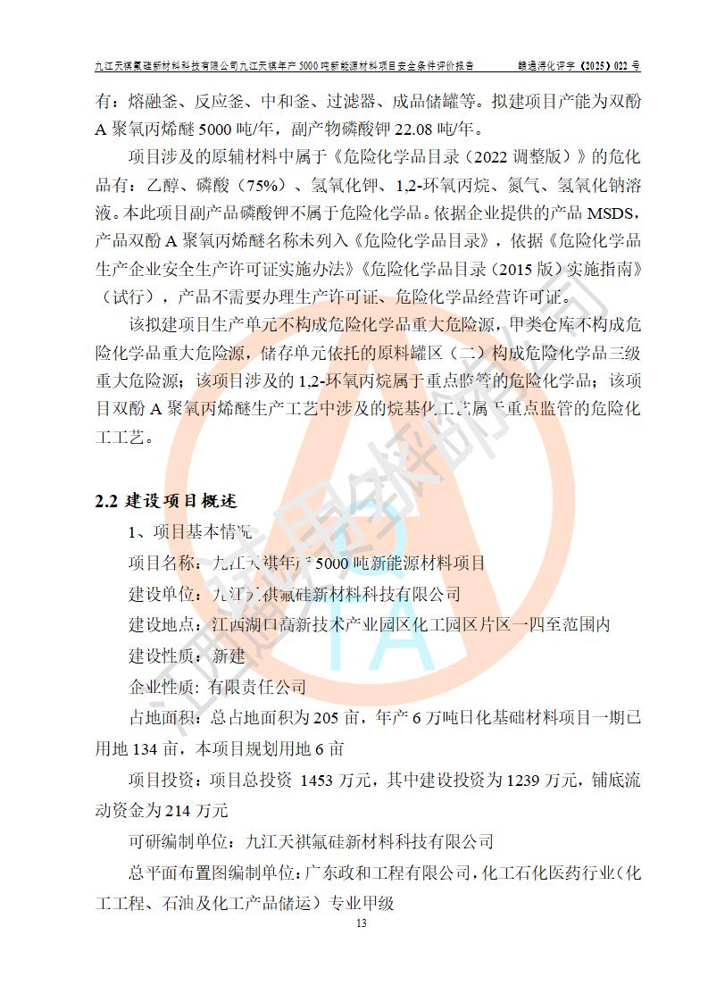 九江天祺氟硅新材料科技有限公司九江天祺年產5000 噸新能源材料項目安全條件評價報告
