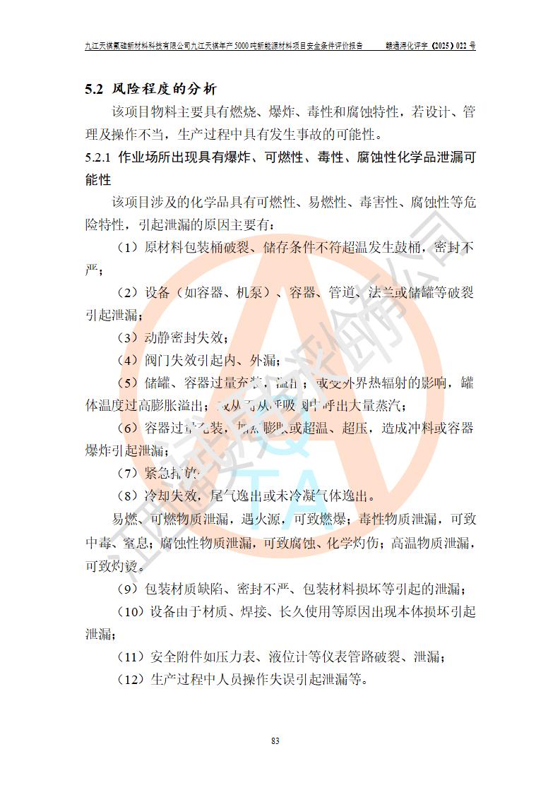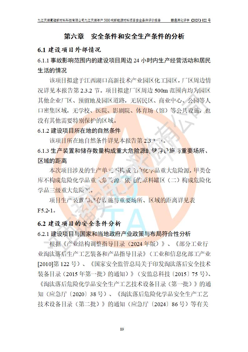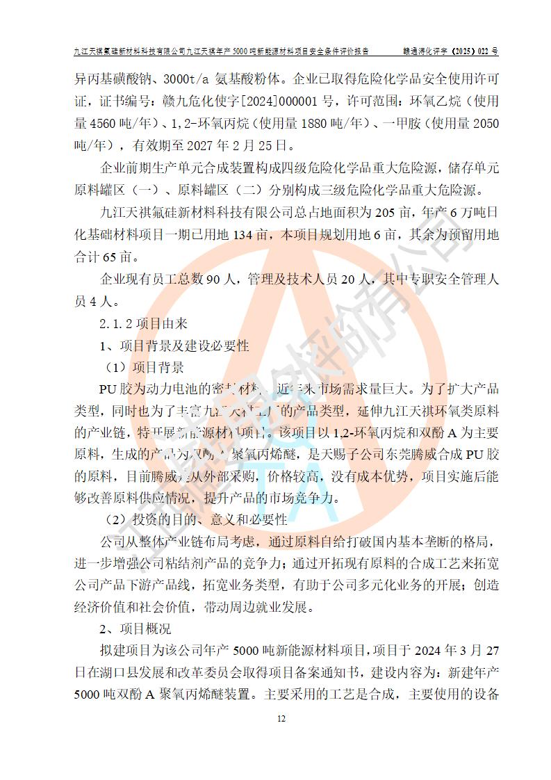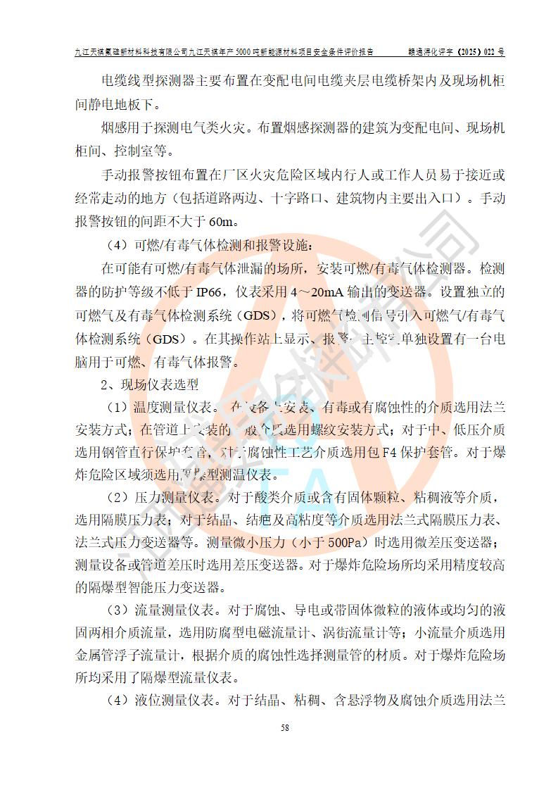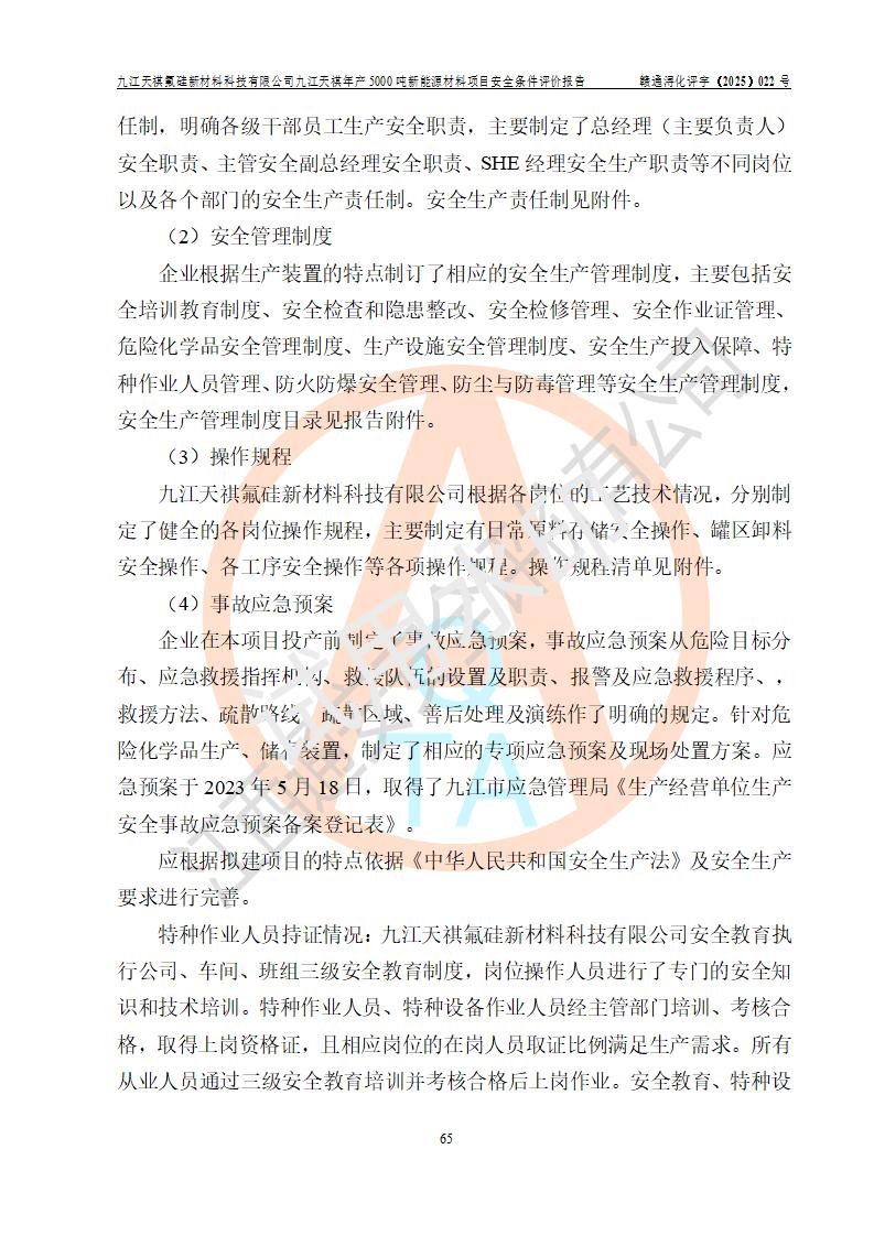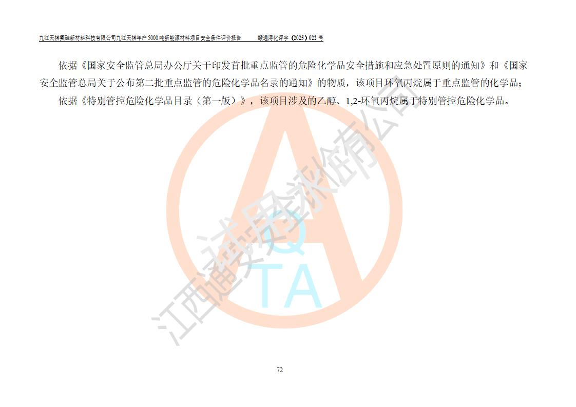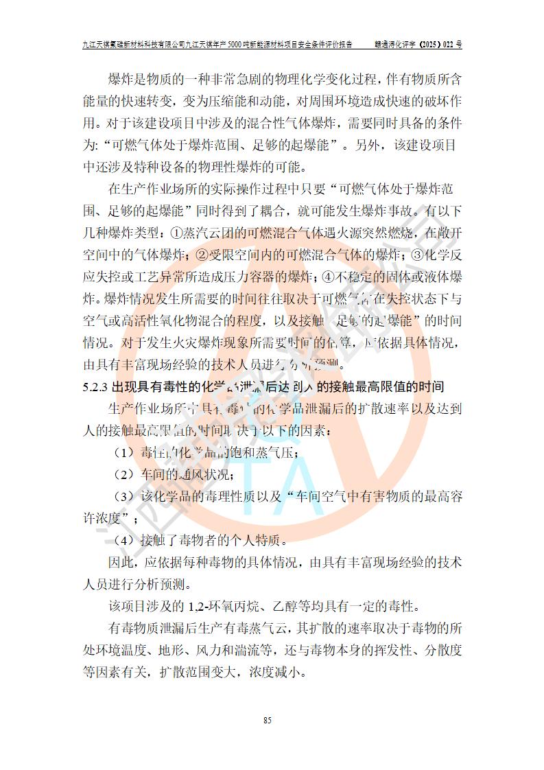 九江天祺氟硅新材料科技有限公司九江天祺年產5000 噸新能源材料項目安全條件評價報告