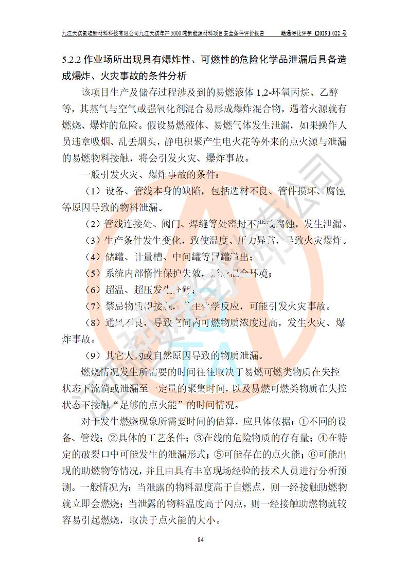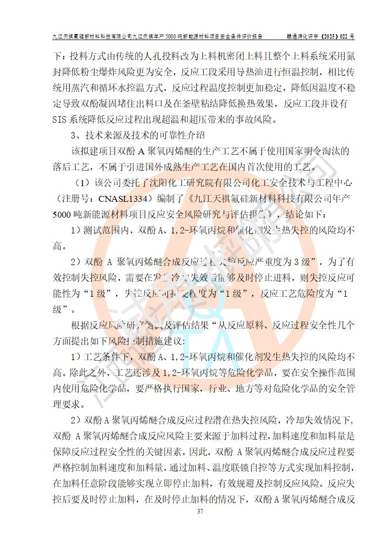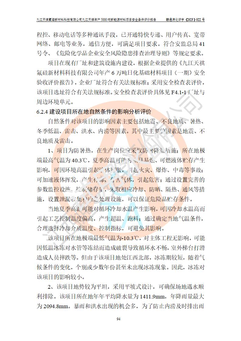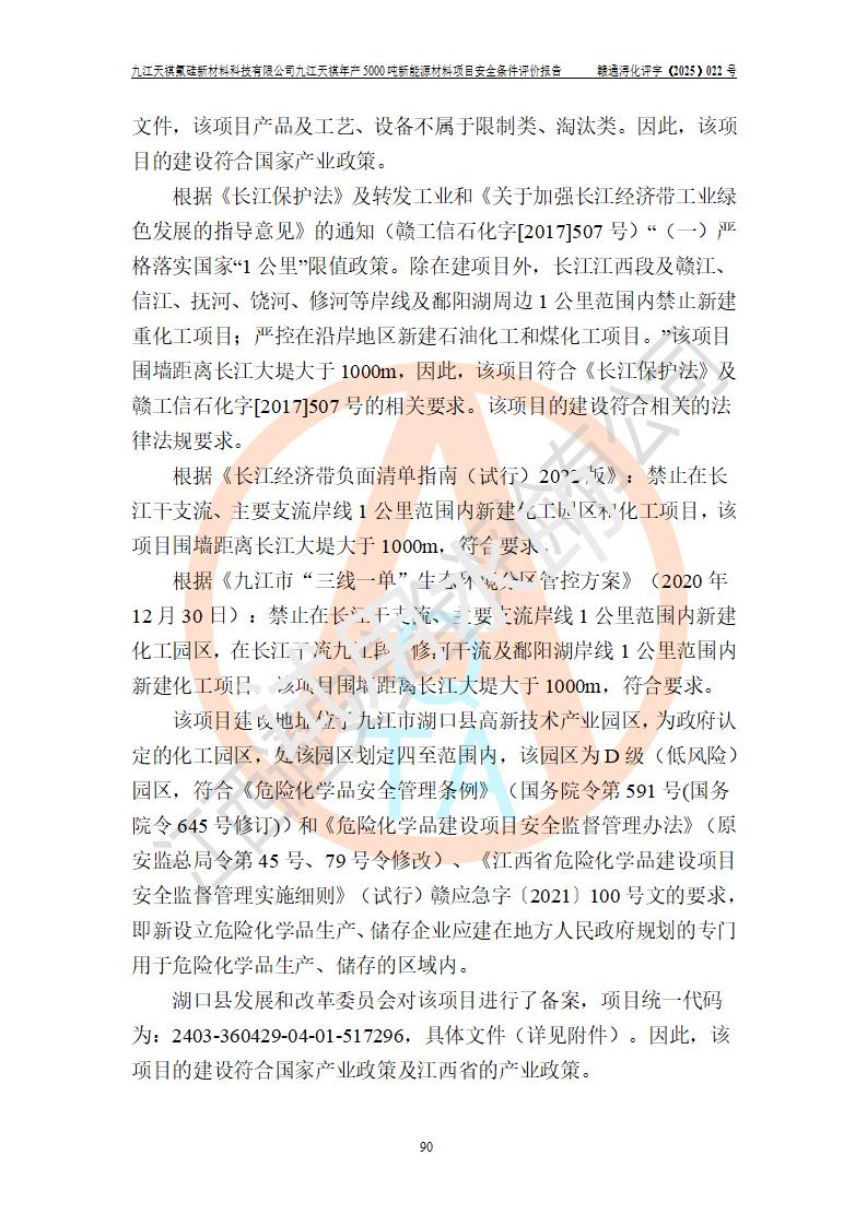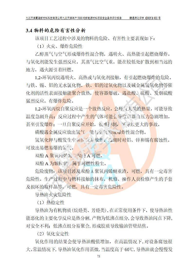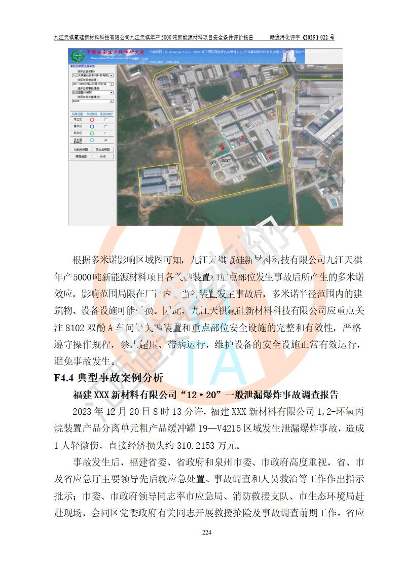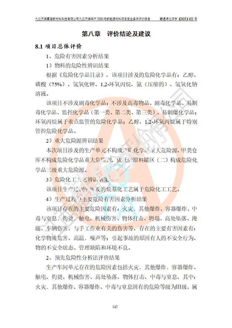 九江天祺氟硅新材料科技有限公司九江天祺年產5000 噸新能源材料項目安全條件評價報告