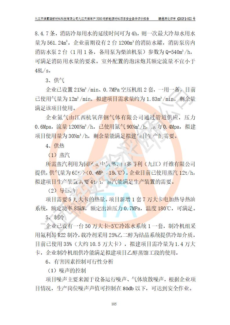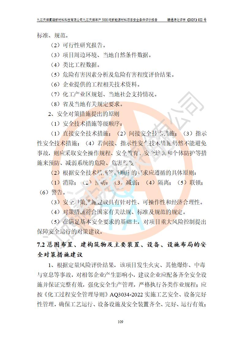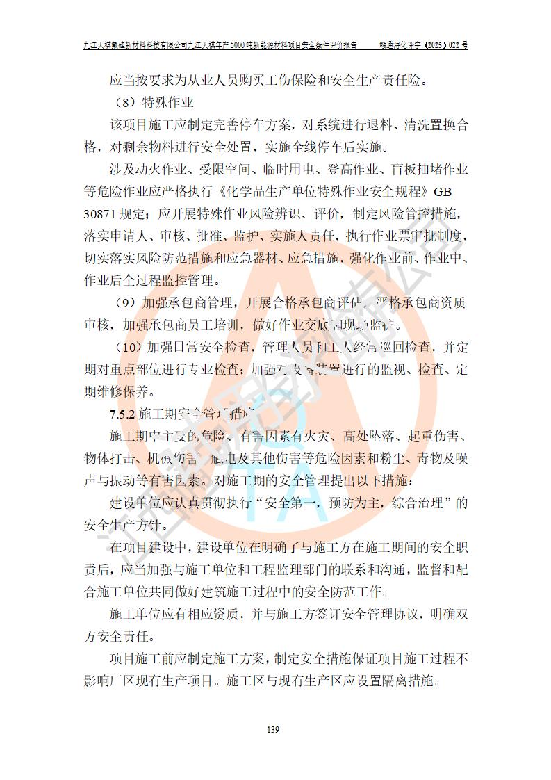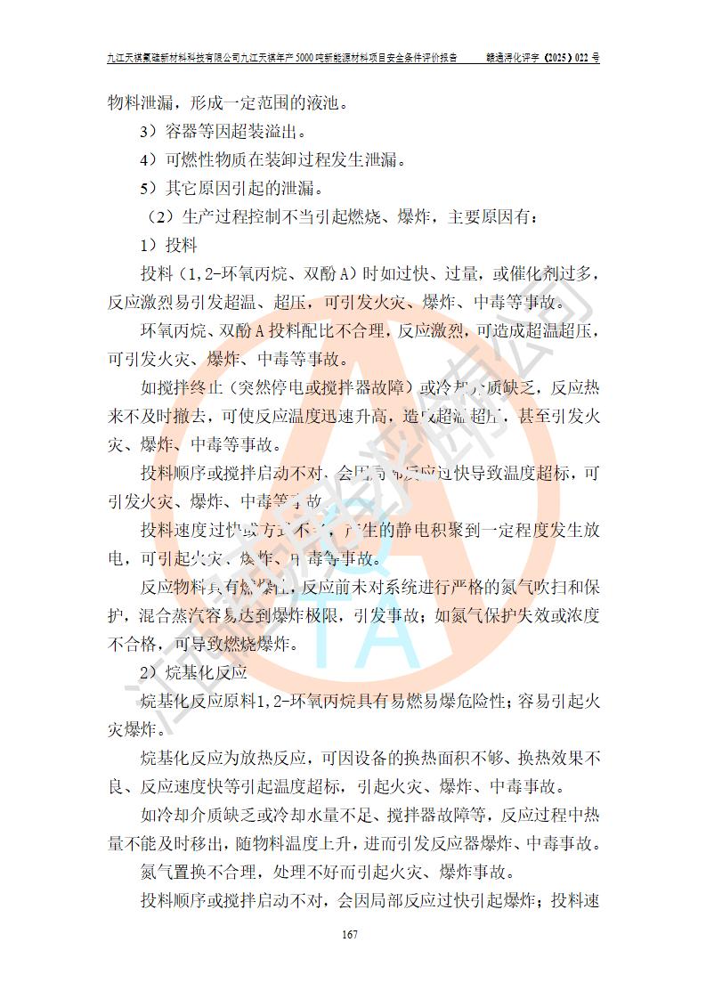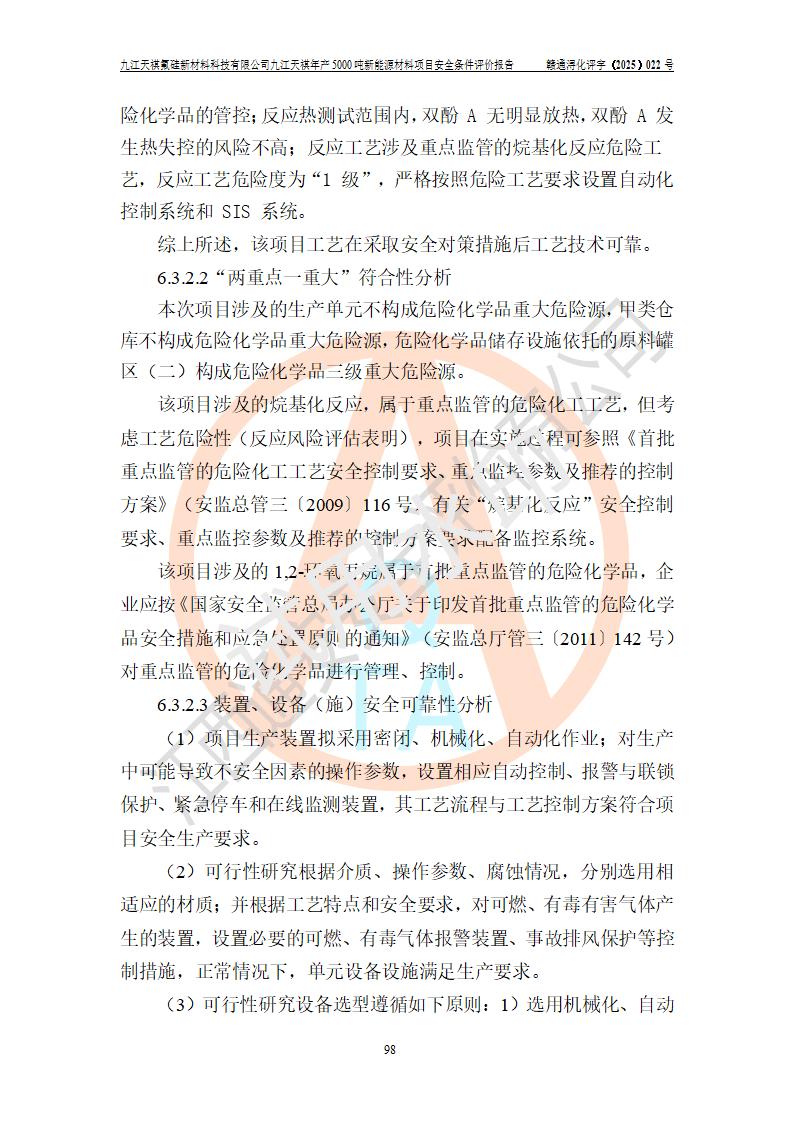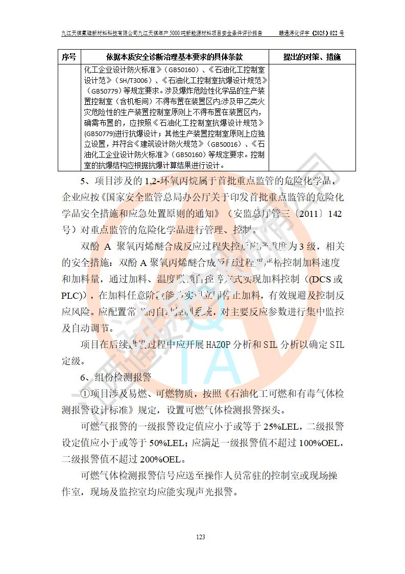 九江天祺氟硅新材料科技有限公司九江天祺年產5000 噸新能源材料項目安全條件評價報告