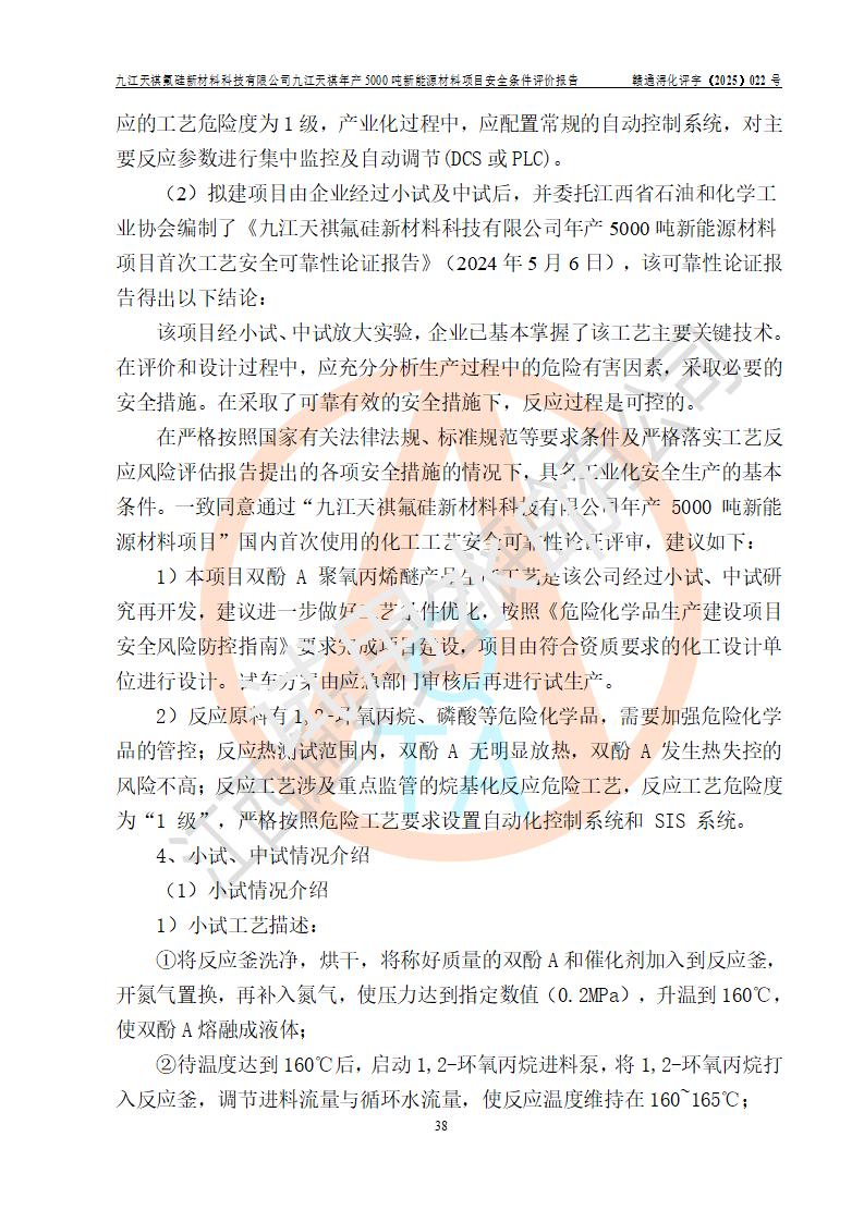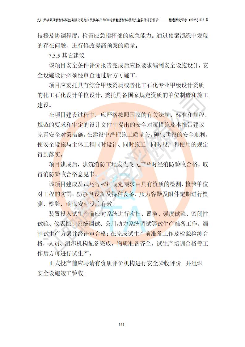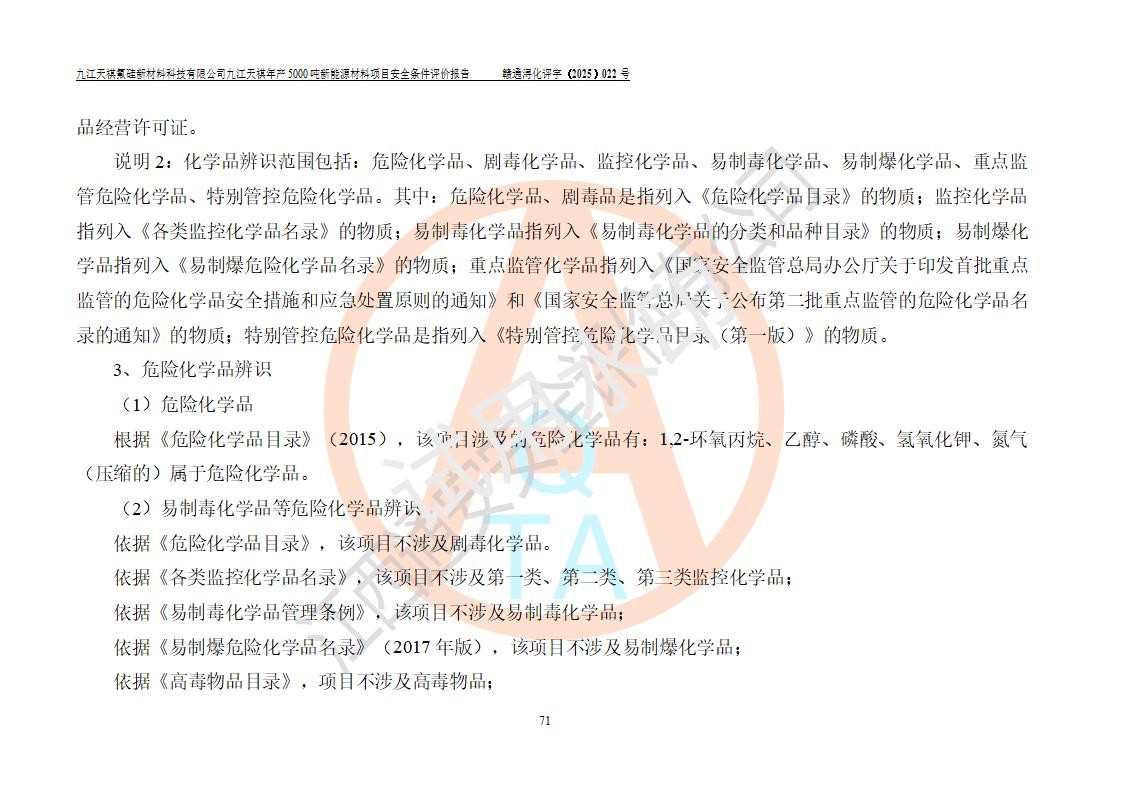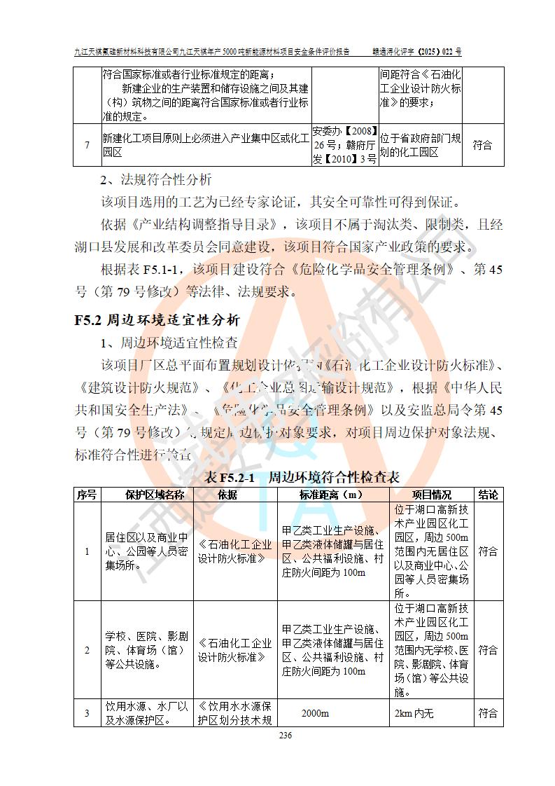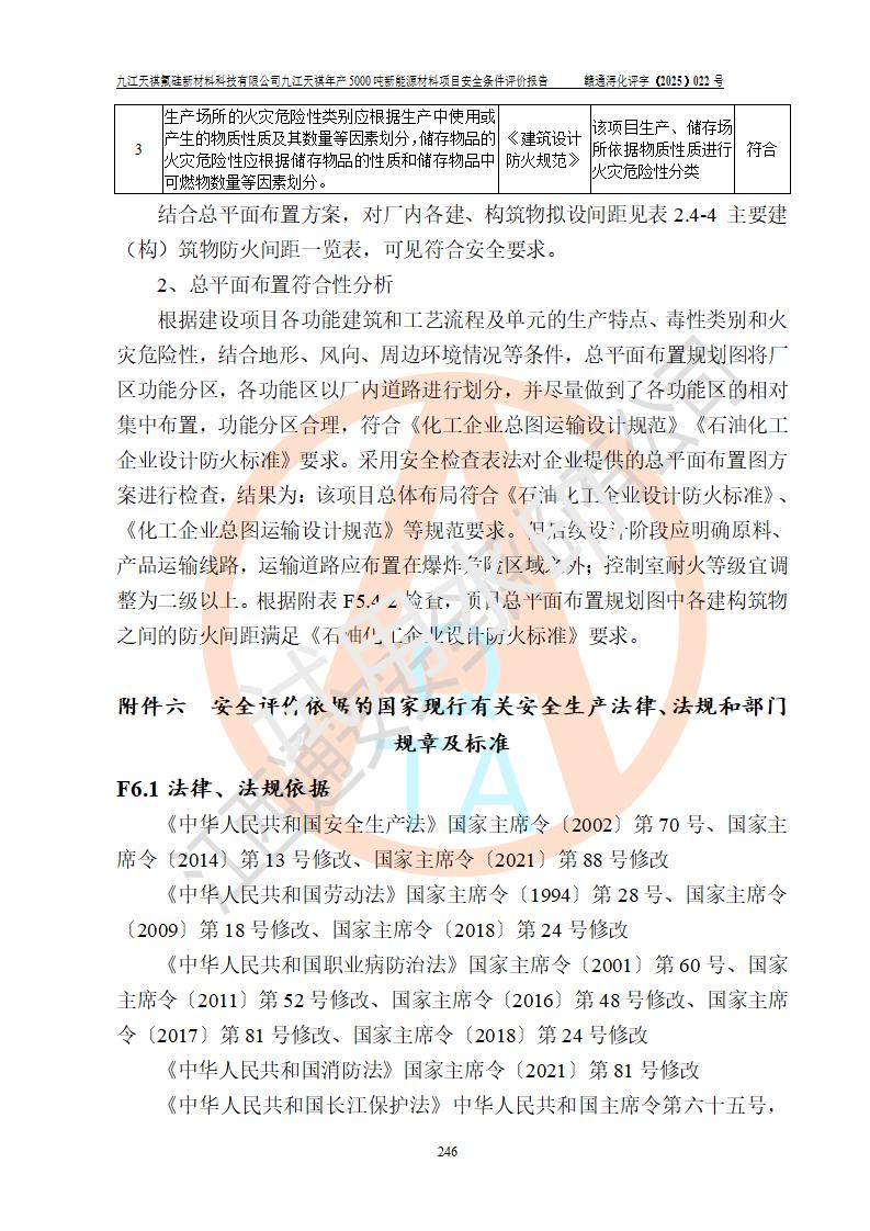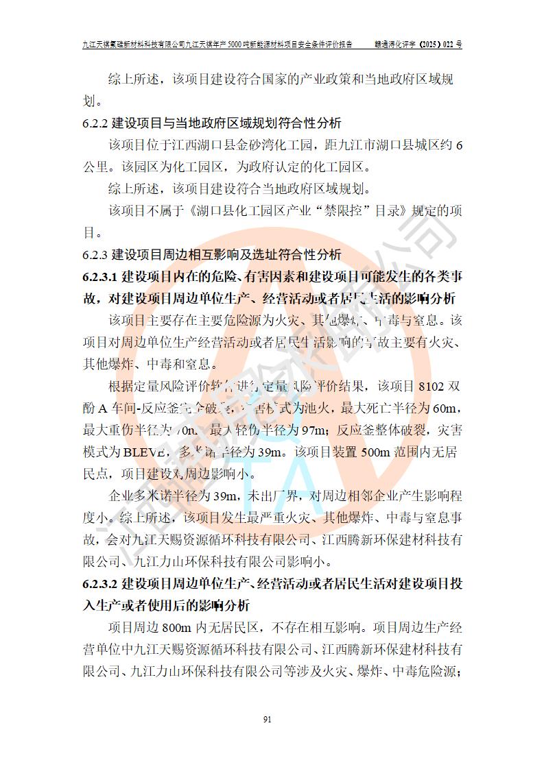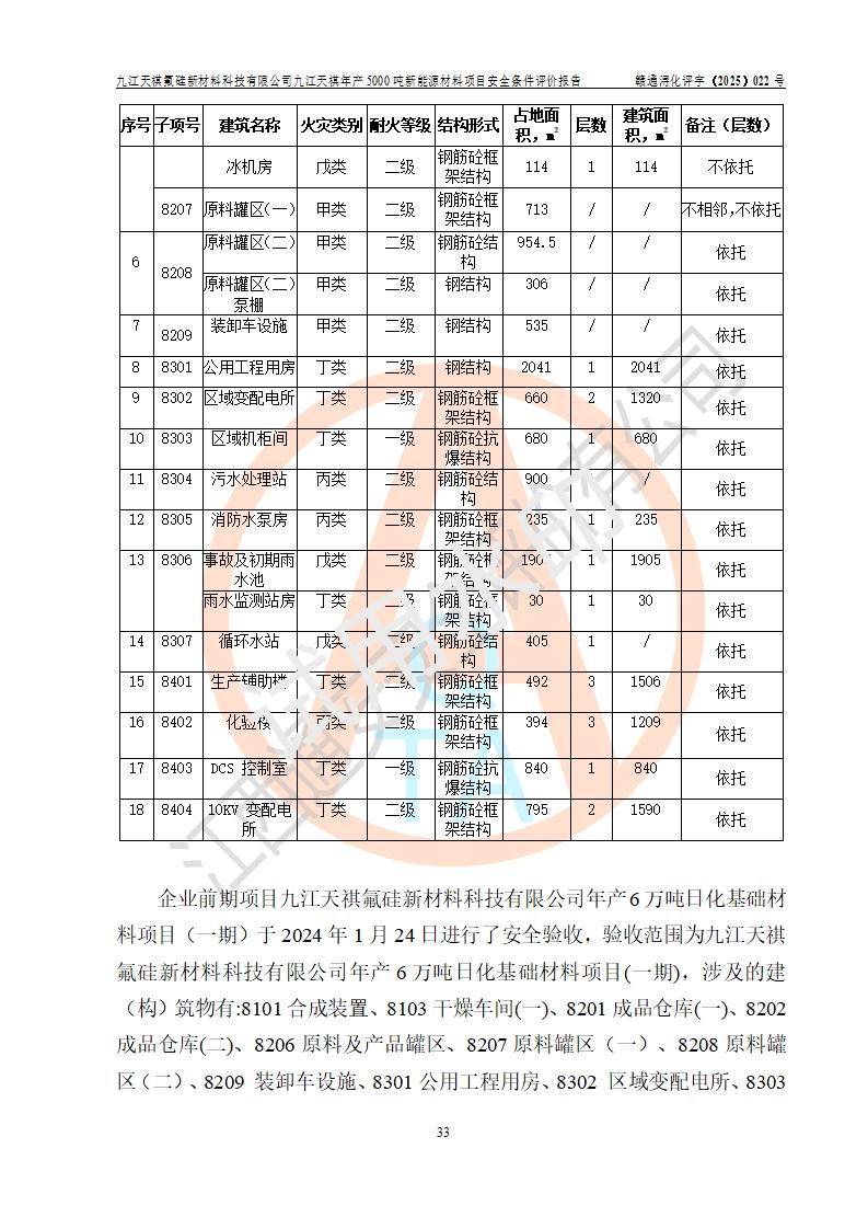 九江天祺氟硅新材料科技有限公司九江天祺年產5000 噸新能源材料項目安全條件評價報告