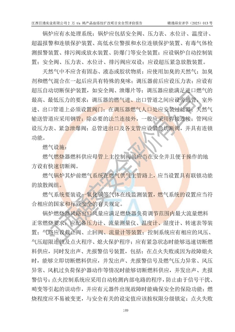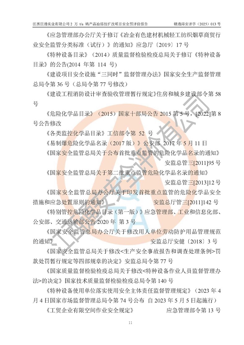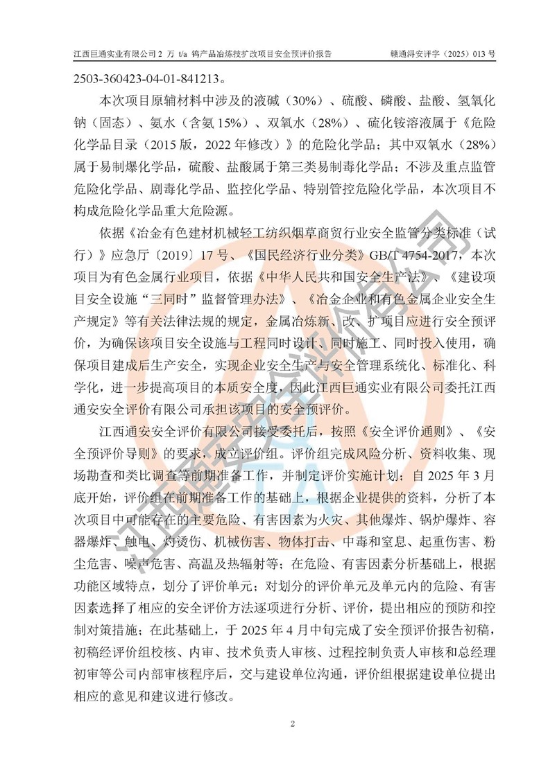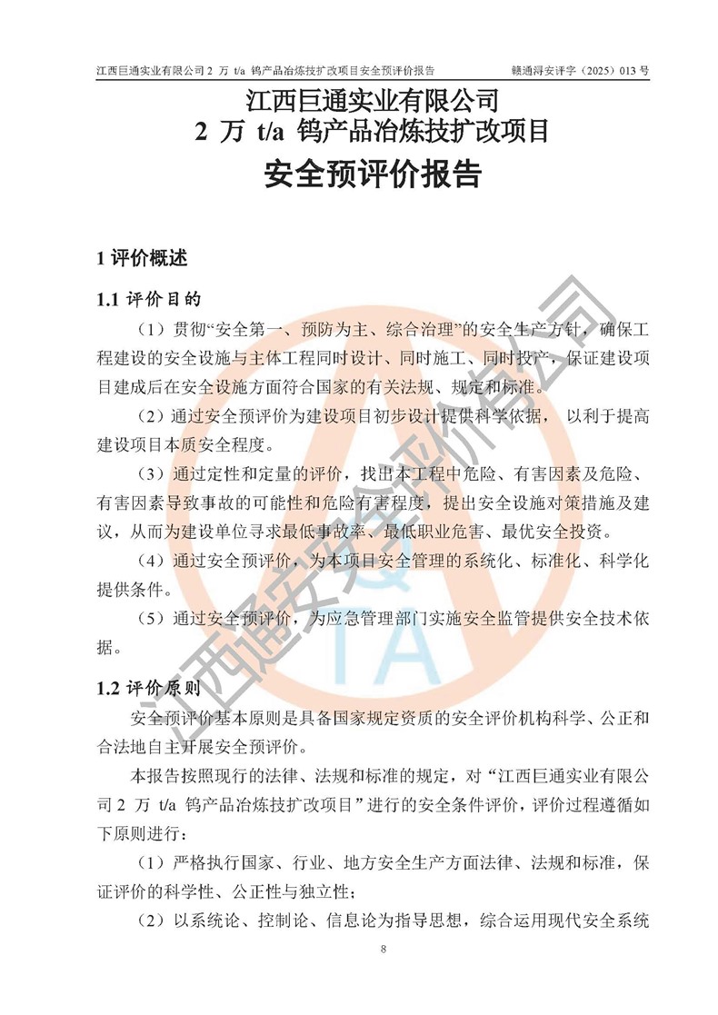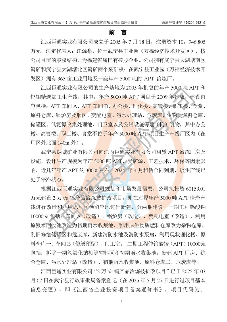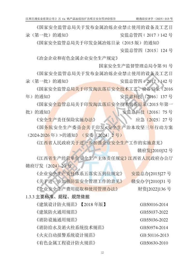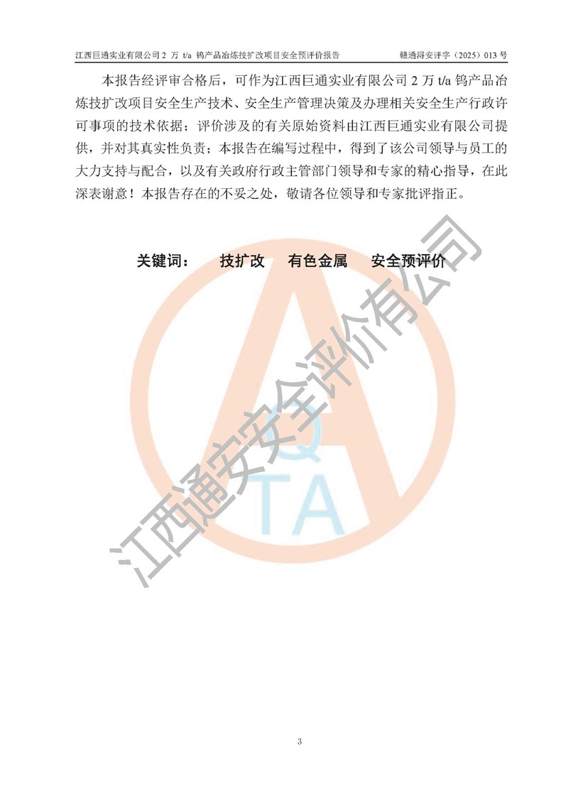 評價報(bào)告名稱 | 江西巨通實(shí)業(yè)有限公司2 萬 t/a 鎢產(chǎn)品冶煉技擴(kuò)改項(xiàng)目安全預(yù)評價報(bào)告 | |||