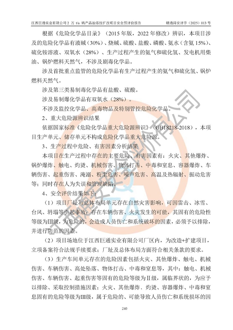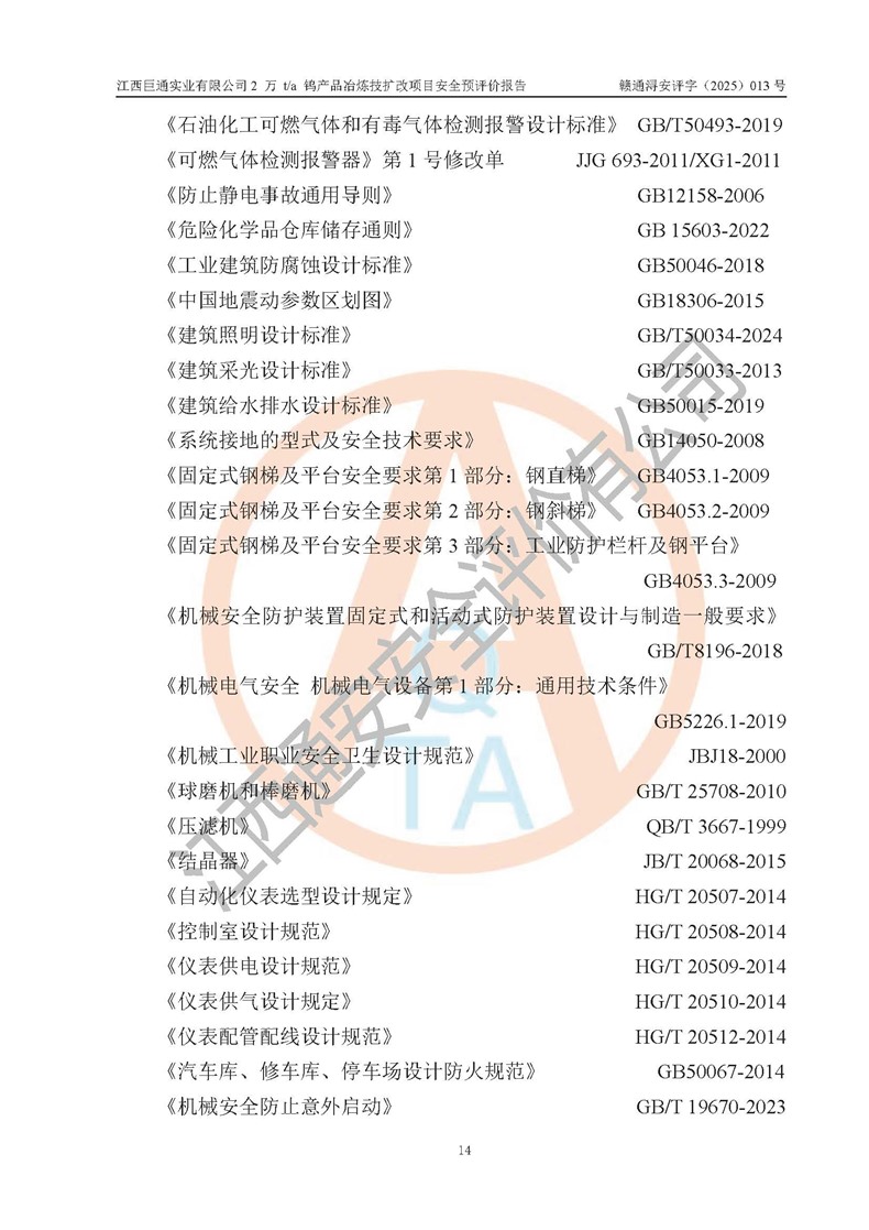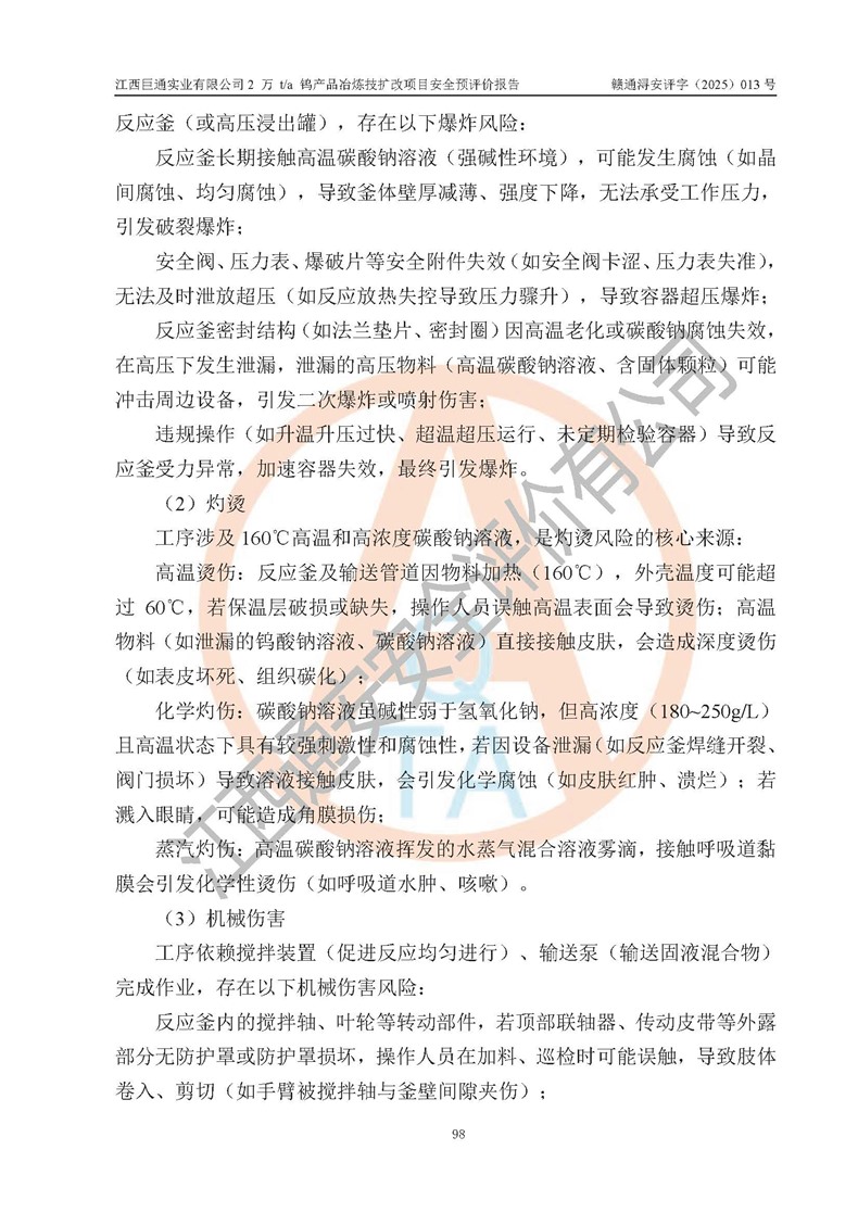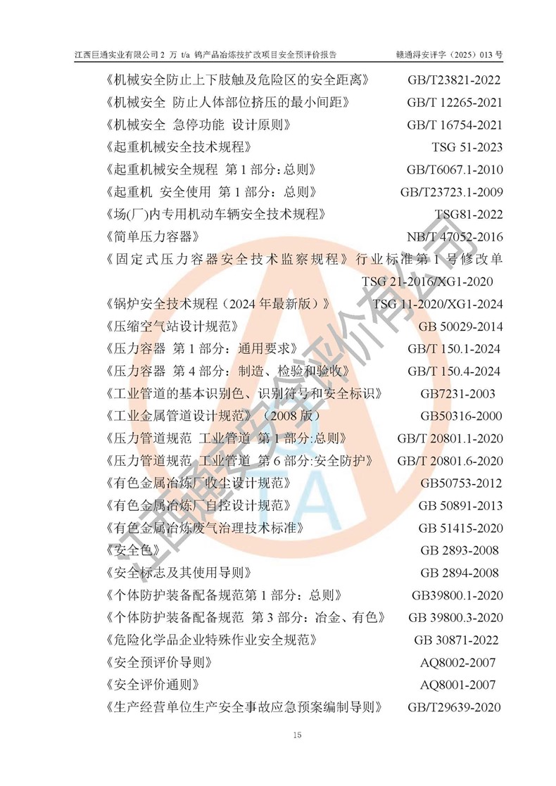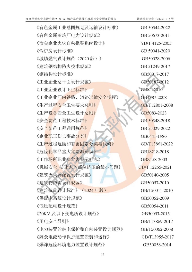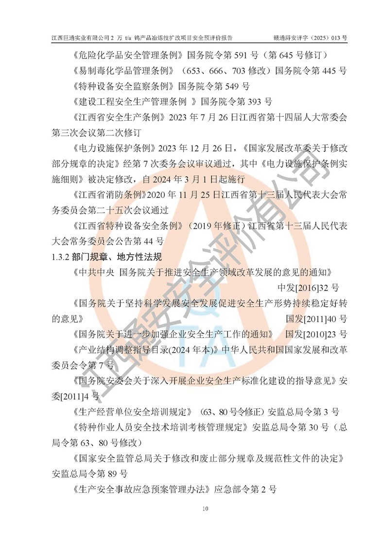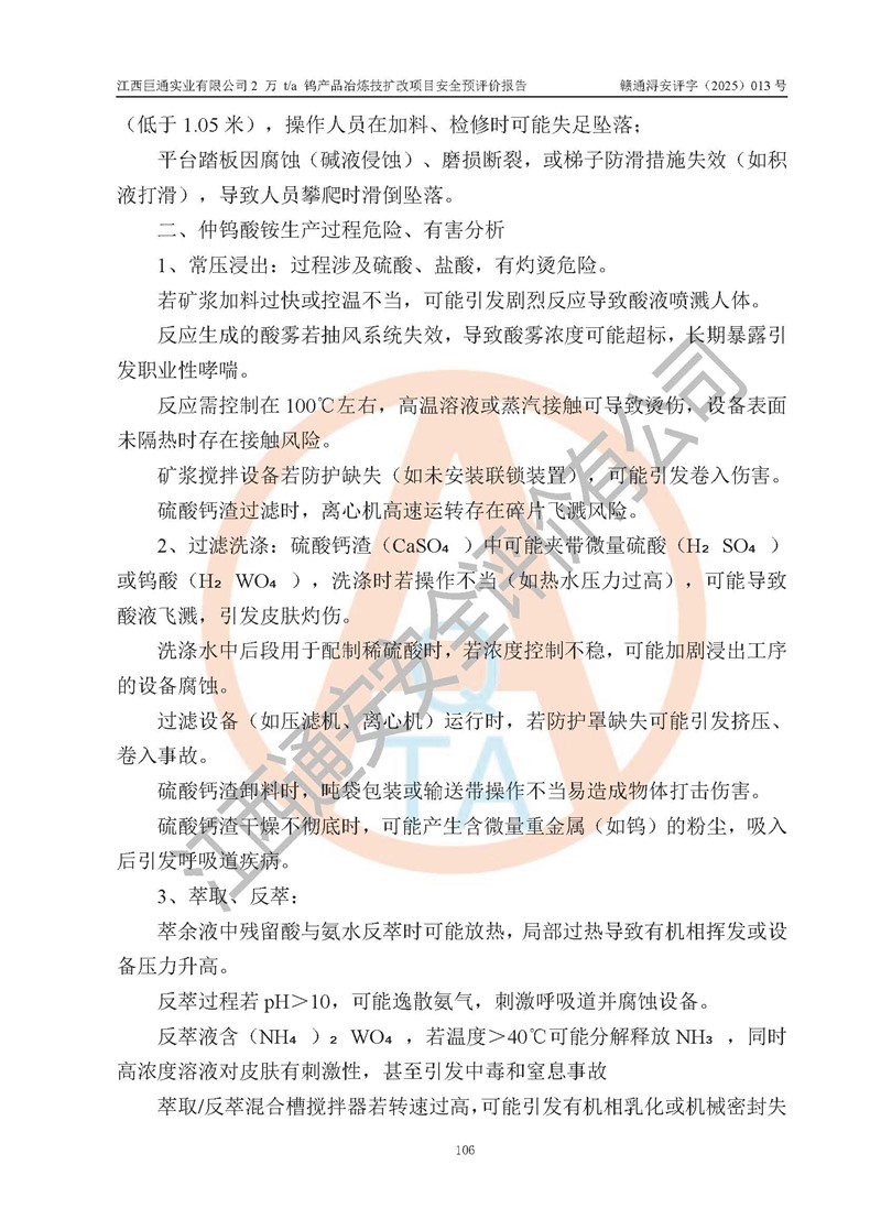 評價報(bào)告名稱 | 江西巨通實(shí)業(yè)有限公司2 萬 t/a 鎢產(chǎn)品冶煉技擴(kuò)改項(xiàng)目安全預(yù)評價報(bào)告 | |||