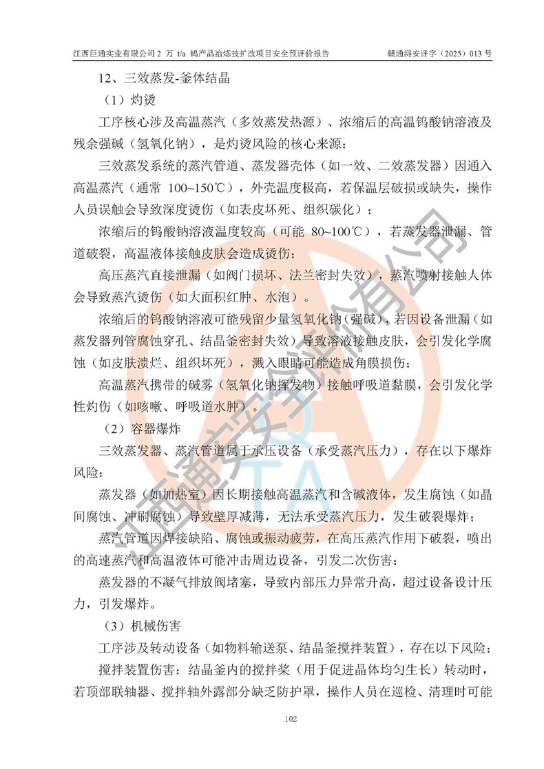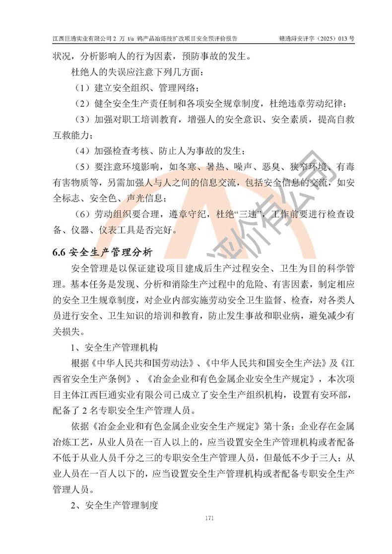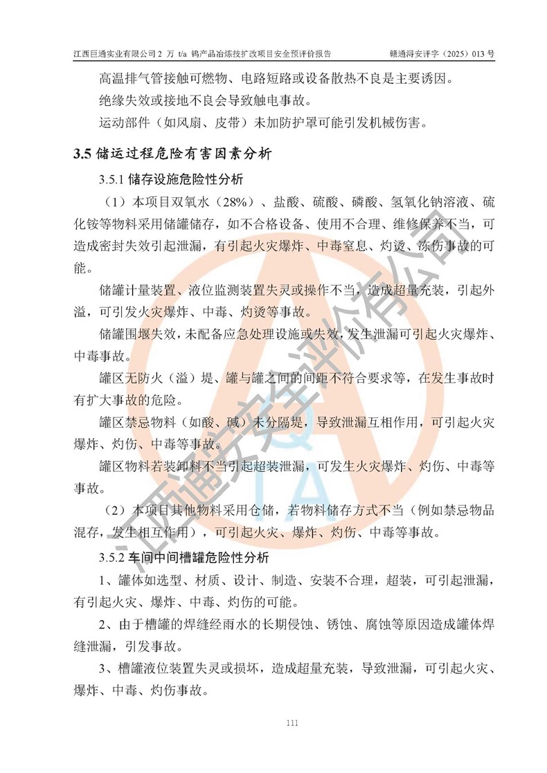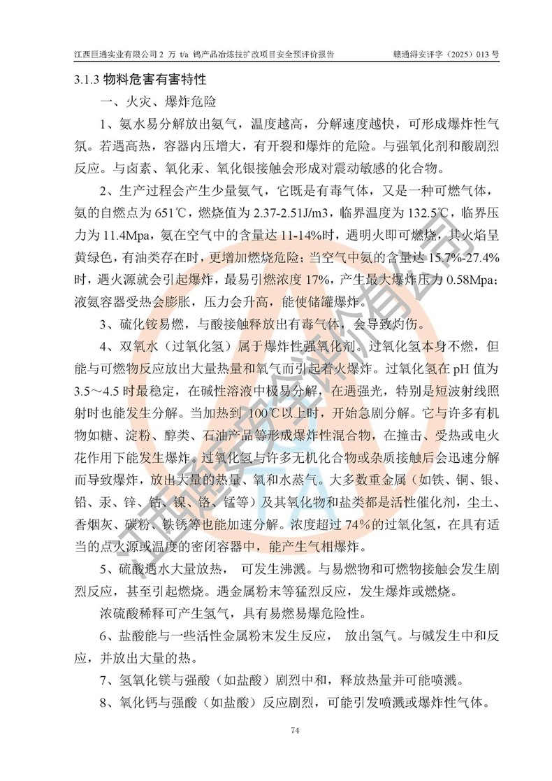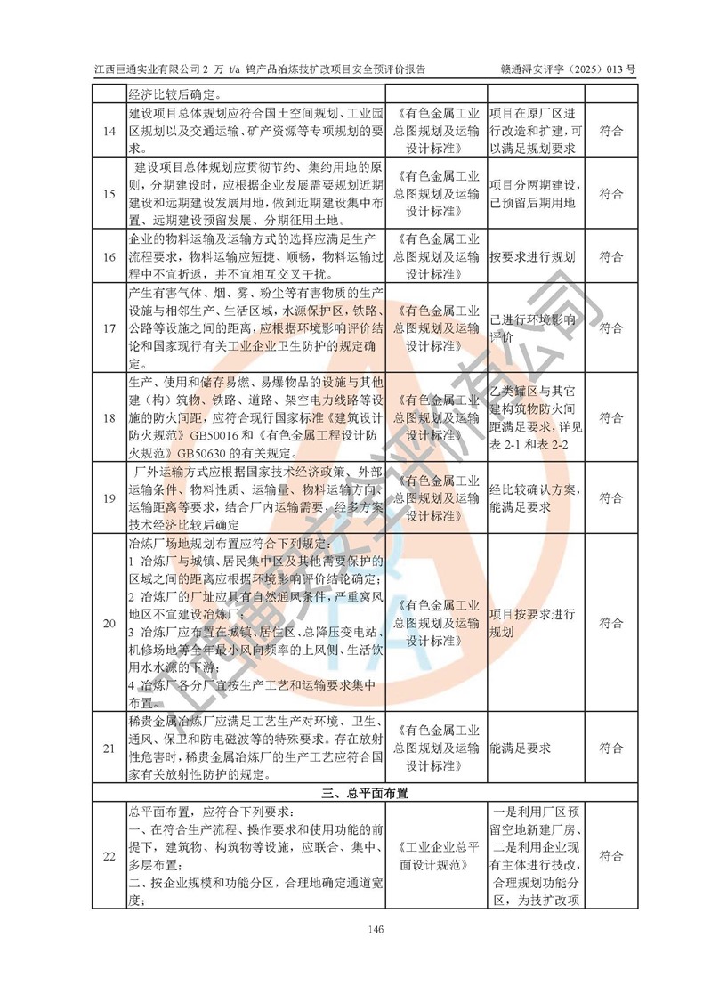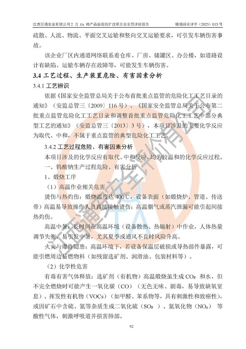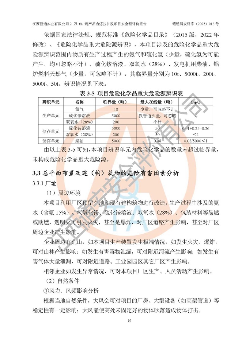 評價報(bào)告名稱 | 江西巨通實(shí)業(yè)有限公司2 萬 t/a 鎢產(chǎn)品冶煉技擴(kuò)改項(xiàng)目安全預(yù)評價報(bào)告 | |||
