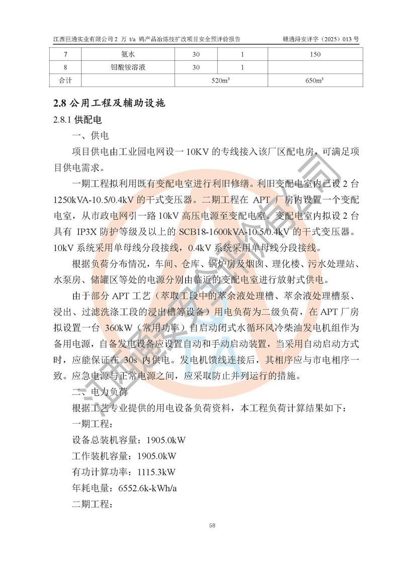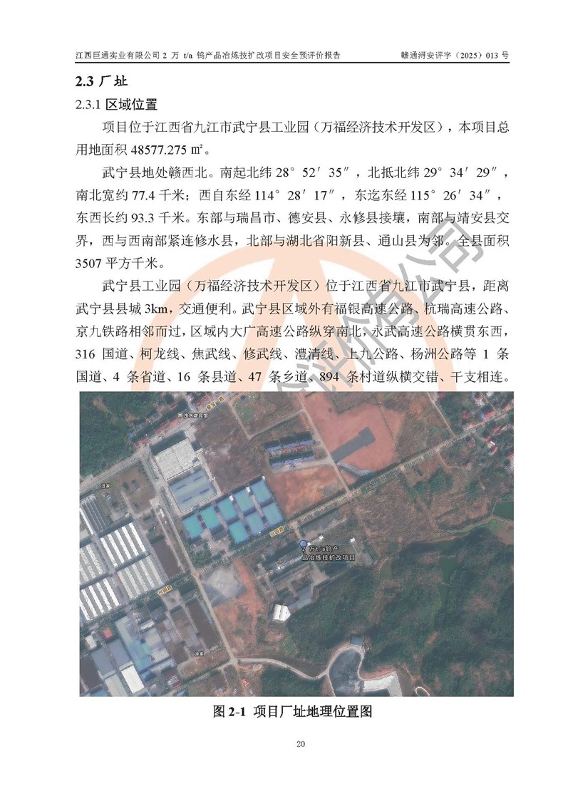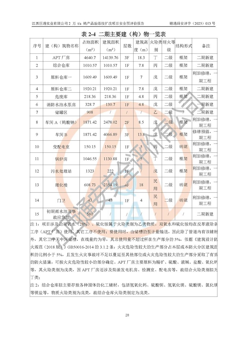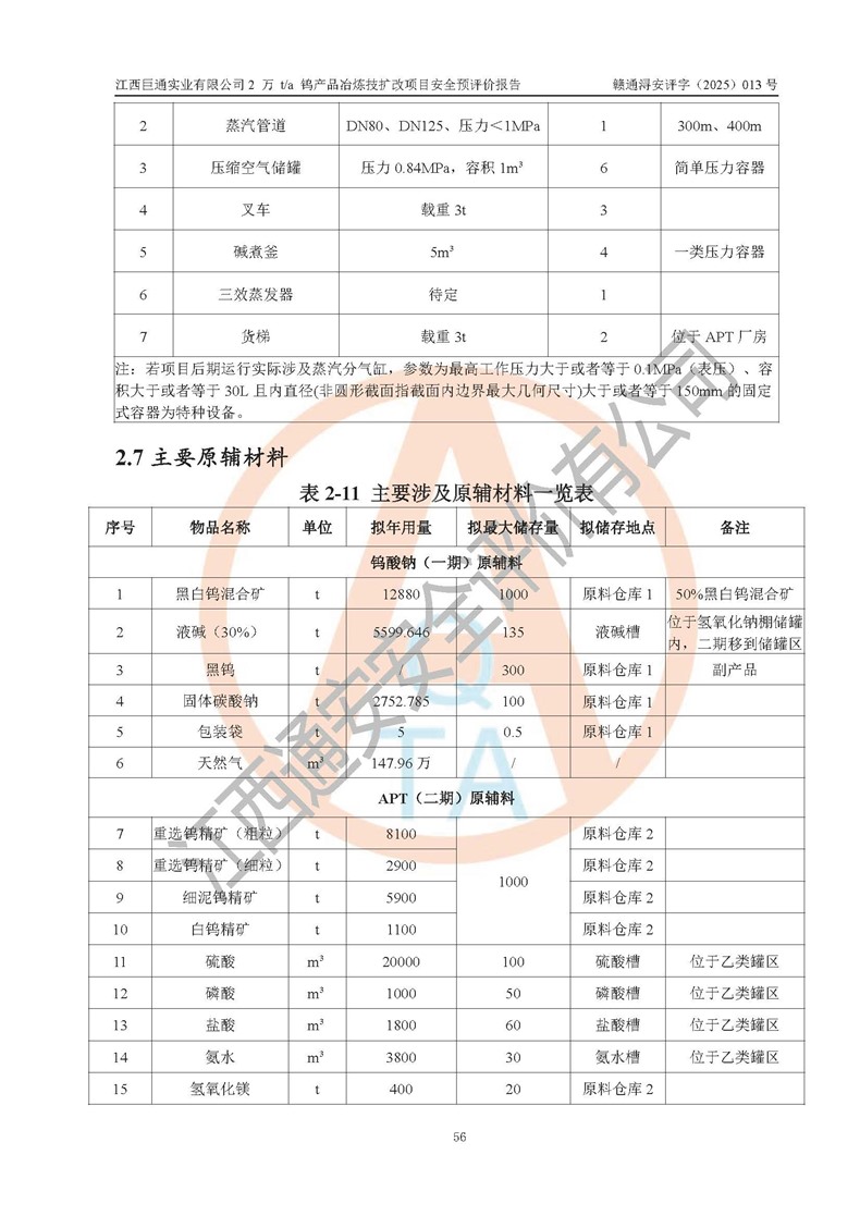 項(xiàng)目簡介 | 江西巨通實(shí)業(yè)有限公司成立于2005年7月18日,注冊資本10,946.805萬元,法定**人:江源泉,位于武寧縣工業(yè)園(萬福經(jīng)濟(jì)技術(shù)開發(fā)區(qū)),按公司目前的股權(quán)結(jié)構(gòu),為福建省屬國有控股企業(yè)。公司擁有武寧縣大湖塘南區(qū)鎢礦和武寧縣大湖塘北區(qū)鎢礦兩個采礦權(quán);在武寧縣工業(yè)園(萬福經(jīng)濟(jì)技術(shù)開發(fā)區(qū))擁有365畝工業(yè)用地及一座年產(chǎn)5000噸的 APT 冶煉廠。 江西巨通實(shí)業(yè)有限公司的生產(chǎn)基地為2005年批復(fù)的年產(chǎn)5000噸APT和鎢鉬精選加工生產(chǎn)線,其中,年產(chǎn)5000噸APT項(xiàng)目于2009年建成,建設(shè)內(nèi)容包括:APT車間A、APT車間B、辦公樓、理化樓、高管樓、職工樓、食堂、原料倉庫、鍋爐房及煙囪、變配電室、污水處理站、危廢庫、生物質(zhì)燃料倉庫、儲罐區(qū)、低氨氮收集處理池、門衛(wèi)室以及公輔設(shè)施等建(構(gòu))筑物,其中辦公樓、高管樓、職工樓、食堂不位于年產(chǎn)5000噸APT項(xiàng)目生產(chǎn)產(chǎn)線廠區(qū)內(nèi)(在廠區(qū)外北面140m外),不在本次評價范圍之內(nèi)。 武寧縣炳城礦業(yè)有限公司向江西巨通實(shí)業(yè)有限公司租賃APT冶煉廠房及設(shè)施,設(shè)計(jì)生產(chǎn)規(guī)模為年產(chǎn)5000噸APT,受礦源、工藝技術(shù)、**等因素影響,近幾年年產(chǎn)APT約3000t左右。2024 年4月租賃合同到期,該生產(chǎn)線已處于停滯狀態(tài)。 根據(jù)江西巨通實(shí)業(yè)有限公司規(guī)劃和市場發(fā)展需要,公司擬投資60159.01萬元建設(shè)2萬t/a鎢產(chǎn)品冶煉技擴(kuò)改項(xiàng)目,即在對原年產(chǎn)5000噸APT停滯產(chǎn)線進(jìn)行改造和利用原廠區(qū)預(yù)留空地進(jìn)行新建,分兩期建設(shè)。一期工程鎢酸鈉10000t/a包括:車間A(改造)、鍋爐房(改造)、變配電室(改造)、利用原氨水回收池改造為初期雨水收集池、利用原生物質(zhì)燃料倉庫改為雜物倉庫、利舊修繕儲罐區(qū)和危廢庫,新建消防水池及消防水泵房,利用現(xiàn)狀理化樓、原料倉庫一、車間B(修繕預(yù)留)、門衛(wèi)室。 二期工程仲鎢酸銨(APT)10000t/a包括:拆除一期氫氧化鈉棚等輔料區(qū)和初期雨水收集池,新建APT廠房、綜合倉庫、污水處理站(改造)、初期雨水收集池、原料倉庫二、危廢庫等。 江西巨通實(shí)業(yè)有限公司“2萬t/a鎢產(chǎn)品冶煉技擴(kuò)改項(xiàng)目”已于2025年03月07日在武寧縣行政審批局備案登記(在2025年5月27日進(jìn)行過項(xiàng)目基本信息變更),即《江西省企業(yè)投資項(xiàng)目備案通知書》,項(xiàng)目代碼為:2503-360423-04-01-841213。 | |||