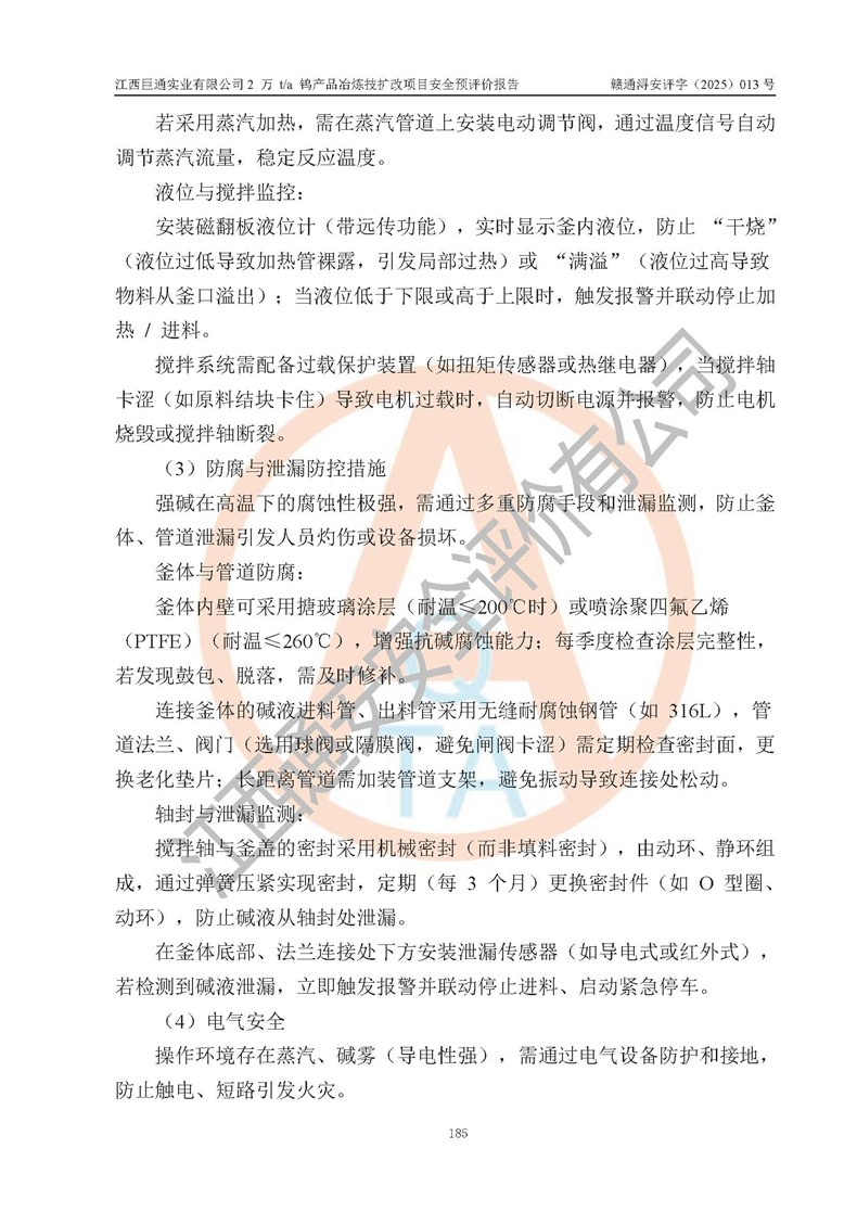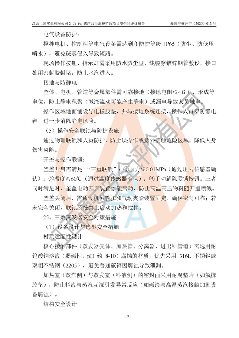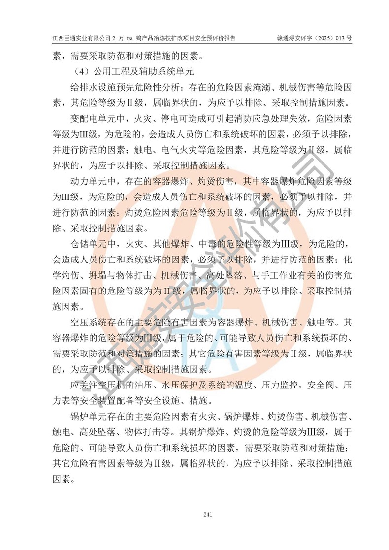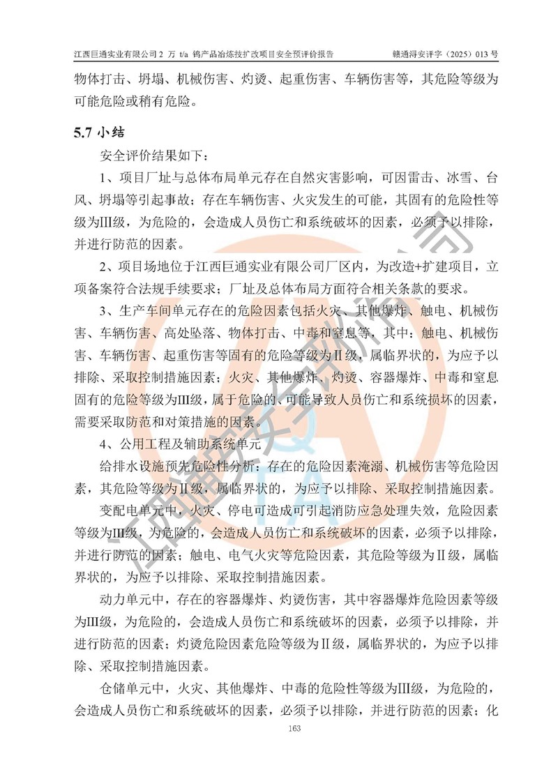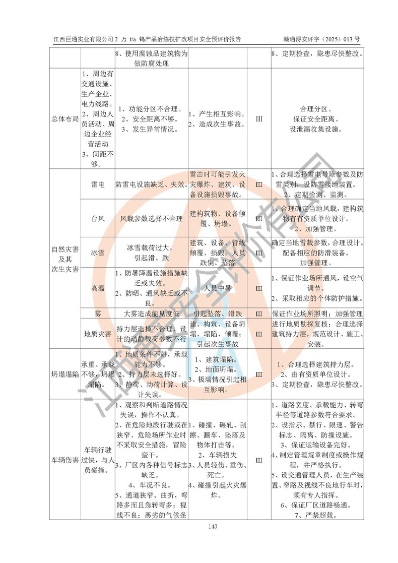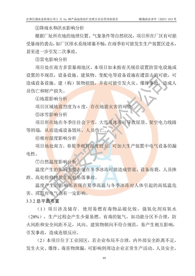 評價結(jié)論 | 江西巨通實(shí)業(yè)有限公司“2 萬 t/a 鎢產(chǎn)品冶煉技擴(kuò)改項(xiàng)目”的廠址及總體布局、周邊環(huán)境、自然環(huán)境能滿足建設(shè)安全條件;項(xiàng)目選擇的工藝過程及設(shè)備設(shè)施的安全可靠性能達(dá)到**法規(guī)、標(biāo)準(zhǔn)規(guī)定要求;項(xiàng)目存在的危險有害因素可控,在落實(shí)本評價報(bào)告提出的有關(guān)安全對策措施后,其危險有害程度能達(dá)到可以接受的程度,項(xiàng)目建設(shè)能夠?qū)崿F(xiàn)安全生產(chǎn)條件。 | |||