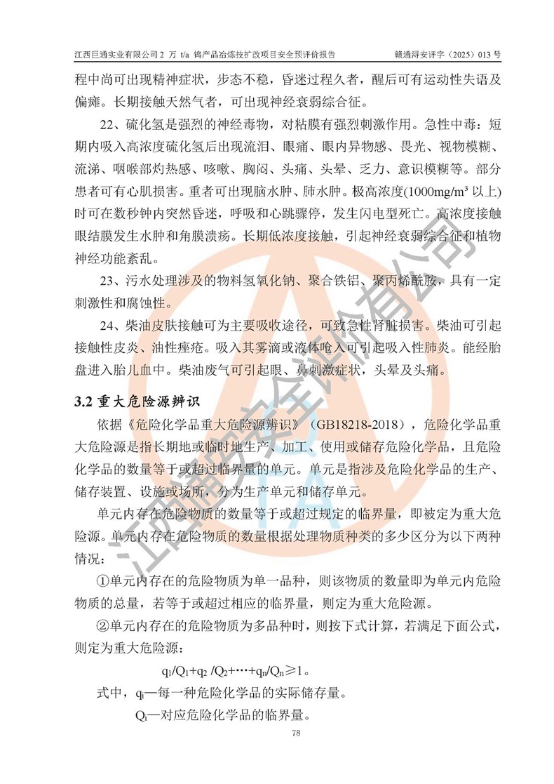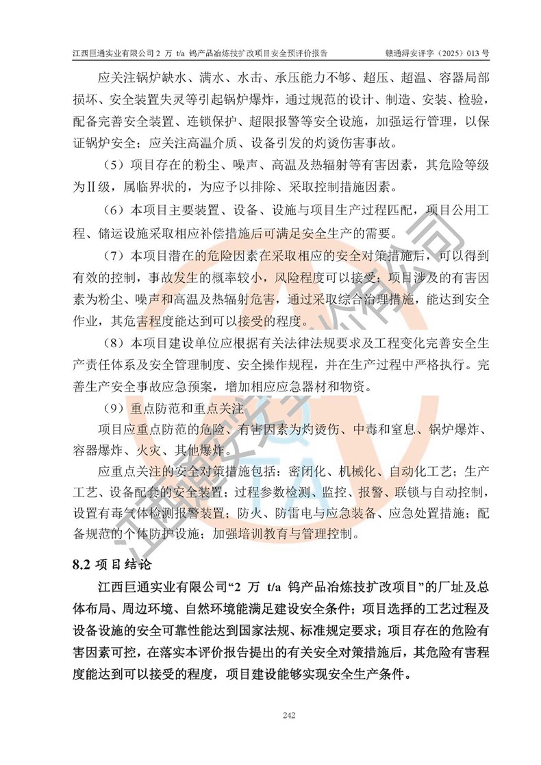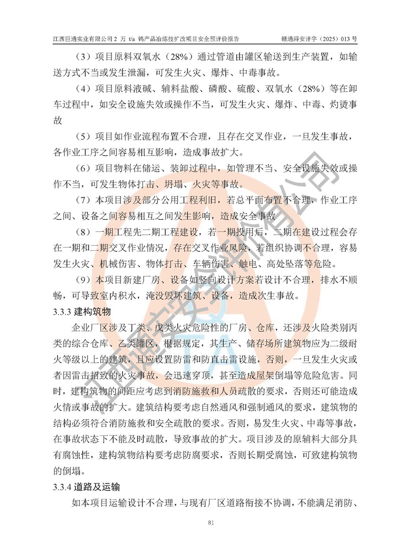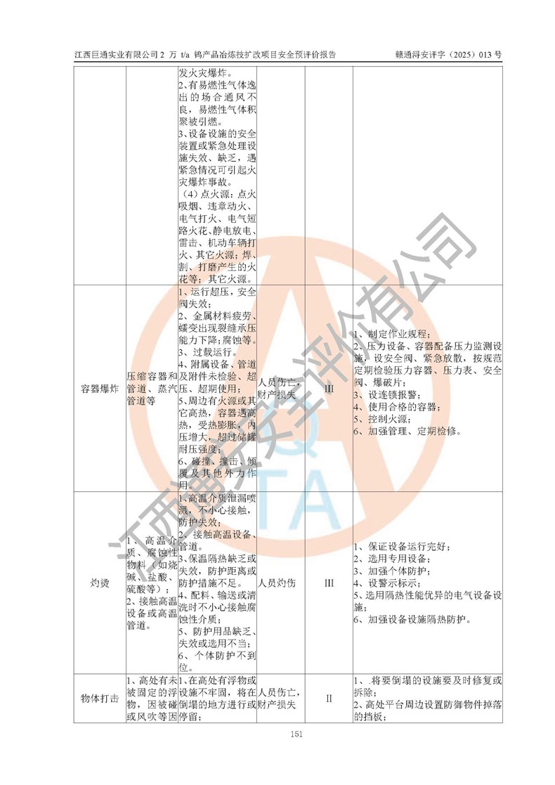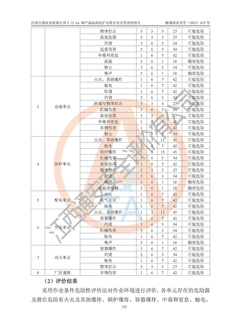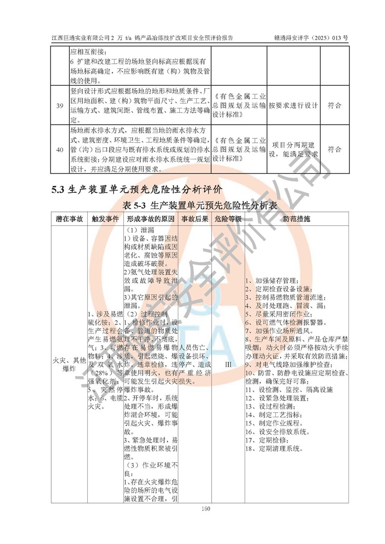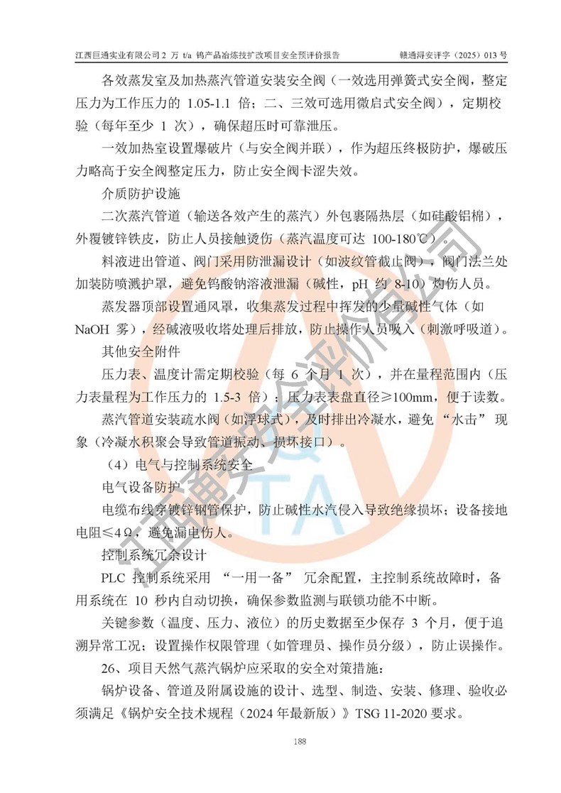 評價結(jié)論 | 江西巨通實(shí)業(yè)有限公司“2 萬 t/a 鎢產(chǎn)品冶煉技擴(kuò)改項(xiàng)目”的廠址及總體布局、周邊環(huán)境、自然環(huán)境能滿足建設(shè)安全條件;項(xiàng)目選擇的工藝過程及設(shè)備設(shè)施的安全可靠性能達(dá)到**法規(guī)、標(biāo)準(zhǔn)規(guī)定要求;項(xiàng)目存在的危險有害因素可控,在落實(shí)本評價報(bào)告提出的有關(guān)安全對策措施后,其危險有害程度能達(dá)到可以接受的程度,項(xiàng)目建設(shè)能夠?qū)崿F(xiàn)安全生產(chǎn)條件。 | |||