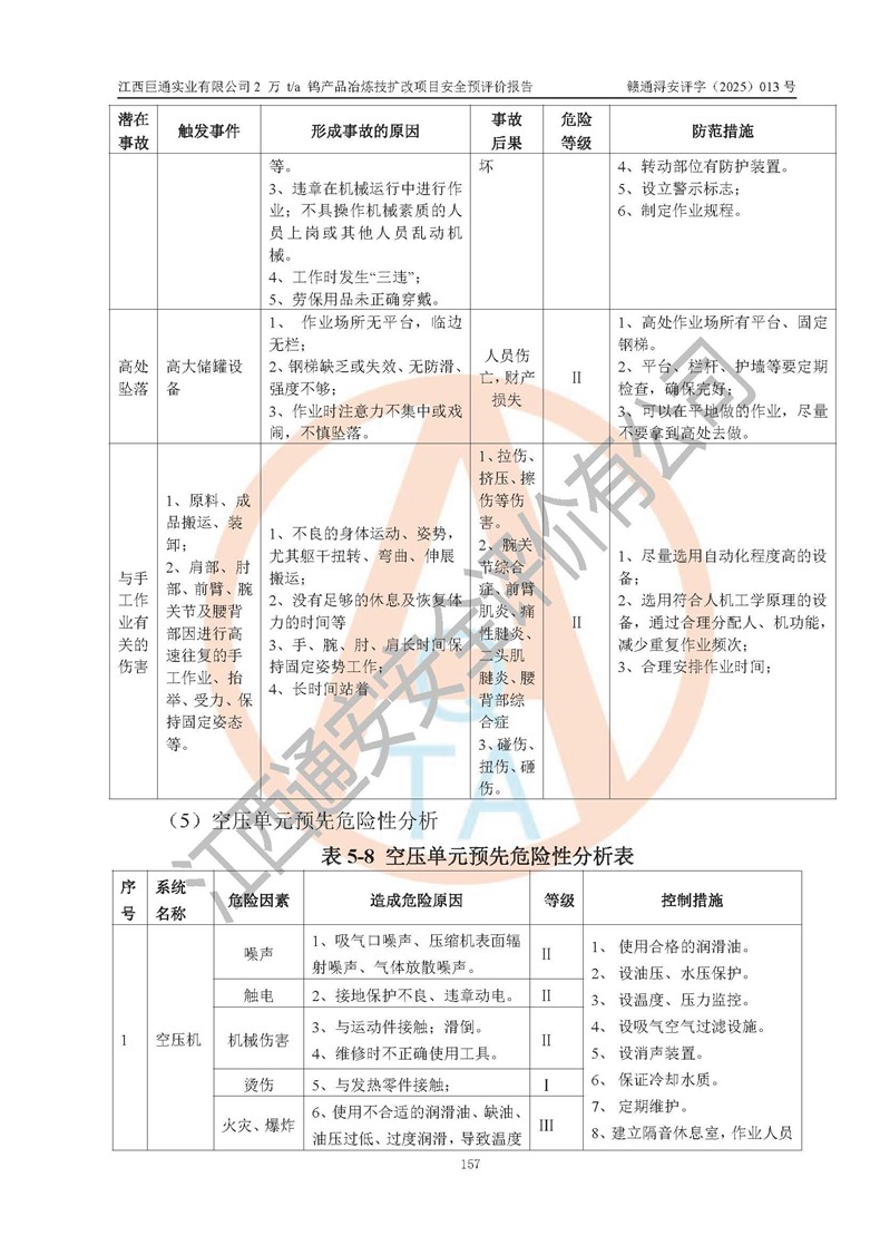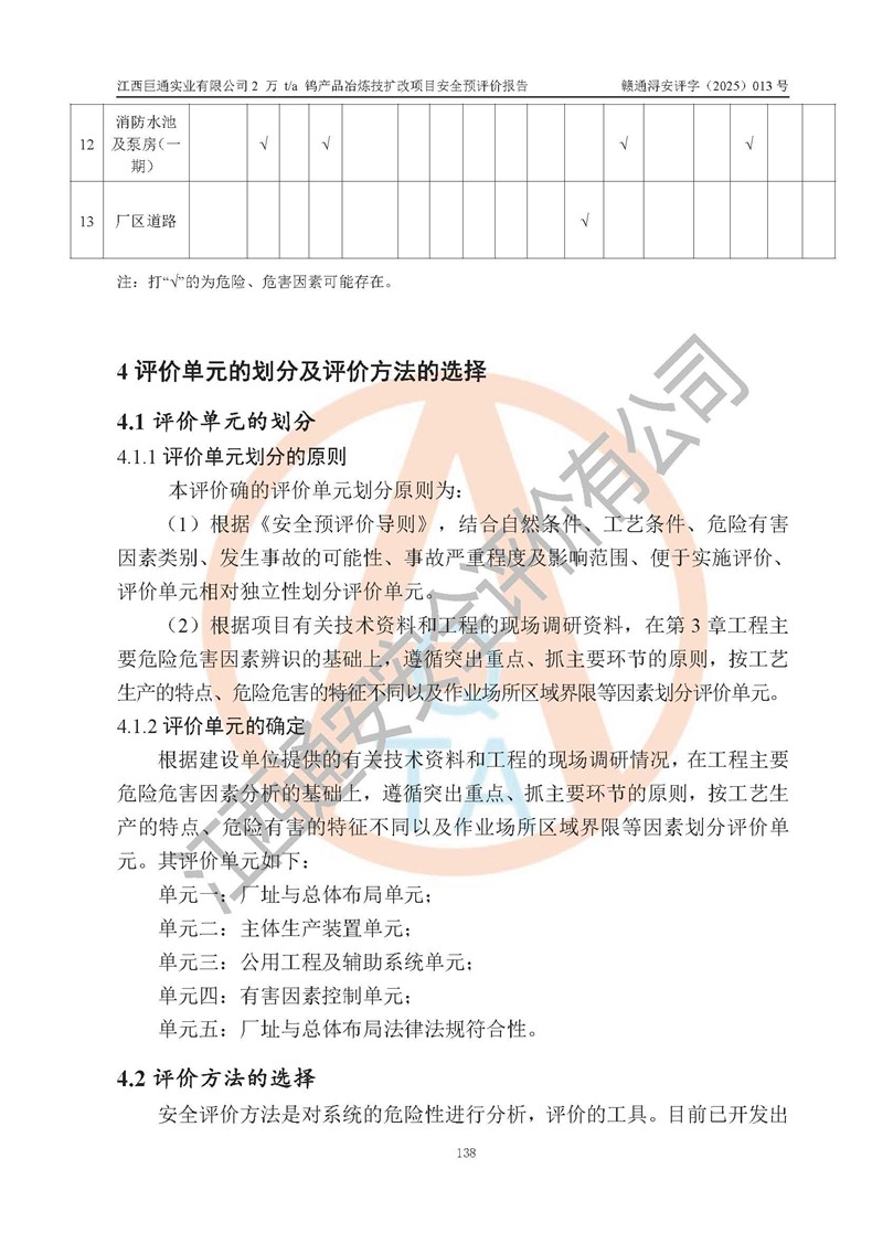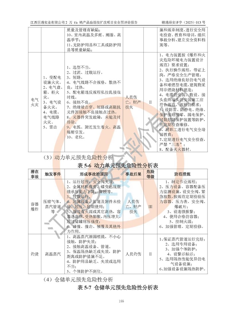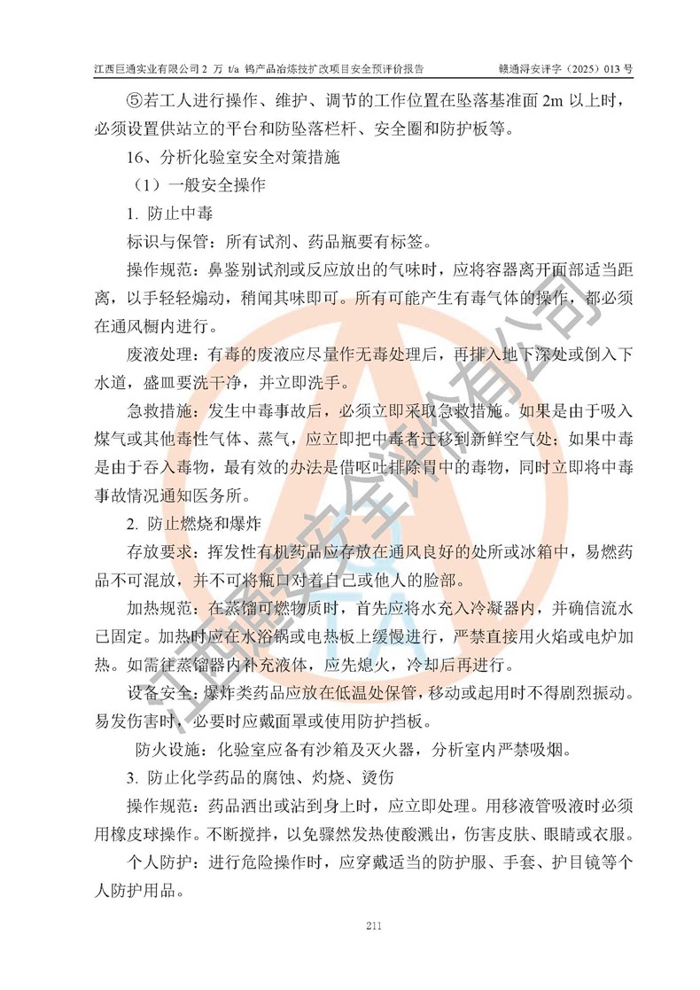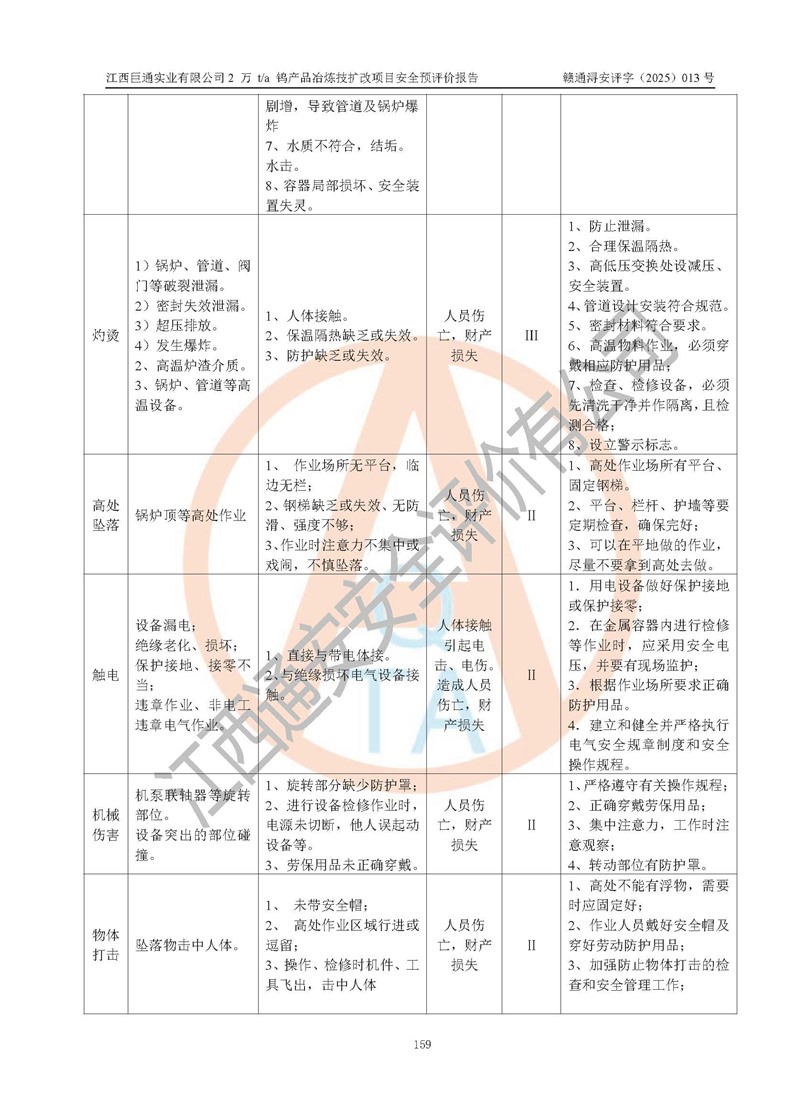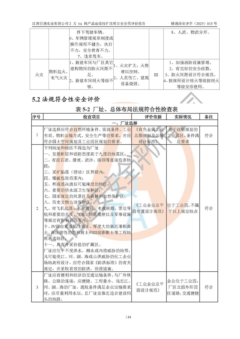 評價結(jié)論 | 江西巨通實(shí)業(yè)有限公司“2 萬 t/a 鎢產(chǎn)品冶煉技擴(kuò)改項(xiàng)目”的廠址及總體布局、周邊環(huán)境、自然環(huán)境能滿足建設(shè)安全條件;項(xiàng)目選擇的工藝過程及設(shè)備設(shè)施的安全可靠性能達(dá)到**法規(guī)、標(biāo)準(zhǔn)規(guī)定要求;項(xiàng)目存在的危險有害因素可控,在落實(shí)本評價報(bào)告提出的有關(guān)安全對策措施后,其危險有害程度能達(dá)到可以接受的程度,項(xiàng)目建設(shè)能夠?qū)崿F(xiàn)安全生產(chǎn)條件。 | |||