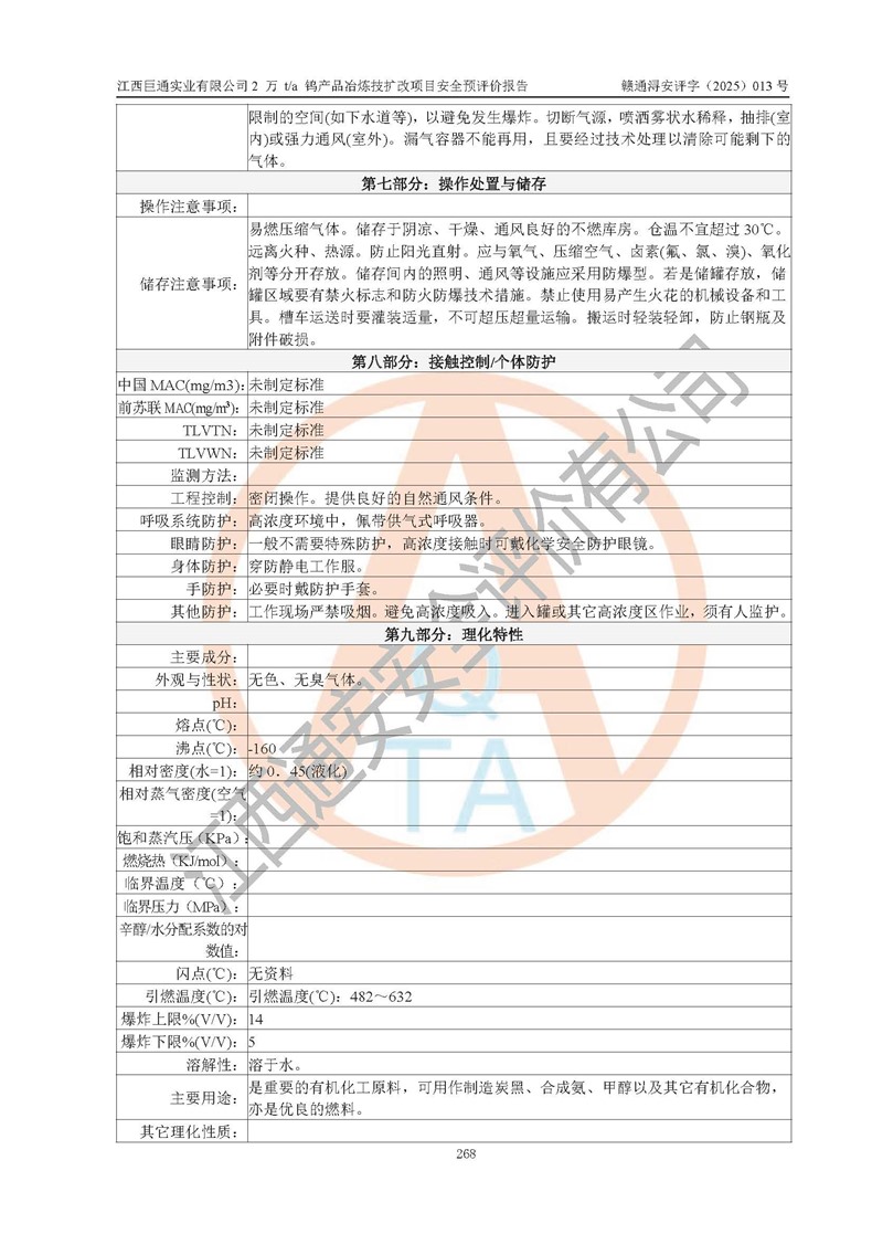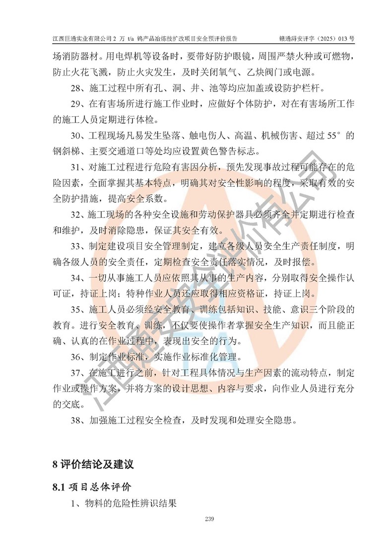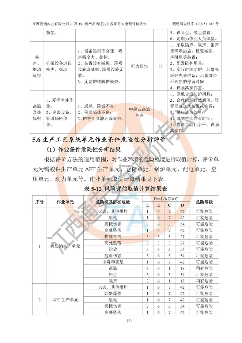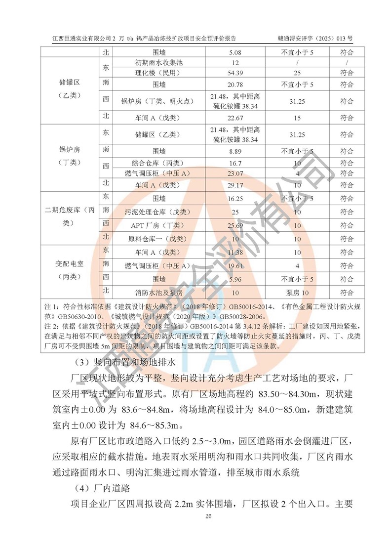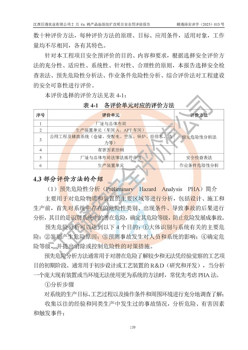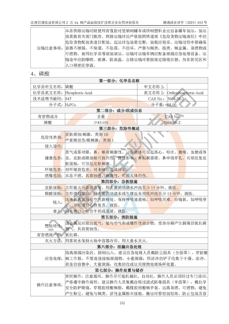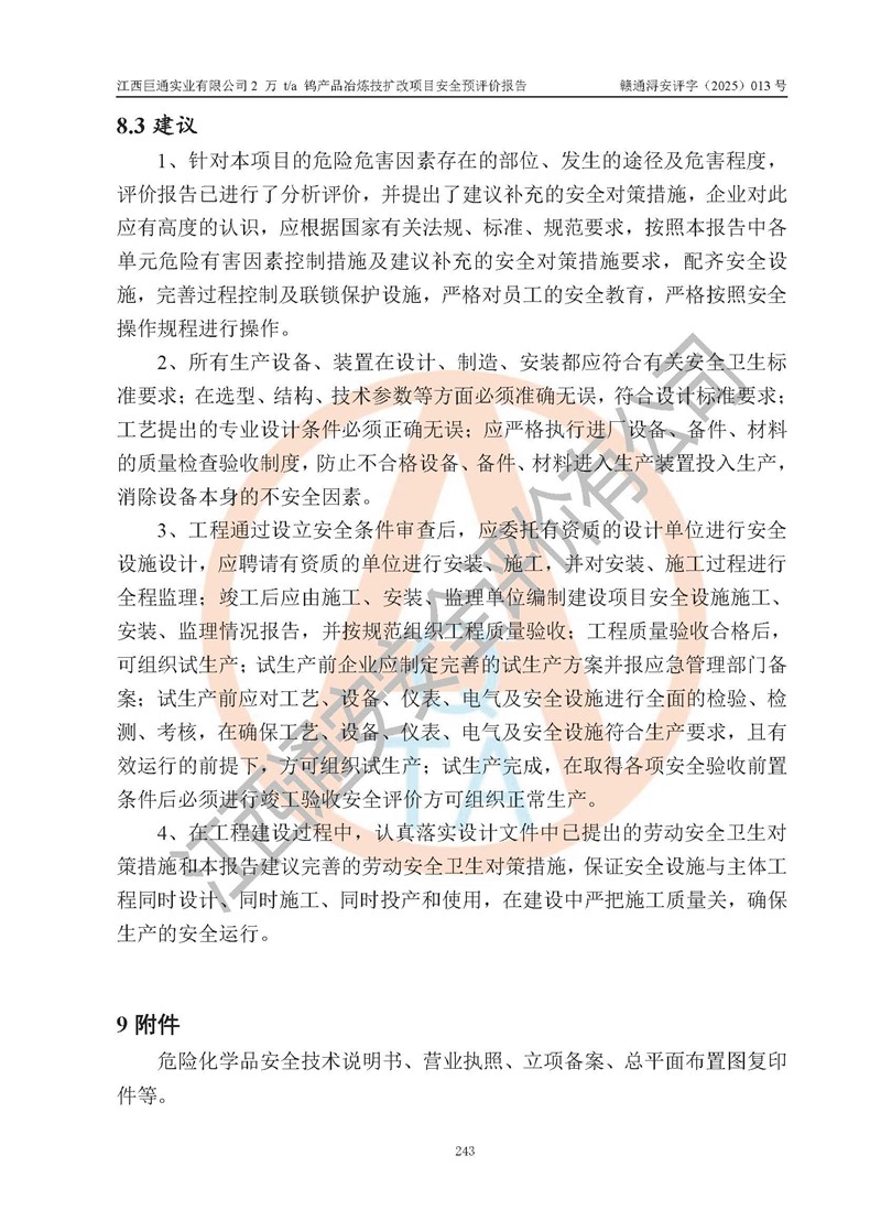 評價結(jié)論 | 江西巨通實(shí)業(yè)有限公司“2 萬 t/a 鎢產(chǎn)品冶煉技擴(kuò)改項(xiàng)目”的廠址及總體布局、周邊環(huán)境、自然環(huán)境能滿足建設(shè)安全條件;項(xiàng)目選擇的工藝過程及設(shè)備設(shè)施的安全可靠性能達(dá)到**法規(guī)、標(biāo)準(zhǔn)規(guī)定要求;項(xiàng)目存在的危險有害因素可控,在落實(shí)本評價報(bào)告提出的有關(guān)安全對策措施后,其危險有害程度能達(dá)到可以接受的程度,項(xiàng)目建設(shè)能夠?qū)崿F(xiàn)安全生產(chǎn)條件。 | |||