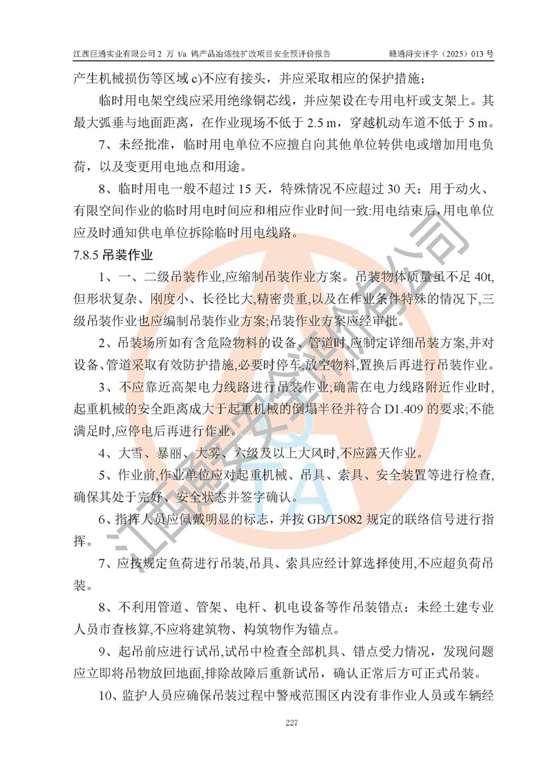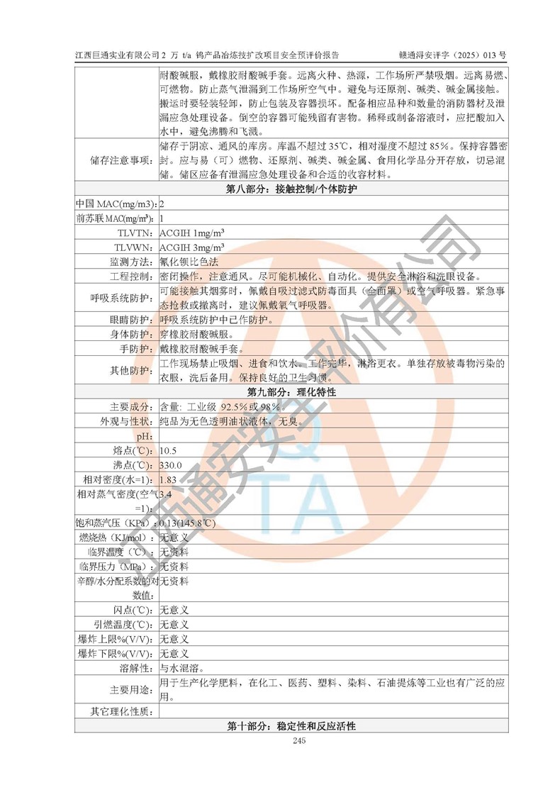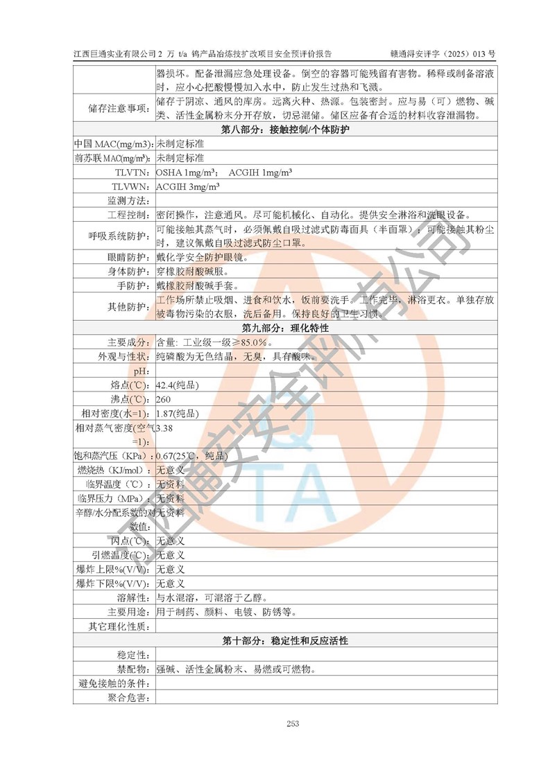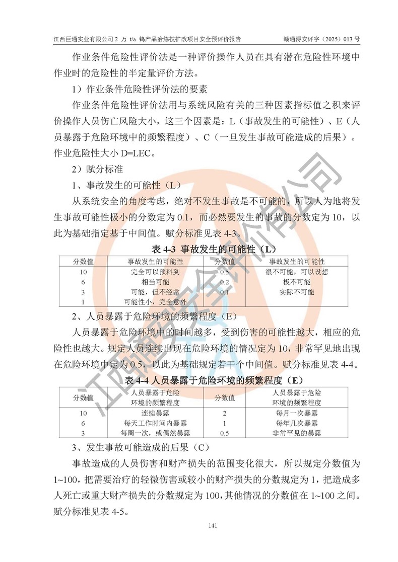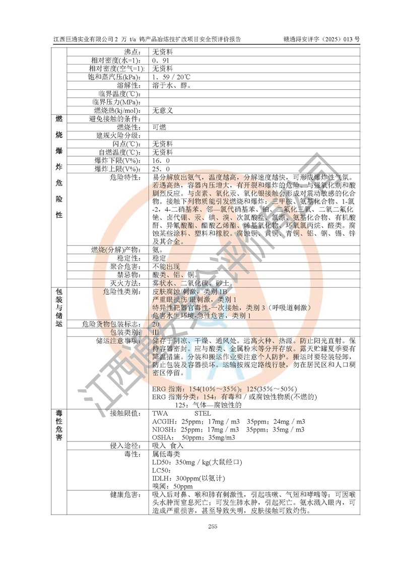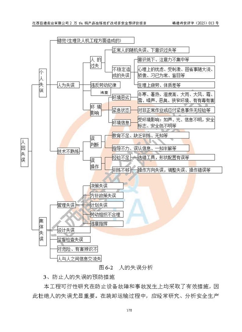 評價結(jié)論 | 江西巨通實(shí)業(yè)有限公司“2 萬 t/a 鎢產(chǎn)品冶煉技擴(kuò)改項(xiàng)目”的廠址及總體布局、周邊環(huán)境、自然環(huán)境能滿足建設(shè)安全條件;項(xiàng)目選擇的工藝過程及設(shè)備設(shè)施的安全可靠性能達(dá)到**法規(guī)、標(biāo)準(zhǔn)規(guī)定要求;項(xiàng)目存在的危險有害因素可控,在落實(shí)本評價報(bào)告提出的有關(guān)安全對策措施后,其危險有害程度能達(dá)到可以接受的程度,項(xiàng)目建設(shè)能夠?qū)崿F(xiàn)安全生產(chǎn)條件。 | |||