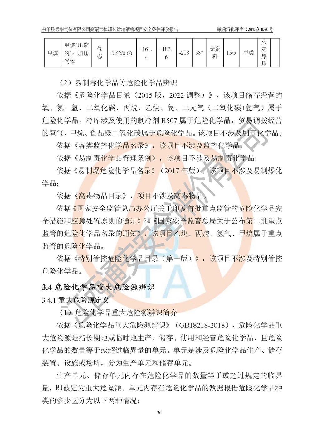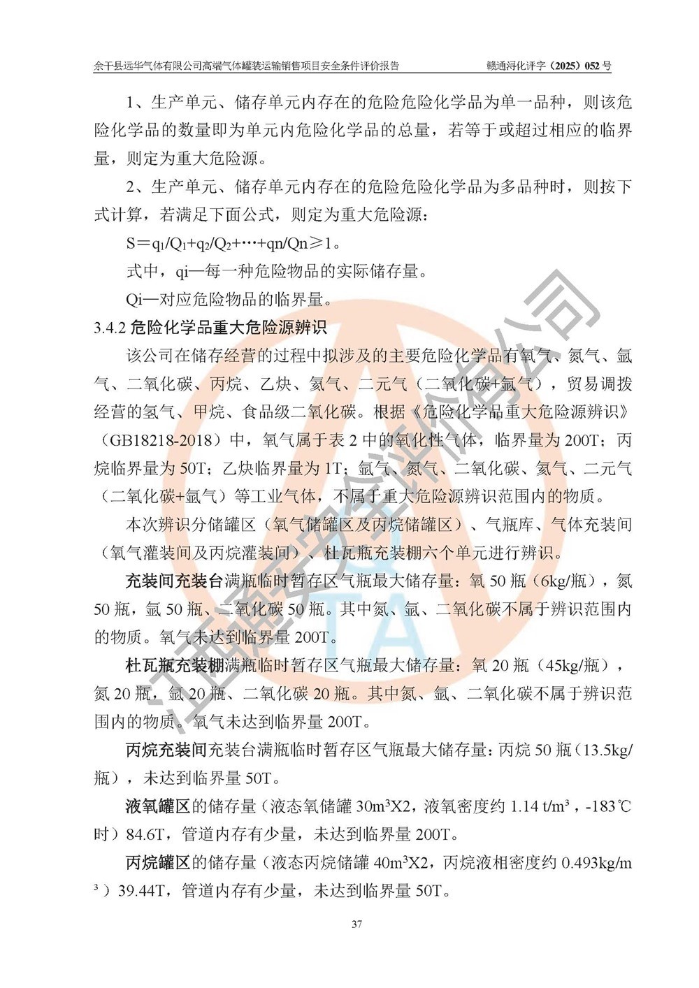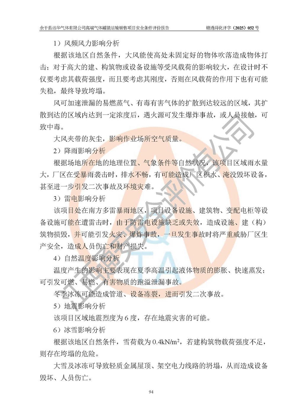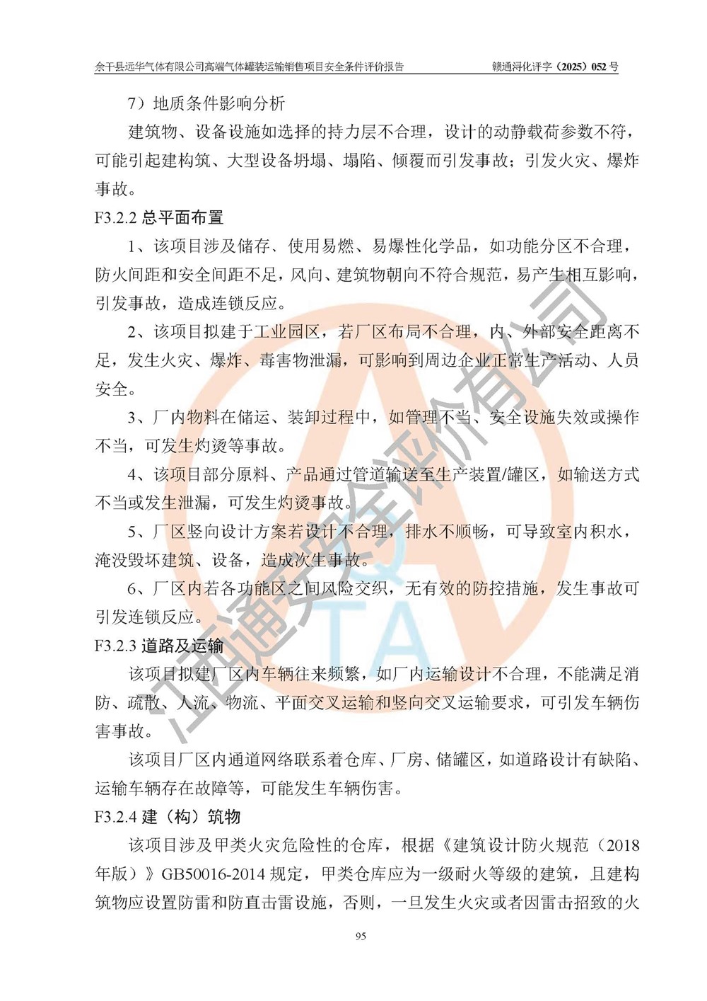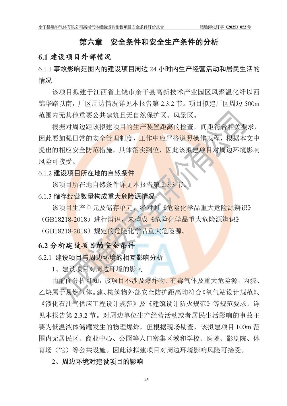 項目簡介 | 余干縣遠華氣體有限公司成立于2024年05月10日,公司類型為有限責任公司(自然人投資或控股),該公司法定**人為張建華,注冊資本貳佰萬元整,經(jīng)營場所位于江西省上饒市余干縣****產(chǎn)業(yè)園區(qū)內(nèi)聚溫化纖以西錦華路以南。經(jīng)營范圍:一般項目:氣體、液體分離及純凈設(shè)備銷售(除依法須經(jīng)批準的項目外,憑營業(yè)執(zhí)照依法自主開展經(jīng)營活動)。 余干縣遠華氣體有限公司于2025年02月11日取得了余干縣發(fā)展和改革委員會《余干縣遠華氣體有限公司高端氣體罐裝運輸銷售項目》備案文件,備案編號:2502-361127-04-01-434579。 該項目涉及氧、二氧化碳、氮、氬、丙烷、乙炔、氦氣、二元氣(二氧化碳+氬氣)的儲存經(jīng)營,貿(mào)易調(diào)撥經(jīng)營的氣體氫氣、甲烷、食品二氧化碳。該公司擬建低溫立式儲罐液氧罐30m3 2個、液態(tài)二氧化碳罐30m3 1個、液氮罐30m3 1個、液氬罐30m3 1個,及各工業(yè)氣瓶100瓶、各杜瓦瓶20瓶;全壓力式臥式埋地儲罐丙烷40m3 1個、40m3 1個(備用罐)及丙烷工業(yè)氣瓶50瓶;氣瓶庫內(nèi)乙炔氣瓶及氦氣氣瓶各50瓶。項目儲存經(jīng)營過程中涉及的氧(液態(tài)的、壓縮的)、二氧化碳(液態(tài)的、壓縮的)、氬(液態(tài)的、壓縮的)、氮(液態(tài)的、壓縮的)、丙烷、乙炔、氦氣、食品級二氧化碳、二元氣(二氧化碳+氬氣)均屬于危險化學品,貿(mào)易調(diào)撥經(jīng)營的氣體氫氣、甲烷、食品二氧化碳屬于危險化學品。不涉及易制毒化學品、劇毒化學品、監(jiān)控化學品、易制爆化學品、特別管控危險化學品,乙炔、丙烷、氫氣、甲烷屬于重點監(jiān)管的危險化學品。該項目儲存經(jīng)營場所(生產(chǎn)單元、儲存單元)不構(gòu)成危險化學品重大危險源。 依據(jù)《危險化學品經(jīng)營許可證管理辦法》(**安全生產(chǎn)監(jiān)督管理總局令第55號,第79號修改),項目儲存經(jīng)營的化學品屬于危險化學品,需要辦理《危險化學品經(jīng)營許可證》。 依據(jù)《中華人民共和國安全生產(chǎn)法》、《危險化學品安全管理條例》等規(guī)定的要求,危險化學品新、改、擴建的生產(chǎn)性建設(shè)工程**進行安全評價,根據(jù)《危險化學品建設(shè)項目安全監(jiān)督管理辦法》(**安全生產(chǎn)監(jiān)督管理總局令第45號,第79號、89號令修改)的規(guī)定,危險化學品新、改、擴建的生產(chǎn)性建設(shè)工程**進行建設(shè)項目安全條件評價,以使工程項目的設(shè)立滿足安全生產(chǎn)條件,項目的安全設(shè)施與主體工程同時設(shè)計、同時施工、同時投入使用,項目在安全生產(chǎn)及安全管理方面符合**及行業(yè)有關(guān)法律法規(guī)及標準。因此余干縣遠華氣體有限公司委托江西通安安全評價有限公司承擔該項目的安全條件評價。 江西通安安全評價有限公司接受委托后,參照現(xiàn)行的法律、法規(guī)和標準,按照《安全評價通則》、《安全預(yù)評價導(dǎo)則》、江西省應(yīng)急管理廳關(guān)于印發(fā)《江西省危險化學品建設(shè)項目安全監(jiān)督管理實施細則》(試行)的通知等規(guī)范規(guī)定的要求,成立評價組。評價組完成風險分析、資料收集、現(xiàn)場勘查和類比調(diào)查等前期準備工作,并制定評價實施計劃。評價組在前期準備工作的基礎(chǔ)上,根據(jù)企業(yè)提供的資料,分析了該項目中可能存在的主要危險、有害因素,在危險、有害因素分析基礎(chǔ)上,根據(jù)該項目的生產(chǎn)工藝、功能區(qū)域特點,劃分了評價單元,并針對劃分的評價單元選擇了相應(yīng)的安全評價方法進行了逐項分析、評價,提出了相應(yīng)的預(yù)防和控制對策措施。 本報告可作為余干縣遠華氣體有限公司高端氣體罐裝運輸銷售項目安全生產(chǎn)技術(shù)、安全生產(chǎn)管理決策及辦理相關(guān)安全生產(chǎn)行政許可事項的技術(shù)依據(jù)。 本次安全評價范圍:余干縣遠華氣體有限公司高端氣體罐裝運輸銷售項目,主要包括: (1)選址、周邊環(huán)境、總平面布置及建、建構(gòu)筑物(主要包括罐區(qū)、氣體灌裝間、氣瓶庫、杜瓦瓶充裝棚、變配電室、制冰車間、研發(fā)中心); (2)項目的生產(chǎn)工藝及裝置;相關(guān)的公用工程、輔助工程設(shè)施(配電房、消防泵房、消防水池/事故水池等)。 評價內(nèi)容涉及工程的安全條件、安全生產(chǎn)條件及安全生產(chǎn)管理,包括生產(chǎn)過程中的危險有害因素,建設(shè)項目的安全條件以及工藝、設(shè)備設(shè)施的安全可靠性和安全生產(chǎn)方面管理的組織、機構(gòu)、人員、防護設(shè)施、作業(yè)環(huán)境及管理制度等。本項目不涉及城鎮(zhèn)燃氣經(jīng)營。 項目廠外運輸及其運輸工具不在評價范圍內(nèi)。涉及該項目的環(huán)境、消防、職業(yè)衛(wèi)生、產(chǎn)品質(zhì)量及施工安全等問題則應(yīng)執(zhí)行**的有關(guān)法規(guī)規(guī)定及相關(guān)標準;本評價引用到的**、消防、職業(yè)衛(wèi)生方面的法規(guī)標準與安全評價有**的關(guān)聯(lián),環(huán)境保護、職業(yè)衛(wèi)生與消防應(yīng)以其主管部門審核意見為準。 | ||||||