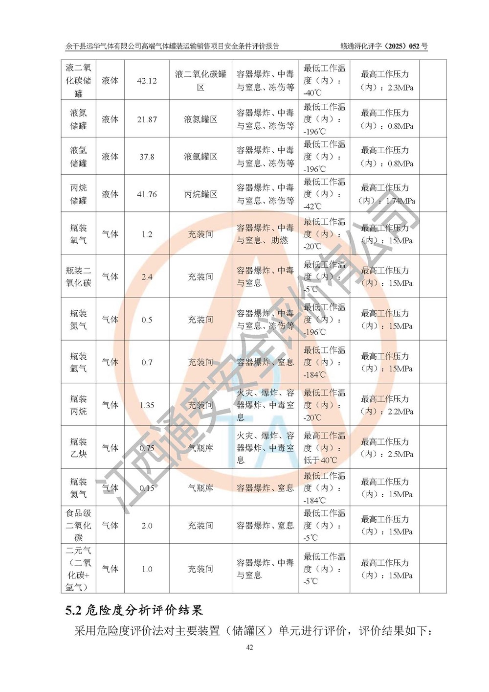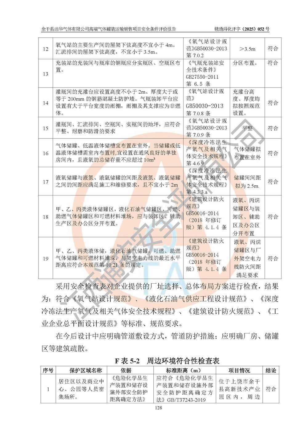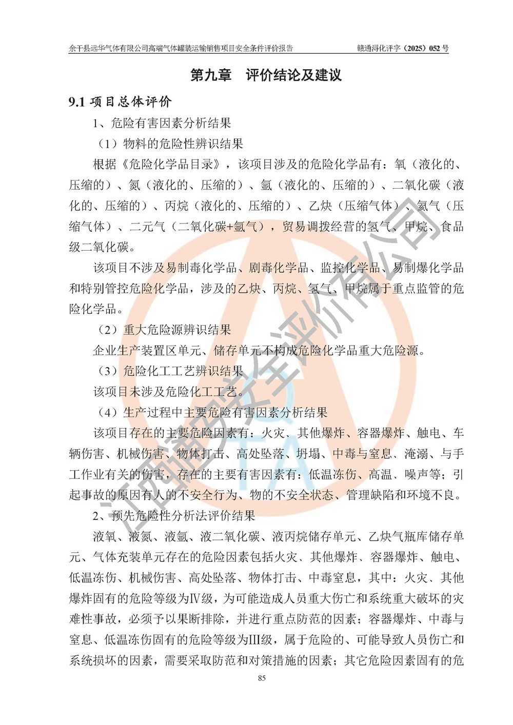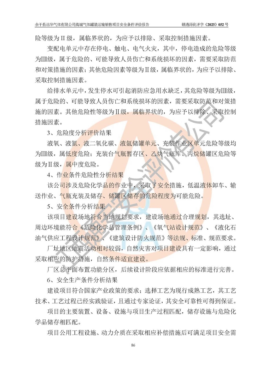 評價結(jié)論 | 綜上所述:余干縣遠華氣體有限公司高端氣體罐裝運輸銷售項目的選址、總平面布局、總體運輸、周邊環(huán)境、自然環(huán)境能滿足建設(shè)安全條件;項目選擇的工藝過程及設(shè)備設(shè)施的安全可靠性能達到**法規(guī)、標準規(guī)定要求;項目存在的危險有害因素可控,在落實本評價報告提出的有關(guān)安全對策措施后,其危險有害程度能達到可以接受的程度,項目建設(shè)能夠?qū)崿F(xiàn)安全運行目標。 | ||||||