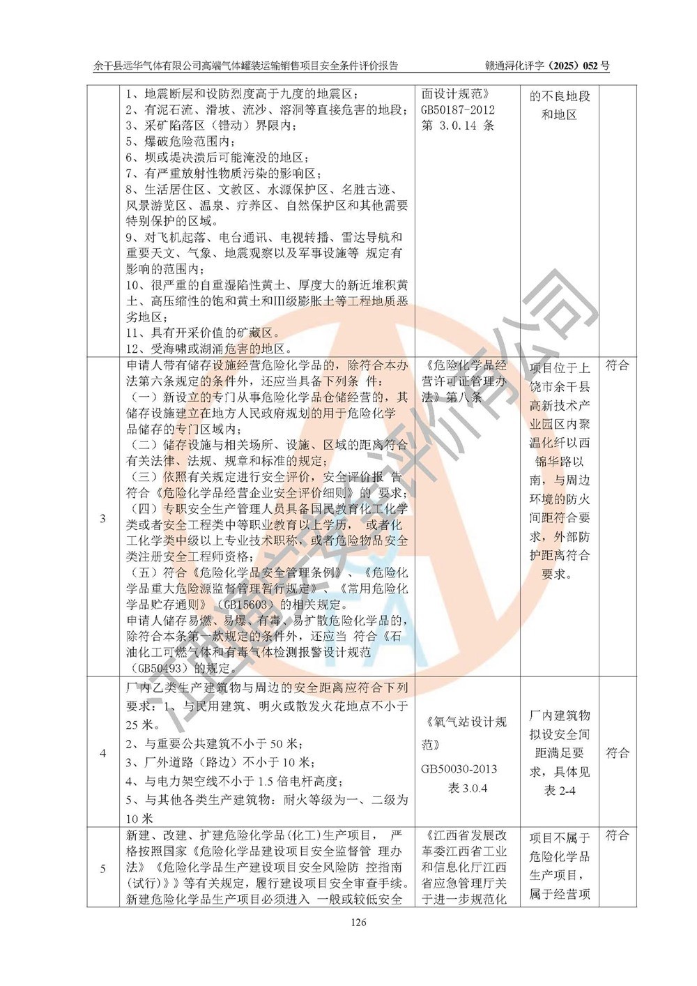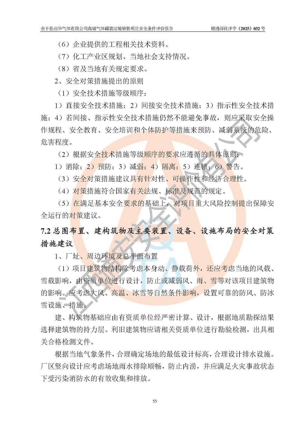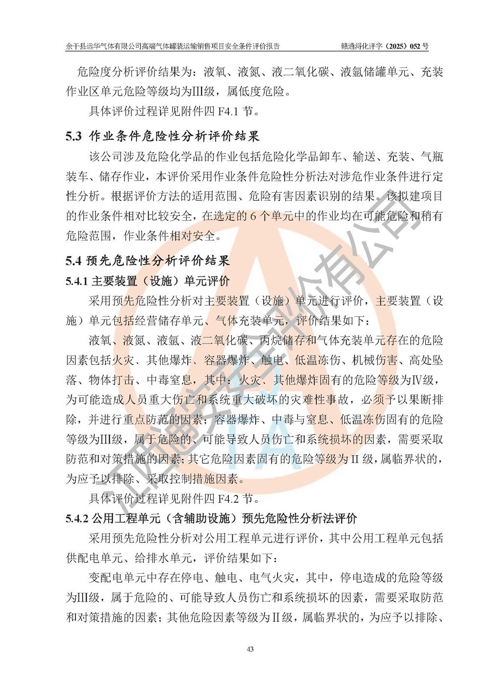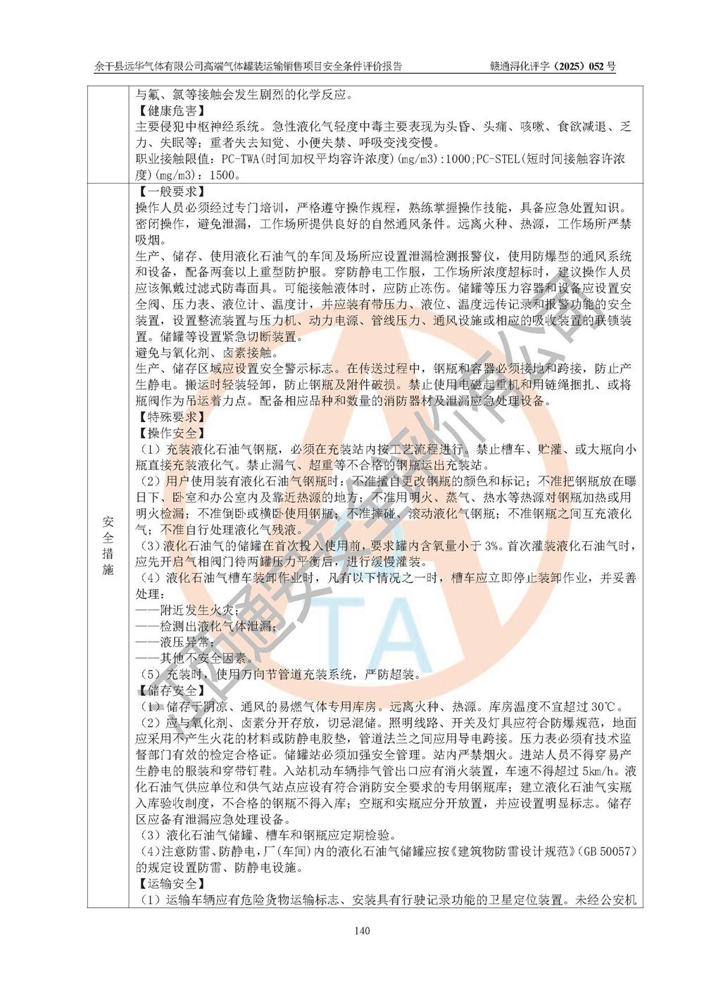 評價結(jié)論 | 綜上所述:余干縣遠華氣體有限公司高端氣體罐裝運輸銷售項目的選址、總平面布局、總體運輸、周邊環(huán)境、自然環(huán)境能滿足建設(shè)安全條件;項目選擇的工藝過程及設(shè)備設(shè)施的安全可靠性能達到**法規(guī)、標準規(guī)定要求;項目存在的危險有害因素可控,在落實本評價報告提出的有關(guān)安全對策措施后,其危險有害程度能達到可以接受的程度,項目建設(shè)能夠?qū)崿F(xiàn)安全運行目標。 | ||||||