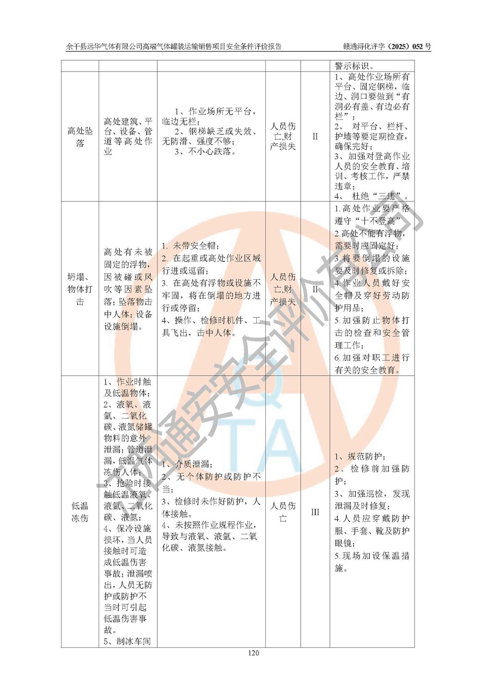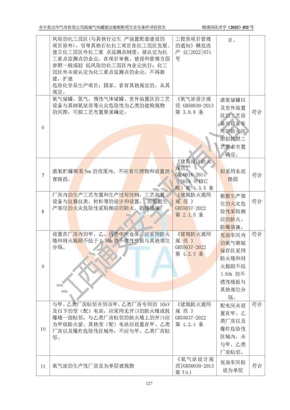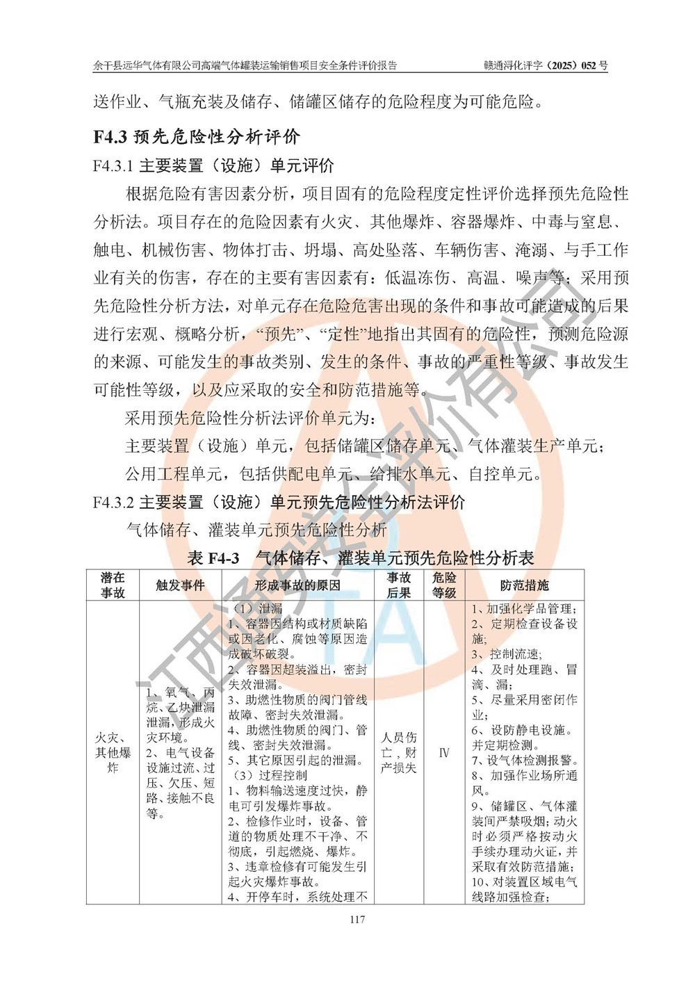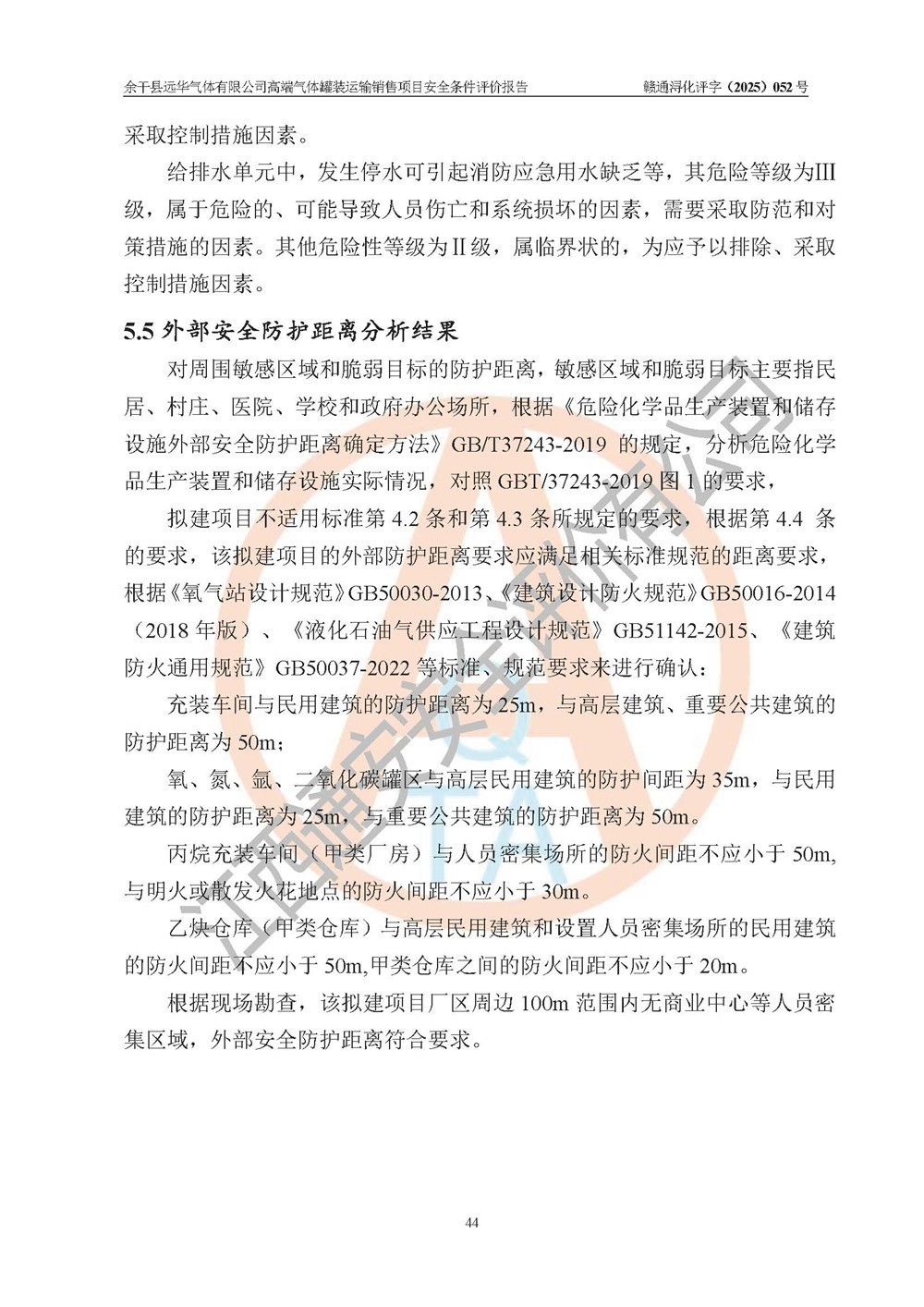評價結(jié)論 | 綜上所述:余干縣遠華氣體有限公司高端氣體罐裝運輸銷售項目的選址、總平面布局、總體運輸、周邊環(huán)境、自然環(huán)境能滿足建設(shè)安全條件;項目選擇的工藝過程及設(shè)備設(shè)施的安全可靠性能達到**法規(guī)、標準規(guī)定要求;項目存在的危險有害因素可控,在落實本評價報告提出的有關(guān)安全對策措施后,其危險有害程度能達到可以接受的程度,項目建設(shè)能夠?qū)崿F(xiàn)安全運行目標。 | ||||||