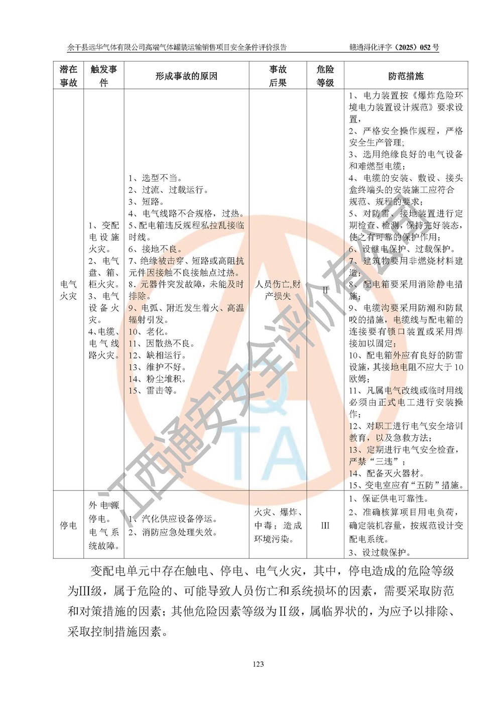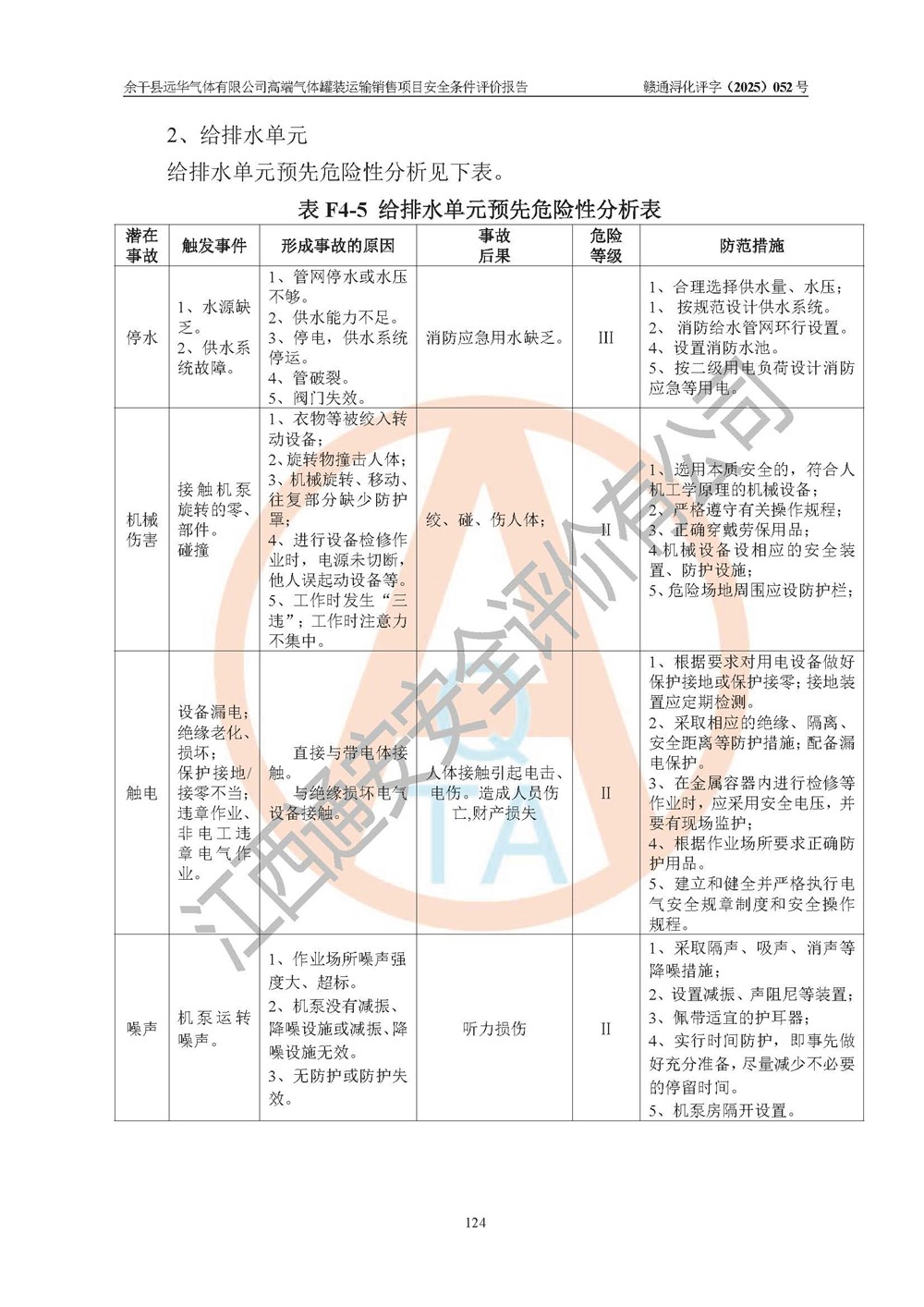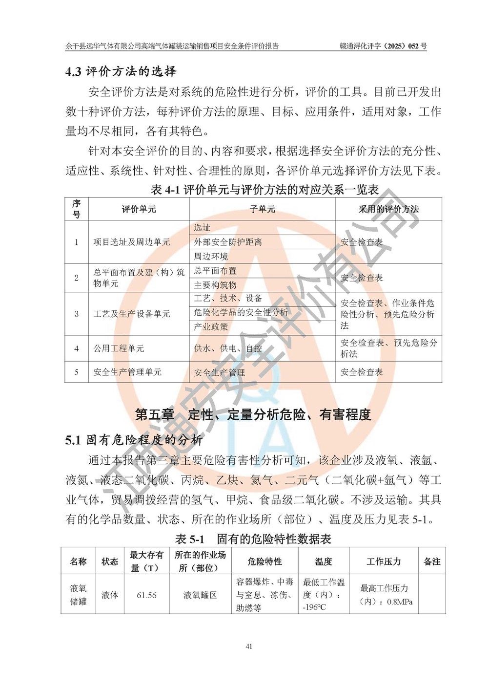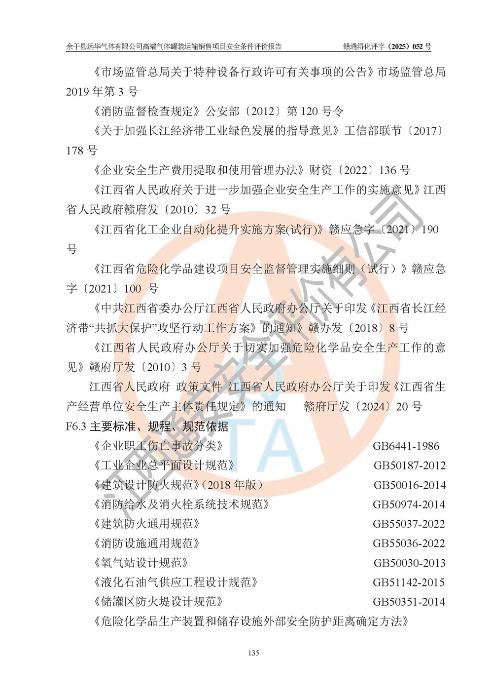 評價結(jié)論 | 綜上所述:余干縣遠華氣體有限公司高端氣體罐裝運輸銷售項目的選址、總平面布局、總體運輸、周邊環(huán)境、自然環(huán)境能滿足建設(shè)安全條件;項目選擇的工藝過程及設(shè)備設(shè)施的安全可靠性能達到**法規(guī)、標準規(guī)定要求;項目存在的危險有害因素可控,在落實本評價報告提出的有關(guān)安全對策措施后,其危險有害程度能達到可以接受的程度,項目建設(shè)能夠?qū)崿F(xiàn)安全運行目標。 | ||||||