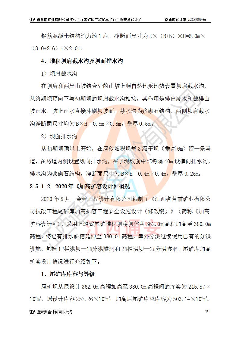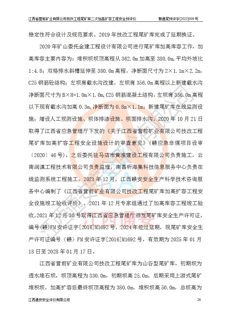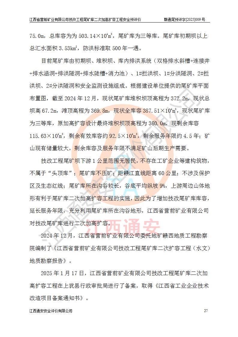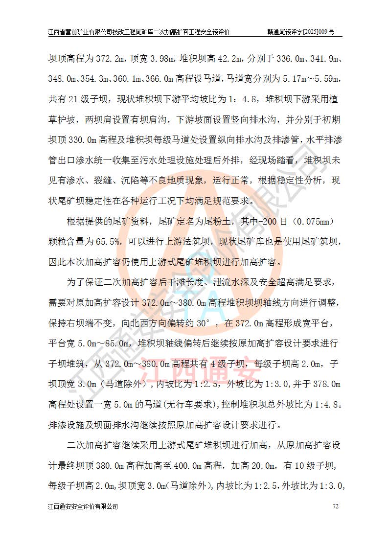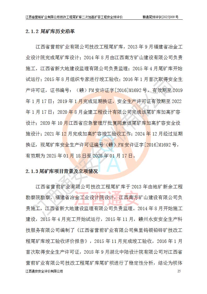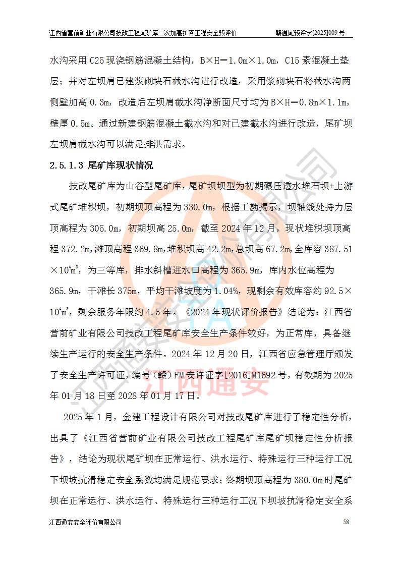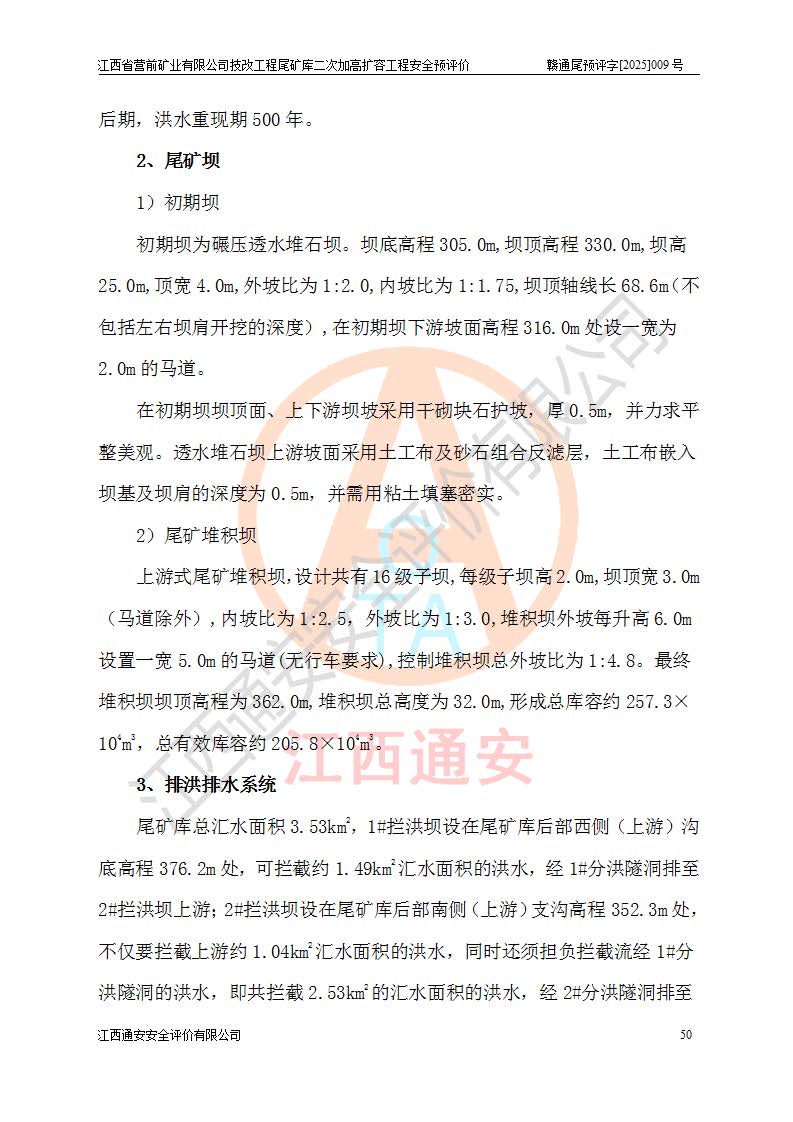 江西省營前礦業(yè)有限公司于2003年12月16日成立,位于贛州市上猶縣營前鎮(zhèn)焦里村境內(nèi),公司注冊資本10000萬元,法定**人陳雅博,礦區(qū)地理坐標:東經(jīng)114°18′30″~114°19′00″,北緯25°52′35″~25°53′47″。公司經(jīng)營范圍包括:鉛礦、鋅、鎢、銀地下開采、銷售。 江西省營前礦業(yè)有限公司技改工程尾礦庫位于焦里鎢銀鉛鋅礦區(qū),處于上猶縣水巖鄉(xiāng)井子村坑尾自然村境內(nèi),為山谷型尾礦庫。 江西省營前礦業(yè)有限公司技改工程尾礦庫于2013年由福建省冶金工業(yè)設(shè)計院設(shè)計,2014年8月開始施工建設(shè),2015年4月竣工開始試運行,2015年11月完成竣工驗收,2016年1月首次取得安全生產(chǎn)許可證,2019年1月完成延期換證,2020年8月委托金建工程設(shè)計有限公司進行尾礦庫加高擴容工作,2020年10月21日取得了江西省應(yīng)急管理廳下發(fā)的《關(guān)于江西省營前礦業(yè)有限公司技改工程尾礦庫加高擴容工程安全設(shè)施設(shè)計的審查意見》(贛應(yīng)急非煤項目設(shè)審〔2020〕46號),之后委托駐馬店市黃淮建設(shè)工程有限公司負責施工,云南潤滇工程技術(shù)有限公司負責監(jiān)理,2021年12月完成加高擴容竣工驗收工作,經(jīng)過延期,現(xiàn)尾礦庫安全生產(chǎn)許可證編號(贛)FM安許證字[2016]M1692號,**期為2025年01月18日至2028年01月17日。 江西省營前礦業(yè)有限公司技改工程尾礦庫為山谷型尾礦庫,初期壩為透水堆石壩,壩頂高程為330.0m,初期壩高25.0m,后期采用上游式尾礦堆積壩,加高擴容后*終壩頂高程為380.0m,堆積壩高50.0m,總壩高為75.0m,總庫容為為503.14×104m3,尾礦庫為三等庫。尾礦庫初期壩以上總匯水面積3.53km2,防洪標準取500年一遇。 目前尾礦庫由初期壩、堆積壩、庫內(nèi)排洪系統(tǒng)(雙格排水斜槽+連接井+排水涵洞+排洪隧洞+排水陡槽+消力池)、1#攔洪壩、1#分洪隧洞、2#攔洪壩、2#分洪隧洞和安全監(jiān)測設(shè)施組成。根據(jù)建設(shè)單位提供的尾礦庫平面布置圖,截至2024年12月,現(xiàn)狀尾礦庫堆積壩頂高程為372.2m,現(xiàn)狀總壩高67.2m,灘頂高程為369.8m,現(xiàn)狀全庫容387.51×104m3,現(xiàn)狀尾礦庫為三等庫,原加高擴容設(shè)計*終堆積壩頂高程為380.0m,現(xiàn)剩余庫容115.63×104m3,剩余**庫容約92.5×104m3,剩余服務(wù)年限約4.5年;礦山現(xiàn)有儲量較大,剩余庫容及服務(wù)年限不滿足礦山后期生產(chǎn)需要。 技改工程尾礦庫尾礦壩下游1**范圍無居民,不存在工礦企業(yè)等建構(gòu)筑物,不屬于“頭頂庫”;尾礦庫不壓礦;距贛江直線距離60**;不涉及保護區(qū)及生態(tài)紅線;尾礦庫所在溝谷較長,谷底平均縱坡9%,上游周邊山體地形有利于尾礦庫二次加高擴容工程的實施,因此為了增加尾礦庫庫容,延長服務(wù)年限,充分利用尾礦庫所在溝谷地形,江西省營前礦業(yè)有限公司對技改尾礦庫進行二次加高擴容。 2024年12月,江西省營前礦業(yè)有限公司委托地礦贛西地質(zhì)工程勘察院編制了《江西省營前礦業(yè)有限公司技改工程尾礦庫二次擴容工程(水文)地質(zhì)勘察報告》,2025年4月,江西省營前礦業(yè)有限公司委托金建工程設(shè)計有限公司編制了《江西省營前礦業(yè)有限公司技改工程尾礦庫二次加高擴容工程可行性研究報告》。 按照非煤礦山建設(shè)項目安全設(shè)施“三同時”的規(guī)定要求,技改工程尾礦庫為二次加高擴容工程,**進行安全預評價;江西省營前礦業(yè)有限公司委托我公司承擔技改工程尾礦庫二次加高擴容工程建設(shè)項目的安全預評價工作。 |