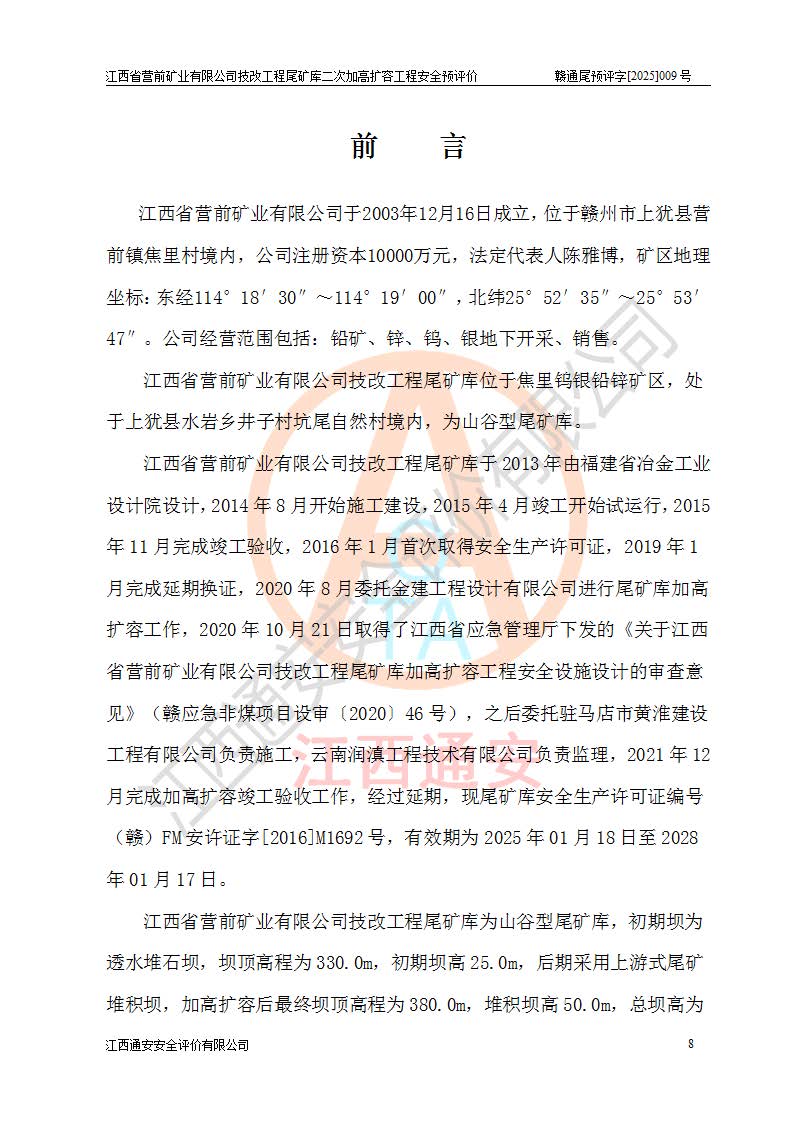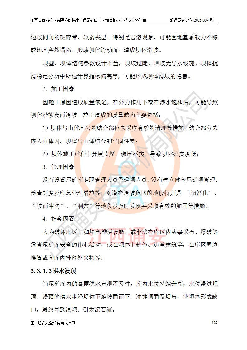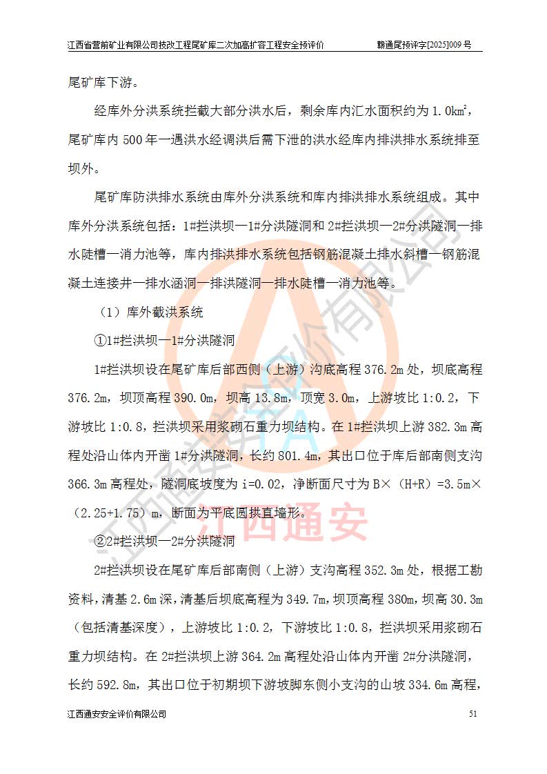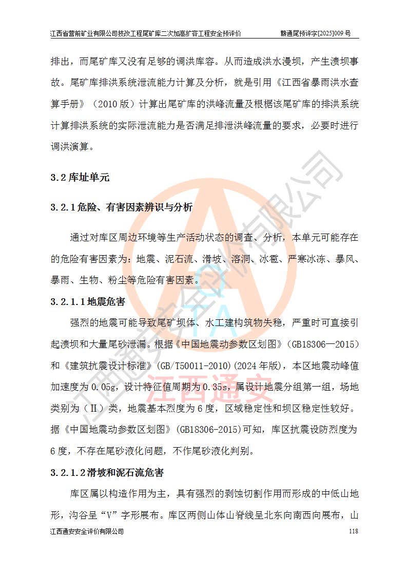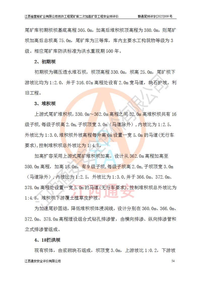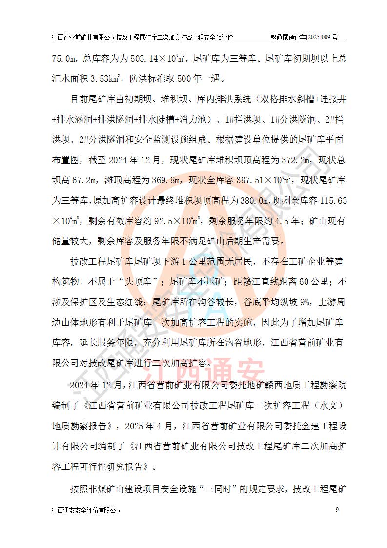 江西省營前礦業(yè)有限公司于2003年12月16日成立,位于贛州市上猶縣營前鎮(zhèn)焦里村境內(nèi),公司注冊資本10000萬元,法定**人陳雅博,礦區(qū)地理坐標:東經(jīng)114°18′30″~114°19′00″,北緯25°52′35″~25°53′47″。公司經(jīng)營范圍包括:鉛礦、鋅、鎢、銀地下開采、銷售。 江西省營前礦業(yè)有限公司技改工程尾礦庫位于焦里鎢銀鉛鋅礦區(qū),處于上猶縣水巖鄉(xiāng)井子村坑尾自然村境內(nèi),為山谷型尾礦庫。 江西省營前礦業(yè)有限公司技改工程尾礦庫于2013年由福建省冶金工業(yè)設(shè)計院設(shè)計,2014年8月開始施工建設(shè),2015年4月竣工開始試運行,2015年11月完成竣工驗收,2016年1月首次取得安全生產(chǎn)許可證,2019年1月完成延期換證,2020年8月委托金建工程設(shè)計有限公司進行尾礦庫加高擴容工作,2020年10月21日取得了江西省應(yīng)急管理廳下發(fā)的《關(guān)于江西省營前礦業(yè)有限公司技改工程尾礦庫加高擴容工程安全設(shè)施設(shè)計的審查意見》(贛應(yīng)急非煤項目設(shè)審〔2020〕46號),之后委托駐馬店市黃淮建設(shè)工程有限公司負責施工,云南潤滇工程技術(shù)有限公司負責監(jiān)理,2021年12月完成加高擴容竣工驗收工作,經(jīng)過延期,現(xiàn)尾礦庫安全生產(chǎn)許可證編號(贛)FM安許證字[2016]M1692號,**期為2025年01月18日至2028年01月17日。 江西省營前礦業(yè)有限公司技改工程尾礦庫為山谷型尾礦庫,初期壩為透水堆石壩,壩頂高程為330.0m,初期壩高25.0m,后期采用上游式尾礦堆積壩,加高擴容后*終壩頂高程為380.0m,堆積壩高50.0m,總壩高為75.0m,總庫容為為503.14×104m3,尾礦庫為三等庫。尾礦庫初期壩以上總匯水面積3.53km2,防洪標準取500年一遇。 目前尾礦庫由初期壩、堆積壩、庫內(nèi)排洪系統(tǒng)(雙格排水斜槽+連接井+排水涵洞+排洪隧洞+排水陡槽+消力池)、1#攔洪壩、1#分洪隧洞、2#攔洪壩、2#分洪隧洞和安全監(jiān)測設(shè)施組成。根據(jù)建設(shè)單位提供的尾礦庫平面布置圖,截至2024年12月,現(xiàn)狀尾礦庫堆積壩頂高程為372.2m,現(xiàn)狀總壩高67.2m,灘頂高程為369.8m,現(xiàn)狀全庫容387.51×104m3,現(xiàn)狀尾礦庫為三等庫,原加高擴容設(shè)計*終堆積壩頂高程為380.0m,現(xiàn)剩余庫容115.63×104m3,剩余**庫容約92.5×104m3,剩余服務(wù)年限約4.5年;礦山現(xiàn)有儲量較大,剩余庫容及服務(wù)年限不滿足礦山后期生產(chǎn)需要。 技改工程尾礦庫尾礦壩下游1**范圍無居民,不存在工礦企業(yè)等建構(gòu)筑物,不屬于“頭頂庫”;尾礦庫不壓礦;距贛江直線距離60**;不涉及保護區(qū)及生態(tài)紅線;尾礦庫所在溝谷較長,谷底平均縱坡9%,上游周邊山體地形有利于尾礦庫二次加高擴容工程的實施,因此為了增加尾礦庫庫容,延長服務(wù)年限,充分利用尾礦庫所在溝谷地形,江西省營前礦業(yè)有限公司對技改尾礦庫進行二次加高擴容。 2024年12月,江西省營前礦業(yè)有限公司委托地礦贛西地質(zhì)工程勘察院編制了《江西省營前礦業(yè)有限公司技改工程尾礦庫二次擴容工程(水文)地質(zhì)勘察報告》,2025年4月,江西省營前礦業(yè)有限公司委托金建工程設(shè)計有限公司編制了《江西省營前礦業(yè)有限公司技改工程尾礦庫二次加高擴容工程可行性研究報告》。 按照非煤礦山建設(shè)項目安全設(shè)施“三同時”的規(guī)定要求,技改工程尾礦庫為二次加高擴容工程,**進行安全預評價;江西省營前礦業(yè)有限公司委托我公司承擔技改工程尾礦庫二次加高擴容工程建設(shè)項目的安全預評價工作。 |