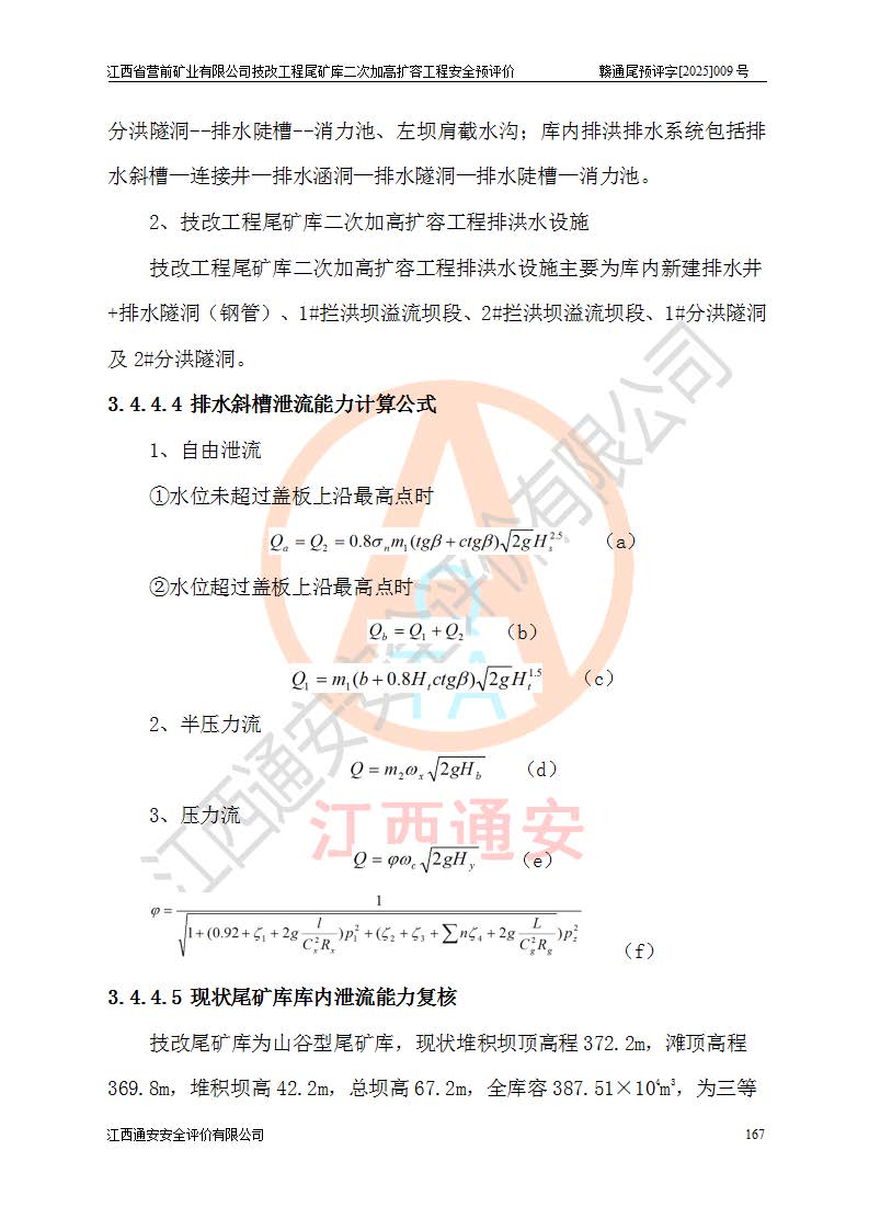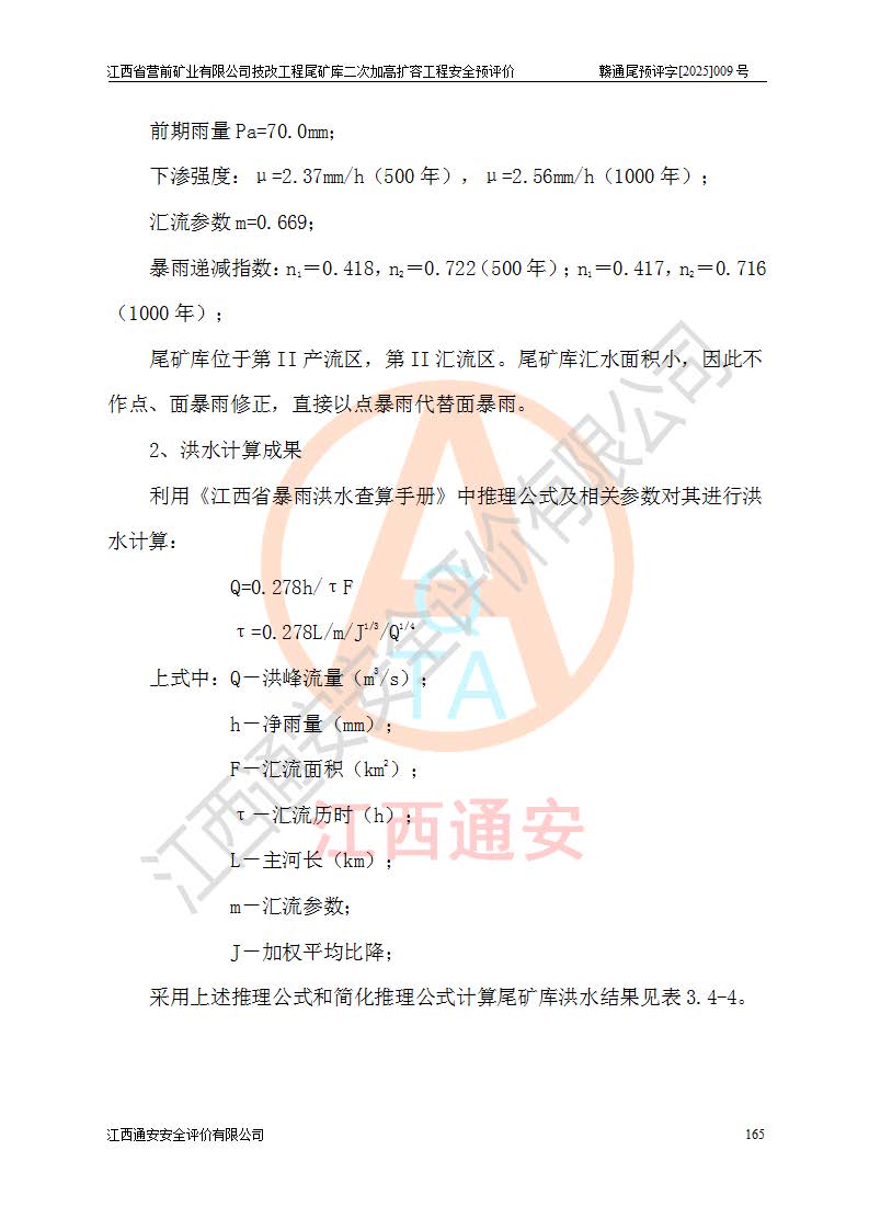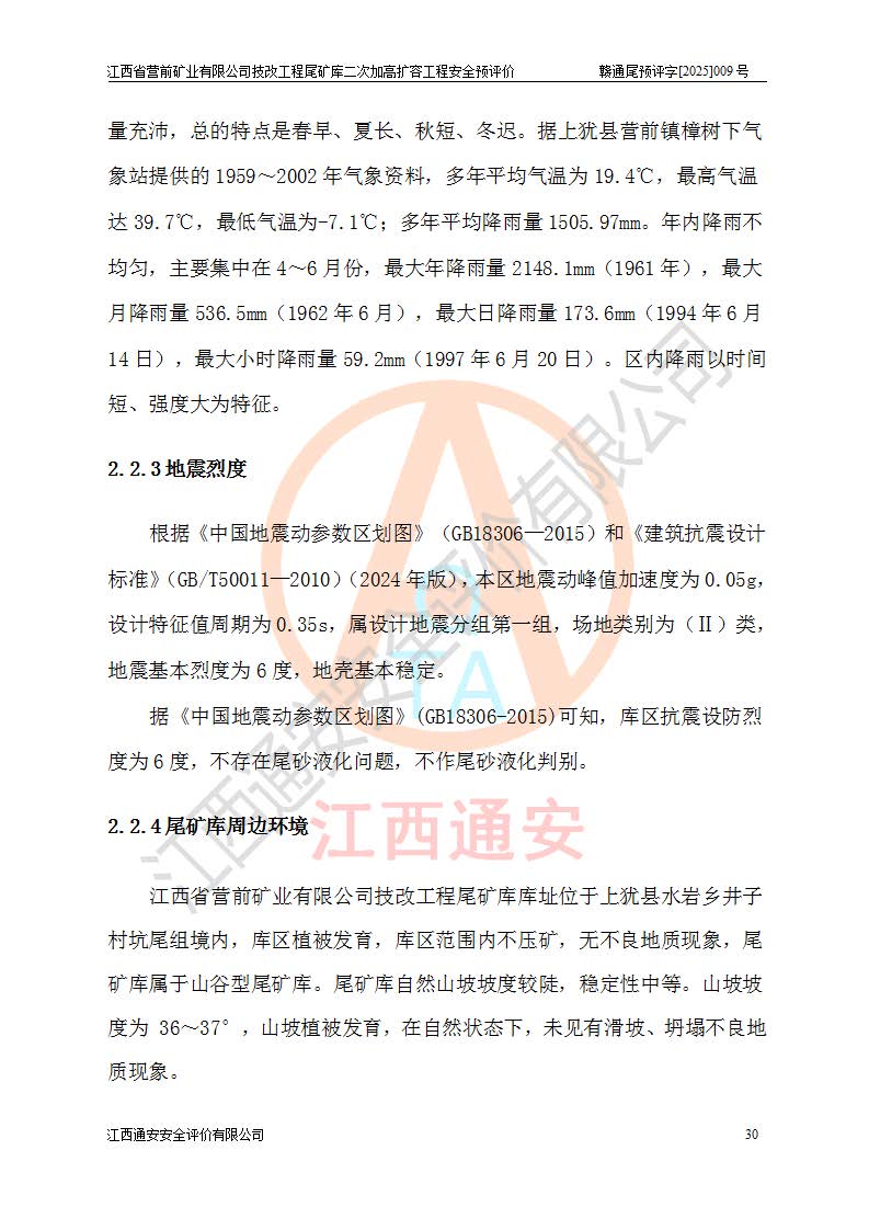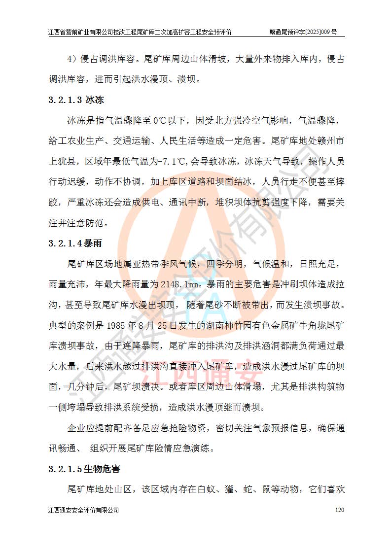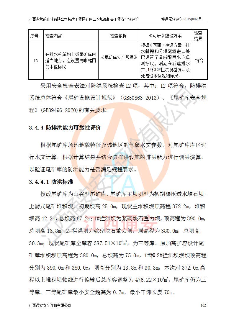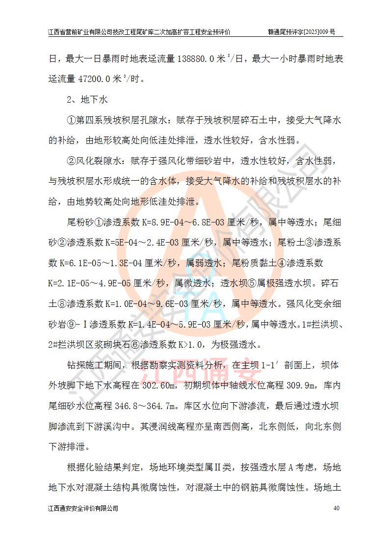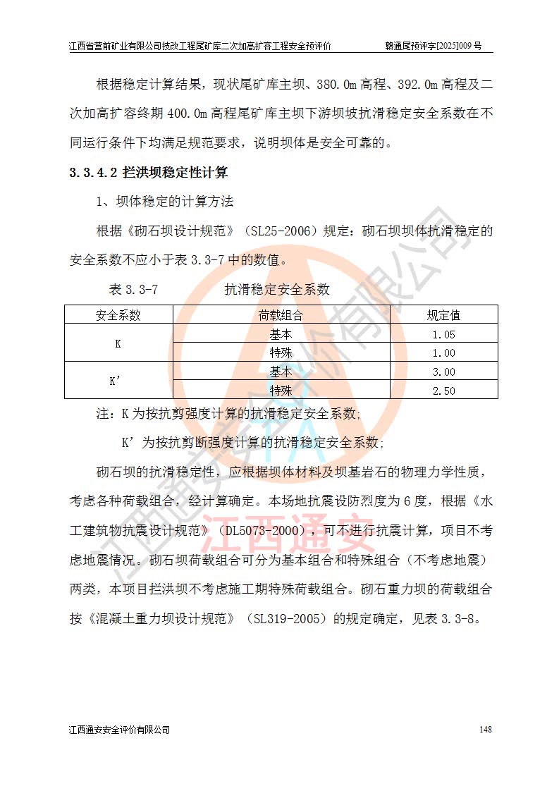 江西省營前礦業(yè)有限公司于2003年12月16日成立,位于贛州市上猶縣營前鎮(zhèn)焦里村境內(nèi),公司注冊資本10000萬元,法定**人陳雅博,礦區(qū)地理坐標:東經(jīng)114°18′30″~114°19′00″,北緯25°52′35″~25°53′47″。公司經(jīng)營范圍包括:鉛礦、鋅、鎢、銀地下開采、銷售。 江西省營前礦業(yè)有限公司技改工程尾礦庫位于焦里鎢銀鉛鋅礦區(qū),處于上猶縣水巖鄉(xiāng)井子村坑尾自然村境內(nèi),為山谷型尾礦庫。 江西省營前礦業(yè)有限公司技改工程尾礦庫于2013年由福建省冶金工業(yè)設(shè)計院設(shè)計,2014年8月開始施工建設(shè),2015年4月竣工開始試運行,2015年11月完成竣工驗收,2016年1月首次取得安全生產(chǎn)許可證,2019年1月完成延期換證,2020年8月委托金建工程設(shè)計有限公司進行尾礦庫加高擴容工作,2020年10月21日取得了江西省應(yīng)急管理廳下發(fā)的《關(guān)于江西省營前礦業(yè)有限公司技改工程尾礦庫加高擴容工程安全設(shè)施設(shè)計的審查意見》(贛應(yīng)急非煤項目設(shè)審〔2020〕46號),之后委托駐馬店市黃淮建設(shè)工程有限公司負責施工,云南潤滇工程技術(shù)有限公司負責監(jiān)理,2021年12月完成加高擴容竣工驗收工作,經(jīng)過延期,現(xiàn)尾礦庫安全生產(chǎn)許可證編號(贛)FM安許證字[2016]M1692號,**期為2025年01月18日至2028年01月17日。 江西省營前礦業(yè)有限公司技改工程尾礦庫為山谷型尾礦庫,初期壩為透水堆石壩,壩頂高程為330.0m,初期壩高25.0m,后期采用上游式尾礦堆積壩,加高擴容后*終壩頂高程為380.0m,堆積壩高50.0m,總壩高為75.0m,總庫容為為503.14×104m3,尾礦庫為三等庫。尾礦庫初期壩以上總匯水面積3.53km2,防洪標準取500年一遇。 目前尾礦庫由初期壩、堆積壩、庫內(nèi)排洪系統(tǒng)(雙格排水斜槽+連接井+排水涵洞+排洪隧洞+排水陡槽+消力池)、1#攔洪壩、1#分洪隧洞、2#攔洪壩、2#分洪隧洞和安全監(jiān)測設(shè)施組成。根據(jù)建設(shè)單位提供的尾礦庫平面布置圖,截至2024年12月,現(xiàn)狀尾礦庫堆積壩頂高程為372.2m,現(xiàn)狀總壩高67.2m,灘頂高程為369.8m,現(xiàn)狀全庫容387.51×104m3,現(xiàn)狀尾礦庫為三等庫,原加高擴容設(shè)計*終堆積壩頂高程為380.0m,現(xiàn)剩余庫容115.63×104m3,剩余**庫容約92.5×104m3,剩余服務(wù)年限約4.5年;礦山現(xiàn)有儲量較大,剩余庫容及服務(wù)年限不滿足礦山后期生產(chǎn)需要。 技改工程尾礦庫尾礦壩下游1**范圍無居民,不存在工礦企業(yè)等建構(gòu)筑物,不屬于“頭頂庫”;尾礦庫不壓礦;距贛江直線距離60**;不涉及保護區(qū)及生態(tài)紅線;尾礦庫所在溝谷較長,谷底平均縱坡9%,上游周邊山體地形有利于尾礦庫二次加高擴容工程的實施,因此為了增加尾礦庫庫容,延長服務(wù)年限,充分利用尾礦庫所在溝谷地形,江西省營前礦業(yè)有限公司對技改尾礦庫進行二次加高擴容。 2024年12月,江西省營前礦業(yè)有限公司委托地礦贛西地質(zhì)工程勘察院編制了《江西省營前礦業(yè)有限公司技改工程尾礦庫二次擴容工程(水文)地質(zhì)勘察報告》,2025年4月,江西省營前礦業(yè)有限公司委托金建工程設(shè)計有限公司編制了《江西省營前礦業(yè)有限公司技改工程尾礦庫二次加高擴容工程可行性研究報告》。 按照非煤礦山建設(shè)項目安全設(shè)施“三同時”的規(guī)定要求,技改工程尾礦庫為二次加高擴容工程,**進行安全預評價;江西省營前礦業(yè)有限公司委托我公司承擔技改工程尾礦庫二次加高擴容工程建設(shè)項目的安全預評價工作。 |