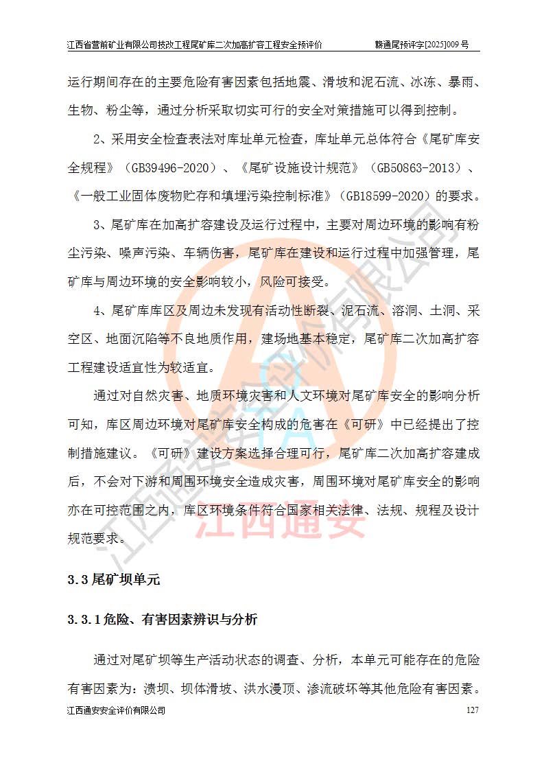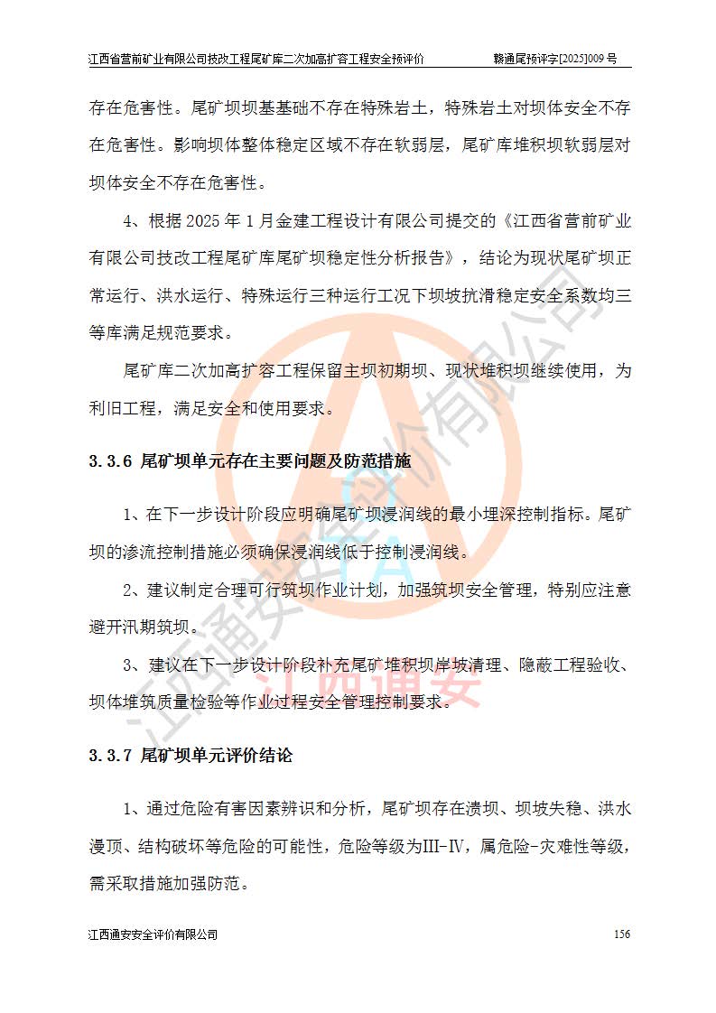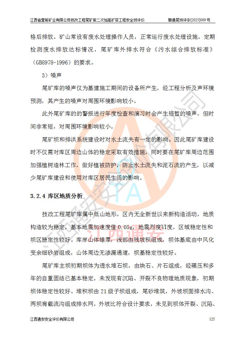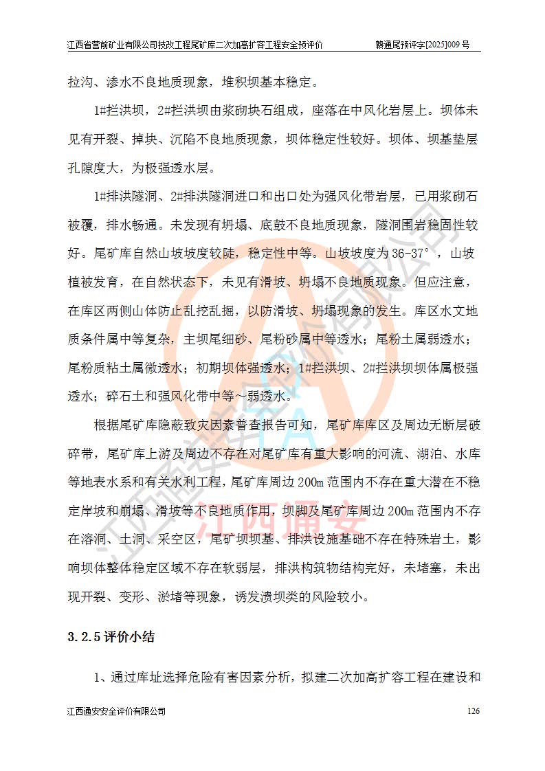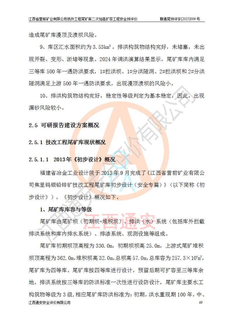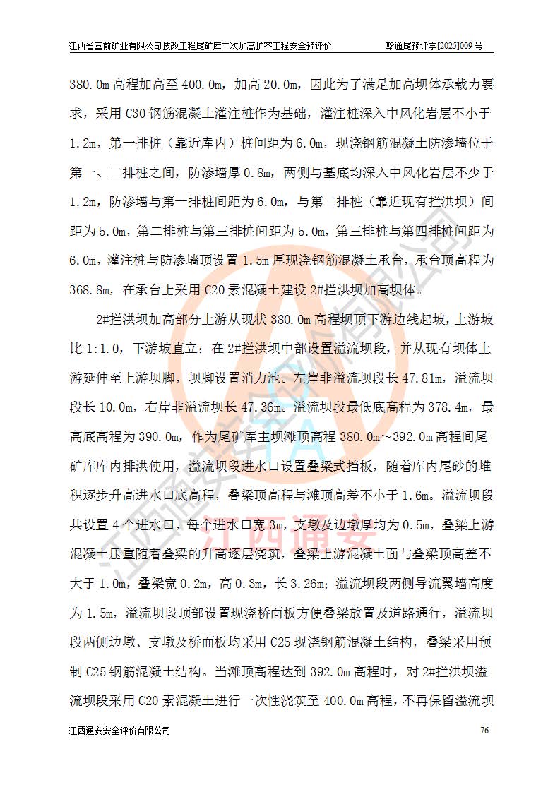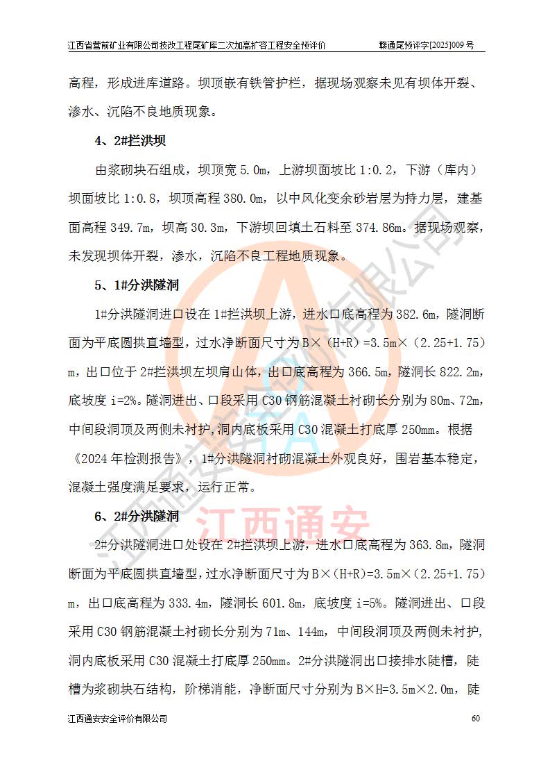 江西省營前礦業(yè)有限公司于2003年12月16日成立,位于贛州市上猶縣營前鎮(zhèn)焦里村境內(nèi),公司注冊資本10000萬元,法定**人陳雅博,礦區(qū)地理坐標:東經(jīng)114°18′30″~114°19′00″,北緯25°52′35″~25°53′47″。公司經(jīng)營范圍包括:鉛礦、鋅、鎢、銀地下開采、銷售。 江西省營前礦業(yè)有限公司技改工程尾礦庫位于焦里鎢銀鉛鋅礦區(qū),處于上猶縣水巖鄉(xiāng)井子村坑尾自然村境內(nèi),為山谷型尾礦庫。 江西省營前礦業(yè)有限公司技改工程尾礦庫于2013年由福建省冶金工業(yè)設(shè)計院設(shè)計,2014年8月開始施工建設(shè),2015年4月竣工開始試運行,2015年11月完成竣工驗收,2016年1月首次取得安全生產(chǎn)許可證,2019年1月完成延期換證,2020年8月委托金建工程設(shè)計有限公司進行尾礦庫加高擴容工作,2020年10月21日取得了江西省應(yīng)急管理廳下發(fā)的《關(guān)于江西省營前礦業(yè)有限公司技改工程尾礦庫加高擴容工程安全設(shè)施設(shè)計的審查意見》(贛應(yīng)急非煤項目設(shè)審〔2020〕46號),之后委托駐馬店市黃淮建設(shè)工程有限公司負責施工,云南潤滇工程技術(shù)有限公司負責監(jiān)理,2021年12月完成加高擴容竣工驗收工作,經(jīng)過延期,現(xiàn)尾礦庫安全生產(chǎn)許可證編號(贛)FM安許證字[2016]M1692號,**期為2025年01月18日至2028年01月17日。 江西省營前礦業(yè)有限公司技改工程尾礦庫為山谷型尾礦庫,初期壩為透水堆石壩,壩頂高程為330.0m,初期壩高25.0m,后期采用上游式尾礦堆積壩,加高擴容后*終壩頂高程為380.0m,堆積壩高50.0m,總壩高為75.0m,總庫容為為503.14×104m3,尾礦庫為三等庫。尾礦庫初期壩以上總匯水面積3.53km2,防洪標準取500年一遇。 目前尾礦庫由初期壩、堆積壩、庫內(nèi)排洪系統(tǒng)(雙格排水斜槽+連接井+排水涵洞+排洪隧洞+排水陡槽+消力池)、1#攔洪壩、1#分洪隧洞、2#攔洪壩、2#分洪隧洞和安全監(jiān)測設(shè)施組成。根據(jù)建設(shè)單位提供的尾礦庫平面布置圖,截至2024年12月,現(xiàn)狀尾礦庫堆積壩頂高程為372.2m,現(xiàn)狀總壩高67.2m,灘頂高程為369.8m,現(xiàn)狀全庫容387.51×104m3,現(xiàn)狀尾礦庫為三等庫,原加高擴容設(shè)計*終堆積壩頂高程為380.0m,現(xiàn)剩余庫容115.63×104m3,剩余**庫容約92.5×104m3,剩余服務(wù)年限約4.5年;礦山現(xiàn)有儲量較大,剩余庫容及服務(wù)年限不滿足礦山后期生產(chǎn)需要。 技改工程尾礦庫尾礦壩下游1**范圍無居民,不存在工礦企業(yè)等建構(gòu)筑物,不屬于“頭頂庫”;尾礦庫不壓礦;距贛江直線距離60**;不涉及保護區(qū)及生態(tài)紅線;尾礦庫所在溝谷較長,谷底平均縱坡9%,上游周邊山體地形有利于尾礦庫二次加高擴容工程的實施,因此為了增加尾礦庫庫容,延長服務(wù)年限,充分利用尾礦庫所在溝谷地形,江西省營前礦業(yè)有限公司對技改尾礦庫進行二次加高擴容。 2024年12月,江西省營前礦業(yè)有限公司委托地礦贛西地質(zhì)工程勘察院編制了《江西省營前礦業(yè)有限公司技改工程尾礦庫二次擴容工程(水文)地質(zhì)勘察報告》,2025年4月,江西省營前礦業(yè)有限公司委托金建工程設(shè)計有限公司編制了《江西省營前礦業(yè)有限公司技改工程尾礦庫二次加高擴容工程可行性研究報告》。 按照非煤礦山建設(shè)項目安全設(shè)施“三同時”的規(guī)定要求,技改工程尾礦庫為二次加高擴容工程,**進行安全預評價;江西省營前礦業(yè)有限公司委托我公司承擔技改工程尾礦庫二次加高擴容工程建設(shè)項目的安全預評價工作。 |