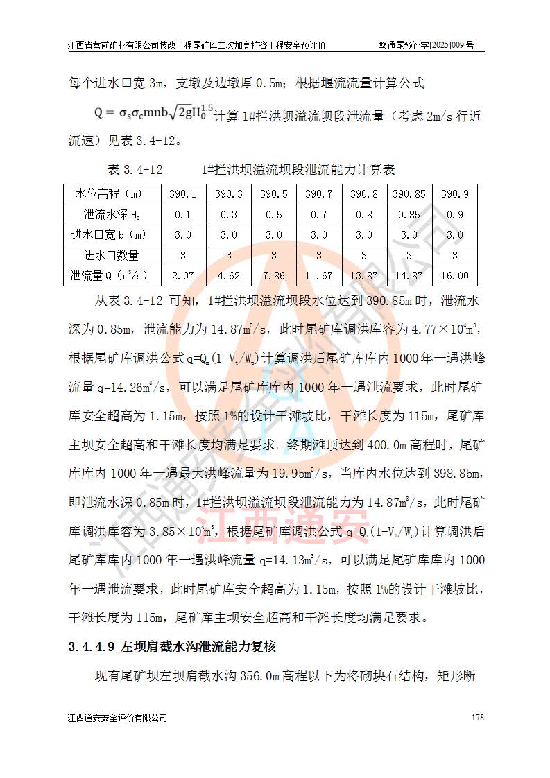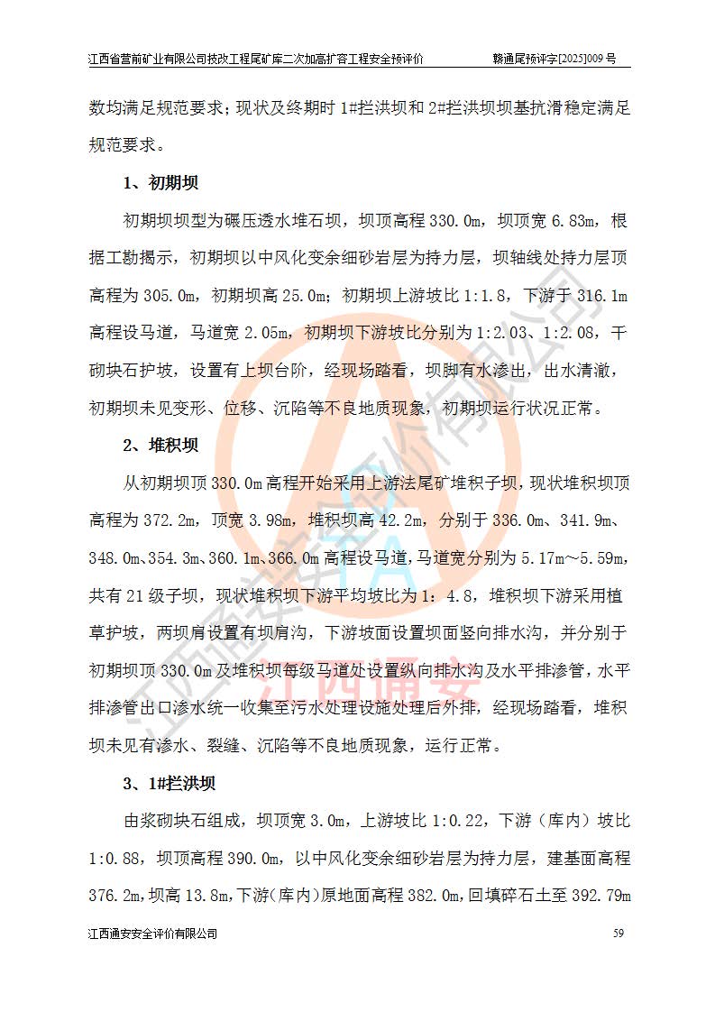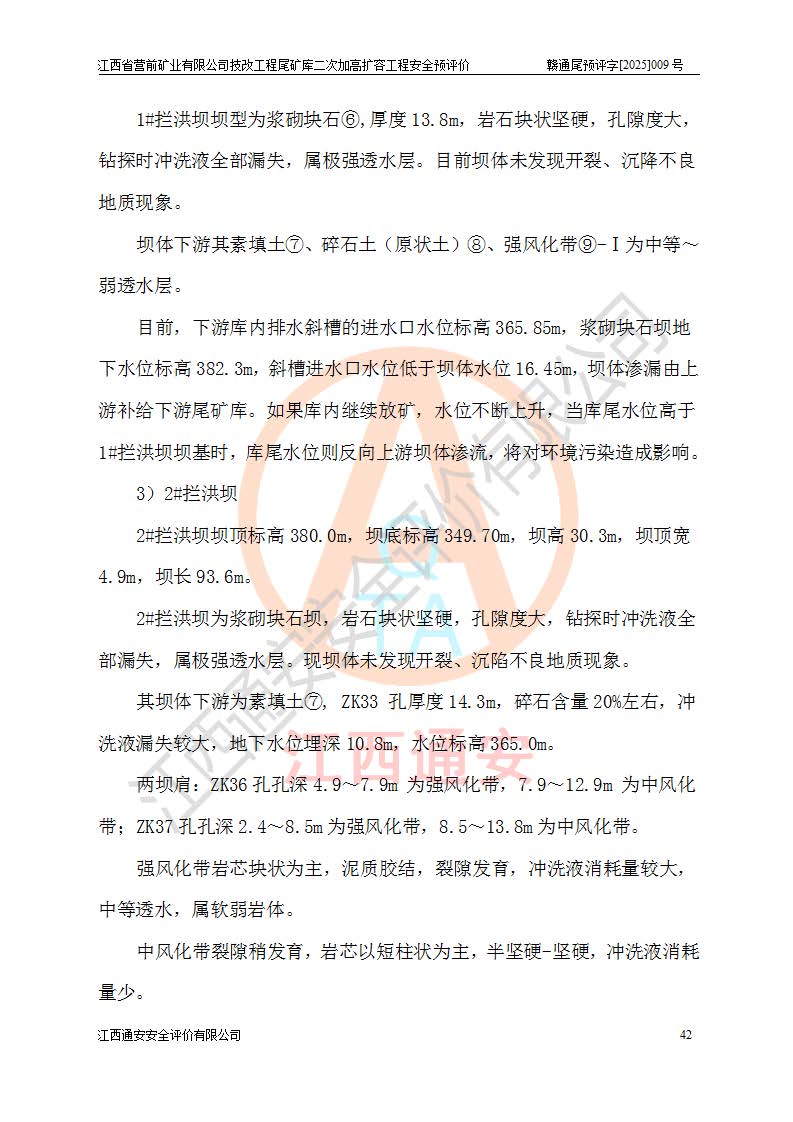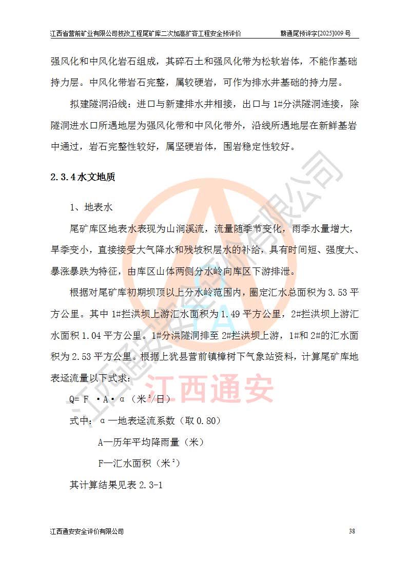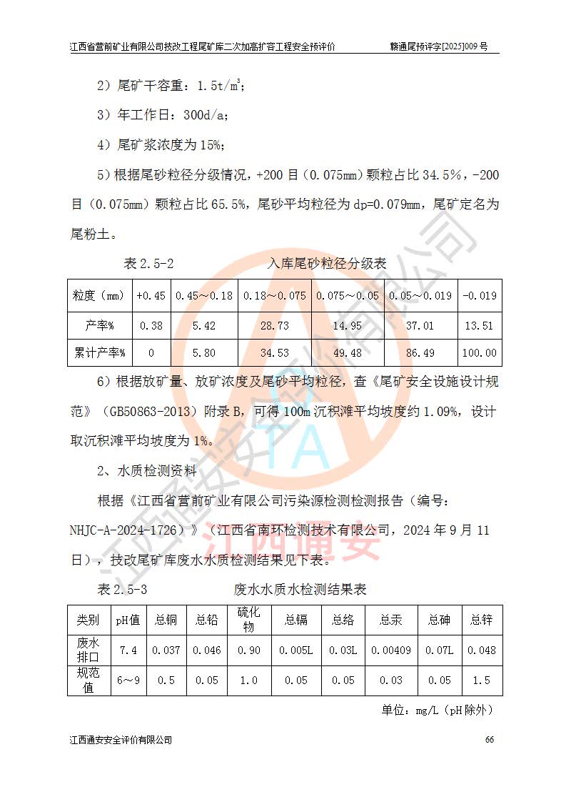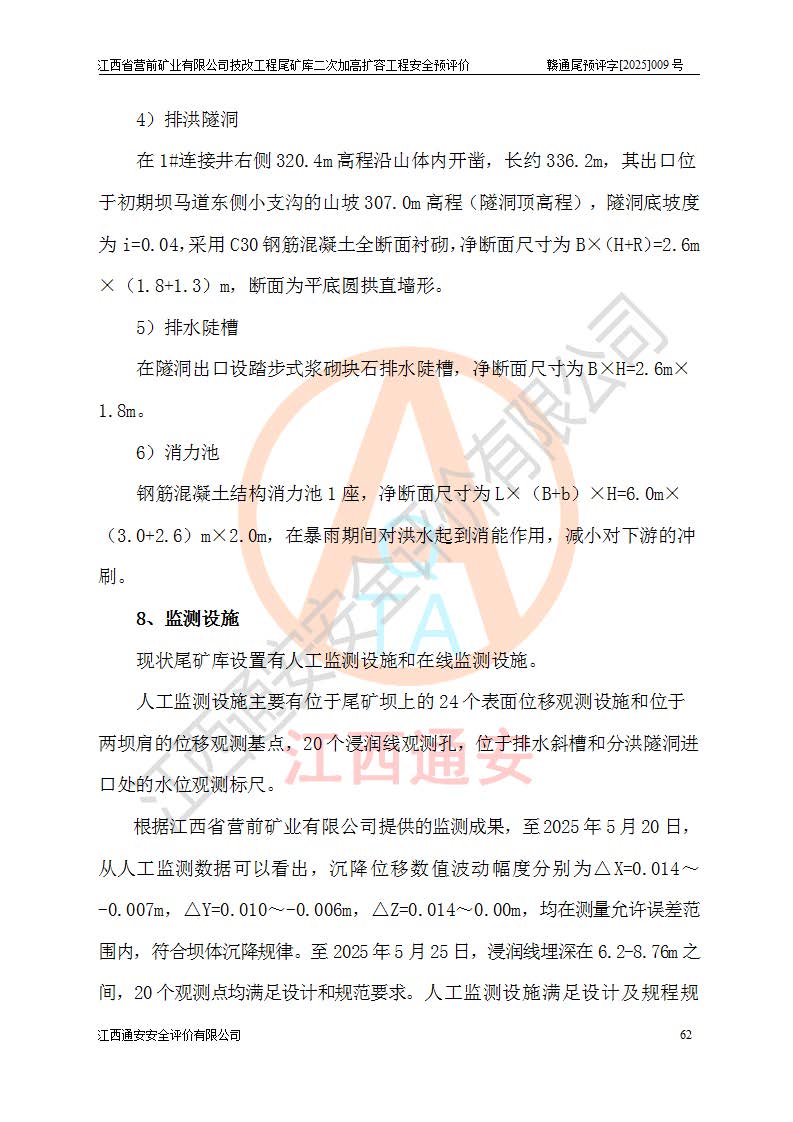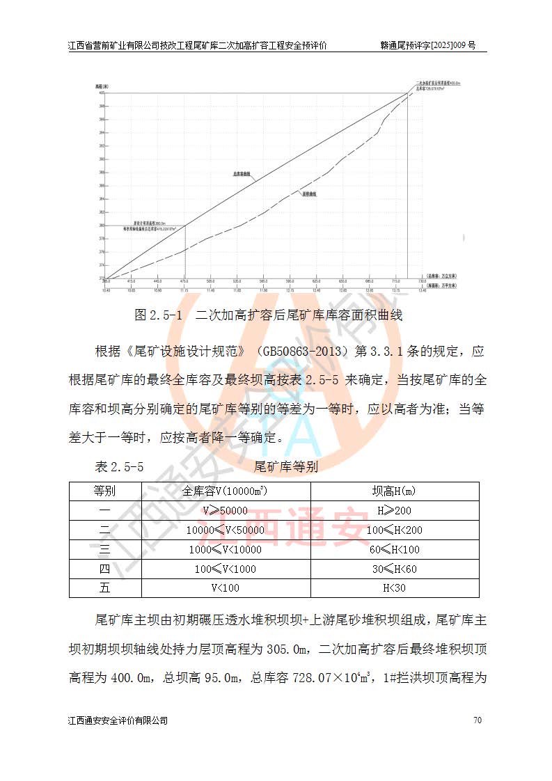 江西省營前礦業(yè)有限公司于2003年12月16日成立,位于贛州市上猶縣營前鎮(zhèn)焦里村境內(nèi),公司注冊資本10000萬元,法定**人陳雅博,礦區(qū)地理坐標:東經(jīng)114°18′30″~114°19′00″,北緯25°52′35″~25°53′47″。公司經(jīng)營范圍包括:鉛礦、鋅、鎢、銀地下開采、銷售。 江西省營前礦業(yè)有限公司技改工程尾礦庫位于焦里鎢銀鉛鋅礦區(qū),處于上猶縣水巖鄉(xiāng)井子村坑尾自然村境內(nèi),為山谷型尾礦庫。 江西省營前礦業(yè)有限公司技改工程尾礦庫于2013年由福建省冶金工業(yè)設(shè)計院設(shè)計,2014年8月開始施工建設(shè),2015年4月竣工開始試運行,2015年11月完成竣工驗收,2016年1月首次取得安全生產(chǎn)許可證,2019年1月完成延期換證,2020年8月委托金建工程設(shè)計有限公司進行尾礦庫加高擴容工作,2020年10月21日取得了江西省應(yīng)急管理廳下發(fā)的《關(guān)于江西省營前礦業(yè)有限公司技改工程尾礦庫加高擴容工程安全設(shè)施設(shè)計的審查意見》(贛應(yīng)急非煤項目設(shè)審〔2020〕46號),之后委托駐馬店市黃淮建設(shè)工程有限公司負責施工,云南潤滇工程技術(shù)有限公司負責監(jiān)理,2021年12月完成加高擴容竣工驗收工作,經(jīng)過延期,現(xiàn)尾礦庫安全生產(chǎn)許可證編號(贛)FM安許證字[2016]M1692號,**期為2025年01月18日至2028年01月17日。 江西省營前礦業(yè)有限公司技改工程尾礦庫為山谷型尾礦庫,初期壩為透水堆石壩,壩頂高程為330.0m,初期壩高25.0m,后期采用上游式尾礦堆積壩,加高擴容后*終壩頂高程為380.0m,堆積壩高50.0m,總壩高為75.0m,總庫容為為503.14×104m3,尾礦庫為三等庫。尾礦庫初期壩以上總匯水面積3.53km2,防洪標準取500年一遇。 目前尾礦庫由初期壩、堆積壩、庫內(nèi)排洪系統(tǒng)(雙格排水斜槽+連接井+排水涵洞+排洪隧洞+排水陡槽+消力池)、1#攔洪壩、1#分洪隧洞、2#攔洪壩、2#分洪隧洞和安全監(jiān)測設(shè)施組成。根據(jù)建設(shè)單位提供的尾礦庫平面布置圖,截至2024年12月,現(xiàn)狀尾礦庫堆積壩頂高程為372.2m,現(xiàn)狀總壩高67.2m,灘頂高程為369.8m,現(xiàn)狀全庫容387.51×104m3,現(xiàn)狀尾礦庫為三等庫,原加高擴容設(shè)計*終堆積壩頂高程為380.0m,現(xiàn)剩余庫容115.63×104m3,剩余**庫容約92.5×104m3,剩余服務(wù)年限約4.5年;礦山現(xiàn)有儲量較大,剩余庫容及服務(wù)年限不滿足礦山后期生產(chǎn)需要。 技改工程尾礦庫尾礦壩下游1**范圍無居民,不存在工礦企業(yè)等建構(gòu)筑物,不屬于“頭頂庫”;尾礦庫不壓礦;距贛江直線距離60**;不涉及保護區(qū)及生態(tài)紅線;尾礦庫所在溝谷較長,谷底平均縱坡9%,上游周邊山體地形有利于尾礦庫二次加高擴容工程的實施,因此為了增加尾礦庫庫容,延長服務(wù)年限,充分利用尾礦庫所在溝谷地形,江西省營前礦業(yè)有限公司對技改尾礦庫進行二次加高擴容。 2024年12月,江西省營前礦業(yè)有限公司委托地礦贛西地質(zhì)工程勘察院編制了《江西省營前礦業(yè)有限公司技改工程尾礦庫二次擴容工程(水文)地質(zhì)勘察報告》,2025年4月,江西省營前礦業(yè)有限公司委托金建工程設(shè)計有限公司編制了《江西省營前礦業(yè)有限公司技改工程尾礦庫二次加高擴容工程可行性研究報告》。 按照非煤礦山建設(shè)項目安全設(shè)施“三同時”的規(guī)定要求,技改工程尾礦庫為二次加高擴容工程,**進行安全預評價;江西省營前礦業(yè)有限公司委托我公司承擔技改工程尾礦庫二次加高擴容工程建設(shè)項目的安全預評價工作。 |