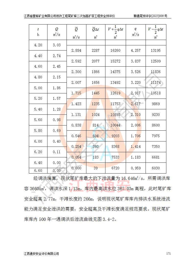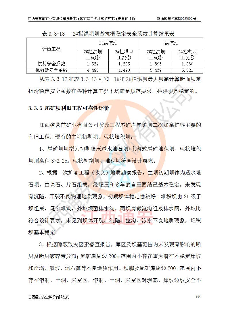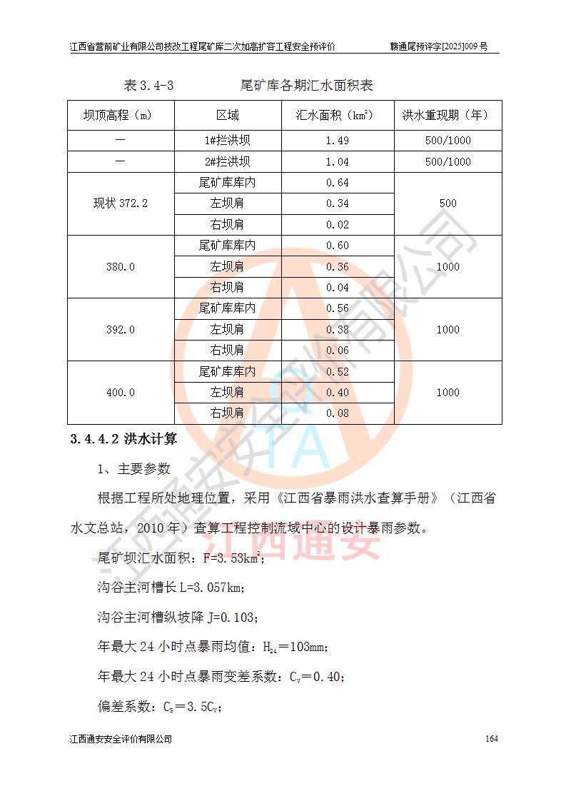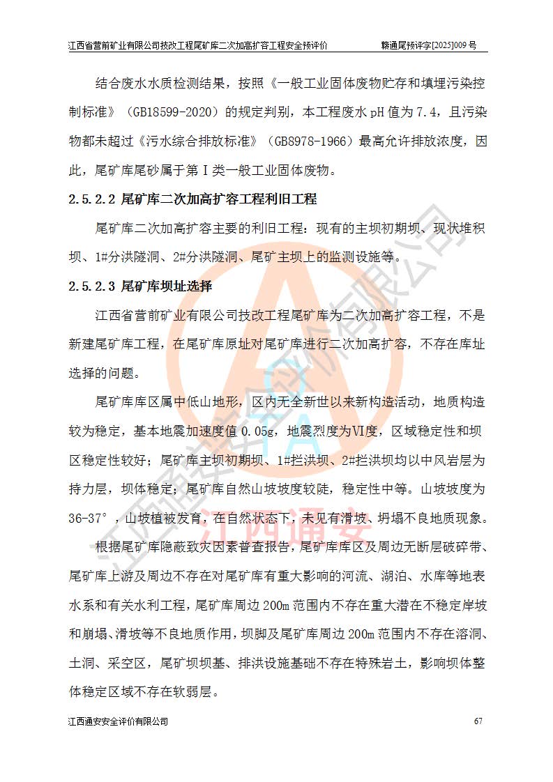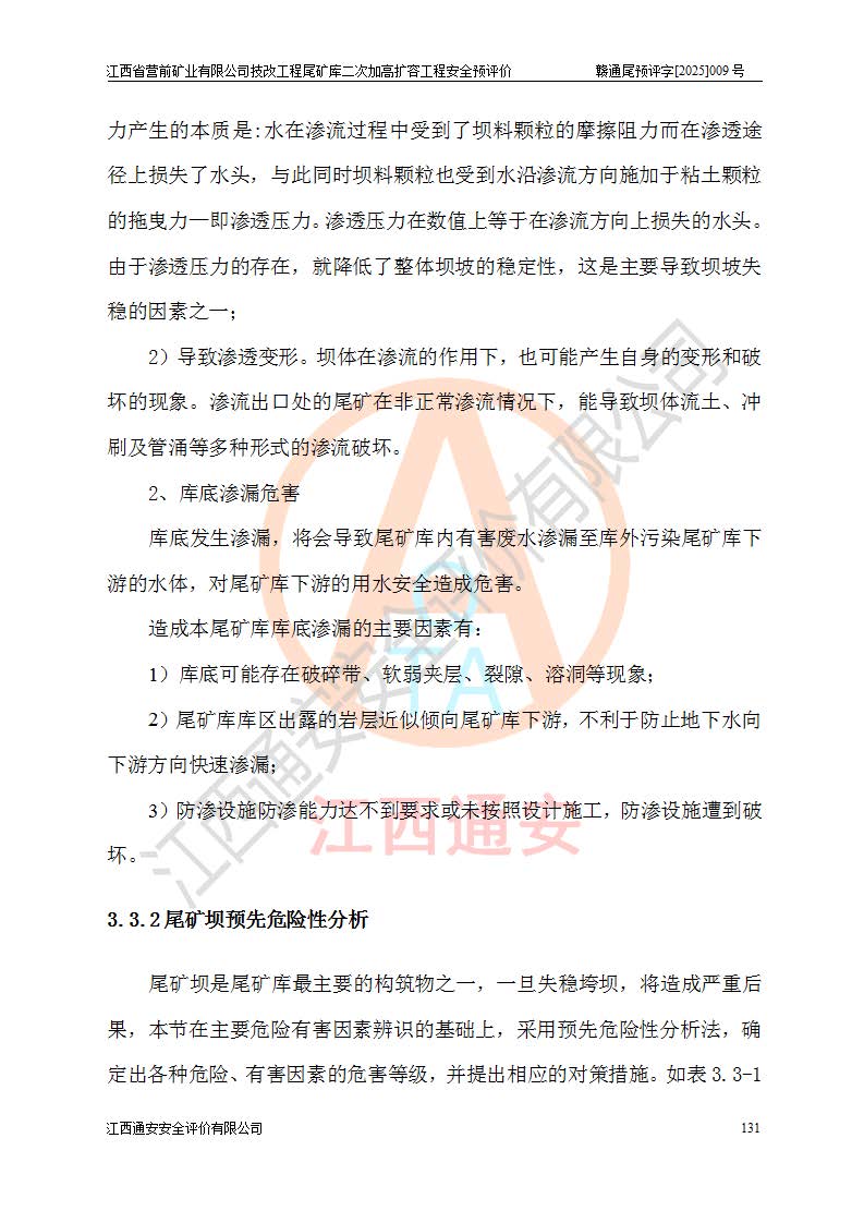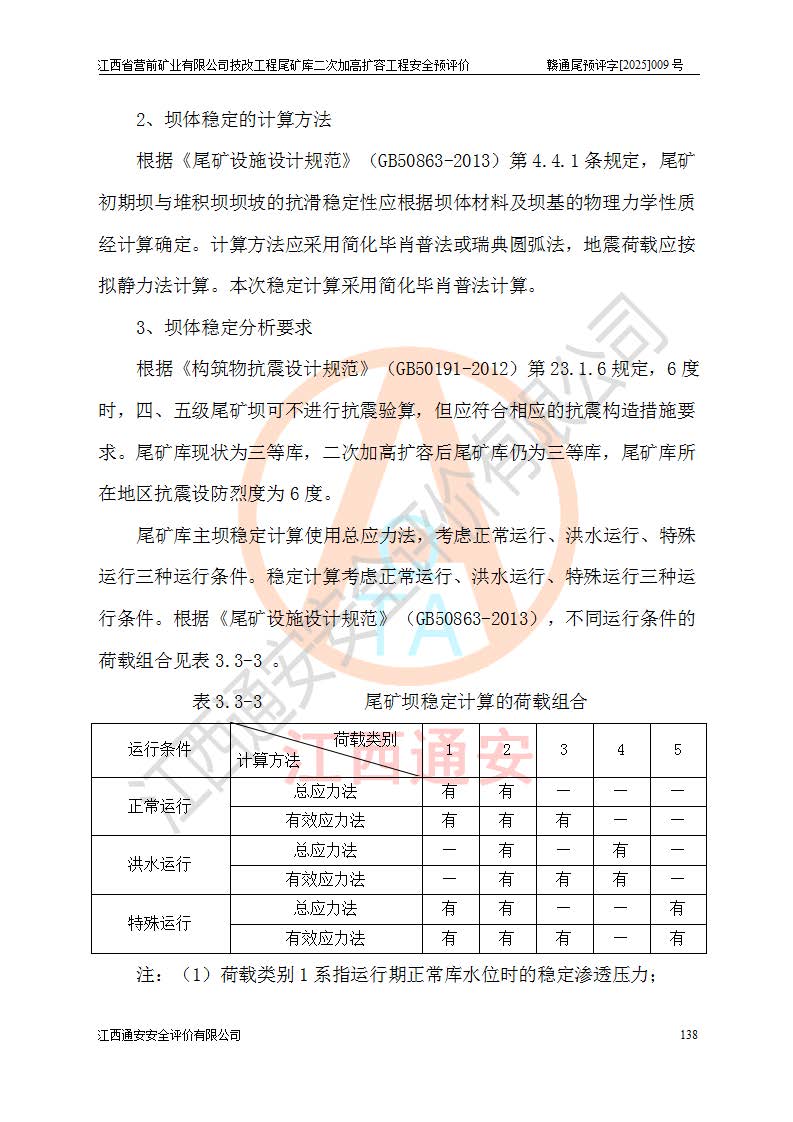 江西省營前礦業(yè)有限公司于2003年12月16日成立,位于贛州市上猶縣營前鎮(zhèn)焦里村境內(nèi),公司注冊資本10000萬元,法定**人陳雅博,礦區(qū)地理坐標:東經(jīng)114°18′30″~114°19′00″,北緯25°52′35″~25°53′47″。公司經(jīng)營范圍包括:鉛礦、鋅、鎢、銀地下開采、銷售。 江西省營前礦業(yè)有限公司技改工程尾礦庫位于焦里鎢銀鉛鋅礦區(qū),處于上猶縣水巖鄉(xiāng)井子村坑尾自然村境內(nèi),為山谷型尾礦庫。 江西省營前礦業(yè)有限公司技改工程尾礦庫于2013年由福建省冶金工業(yè)設(shè)計院設(shè)計,2014年8月開始施工建設(shè),2015年4月竣工開始試運行,2015年11月完成竣工驗收,2016年1月首次取得安全生產(chǎn)許可證,2019年1月完成延期換證,2020年8月委托金建工程設(shè)計有限公司進行尾礦庫加高擴容工作,2020年10月21日取得了江西省應(yīng)急管理廳下發(fā)的《關(guān)于江西省營前礦業(yè)有限公司技改工程尾礦庫加高擴容工程安全設(shè)施設(shè)計的審查意見》(贛應(yīng)急非煤項目設(shè)審〔2020〕46號),之后委托駐馬店市黃淮建設(shè)工程有限公司負責施工,云南潤滇工程技術(shù)有限公司負責監(jiān)理,2021年12月完成加高擴容竣工驗收工作,經(jīng)過延期,現(xiàn)尾礦庫安全生產(chǎn)許可證編號(贛)FM安許證字[2016]M1692號,**期為2025年01月18日至2028年01月17日。 江西省營前礦業(yè)有限公司技改工程尾礦庫為山谷型尾礦庫,初期壩為透水堆石壩,壩頂高程為330.0m,初期壩高25.0m,后期采用上游式尾礦堆積壩,加高擴容后*終壩頂高程為380.0m,堆積壩高50.0m,總壩高為75.0m,總庫容為為503.14×104m3,尾礦庫為三等庫。尾礦庫初期壩以上總匯水面積3.53km2,防洪標準取500年一遇。 目前尾礦庫由初期壩、堆積壩、庫內(nèi)排洪系統(tǒng)(雙格排水斜槽+連接井+排水涵洞+排洪隧洞+排水陡槽+消力池)、1#攔洪壩、1#分洪隧洞、2#攔洪壩、2#分洪隧洞和安全監(jiān)測設(shè)施組成。根據(jù)建設(shè)單位提供的尾礦庫平面布置圖,截至2024年12月,現(xiàn)狀尾礦庫堆積壩頂高程為372.2m,現(xiàn)狀總壩高67.2m,灘頂高程為369.8m,現(xiàn)狀全庫容387.51×104m3,現(xiàn)狀尾礦庫為三等庫,原加高擴容設(shè)計*終堆積壩頂高程為380.0m,現(xiàn)剩余庫容115.63×104m3,剩余**庫容約92.5×104m3,剩余服務(wù)年限約4.5年;礦山現(xiàn)有儲量較大,剩余庫容及服務(wù)年限不滿足礦山后期生產(chǎn)需要。 技改工程尾礦庫尾礦壩下游1**范圍無居民,不存在工礦企業(yè)等建構(gòu)筑物,不屬于“頭頂庫”;尾礦庫不壓礦;距贛江直線距離60**;不涉及保護區(qū)及生態(tài)紅線;尾礦庫所在溝谷較長,谷底平均縱坡9%,上游周邊山體地形有利于尾礦庫二次加高擴容工程的實施,因此為了增加尾礦庫庫容,延長服務(wù)年限,充分利用尾礦庫所在溝谷地形,江西省營前礦業(yè)有限公司對技改尾礦庫進行二次加高擴容。 2024年12月,江西省營前礦業(yè)有限公司委托地礦贛西地質(zhì)工程勘察院編制了《江西省營前礦業(yè)有限公司技改工程尾礦庫二次擴容工程(水文)地質(zhì)勘察報告》,2025年4月,江西省營前礦業(yè)有限公司委托金建工程設(shè)計有限公司編制了《江西省營前礦業(yè)有限公司技改工程尾礦庫二次加高擴容工程可行性研究報告》。 按照非煤礦山建設(shè)項目安全設(shè)施“三同時”的規(guī)定要求,技改工程尾礦庫為二次加高擴容工程,**進行安全預評價;江西省營前礦業(yè)有限公司委托我公司承擔技改工程尾礦庫二次加高擴容工程建設(shè)項目的安全預評價工作。 |