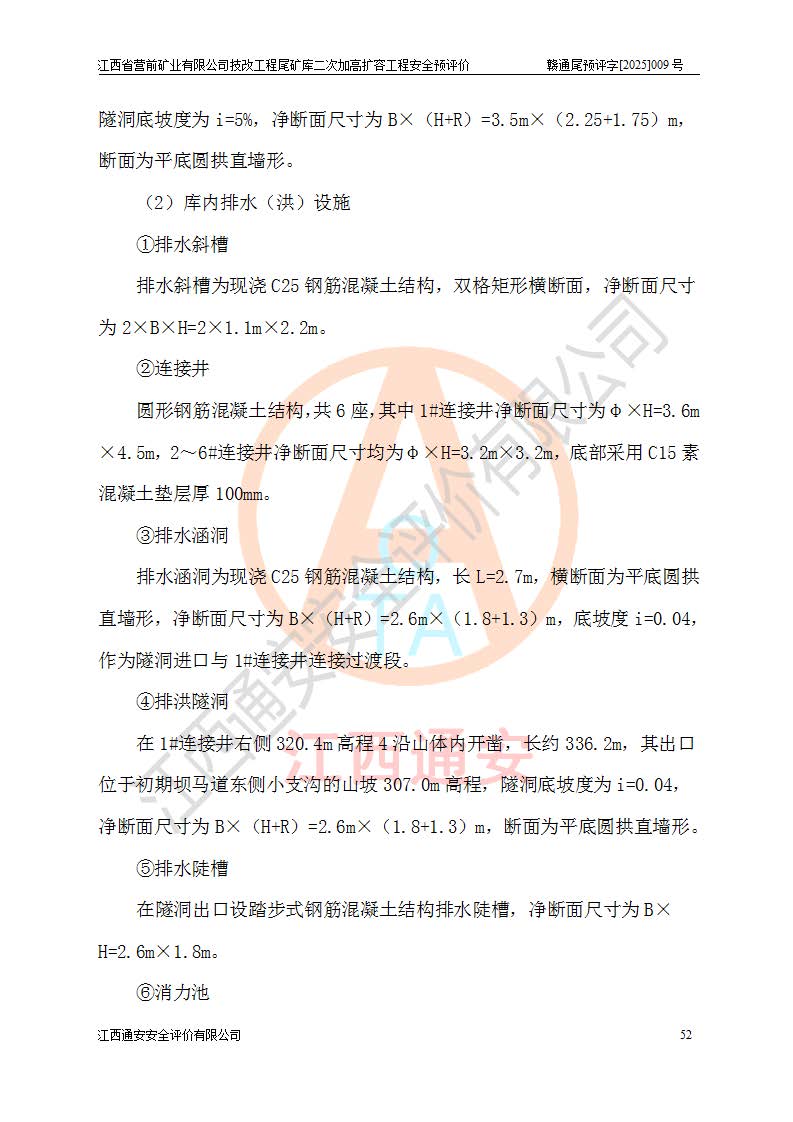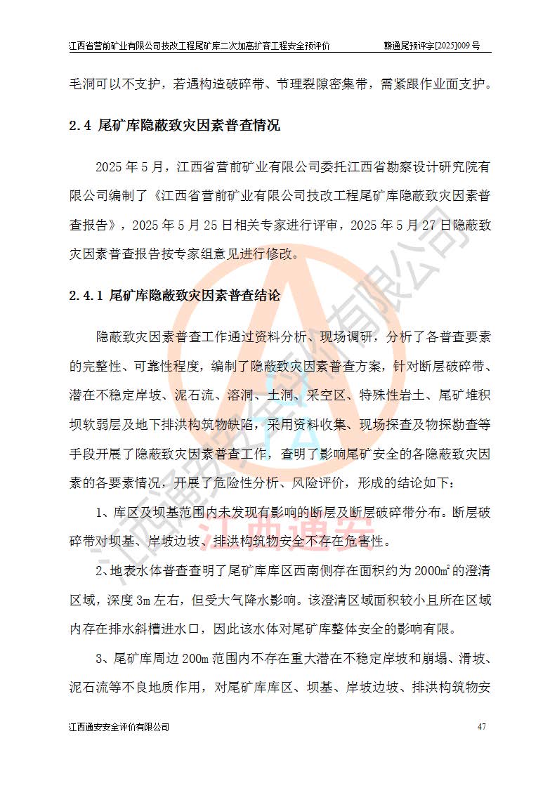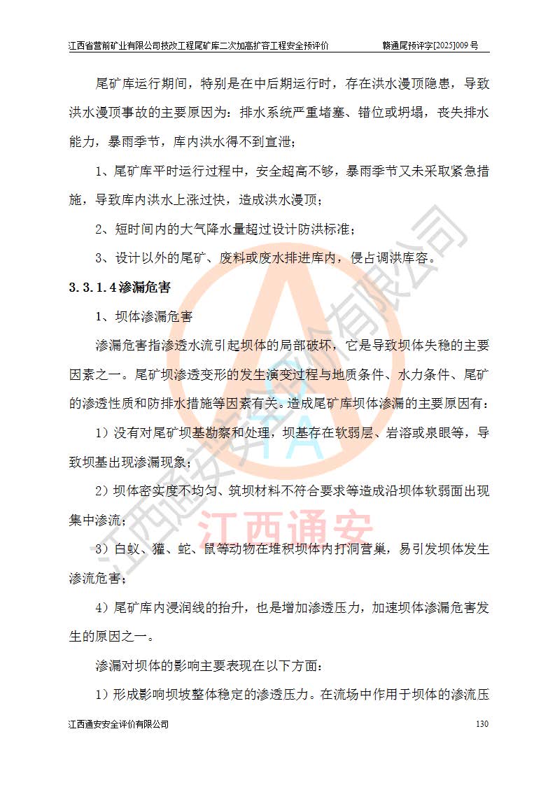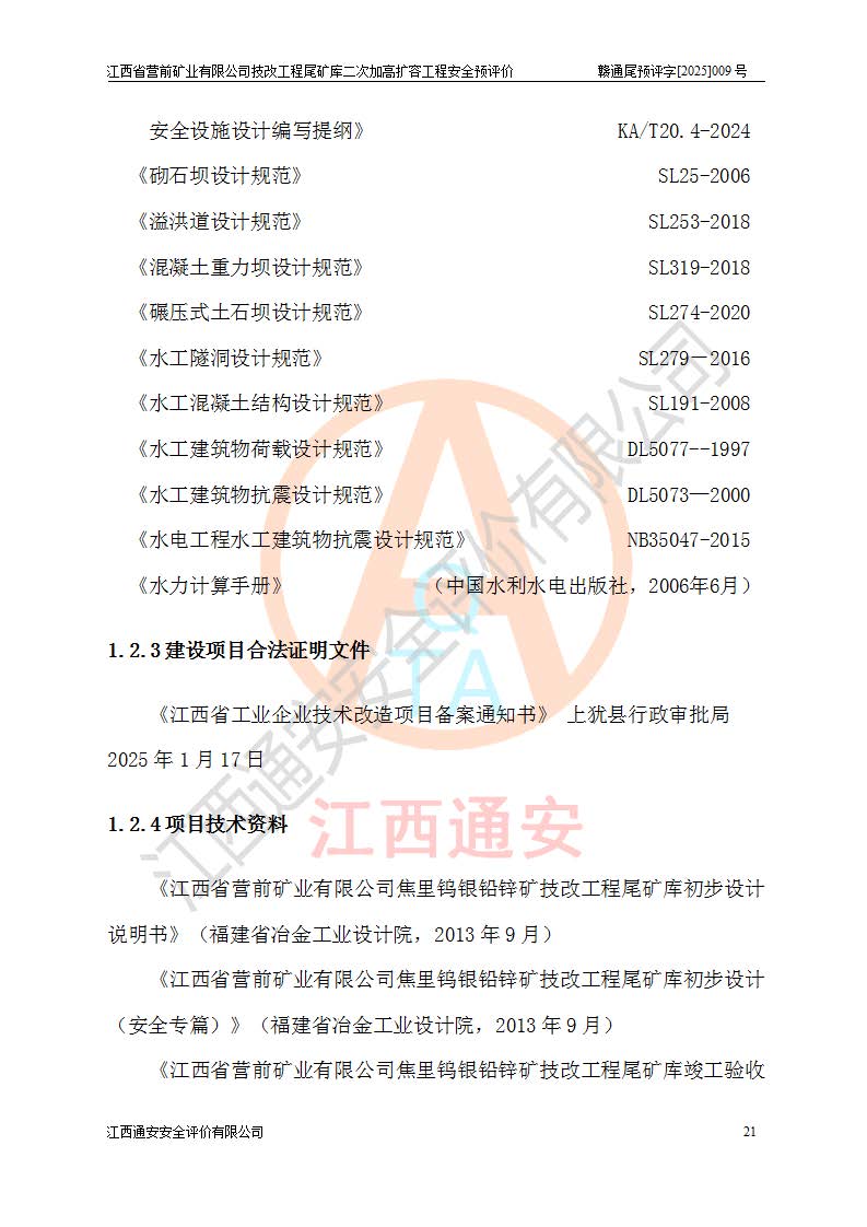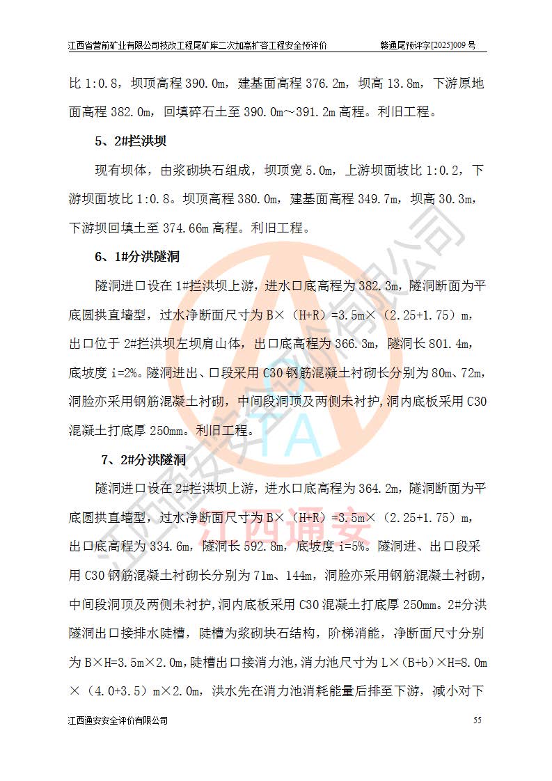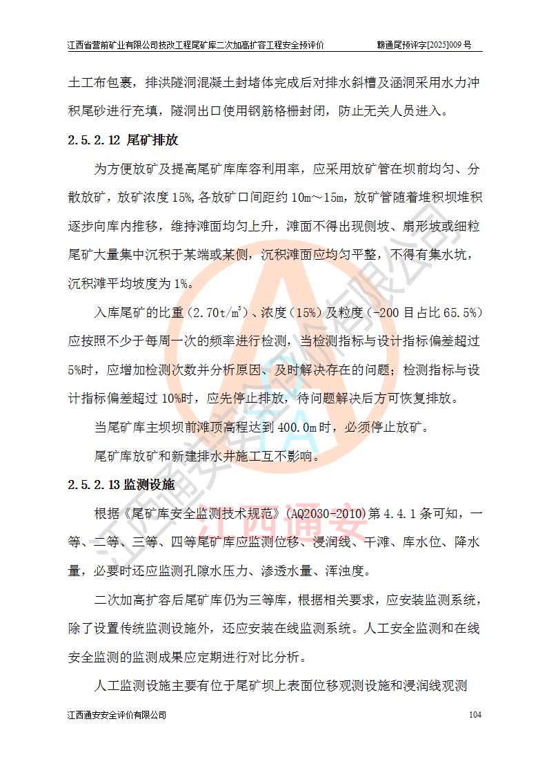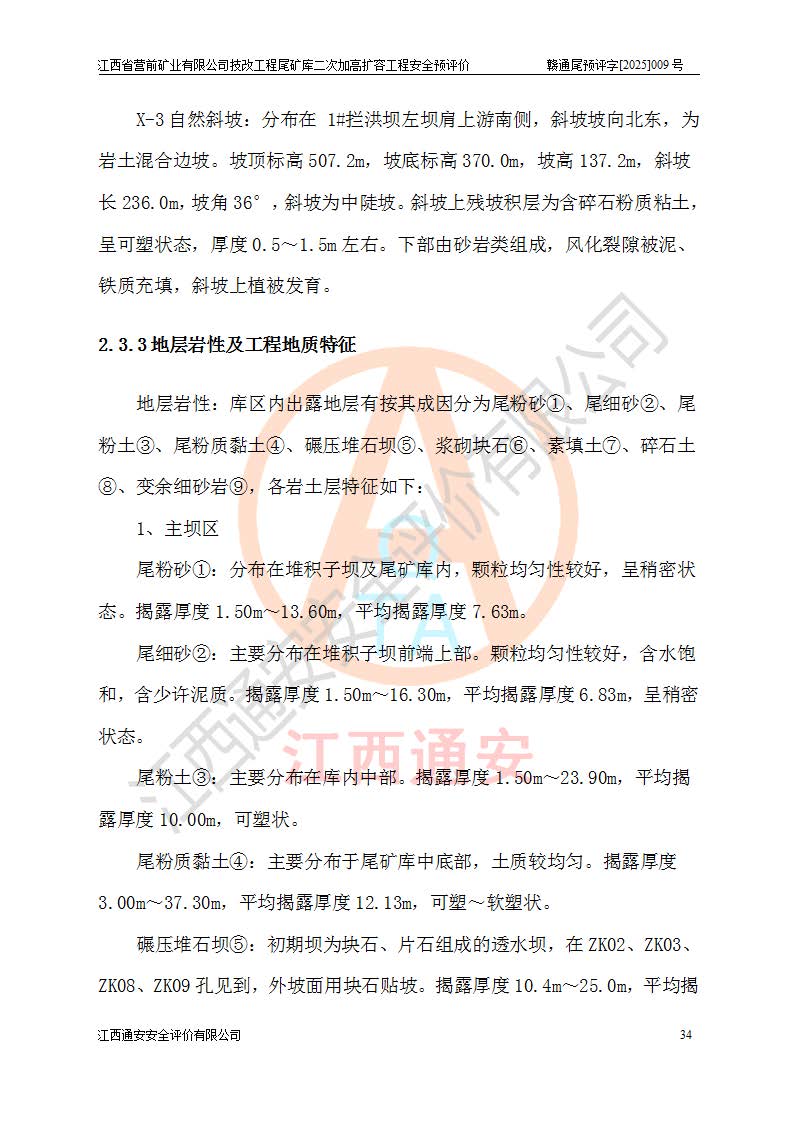 江西省營前礦業(yè)有限公司于2003年12月16日成立,位于贛州市上猶縣營前鎮(zhèn)焦里村境內(nèi),公司注冊資本10000萬元,法定**人陳雅博,礦區(qū)地理坐標:東經(jīng)114°18′30″~114°19′00″,北緯25°52′35″~25°53′47″。公司經(jīng)營范圍包括:鉛礦、鋅、鎢、銀地下開采、銷售。 江西省營前礦業(yè)有限公司技改工程尾礦庫位于焦里鎢銀鉛鋅礦區(qū),處于上猶縣水巖鄉(xiāng)井子村坑尾自然村境內(nèi),為山谷型尾礦庫。 江西省營前礦業(yè)有限公司技改工程尾礦庫于2013年由福建省冶金工業(yè)設(shè)計院設(shè)計,2014年8月開始施工建設(shè),2015年4月竣工開始試運行,2015年11月完成竣工驗收,2016年1月首次取得安全生產(chǎn)許可證,2019年1月完成延期換證,2020年8月委托金建工程設(shè)計有限公司進行尾礦庫加高擴容工作,2020年10月21日取得了江西省應(yīng)急管理廳下發(fā)的《關(guān)于江西省營前礦業(yè)有限公司技改工程尾礦庫加高擴容工程安全設(shè)施設(shè)計的審查意見》(贛應(yīng)急非煤項目設(shè)審〔2020〕46號),之后委托駐馬店市黃淮建設(shè)工程有限公司負責施工,云南潤滇工程技術(shù)有限公司負責監(jiān)理,2021年12月完成加高擴容竣工驗收工作,經(jīng)過延期,現(xiàn)尾礦庫安全生產(chǎn)許可證編號(贛)FM安許證字[2016]M1692號,**期為2025年01月18日至2028年01月17日。 江西省營前礦業(yè)有限公司技改工程尾礦庫為山谷型尾礦庫,初期壩為透水堆石壩,壩頂高程為330.0m,初期壩高25.0m,后期采用上游式尾礦堆積壩,加高擴容后*終壩頂高程為380.0m,堆積壩高50.0m,總壩高為75.0m,總庫容為為503.14×104m3,尾礦庫為三等庫。尾礦庫初期壩以上總匯水面積3.53km2,防洪標準取500年一遇。 目前尾礦庫由初期壩、堆積壩、庫內(nèi)排洪系統(tǒng)(雙格排水斜槽+連接井+排水涵洞+排洪隧洞+排水陡槽+消力池)、1#攔洪壩、1#分洪隧洞、2#攔洪壩、2#分洪隧洞和安全監(jiān)測設(shè)施組成。根據(jù)建設(shè)單位提供的尾礦庫平面布置圖,截至2024年12月,現(xiàn)狀尾礦庫堆積壩頂高程為372.2m,現(xiàn)狀總壩高67.2m,灘頂高程為369.8m,現(xiàn)狀全庫容387.51×104m3,現(xiàn)狀尾礦庫為三等庫,原加高擴容設(shè)計*終堆積壩頂高程為380.0m,現(xiàn)剩余庫容115.63×104m3,剩余**庫容約92.5×104m3,剩余服務(wù)年限約4.5年;礦山現(xiàn)有儲量較大,剩余庫容及服務(wù)年限不滿足礦山后期生產(chǎn)需要。 技改工程尾礦庫尾礦壩下游1**范圍無居民,不存在工礦企業(yè)等建構(gòu)筑物,不屬于“頭頂庫”;尾礦庫不壓礦;距贛江直線距離60**;不涉及保護區(qū)及生態(tài)紅線;尾礦庫所在溝谷較長,谷底平均縱坡9%,上游周邊山體地形有利于尾礦庫二次加高擴容工程的實施,因此為了增加尾礦庫庫容,延長服務(wù)年限,充分利用尾礦庫所在溝谷地形,江西省營前礦業(yè)有限公司對技改尾礦庫進行二次加高擴容。 2024年12月,江西省營前礦業(yè)有限公司委托地礦贛西地質(zhì)工程勘察院編制了《江西省營前礦業(yè)有限公司技改工程尾礦庫二次擴容工程(水文)地質(zhì)勘察報告》,2025年4月,江西省營前礦業(yè)有限公司委托金建工程設(shè)計有限公司編制了《江西省營前礦業(yè)有限公司技改工程尾礦庫二次加高擴容工程可行性研究報告》。 按照非煤礦山建設(shè)項目安全設(shè)施“三同時”的規(guī)定要求,技改工程尾礦庫為二次加高擴容工程,**進行安全預評價;江西省營前礦業(yè)有限公司委托我公司承擔技改工程尾礦庫二次加高擴容工程建設(shè)項目的安全預評價工作。 |