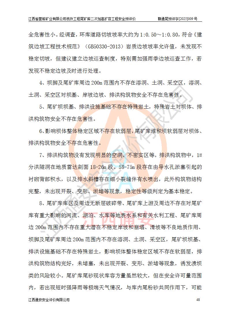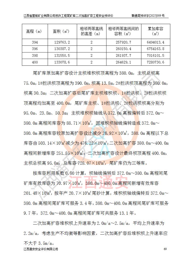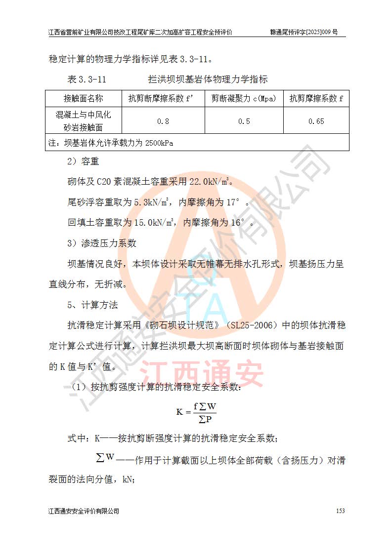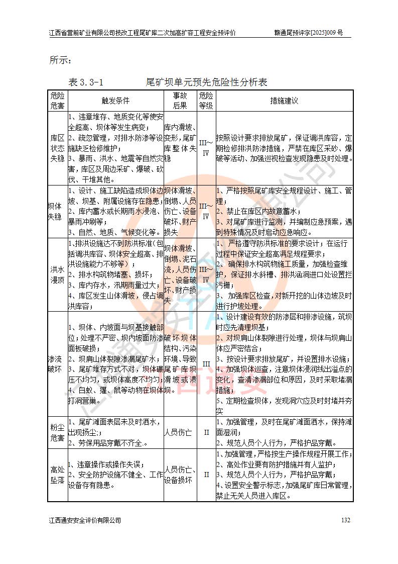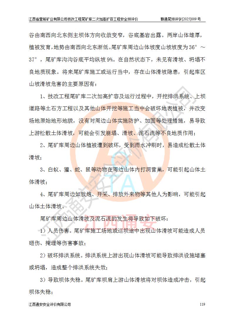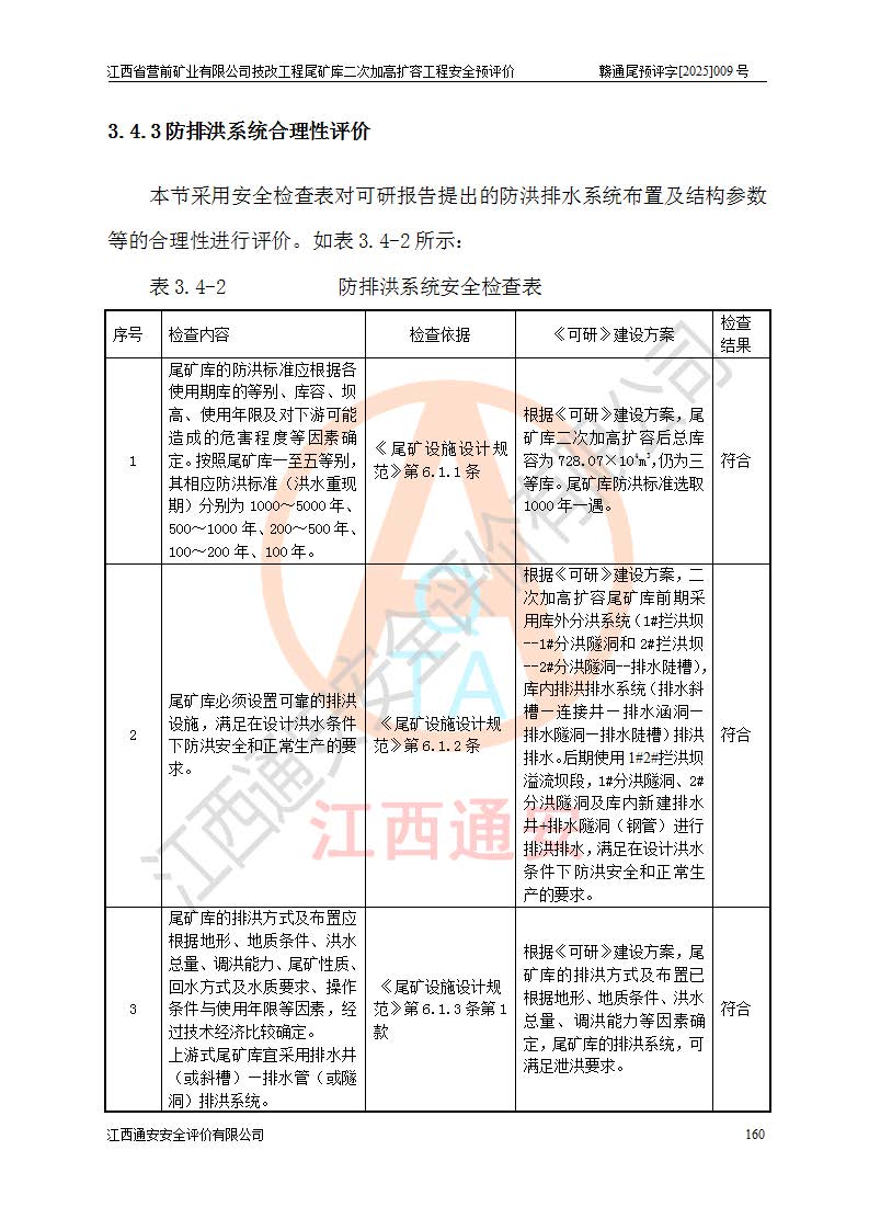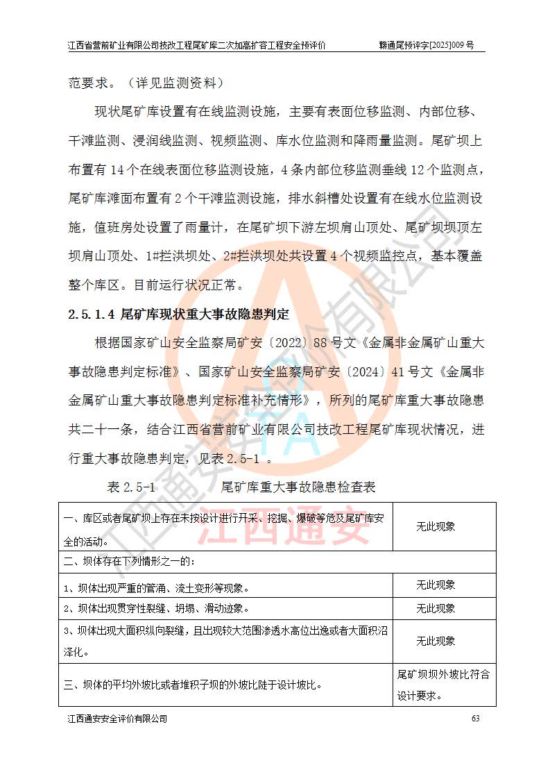 江西省營前礦業(yè)有限公司于2003年12月16日成立,位于贛州市上猶縣營前鎮(zhèn)焦里村境內(nèi),公司注冊資本10000萬元,法定**人陳雅博,礦區(qū)地理坐標:東經(jīng)114°18′30″~114°19′00″,北緯25°52′35″~25°53′47″。公司經(jīng)營范圍包括:鉛礦、鋅、鎢、銀地下開采、銷售。 江西省營前礦業(yè)有限公司技改工程尾礦庫位于焦里鎢銀鉛鋅礦區(qū),處于上猶縣水巖鄉(xiāng)井子村坑尾自然村境內(nèi),為山谷型尾礦庫。 江西省營前礦業(yè)有限公司技改工程尾礦庫于2013年由福建省冶金工業(yè)設(shè)計院設(shè)計,2014年8月開始施工建設(shè),2015年4月竣工開始試運行,2015年11月完成竣工驗收,2016年1月首次取得安全生產(chǎn)許可證,2019年1月完成延期換證,2020年8月委托金建工程設(shè)計有限公司進行尾礦庫加高擴容工作,2020年10月21日取得了江西省應(yīng)急管理廳下發(fā)的《關(guān)于江西省營前礦業(yè)有限公司技改工程尾礦庫加高擴容工程安全設(shè)施設(shè)計的審查意見》(贛應(yīng)急非煤項目設(shè)審〔2020〕46號),之后委托駐馬店市黃淮建設(shè)工程有限公司負責施工,云南潤滇工程技術(shù)有限公司負責監(jiān)理,2021年12月完成加高擴容竣工驗收工作,經(jīng)過延期,現(xiàn)尾礦庫安全生產(chǎn)許可證編號(贛)FM安許證字[2016]M1692號,**期為2025年01月18日至2028年01月17日。 江西省營前礦業(yè)有限公司技改工程尾礦庫為山谷型尾礦庫,初期壩為透水堆石壩,壩頂高程為330.0m,初期壩高25.0m,后期采用上游式尾礦堆積壩,加高擴容后*終壩頂高程為380.0m,堆積壩高50.0m,總壩高為75.0m,總庫容為為503.14×104m3,尾礦庫為三等庫。尾礦庫初期壩以上總匯水面積3.53km2,防洪標準取500年一遇。 目前尾礦庫由初期壩、堆積壩、庫內(nèi)排洪系統(tǒng)(雙格排水斜槽+連接井+排水涵洞+排洪隧洞+排水陡槽+消力池)、1#攔洪壩、1#分洪隧洞、2#攔洪壩、2#分洪隧洞和安全監(jiān)測設(shè)施組成。根據(jù)建設(shè)單位提供的尾礦庫平面布置圖,截至2024年12月,現(xiàn)狀尾礦庫堆積壩頂高程為372.2m,現(xiàn)狀總壩高67.2m,灘頂高程為369.8m,現(xiàn)狀全庫容387.51×104m3,現(xiàn)狀尾礦庫為三等庫,原加高擴容設(shè)計*終堆積壩頂高程為380.0m,現(xiàn)剩余庫容115.63×104m3,剩余**庫容約92.5×104m3,剩余服務(wù)年限約4.5年;礦山現(xiàn)有儲量較大,剩余庫容及服務(wù)年限不滿足礦山后期生產(chǎn)需要。 技改工程尾礦庫尾礦壩下游1**范圍無居民,不存在工礦企業(yè)等建構(gòu)筑物,不屬于“頭頂庫”;尾礦庫不壓礦;距贛江直線距離60**;不涉及保護區(qū)及生態(tài)紅線;尾礦庫所在溝谷較長,谷底平均縱坡9%,上游周邊山體地形有利于尾礦庫二次加高擴容工程的實施,因此為了增加尾礦庫庫容,延長服務(wù)年限,充分利用尾礦庫所在溝谷地形,江西省營前礦業(yè)有限公司對技改尾礦庫進行二次加高擴容。 2024年12月,江西省營前礦業(yè)有限公司委托地礦贛西地質(zhì)工程勘察院編制了《江西省營前礦業(yè)有限公司技改工程尾礦庫二次擴容工程(水文)地質(zhì)勘察報告》,2025年4月,江西省營前礦業(yè)有限公司委托金建工程設(shè)計有限公司編制了《江西省營前礦業(yè)有限公司技改工程尾礦庫二次加高擴容工程可行性研究報告》。 按照非煤礦山建設(shè)項目安全設(shè)施“三同時”的規(guī)定要求,技改工程尾礦庫為二次加高擴容工程,**進行安全預評價;江西省營前礦業(yè)有限公司委托我公司承擔技改工程尾礦庫二次加高擴容工程建設(shè)項目的安全預評價工作。 |