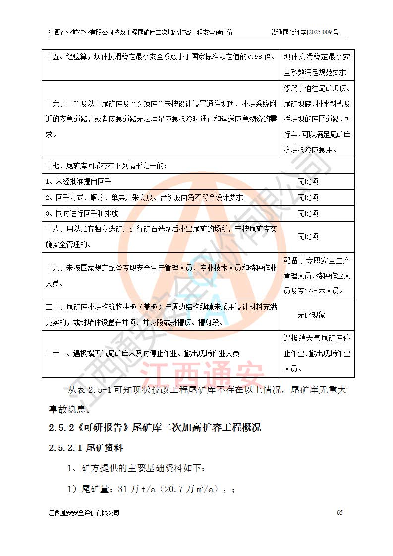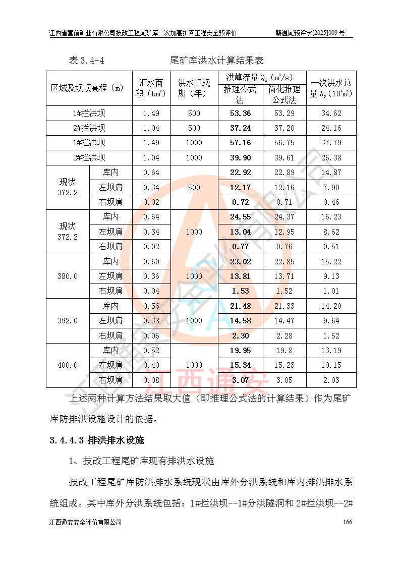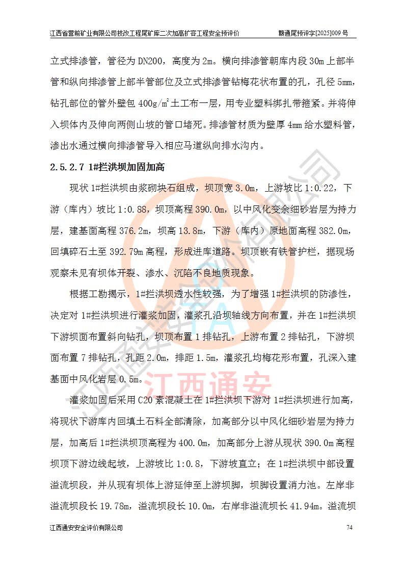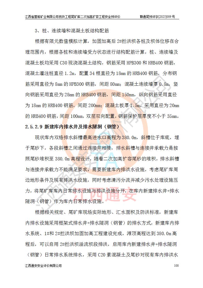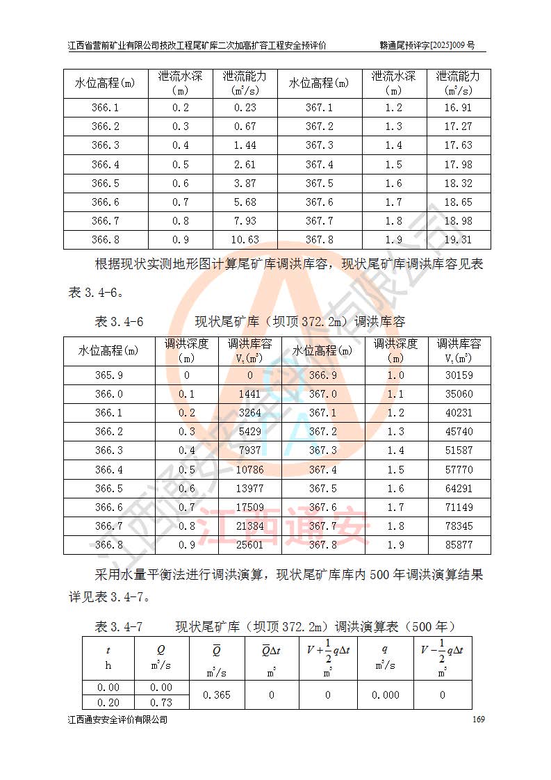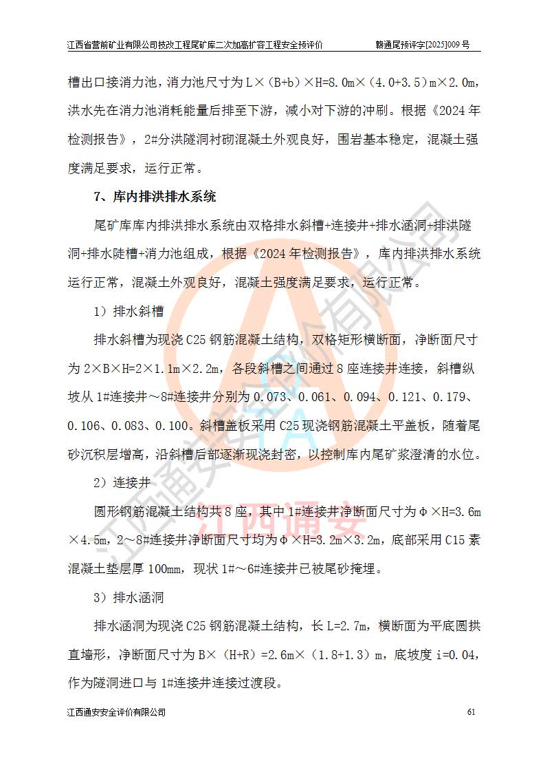 江西省營前礦業(yè)有限公司于2003年12月16日成立,位于贛州市上猶縣營前鎮(zhèn)焦里村境內(nèi),公司注冊資本10000萬元,法定**人陳雅博,礦區(qū)地理坐標:東經(jīng)114°18′30″~114°19′00″,北緯25°52′35″~25°53′47″。公司經(jīng)營范圍包括:鉛礦、鋅、鎢、銀地下開采、銷售。 江西省營前礦業(yè)有限公司技改工程尾礦庫位于焦里鎢銀鉛鋅礦區(qū),處于上猶縣水巖鄉(xiāng)井子村坑尾自然村境內(nèi),為山谷型尾礦庫。 江西省營前礦業(yè)有限公司技改工程尾礦庫于2013年由福建省冶金工業(yè)設(shè)計院設(shè)計,2014年8月開始施工建設(shè),2015年4月竣工開始試運行,2015年11月完成竣工驗收,2016年1月首次取得安全生產(chǎn)許可證,2019年1月完成延期換證,2020年8月委托金建工程設(shè)計有限公司進行尾礦庫加高擴容工作,2020年10月21日取得了江西省應(yīng)急管理廳下發(fā)的《關(guān)于江西省營前礦業(yè)有限公司技改工程尾礦庫加高擴容工程安全設(shè)施設(shè)計的審查意見》(贛應(yīng)急非煤項目設(shè)審〔2020〕46號),之后委托駐馬店市黃淮建設(shè)工程有限公司負責施工,云南潤滇工程技術(shù)有限公司負責監(jiān)理,2021年12月完成加高擴容竣工驗收工作,經(jīng)過延期,現(xiàn)尾礦庫安全生產(chǎn)許可證編號(贛)FM安許證字[2016]M1692號,**期為2025年01月18日至2028年01月17日。 江西省營前礦業(yè)有限公司技改工程尾礦庫為山谷型尾礦庫,初期壩為透水堆石壩,壩頂高程為330.0m,初期壩高25.0m,后期采用上游式尾礦堆積壩,加高擴容后*終壩頂高程為380.0m,堆積壩高50.0m,總壩高為75.0m,總庫容為為503.14×104m3,尾礦庫為三等庫。尾礦庫初期壩以上總匯水面積3.53km2,防洪標準取500年一遇。 目前尾礦庫由初期壩、堆積壩、庫內(nèi)排洪系統(tǒng)(雙格排水斜槽+連接井+排水涵洞+排洪隧洞+排水陡槽+消力池)、1#攔洪壩、1#分洪隧洞、2#攔洪壩、2#分洪隧洞和安全監(jiān)測設(shè)施組成。根據(jù)建設(shè)單位提供的尾礦庫平面布置圖,截至2024年12月,現(xiàn)狀尾礦庫堆積壩頂高程為372.2m,現(xiàn)狀總壩高67.2m,灘頂高程為369.8m,現(xiàn)狀全庫容387.51×104m3,現(xiàn)狀尾礦庫為三等庫,原加高擴容設(shè)計*終堆積壩頂高程為380.0m,現(xiàn)剩余庫容115.63×104m3,剩余**庫容約92.5×104m3,剩余服務(wù)年限約4.5年;礦山現(xiàn)有儲量較大,剩余庫容及服務(wù)年限不滿足礦山后期生產(chǎn)需要。 技改工程尾礦庫尾礦壩下游1**范圍無居民,不存在工礦企業(yè)等建構(gòu)筑物,不屬于“頭頂庫”;尾礦庫不壓礦;距贛江直線距離60**;不涉及保護區(qū)及生態(tài)紅線;尾礦庫所在溝谷較長,谷底平均縱坡9%,上游周邊山體地形有利于尾礦庫二次加高擴容工程的實施,因此為了增加尾礦庫庫容,延長服務(wù)年限,充分利用尾礦庫所在溝谷地形,江西省營前礦業(yè)有限公司對技改尾礦庫進行二次加高擴容。 2024年12月,江西省營前礦業(yè)有限公司委托地礦贛西地質(zhì)工程勘察院編制了《江西省營前礦業(yè)有限公司技改工程尾礦庫二次擴容工程(水文)地質(zhì)勘察報告》,2025年4月,江西省營前礦業(yè)有限公司委托金建工程設(shè)計有限公司編制了《江西省營前礦業(yè)有限公司技改工程尾礦庫二次加高擴容工程可行性研究報告》。 按照非煤礦山建設(shè)項目安全設(shè)施“三同時”的規(guī)定要求,技改工程尾礦庫為二次加高擴容工程,**進行安全預評價;江西省營前礦業(yè)有限公司委托我公司承擔技改工程尾礦庫二次加高擴容工程建設(shè)項目的安全預評價工作。 |