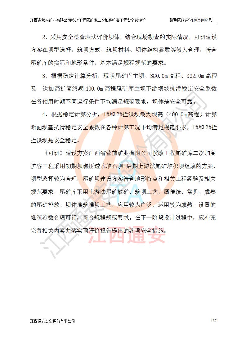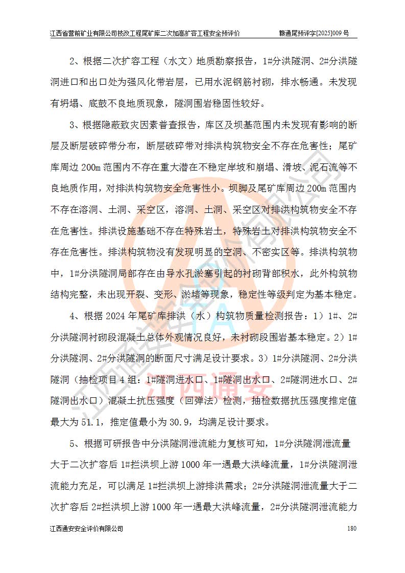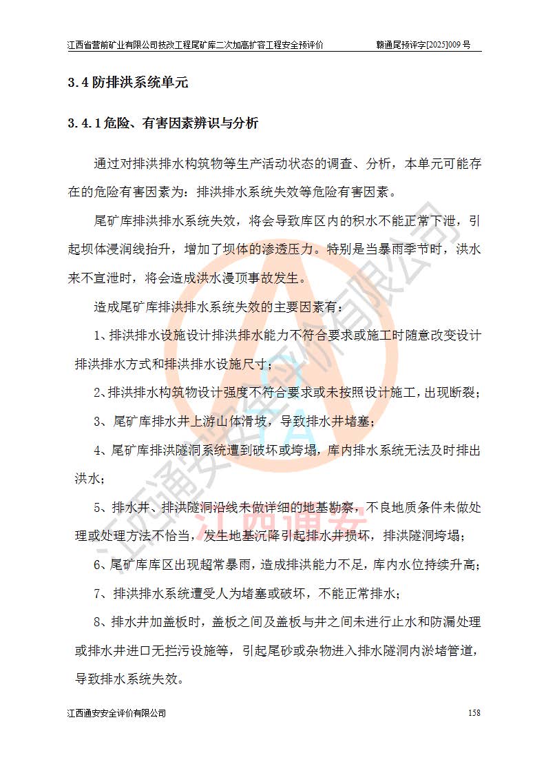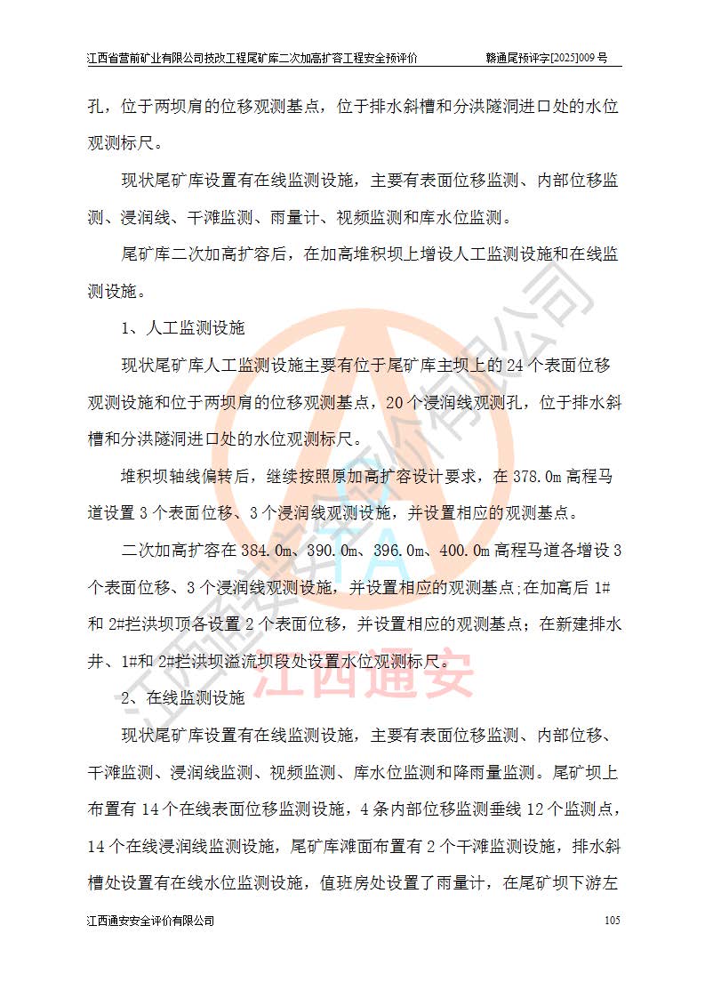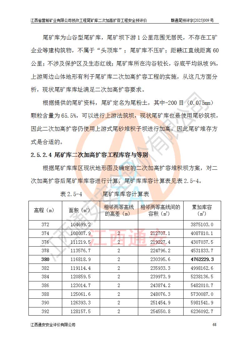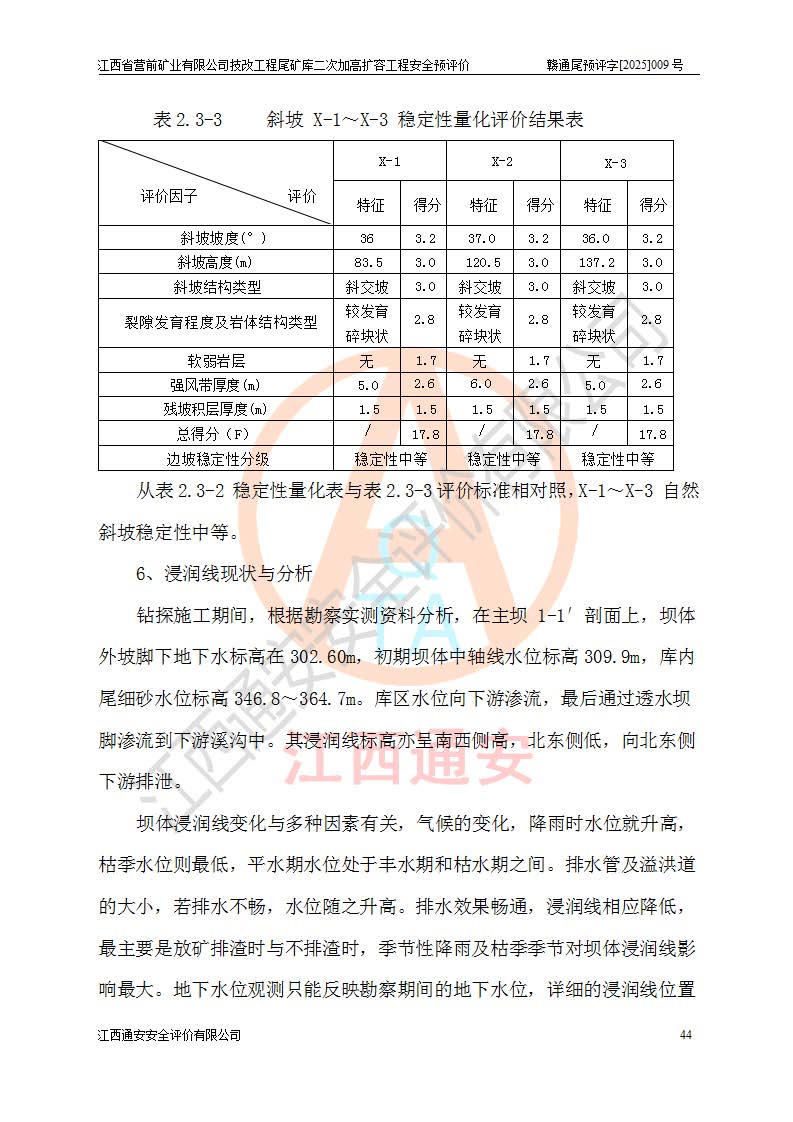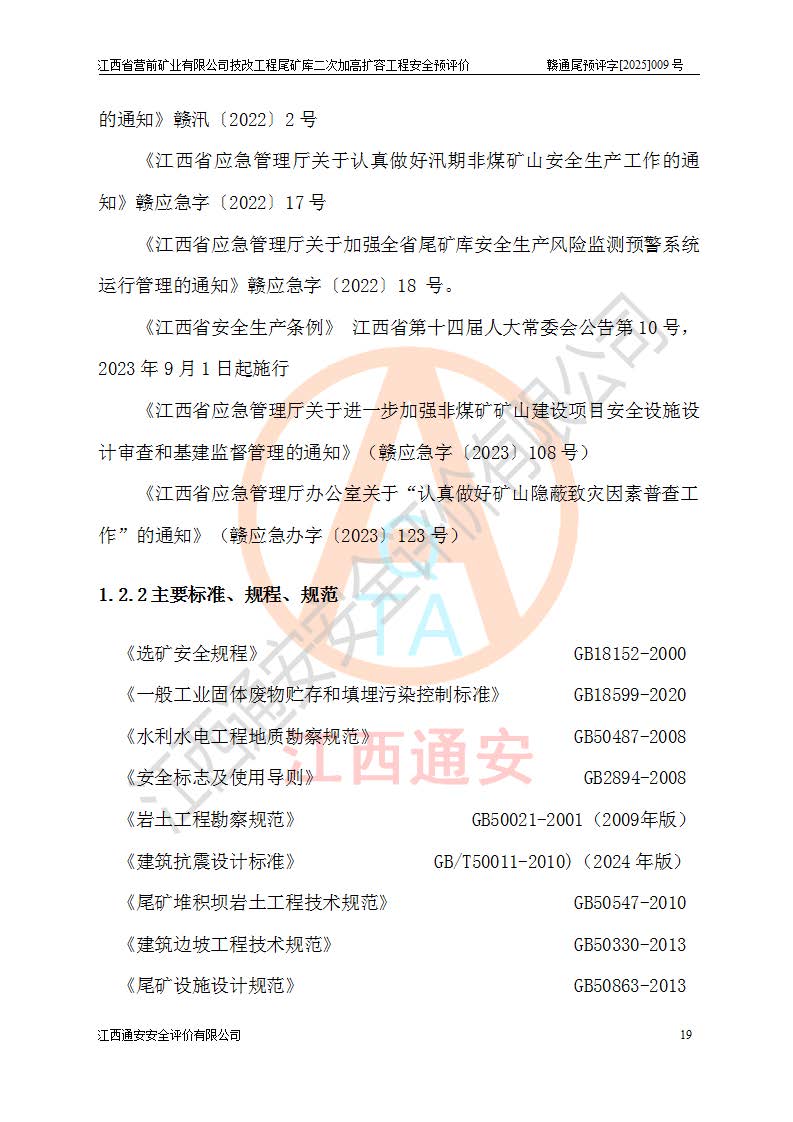 江西省營前礦業(yè)有限公司于2003年12月16日成立,位于贛州市上猶縣營前鎮(zhèn)焦里村境內(nèi),公司注冊資本10000萬元,法定**人陳雅博,礦區(qū)地理坐標:東經(jīng)114°18′30″~114°19′00″,北緯25°52′35″~25°53′47″。公司經(jīng)營范圍包括:鉛礦、鋅、鎢、銀地下開采、銷售。 江西省營前礦業(yè)有限公司技改工程尾礦庫位于焦里鎢銀鉛鋅礦區(qū),處于上猶縣水巖鄉(xiāng)井子村坑尾自然村境內(nèi),為山谷型尾礦庫。 江西省營前礦業(yè)有限公司技改工程尾礦庫于2013年由福建省冶金工業(yè)設(shè)計院設(shè)計,2014年8月開始施工建設(shè),2015年4月竣工開始試運行,2015年11月完成竣工驗收,2016年1月首次取得安全生產(chǎn)許可證,2019年1月完成延期換證,2020年8月委托金建工程設(shè)計有限公司進行尾礦庫加高擴容工作,2020年10月21日取得了江西省應(yīng)急管理廳下發(fā)的《關(guān)于江西省營前礦業(yè)有限公司技改工程尾礦庫加高擴容工程安全設(shè)施設(shè)計的審查意見》(贛應(yīng)急非煤項目設(shè)審〔2020〕46號),之后委托駐馬店市黃淮建設(shè)工程有限公司負責施工,云南潤滇工程技術(shù)有限公司負責監(jiān)理,2021年12月完成加高擴容竣工驗收工作,經(jīng)過延期,現(xiàn)尾礦庫安全生產(chǎn)許可證編號(贛)FM安許證字[2016]M1692號,**期為2025年01月18日至2028年01月17日。 江西省營前礦業(yè)有限公司技改工程尾礦庫為山谷型尾礦庫,初期壩為透水堆石壩,壩頂高程為330.0m,初期壩高25.0m,后期采用上游式尾礦堆積壩,加高擴容后*終壩頂高程為380.0m,堆積壩高50.0m,總壩高為75.0m,總庫容為為503.14×104m3,尾礦庫為三等庫。尾礦庫初期壩以上總匯水面積3.53km2,防洪標準取500年一遇。 目前尾礦庫由初期壩、堆積壩、庫內(nèi)排洪系統(tǒng)(雙格排水斜槽+連接井+排水涵洞+排洪隧洞+排水陡槽+消力池)、1#攔洪壩、1#分洪隧洞、2#攔洪壩、2#分洪隧洞和安全監(jiān)測設(shè)施組成。根據(jù)建設(shè)單位提供的尾礦庫平面布置圖,截至2024年12月,現(xiàn)狀尾礦庫堆積壩頂高程為372.2m,現(xiàn)狀總壩高67.2m,灘頂高程為369.8m,現(xiàn)狀全庫容387.51×104m3,現(xiàn)狀尾礦庫為三等庫,原加高擴容設(shè)計*終堆積壩頂高程為380.0m,現(xiàn)剩余庫容115.63×104m3,剩余**庫容約92.5×104m3,剩余服務(wù)年限約4.5年;礦山現(xiàn)有儲量較大,剩余庫容及服務(wù)年限不滿足礦山后期生產(chǎn)需要。 技改工程尾礦庫尾礦壩下游1**范圍無居民,不存在工礦企業(yè)等建構(gòu)筑物,不屬于“頭頂庫”;尾礦庫不壓礦;距贛江直線距離60**;不涉及保護區(qū)及生態(tài)紅線;尾礦庫所在溝谷較長,谷底平均縱坡9%,上游周邊山體地形有利于尾礦庫二次加高擴容工程的實施,因此為了增加尾礦庫庫容,延長服務(wù)年限,充分利用尾礦庫所在溝谷地形,江西省營前礦業(yè)有限公司對技改尾礦庫進行二次加高擴容。 2024年12月,江西省營前礦業(yè)有限公司委托地礦贛西地質(zhì)工程勘察院編制了《江西省營前礦業(yè)有限公司技改工程尾礦庫二次擴容工程(水文)地質(zhì)勘察報告》,2025年4月,江西省營前礦業(yè)有限公司委托金建工程設(shè)計有限公司編制了《江西省營前礦業(yè)有限公司技改工程尾礦庫二次加高擴容工程可行性研究報告》。 按照非煤礦山建設(shè)項目安全設(shè)施“三同時”的規(guī)定要求,技改工程尾礦庫為二次加高擴容工程,**進行安全預評價;江西省營前礦業(yè)有限公司委托我公司承擔技改工程尾礦庫二次加高擴容工程建設(shè)項目的安全預評價工作。 |