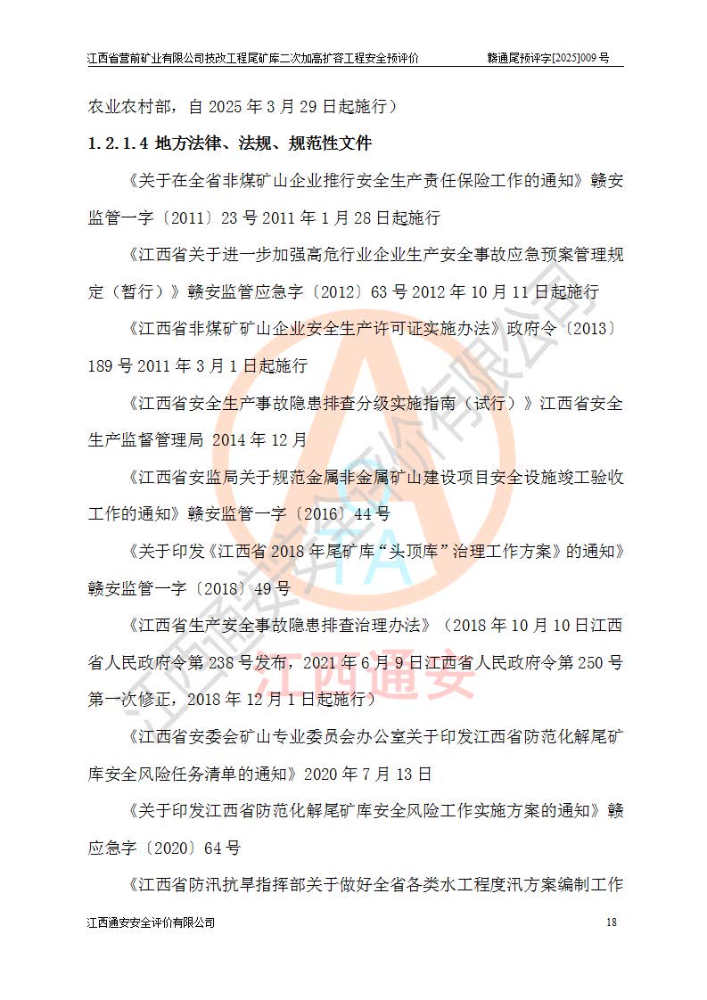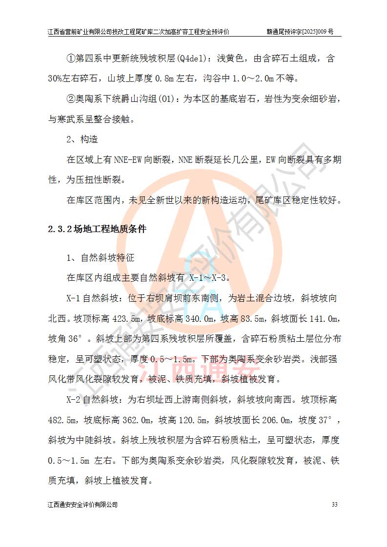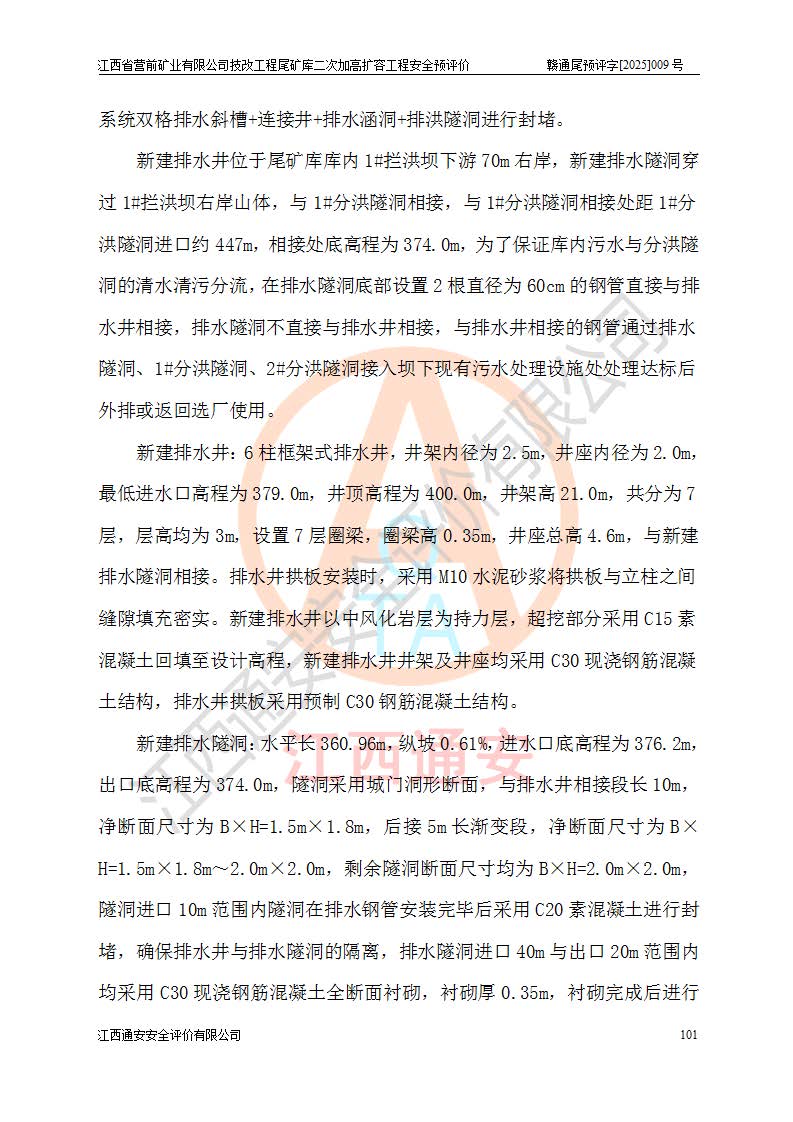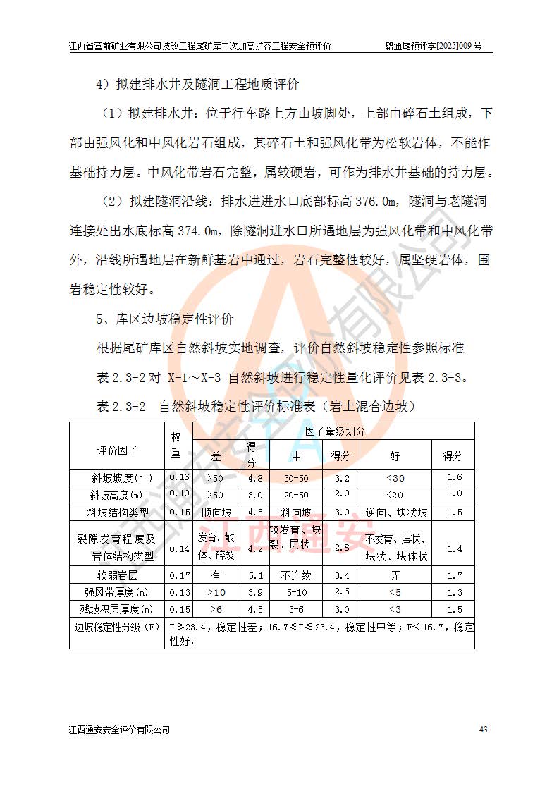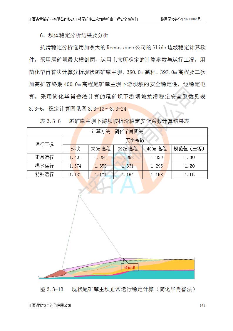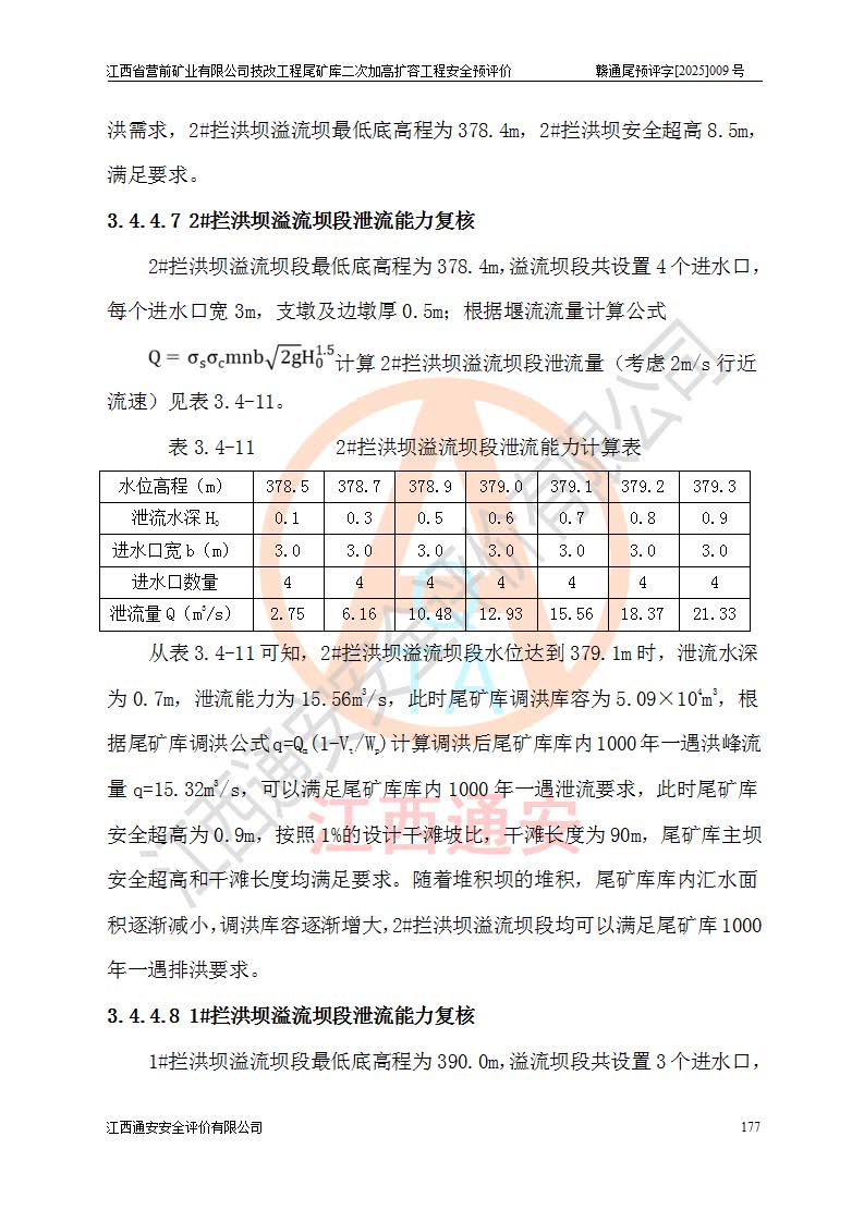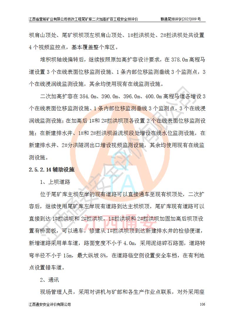 江西省營前礦業(yè)有限公司于2003年12月16日成立,位于贛州市上猶縣營前鎮(zhèn)焦里村境內(nèi),公司注冊資本10000萬元,法定**人陳雅博,礦區(qū)地理坐標:東經(jīng)114°18′30″~114°19′00″,北緯25°52′35″~25°53′47″。公司經(jīng)營范圍包括:鉛礦、鋅、鎢、銀地下開采、銷售。 江西省營前礦業(yè)有限公司技改工程尾礦庫位于焦里鎢銀鉛鋅礦區(qū),處于上猶縣水巖鄉(xiāng)井子村坑尾自然村境內(nèi),為山谷型尾礦庫。 江西省營前礦業(yè)有限公司技改工程尾礦庫于2013年由福建省冶金工業(yè)設(shè)計院設(shè)計,2014年8月開始施工建設(shè),2015年4月竣工開始試運行,2015年11月完成竣工驗收,2016年1月首次取得安全生產(chǎn)許可證,2019年1月完成延期換證,2020年8月委托金建工程設(shè)計有限公司進行尾礦庫加高擴容工作,2020年10月21日取得了江西省應(yīng)急管理廳下發(fā)的《關(guān)于江西省營前礦業(yè)有限公司技改工程尾礦庫加高擴容工程安全設(shè)施設(shè)計的審查意見》(贛應(yīng)急非煤項目設(shè)審〔2020〕46號),之后委托駐馬店市黃淮建設(shè)工程有限公司負責施工,云南潤滇工程技術(shù)有限公司負責監(jiān)理,2021年12月完成加高擴容竣工驗收工作,經(jīng)過延期,現(xiàn)尾礦庫安全生產(chǎn)許可證編號(贛)FM安許證字[2016]M1692號,**期為2025年01月18日至2028年01月17日。 江西省營前礦業(yè)有限公司技改工程尾礦庫為山谷型尾礦庫,初期壩為透水堆石壩,壩頂高程為330.0m,初期壩高25.0m,后期采用上游式尾礦堆積壩,加高擴容后*終壩頂高程為380.0m,堆積壩高50.0m,總壩高為75.0m,總庫容為為503.14×104m3,尾礦庫為三等庫。尾礦庫初期壩以上總匯水面積3.53km2,防洪標準取500年一遇。 目前尾礦庫由初期壩、堆積壩、庫內(nèi)排洪系統(tǒng)(雙格排水斜槽+連接井+排水涵洞+排洪隧洞+排水陡槽+消力池)、1#攔洪壩、1#分洪隧洞、2#攔洪壩、2#分洪隧洞和安全監(jiān)測設(shè)施組成。根據(jù)建設(shè)單位提供的尾礦庫平面布置圖,截至2024年12月,現(xiàn)狀尾礦庫堆積壩頂高程為372.2m,現(xiàn)狀總壩高67.2m,灘頂高程為369.8m,現(xiàn)狀全庫容387.51×104m3,現(xiàn)狀尾礦庫為三等庫,原加高擴容設(shè)計*終堆積壩頂高程為380.0m,現(xiàn)剩余庫容115.63×104m3,剩余**庫容約92.5×104m3,剩余服務(wù)年限約4.5年;礦山現(xiàn)有儲量較大,剩余庫容及服務(wù)年限不滿足礦山后期生產(chǎn)需要。 技改工程尾礦庫尾礦壩下游1**范圍無居民,不存在工礦企業(yè)等建構(gòu)筑物,不屬于“頭頂庫”;尾礦庫不壓礦;距贛江直線距離60**;不涉及保護區(qū)及生態(tài)紅線;尾礦庫所在溝谷較長,谷底平均縱坡9%,上游周邊山體地形有利于尾礦庫二次加高擴容工程的實施,因此為了增加尾礦庫庫容,延長服務(wù)年限,充分利用尾礦庫所在溝谷地形,江西省營前礦業(yè)有限公司對技改尾礦庫進行二次加高擴容。 2024年12月,江西省營前礦業(yè)有限公司委托地礦贛西地質(zhì)工程勘察院編制了《江西省營前礦業(yè)有限公司技改工程尾礦庫二次擴容工程(水文)地質(zhì)勘察報告》,2025年4月,江西省營前礦業(yè)有限公司委托金建工程設(shè)計有限公司編制了《江西省營前礦業(yè)有限公司技改工程尾礦庫二次加高擴容工程可行性研究報告》。 按照非煤礦山建設(shè)項目安全設(shè)施“三同時”的規(guī)定要求,技改工程尾礦庫為二次加高擴容工程,**進行安全預評價;江西省營前礦業(yè)有限公司委托我公司承擔技改工程尾礦庫二次加高擴容工程建設(shè)項目的安全預評價工作。 |