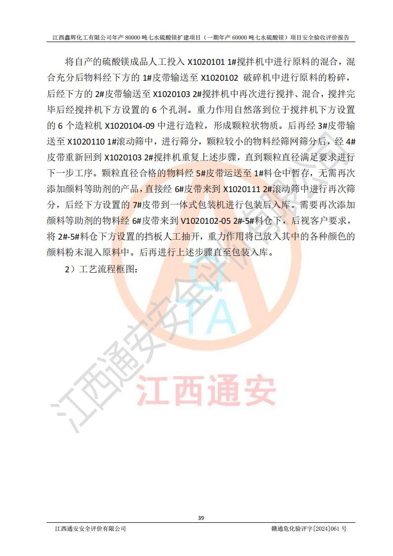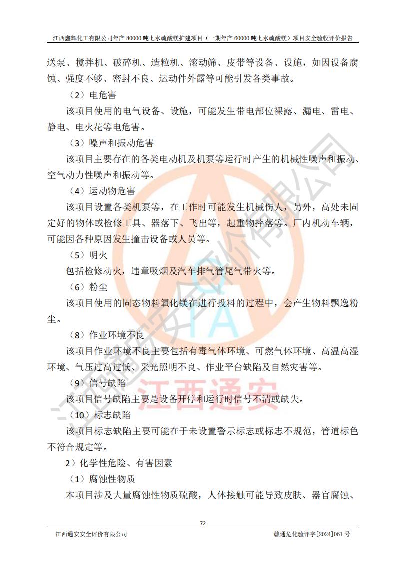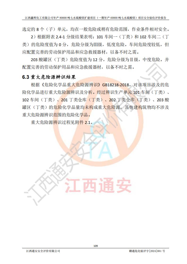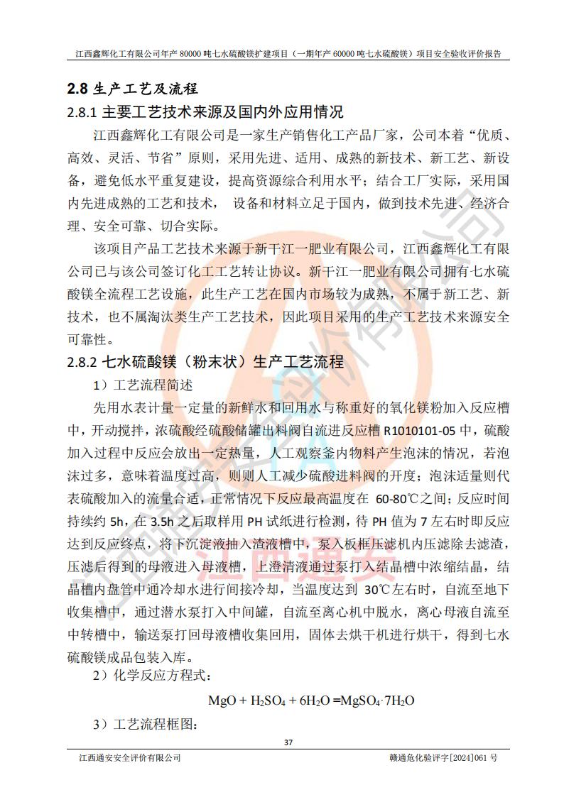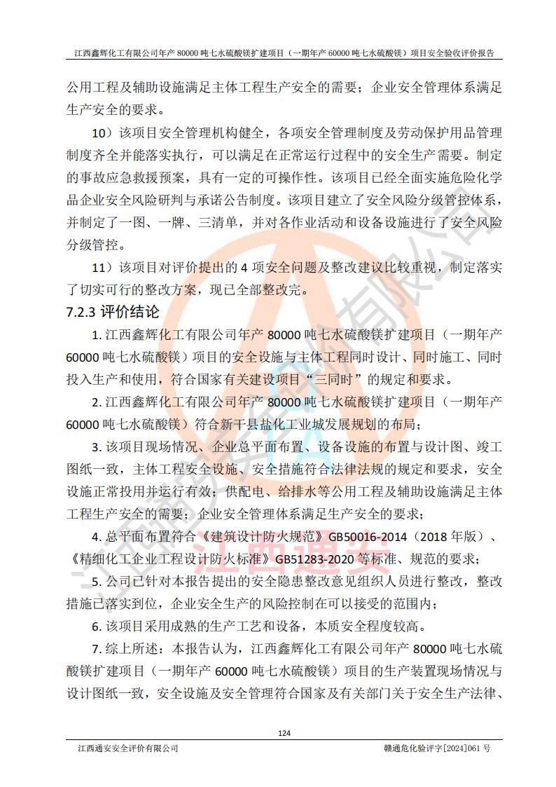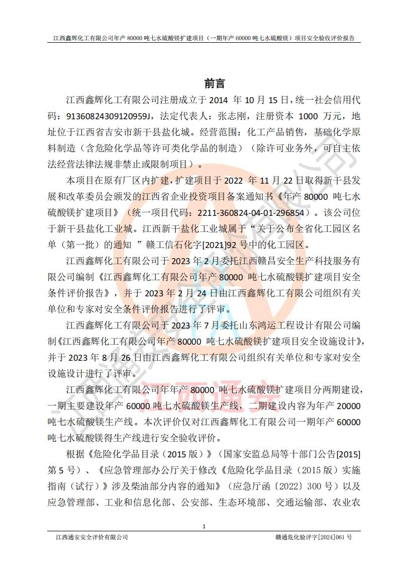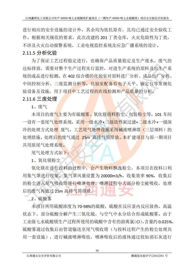 評價報告名稱 | 江西鑫輝化工有限公司年產(chǎn)80000噸七水硫酸鎂擴建項目(一期年產(chǎn)60000噸七水硫酸鎂)項目安全驗收評價 | |||