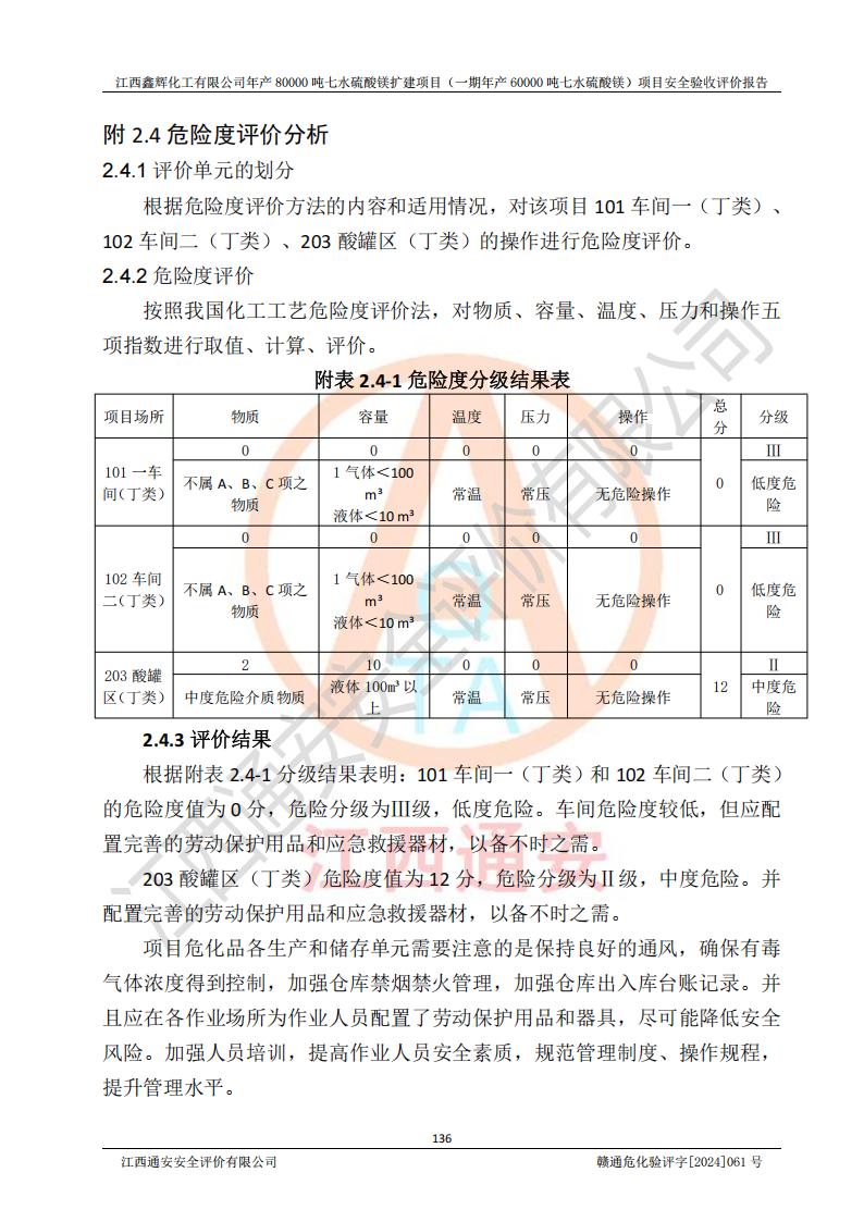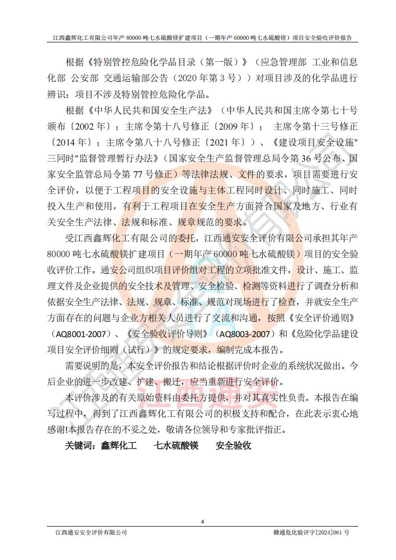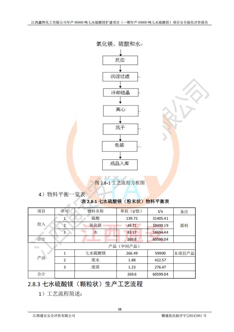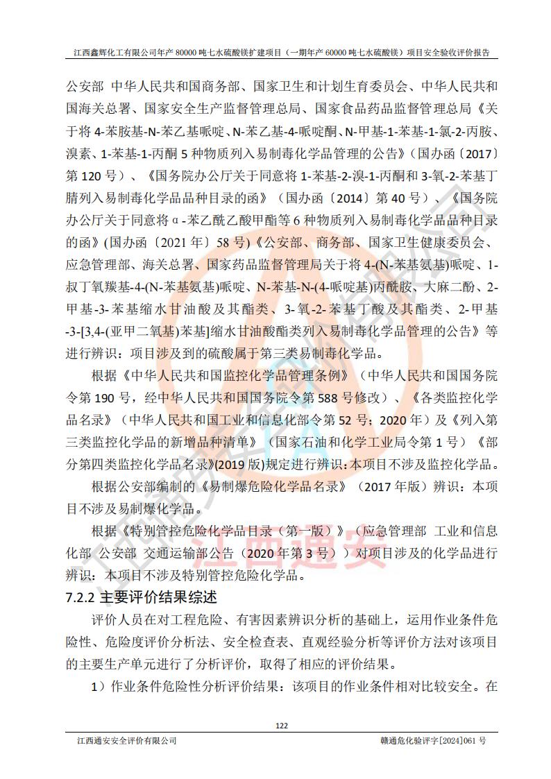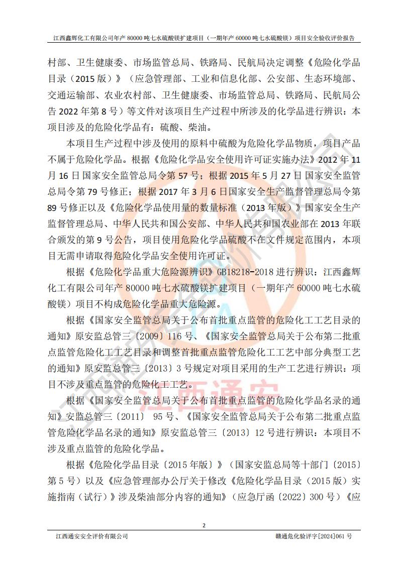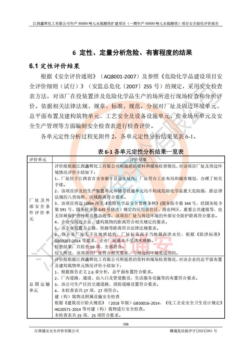 評價報告名稱 | 江西鑫輝化工有限公司年產(chǎn)80000噸七水硫酸鎂擴建項目(一期年產(chǎn)60000噸七水硫酸鎂)項目安全驗收評價 | |||