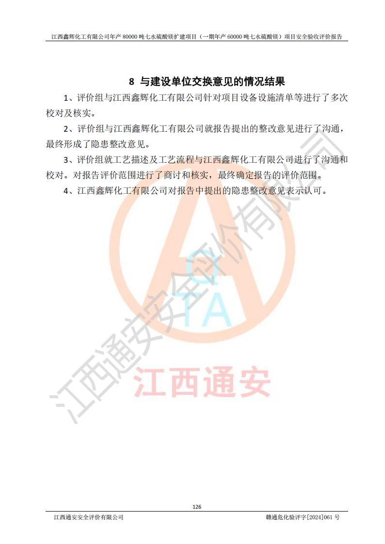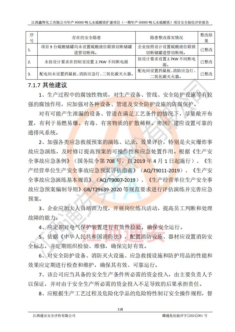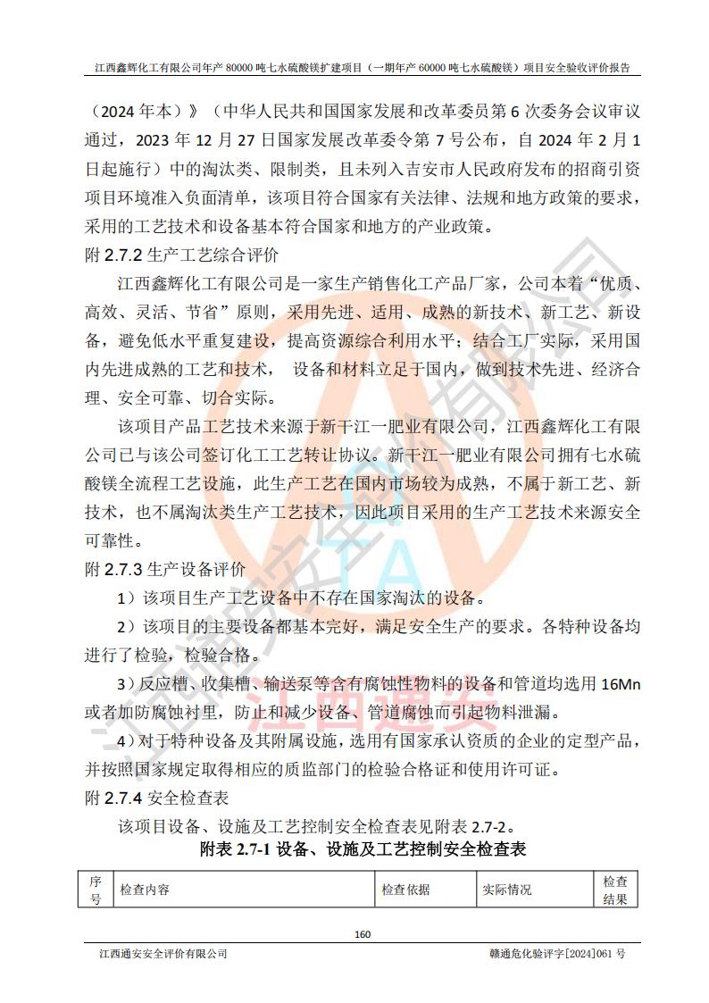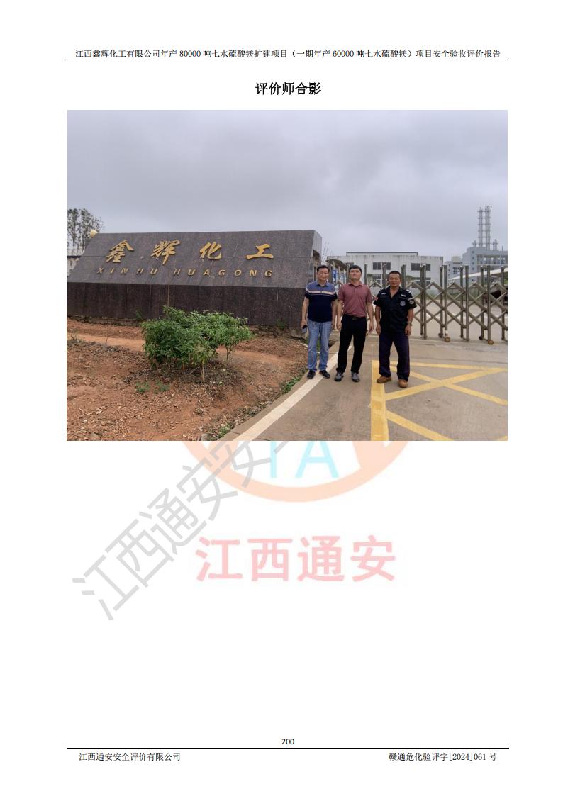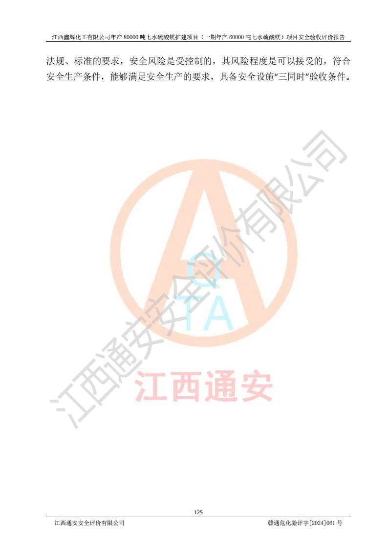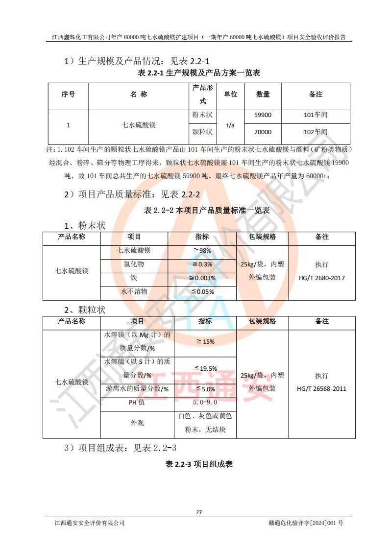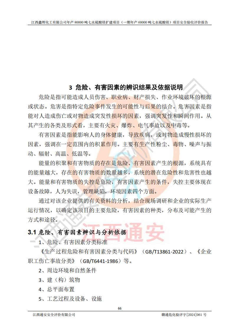 評價報告名稱 | 江西鑫輝化工有限公司年產(chǎn)80000噸七水硫酸鎂擴建項目(一期年產(chǎn)60000噸七水硫酸鎂)項目安全驗收評價 | |||