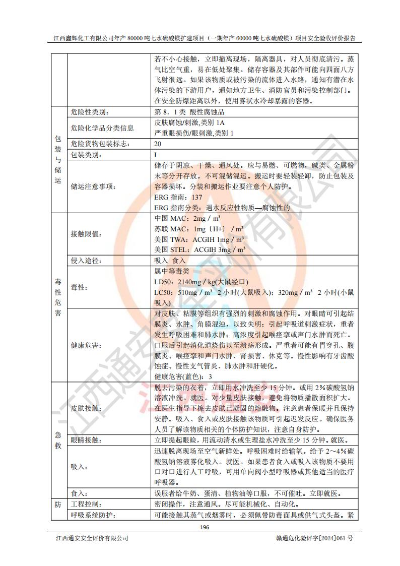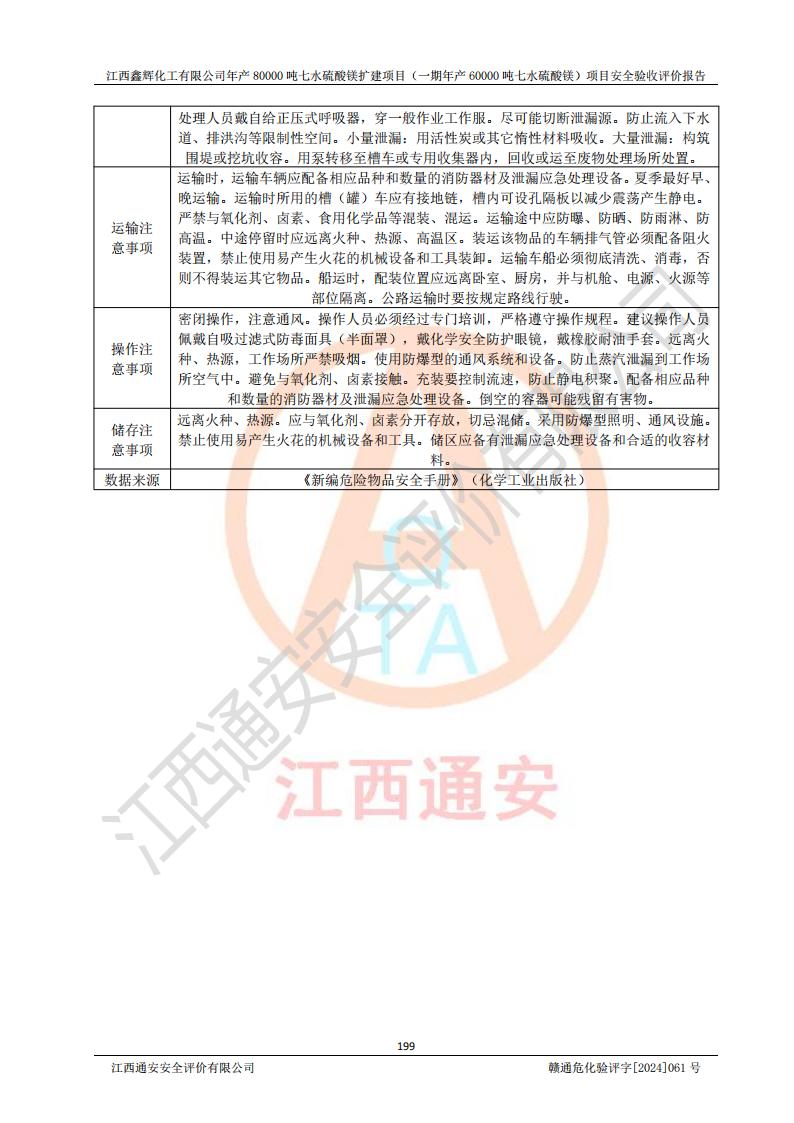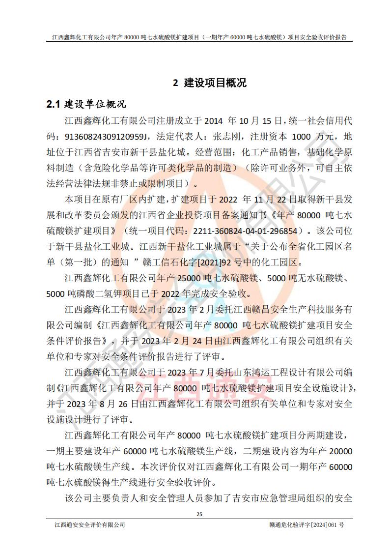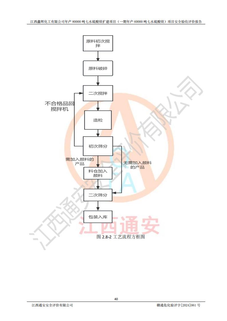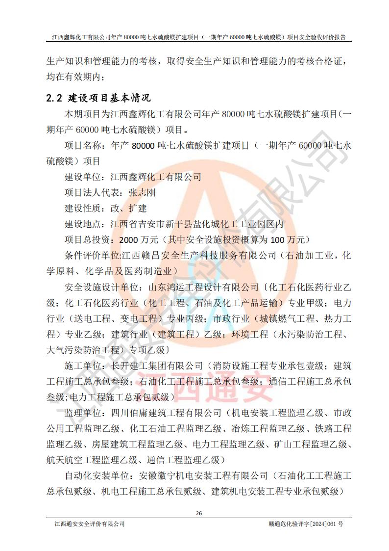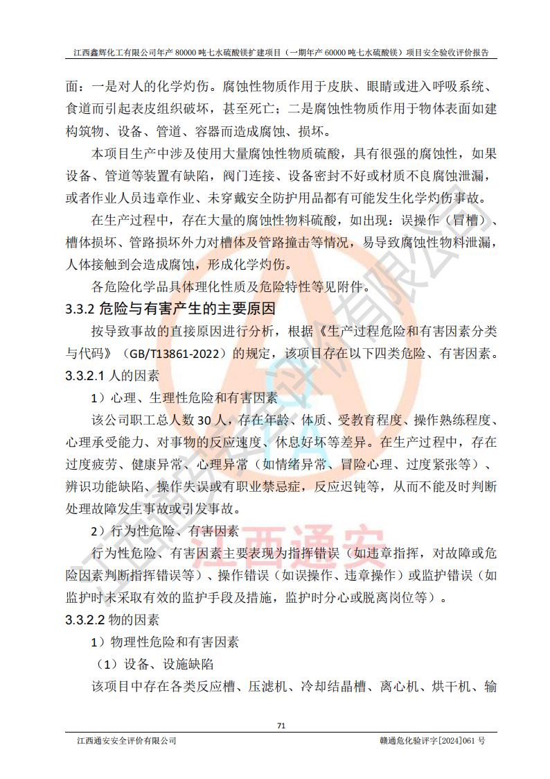 評價報告名稱 | 江西鑫輝化工有限公司年產(chǎn)80000噸七水硫酸鎂擴建項目(一期年產(chǎn)60000噸七水硫酸鎂)項目安全驗收評價 | |||