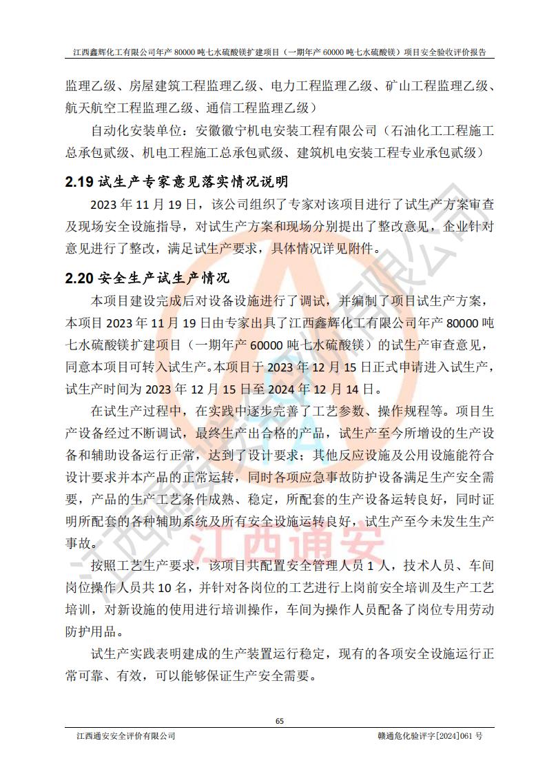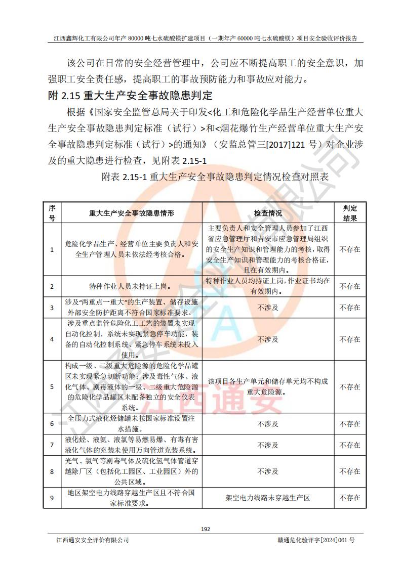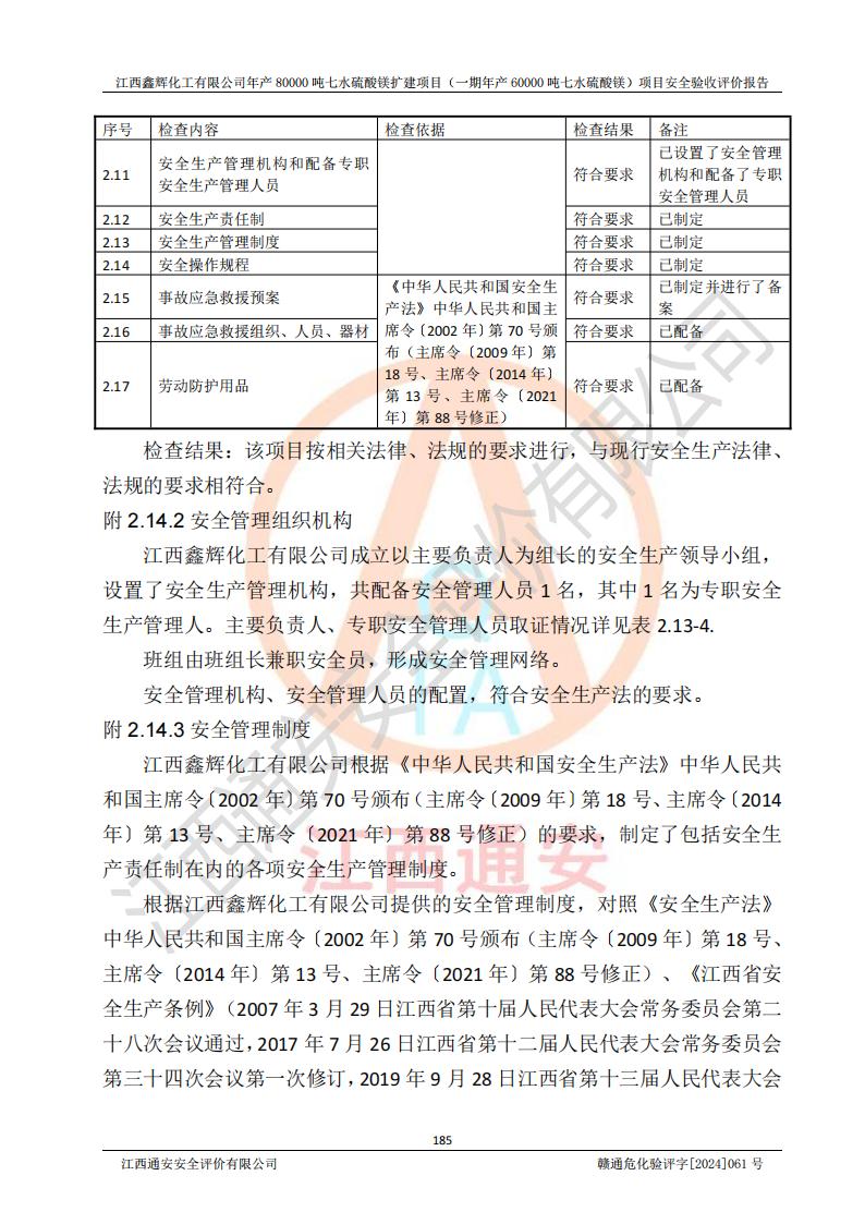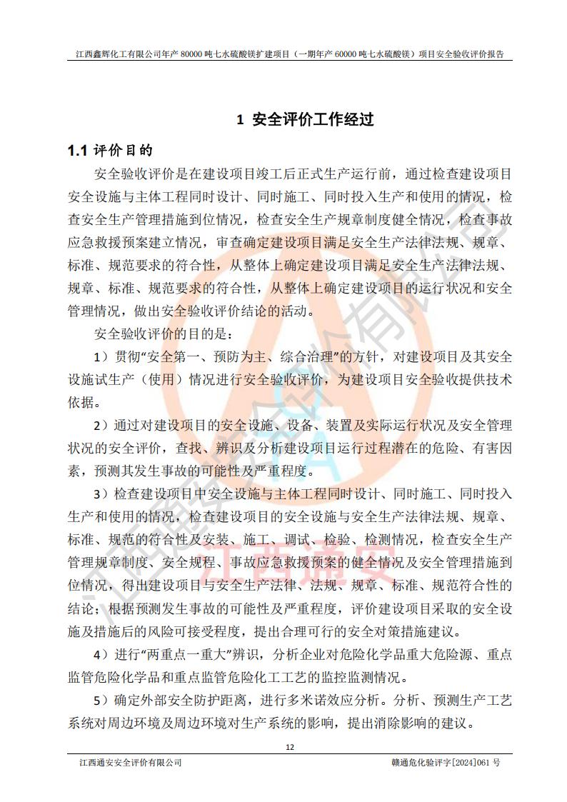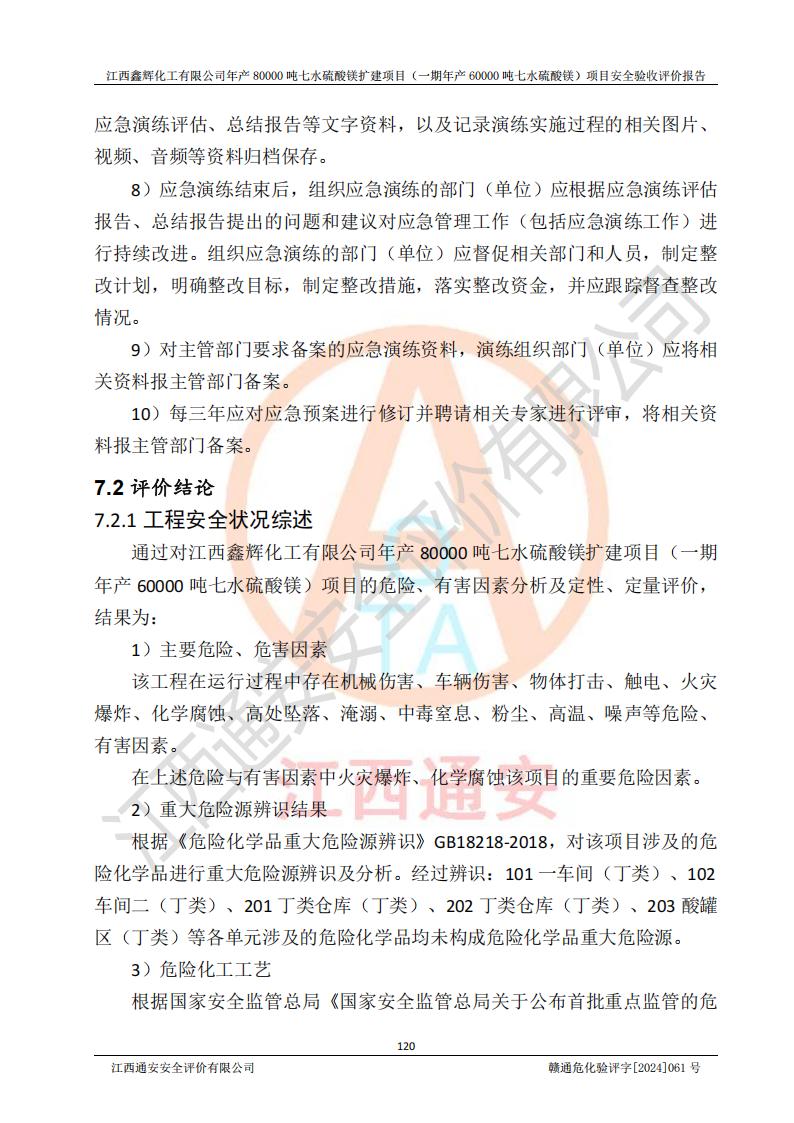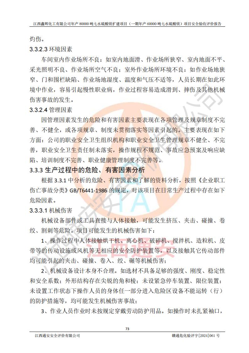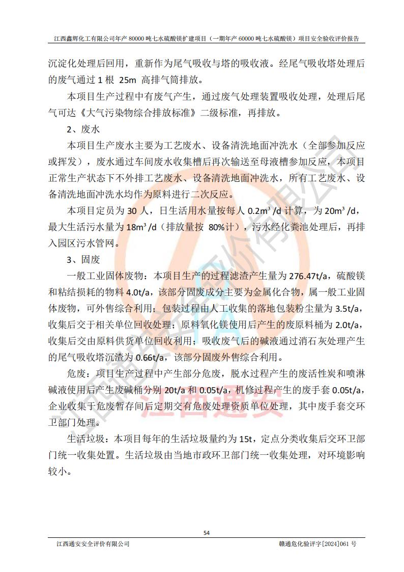 評價報告名稱 | 江西鑫輝化工有限公司年產(chǎn)80000噸七水硫酸鎂擴建項目(一期年產(chǎn)60000噸七水硫酸鎂)項目安全驗收評價 | |||