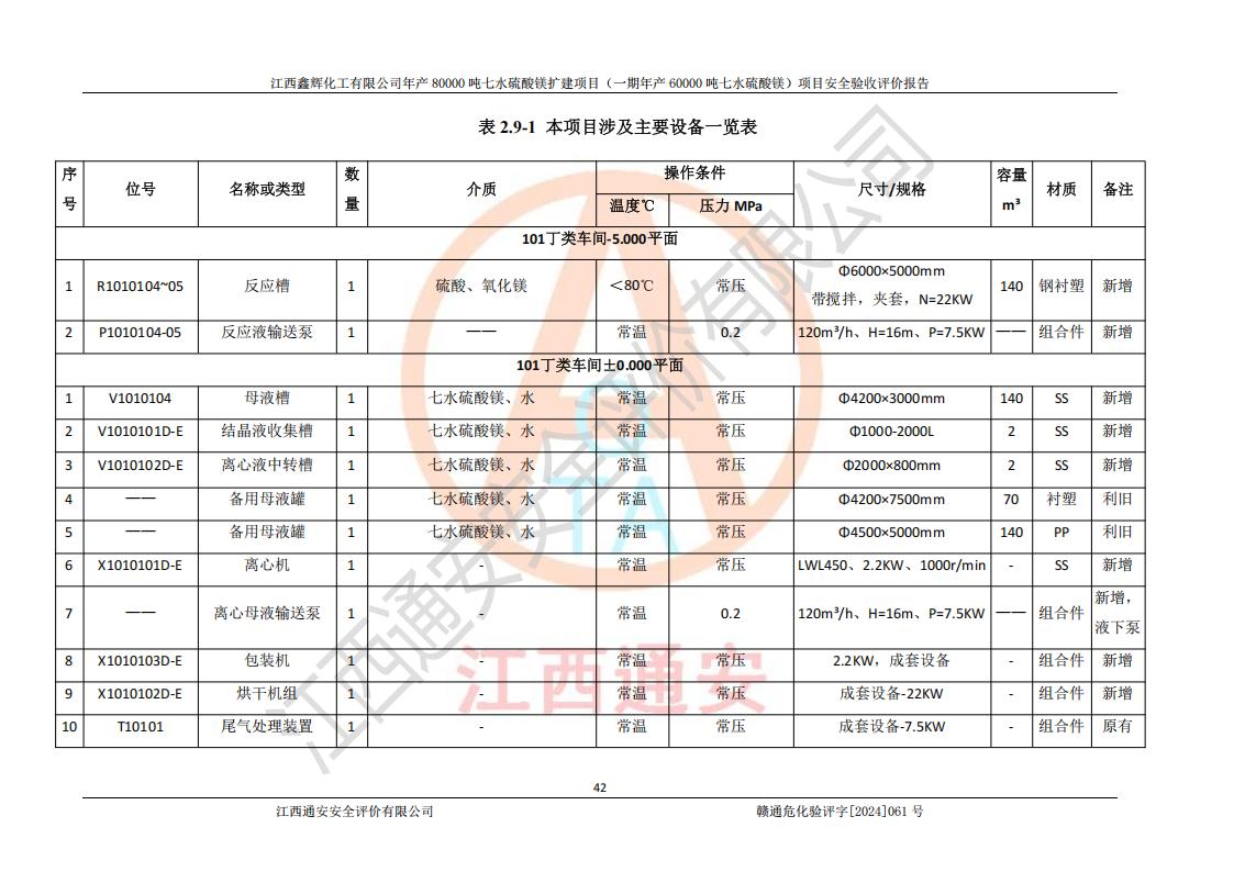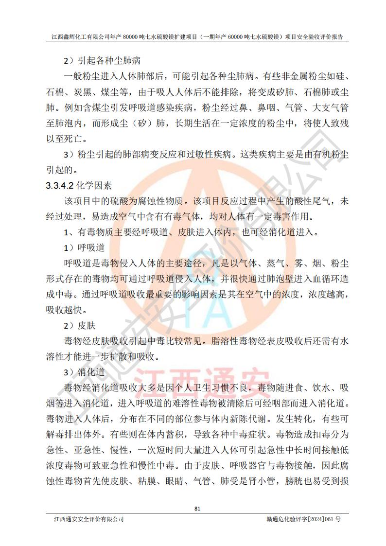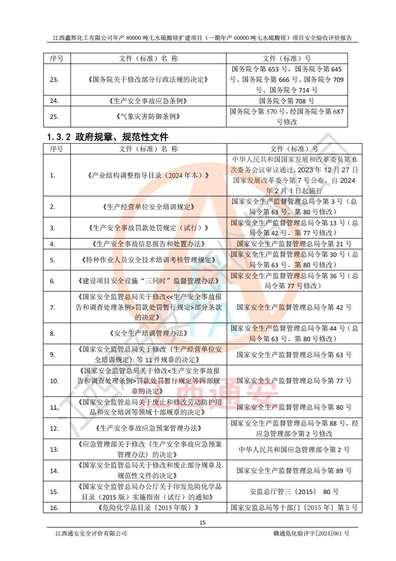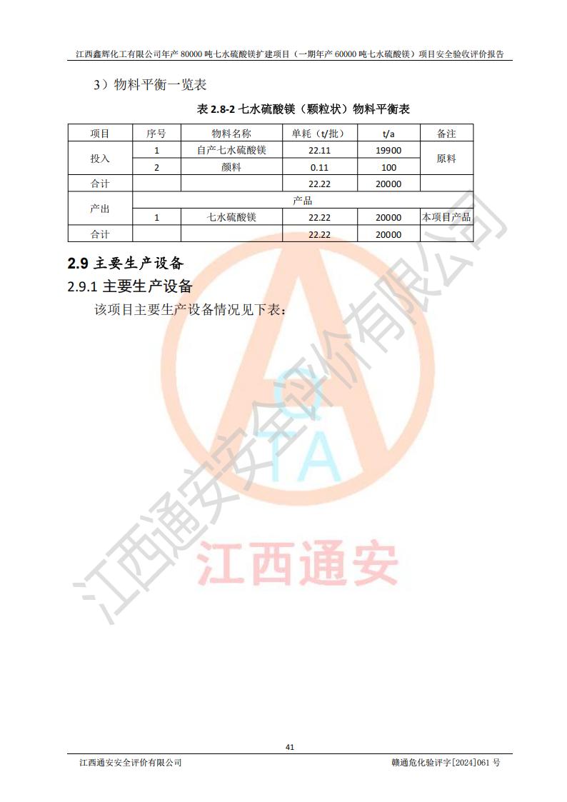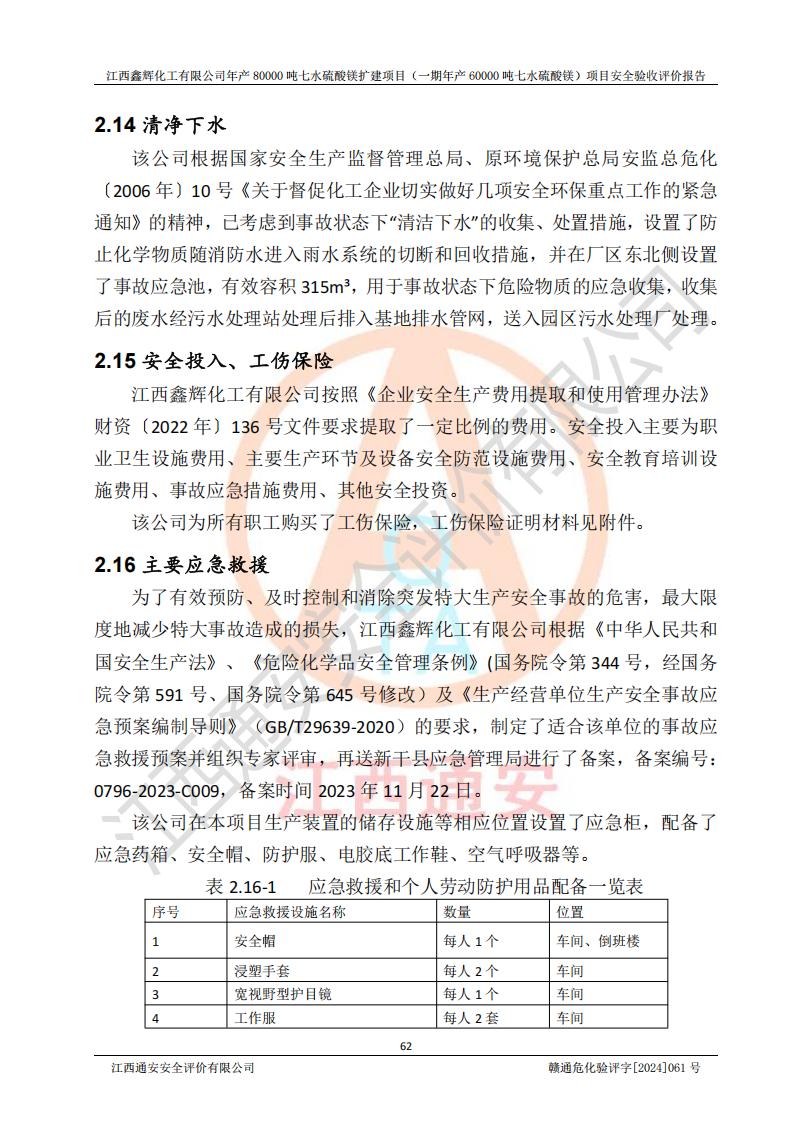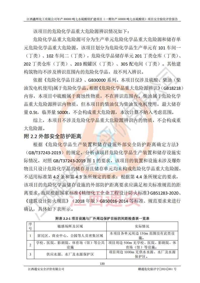 評價報告名稱 | 江西鑫輝化工有限公司年產(chǎn)80000噸七水硫酸鎂擴建項目(一期年產(chǎn)60000噸七水硫酸鎂)項目安全驗收評價 | |||