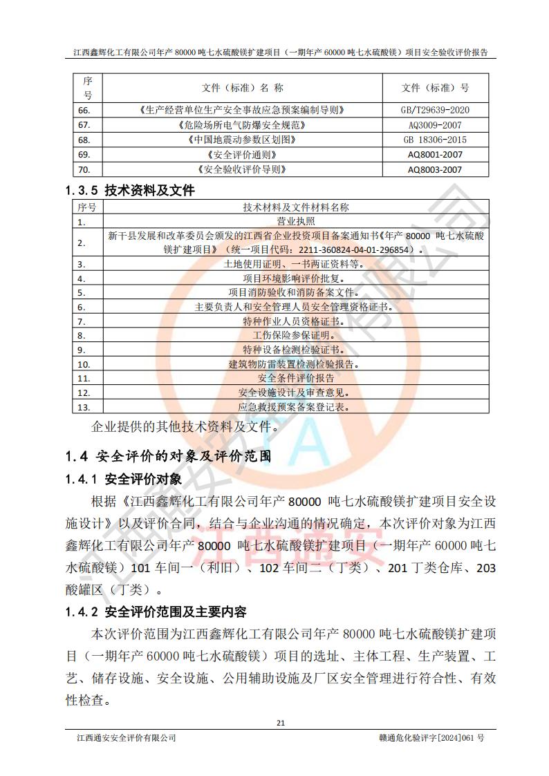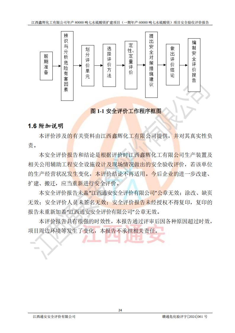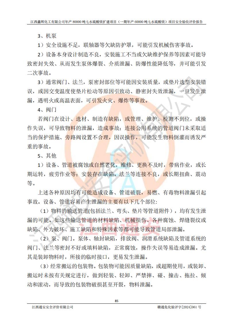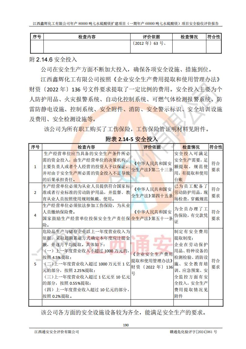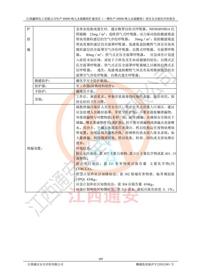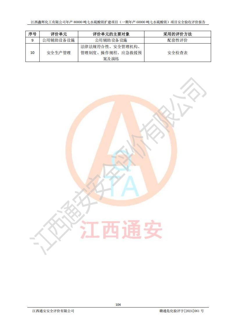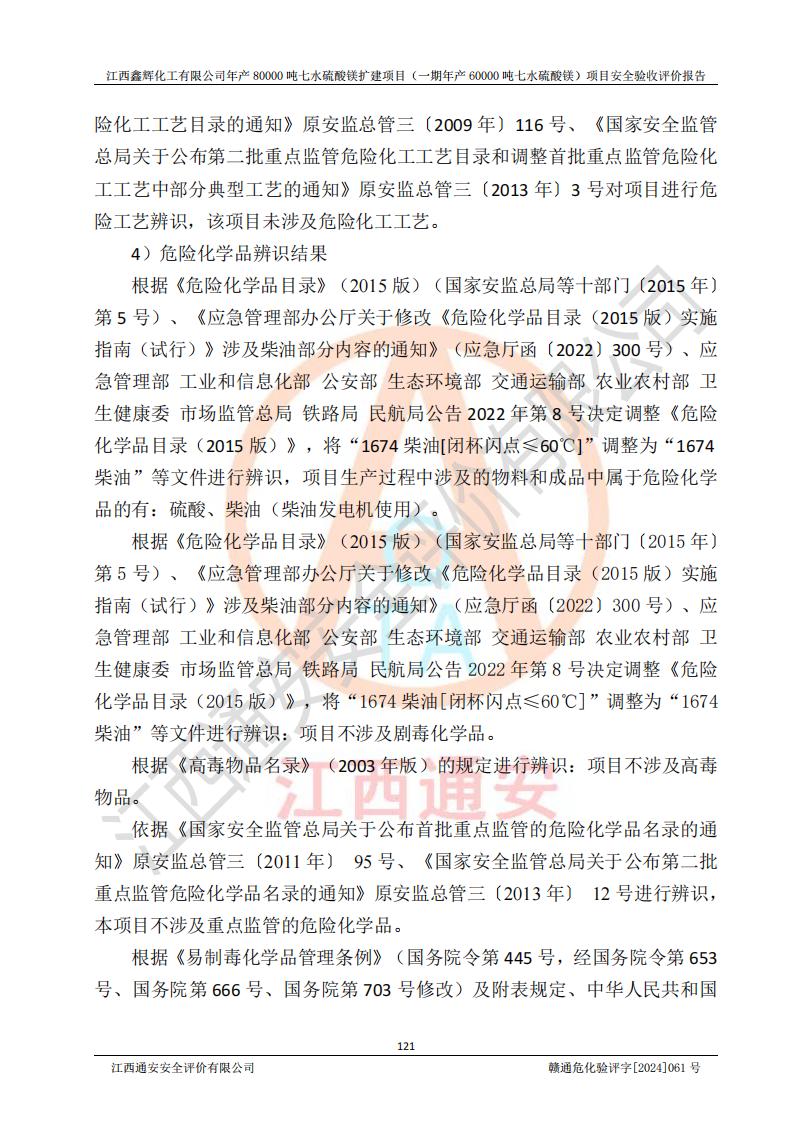 評價報告名稱 | 江西鑫輝化工有限公司年產(chǎn)80000噸七水硫酸鎂擴建項目(一期年產(chǎn)60000噸七水硫酸鎂)項目安全驗收評價 | |||
