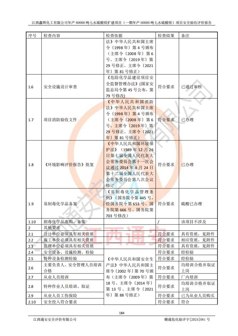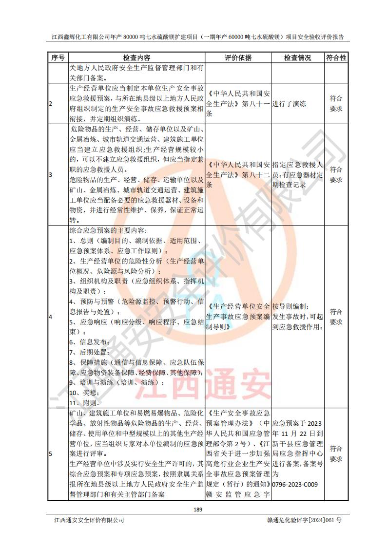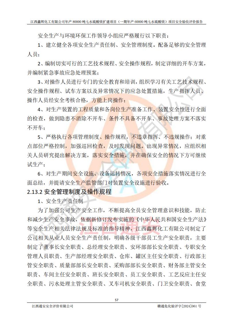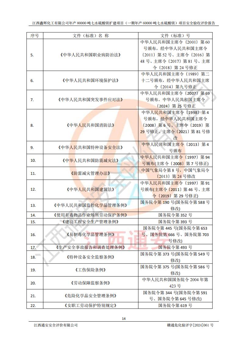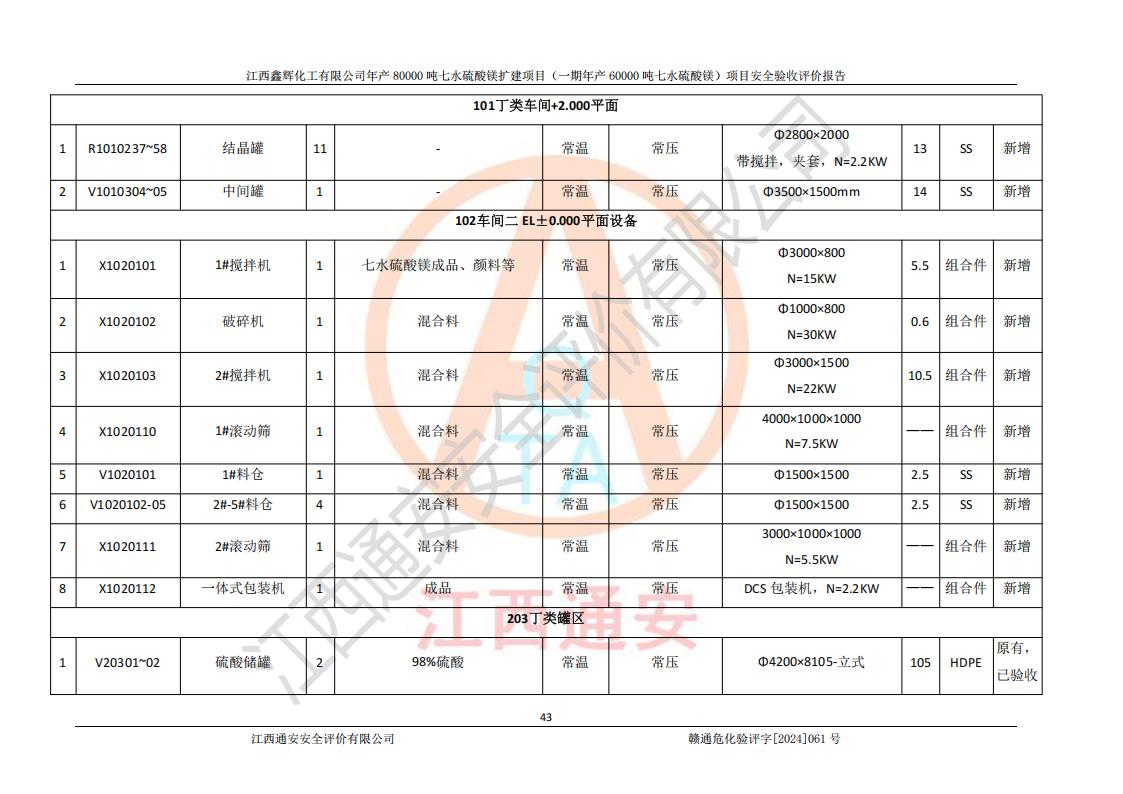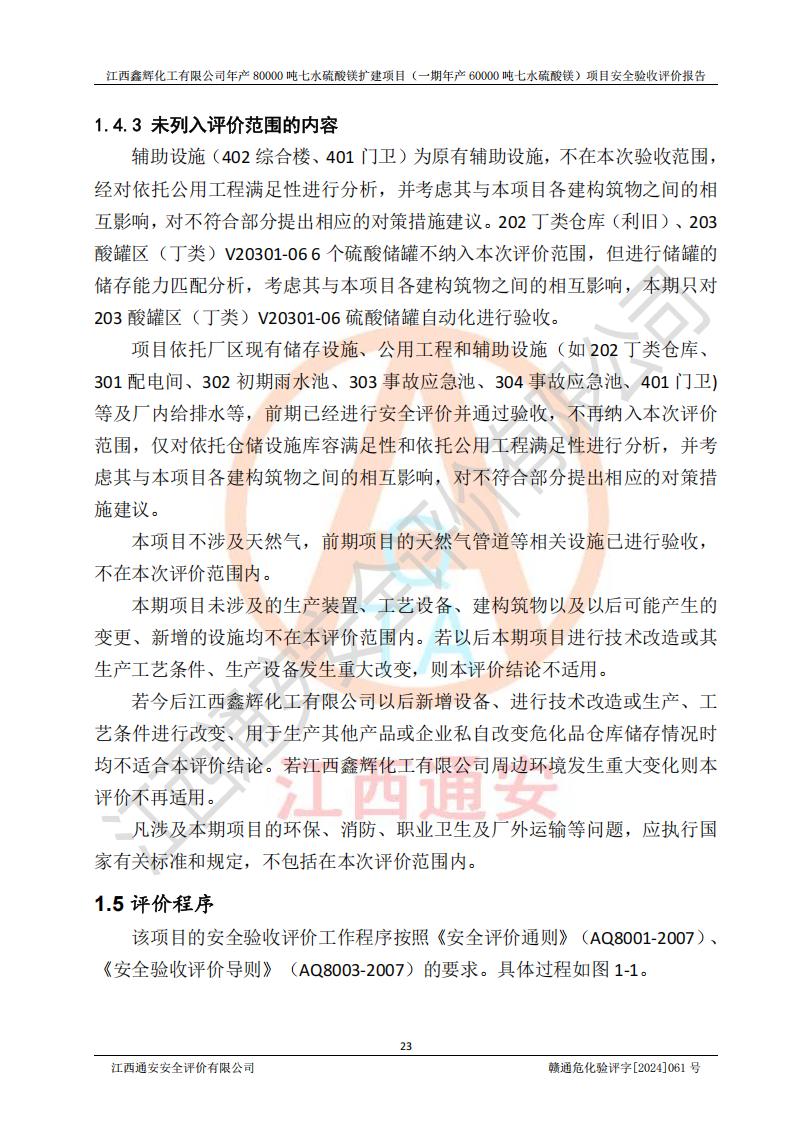 評價報告名稱 | 江西鑫輝化工有限公司年產(chǎn)80000噸七水硫酸鎂擴建項目(一期年產(chǎn)60000噸七水硫酸鎂)項目安全驗收評價 | |||
