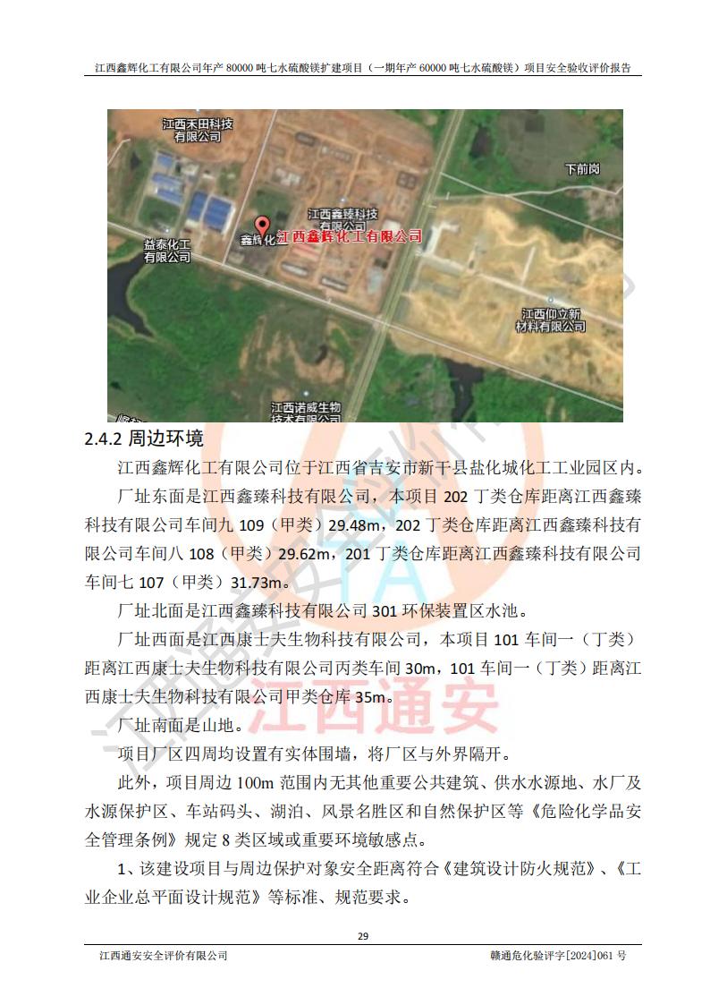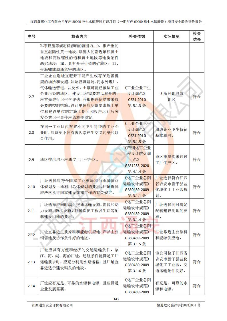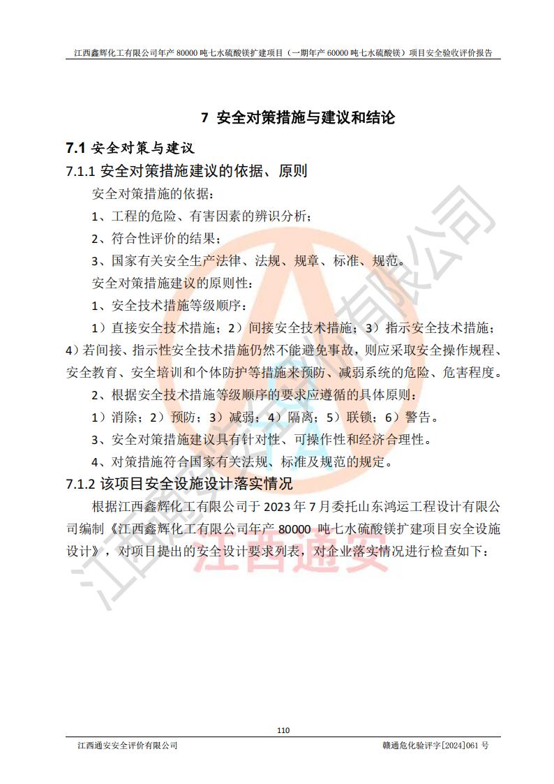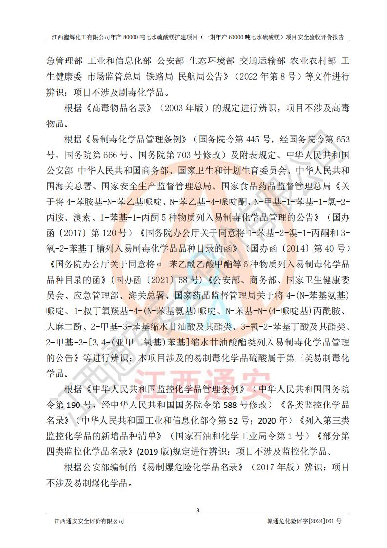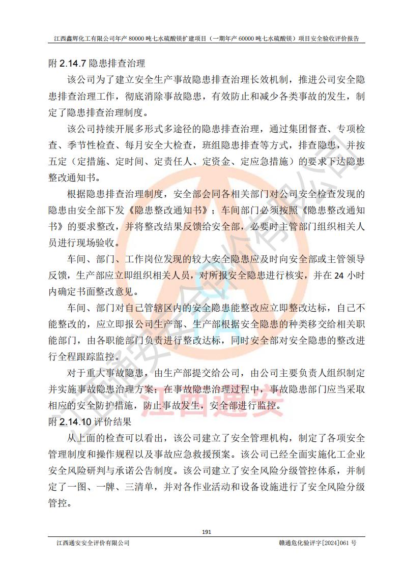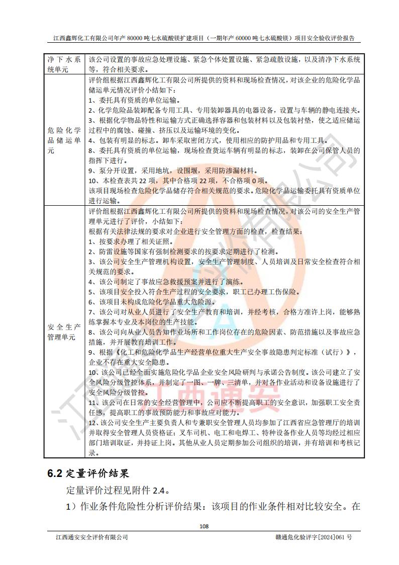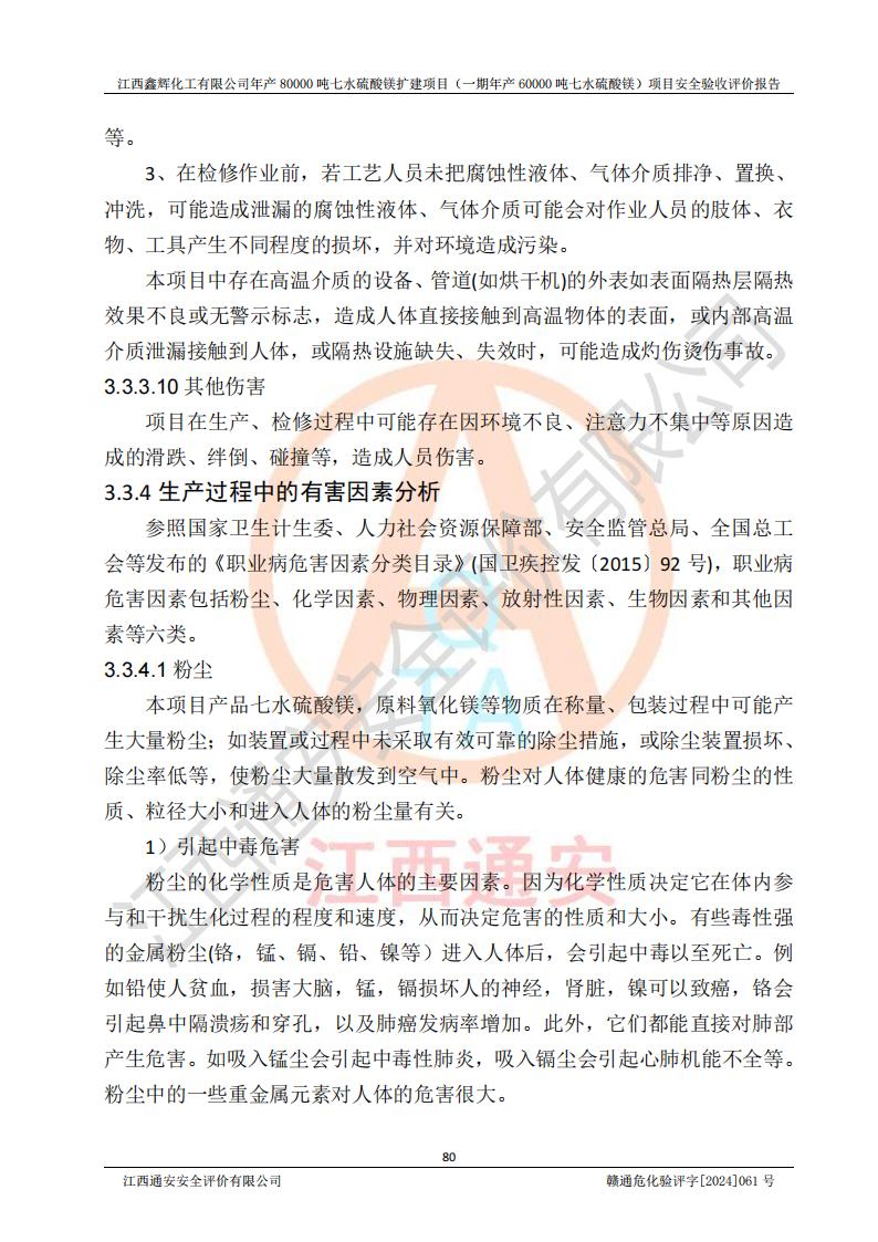評價報告名稱 | 江西鑫輝化工有限公司年產(chǎn)80000噸七水硫酸鎂擴建項目(一期年產(chǎn)60000噸七水硫酸鎂)項目安全驗收評價 | |||