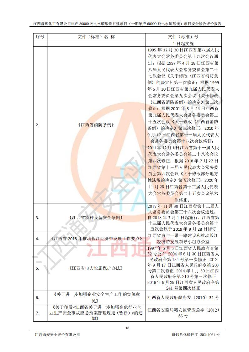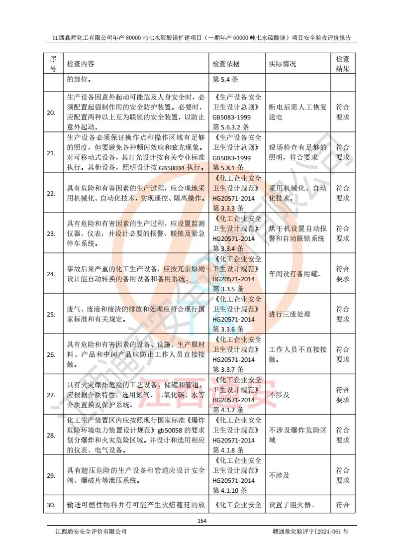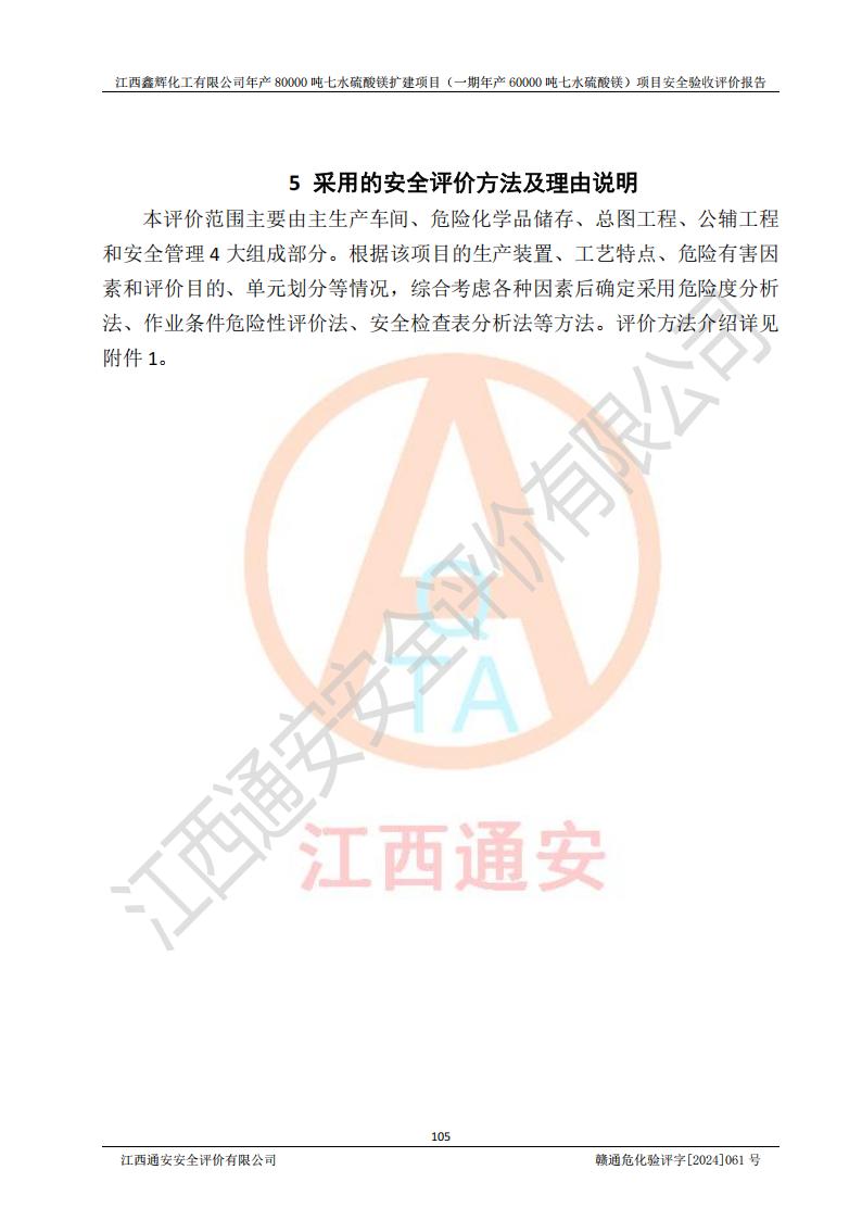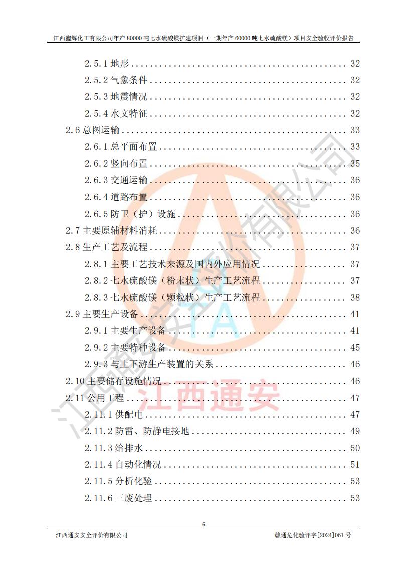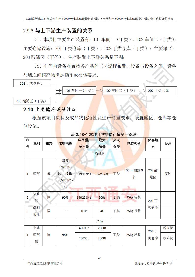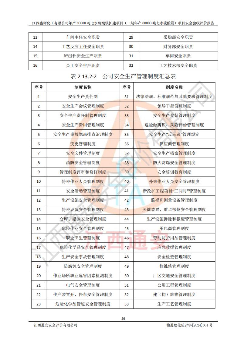 評價報告名稱 | 江西鑫輝化工有限公司年產(chǎn)80000噸七水硫酸鎂擴建項目(一期年產(chǎn)60000噸七水硫酸鎂)項目安全驗收評價 | |||