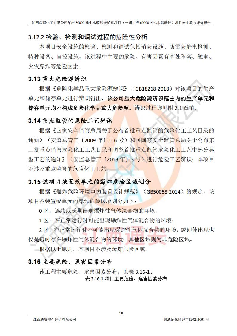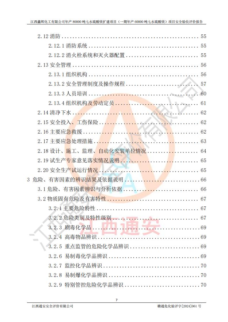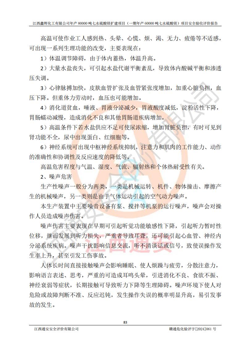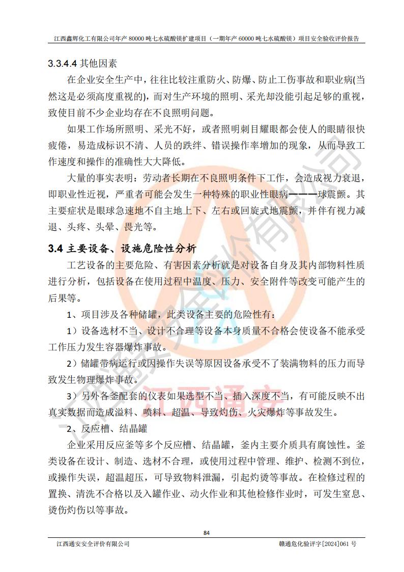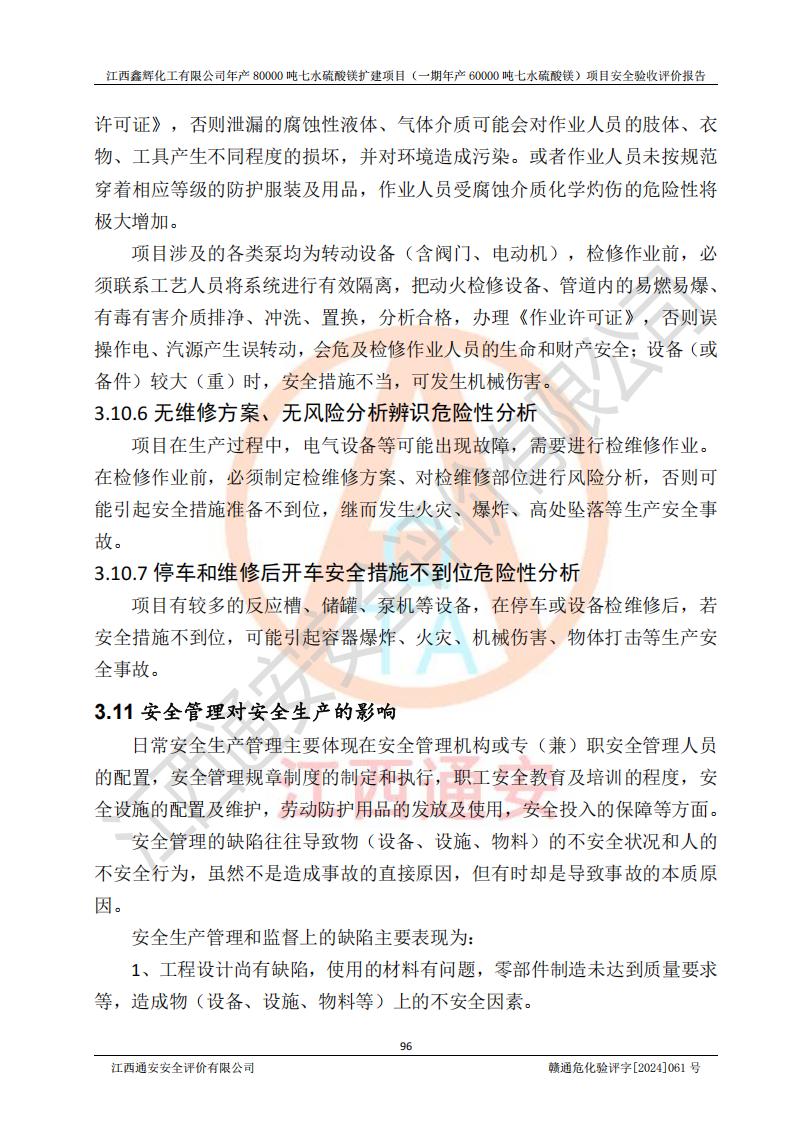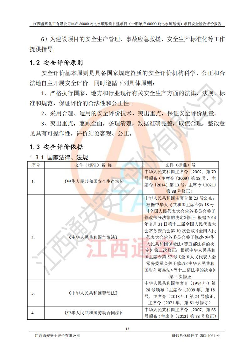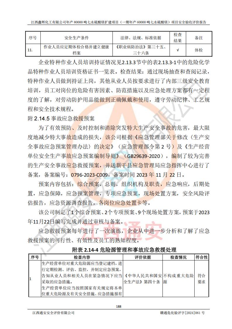 評價報告名稱 | 江西鑫輝化工有限公司年產(chǎn)80000噸七水硫酸鎂擴建項目(一期年產(chǎn)60000噸七水硫酸鎂)項目安全驗收評價 | |||