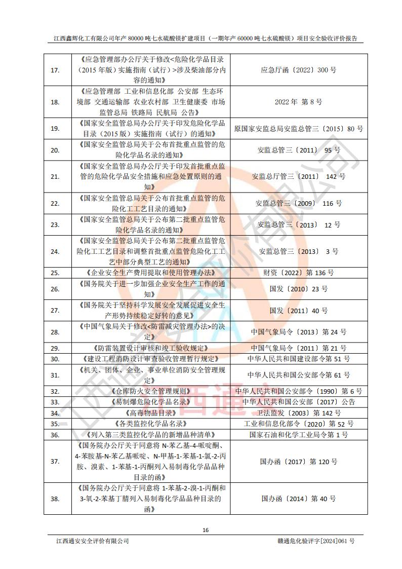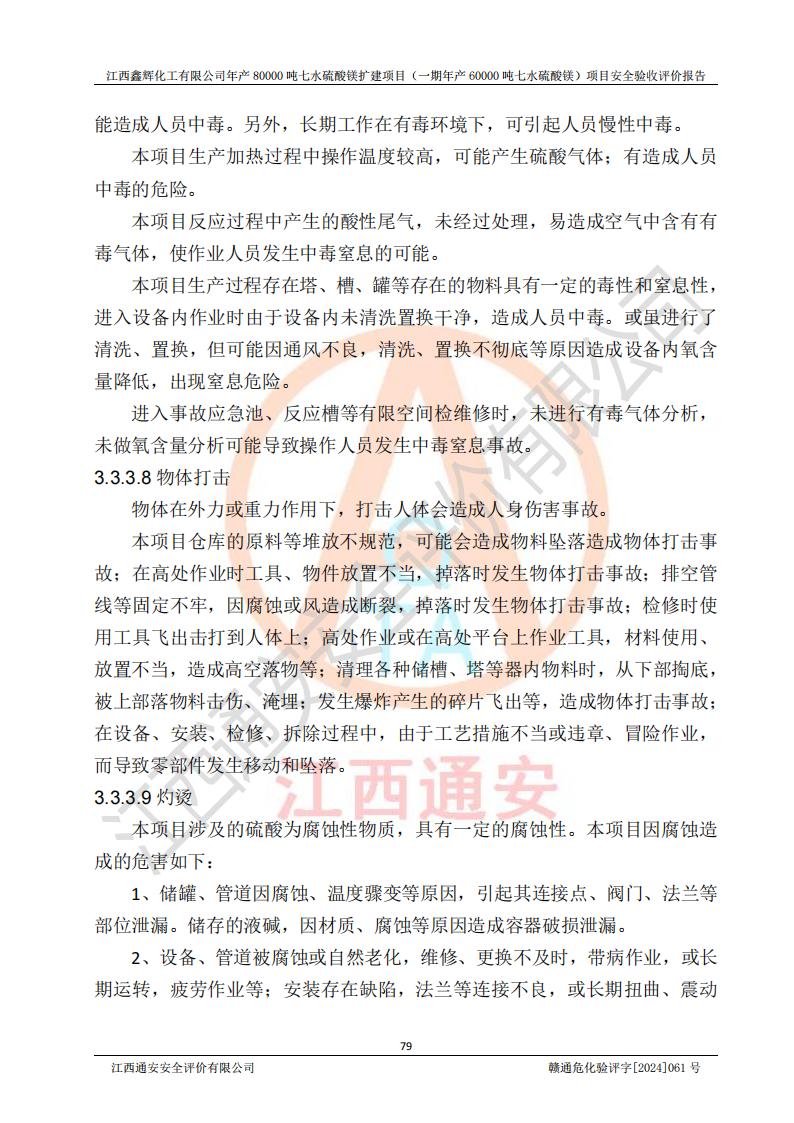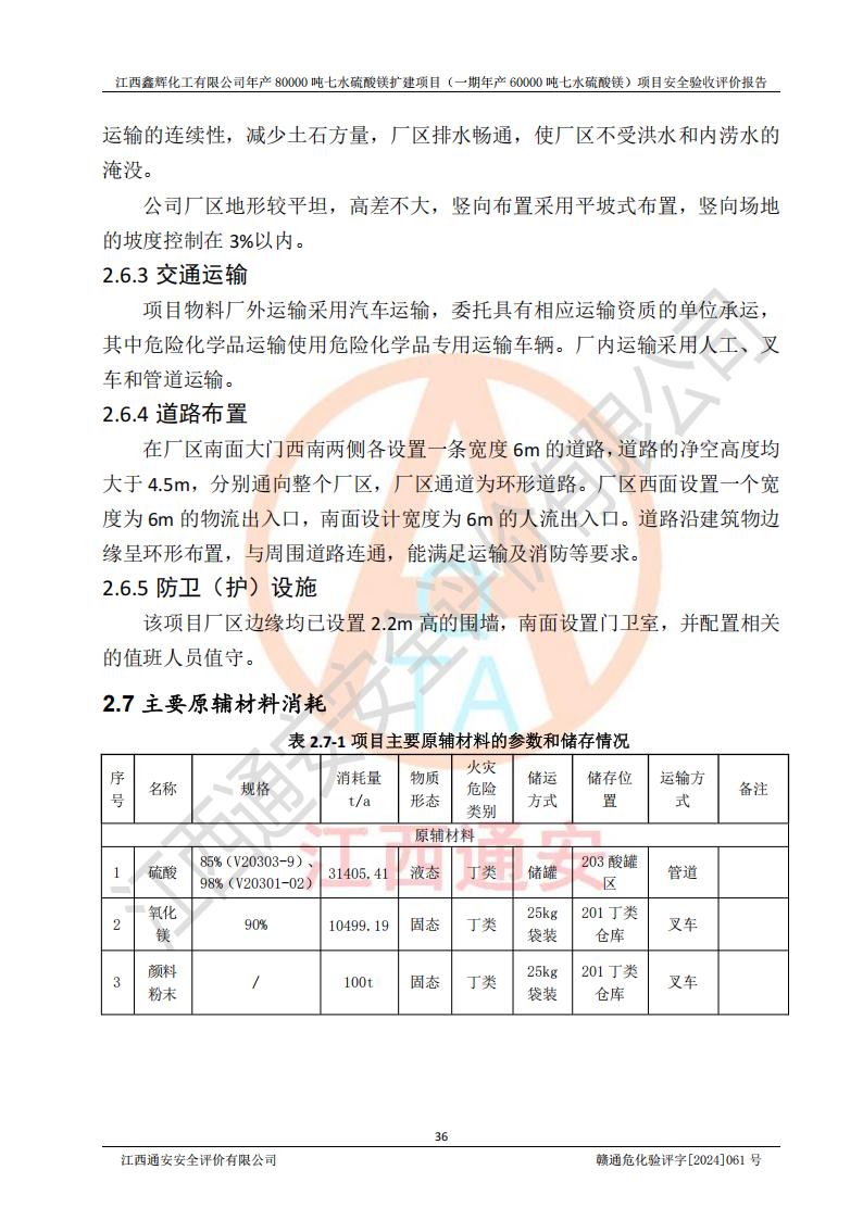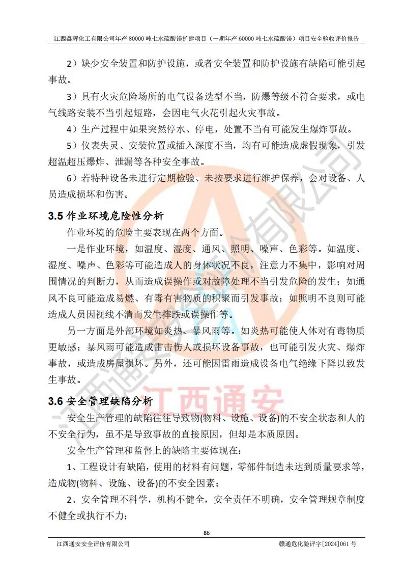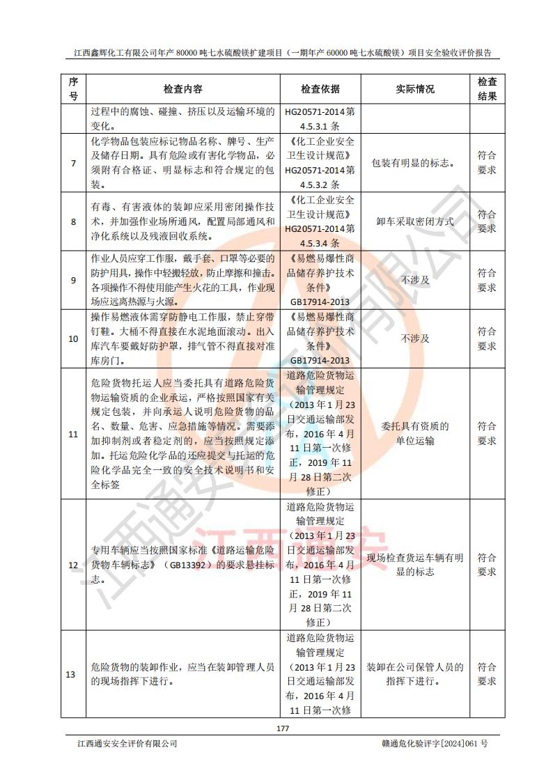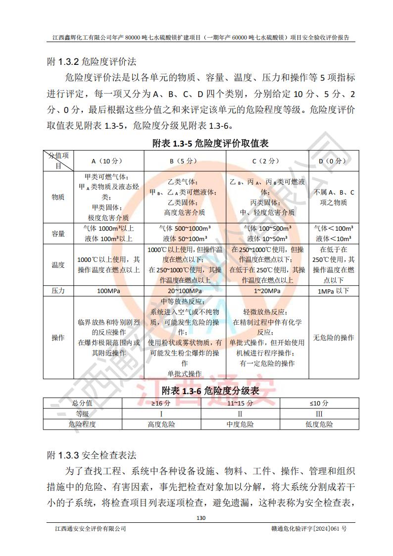 評價報告名稱 | 江西鑫輝化工有限公司年產(chǎn)80000噸七水硫酸鎂擴建項目(一期年產(chǎn)60000噸七水硫酸鎂)項目安全驗收評價 | |||