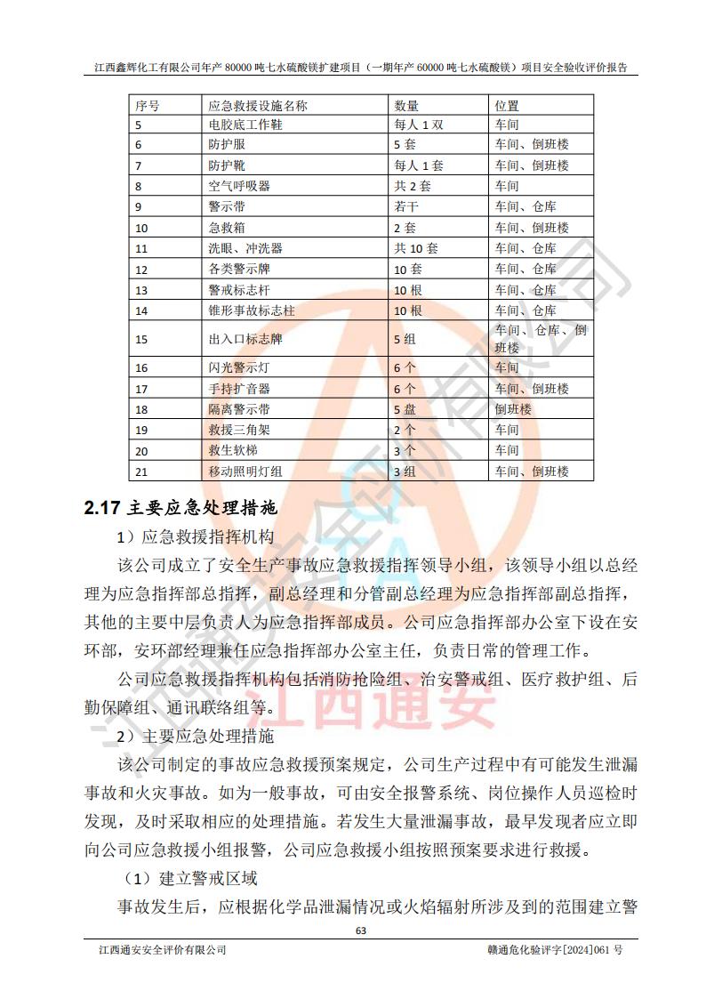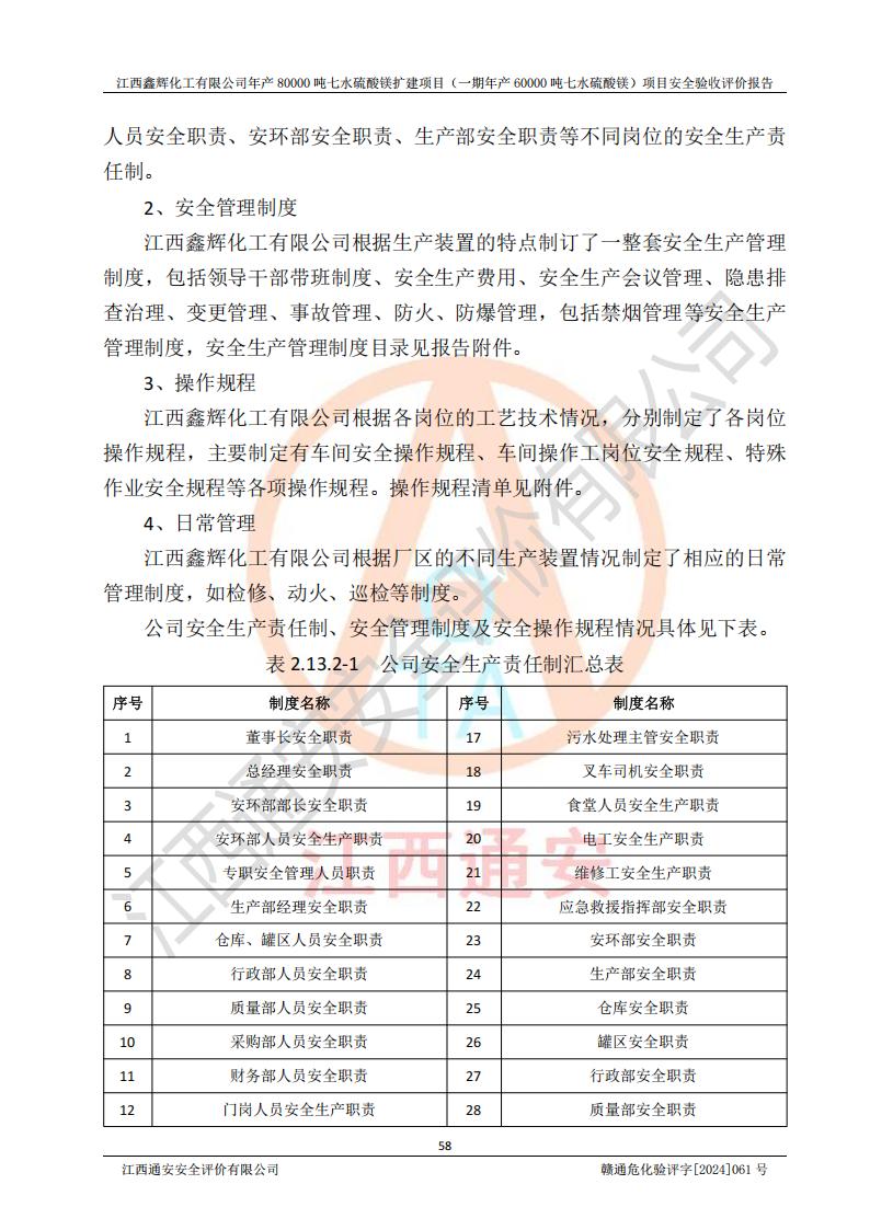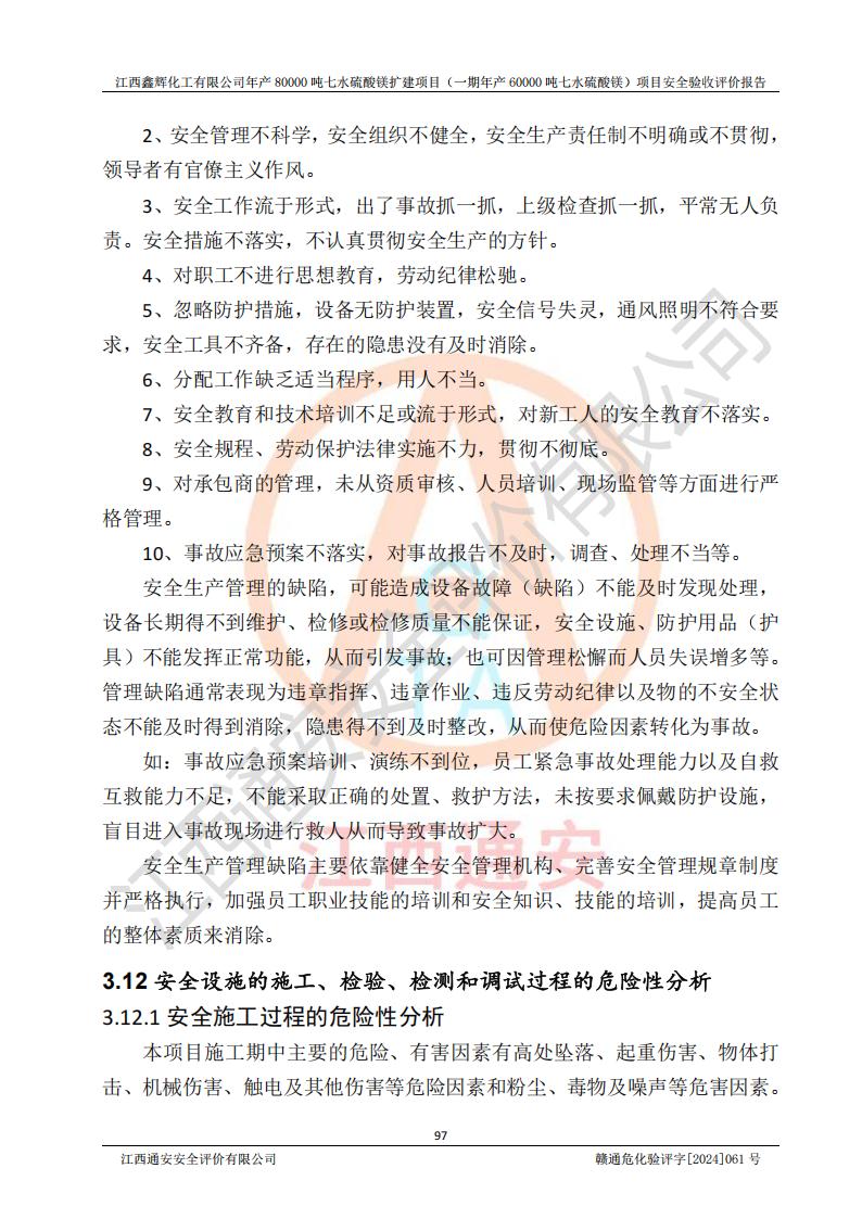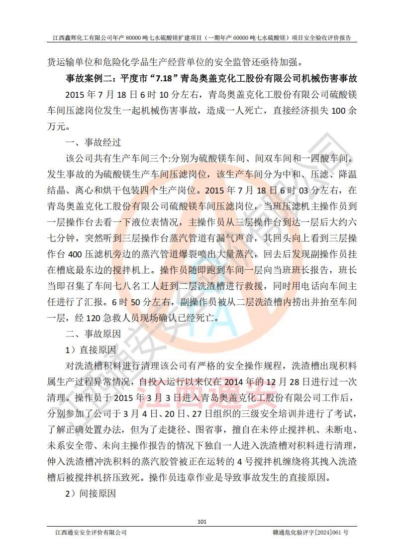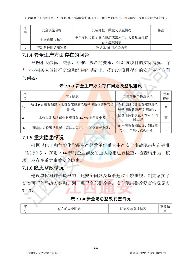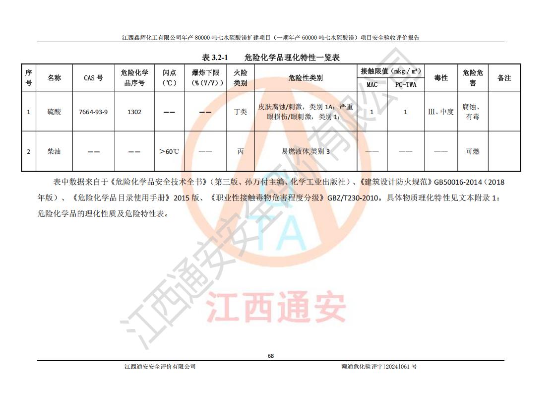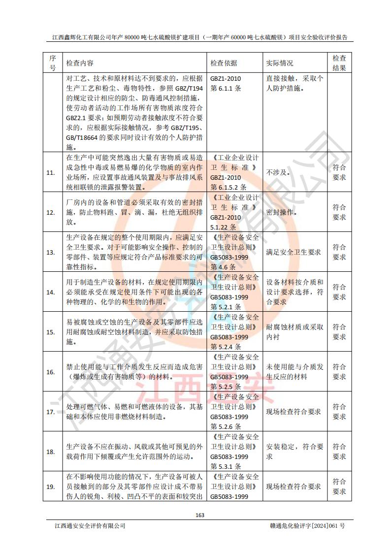 評價報告名稱 | 江西鑫輝化工有限公司年產(chǎn)80000噸七水硫酸鎂擴建項目(一期年產(chǎn)60000噸七水硫酸鎂)項目安全驗收評價 | |||