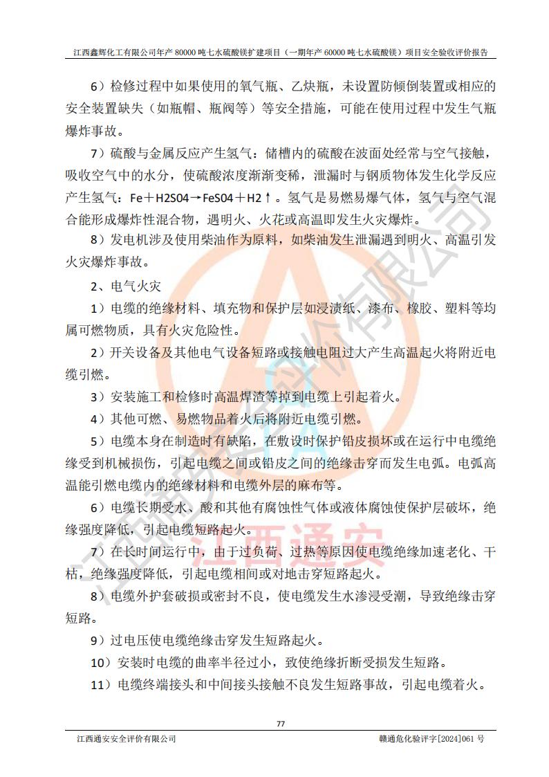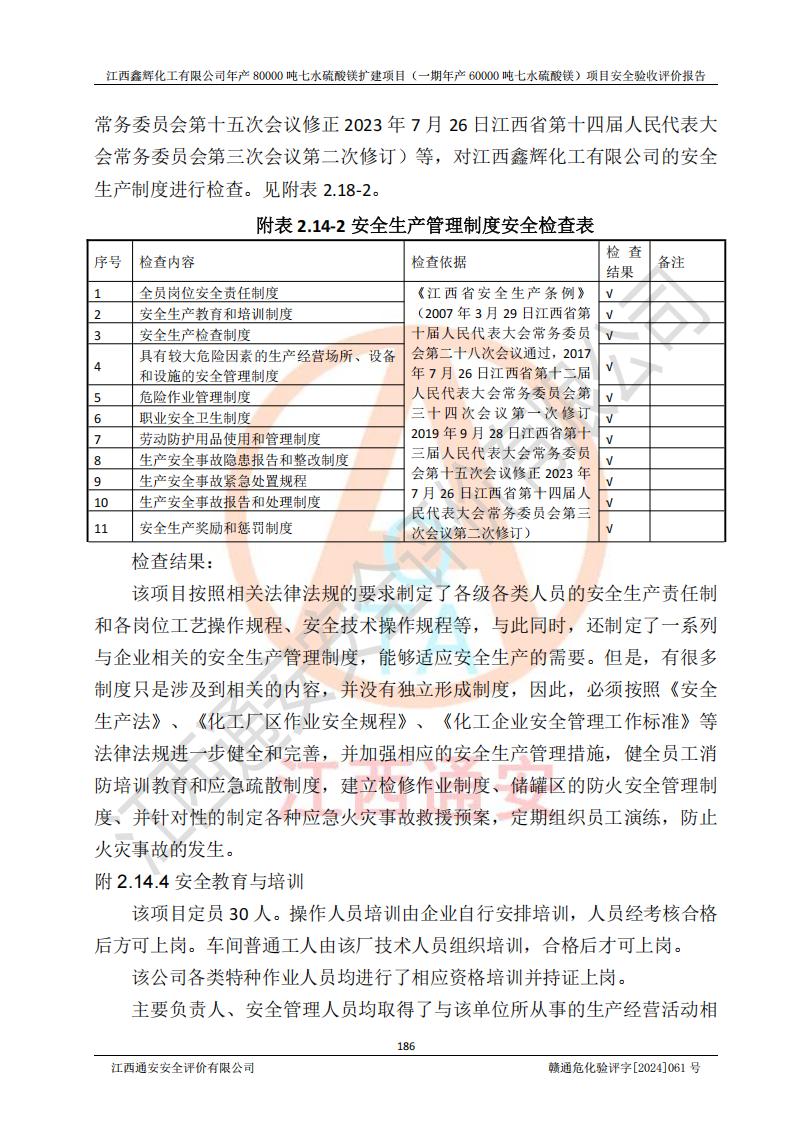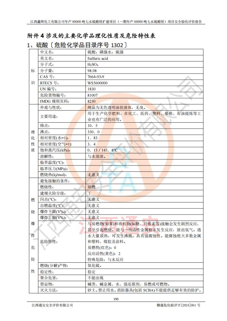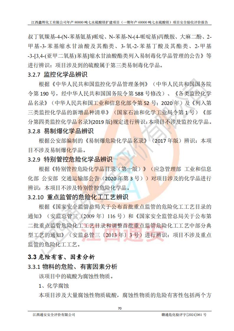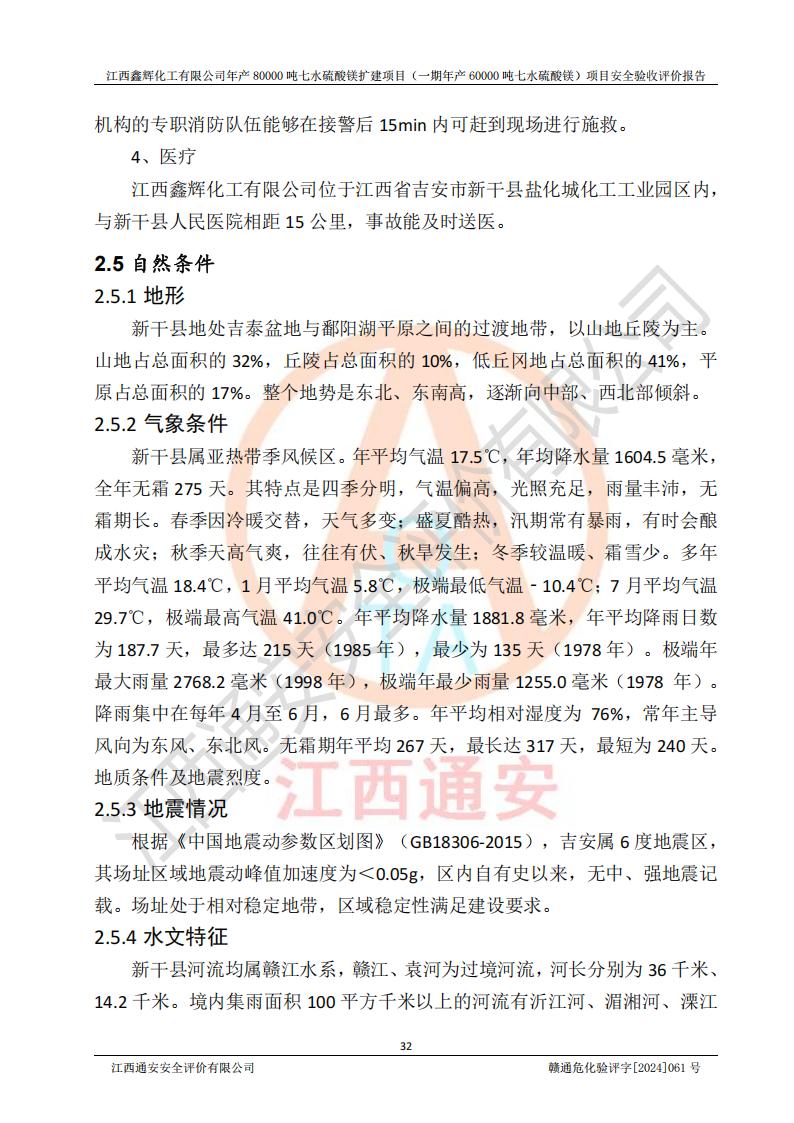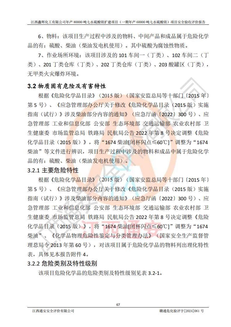 評價報告名稱 | 江西鑫輝化工有限公司年產(chǎn)80000噸七水硫酸鎂擴建項目(一期年產(chǎn)60000噸七水硫酸鎂)項目安全驗收評價 | |||