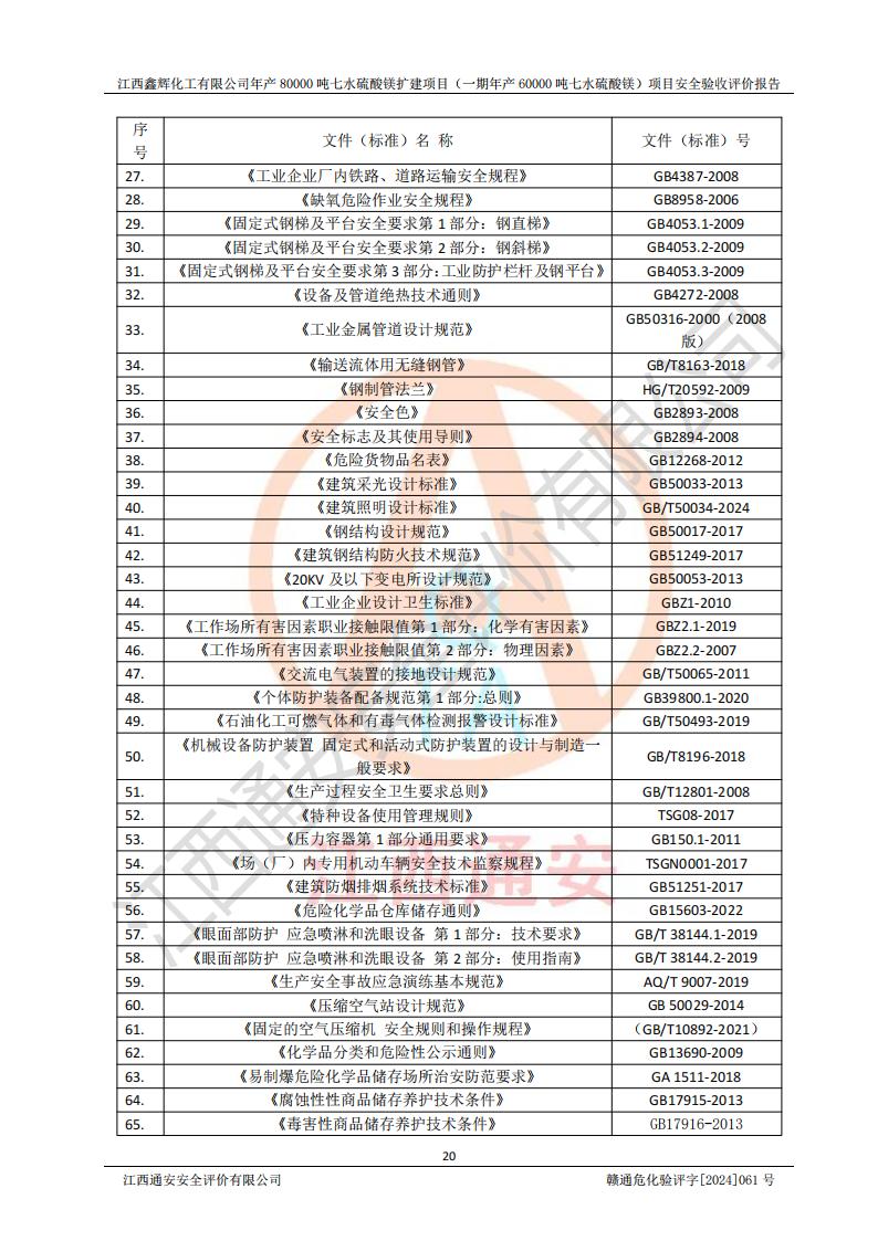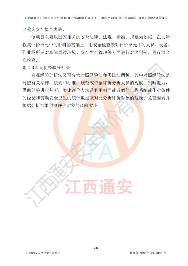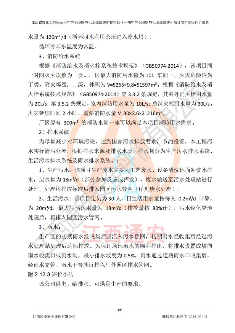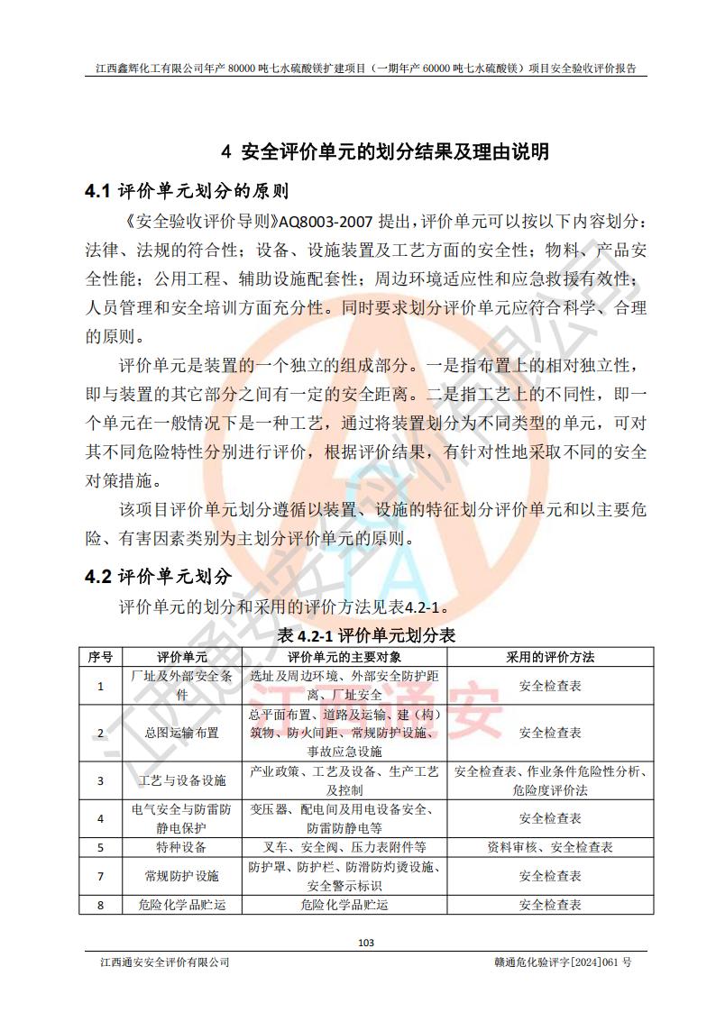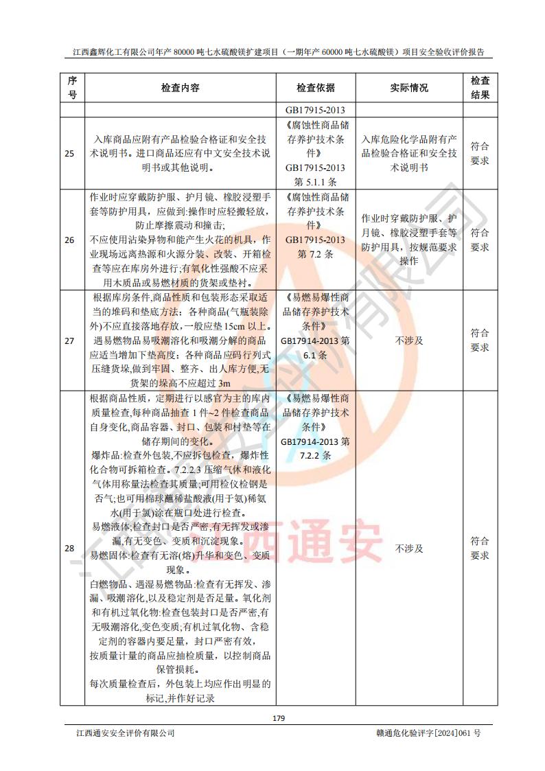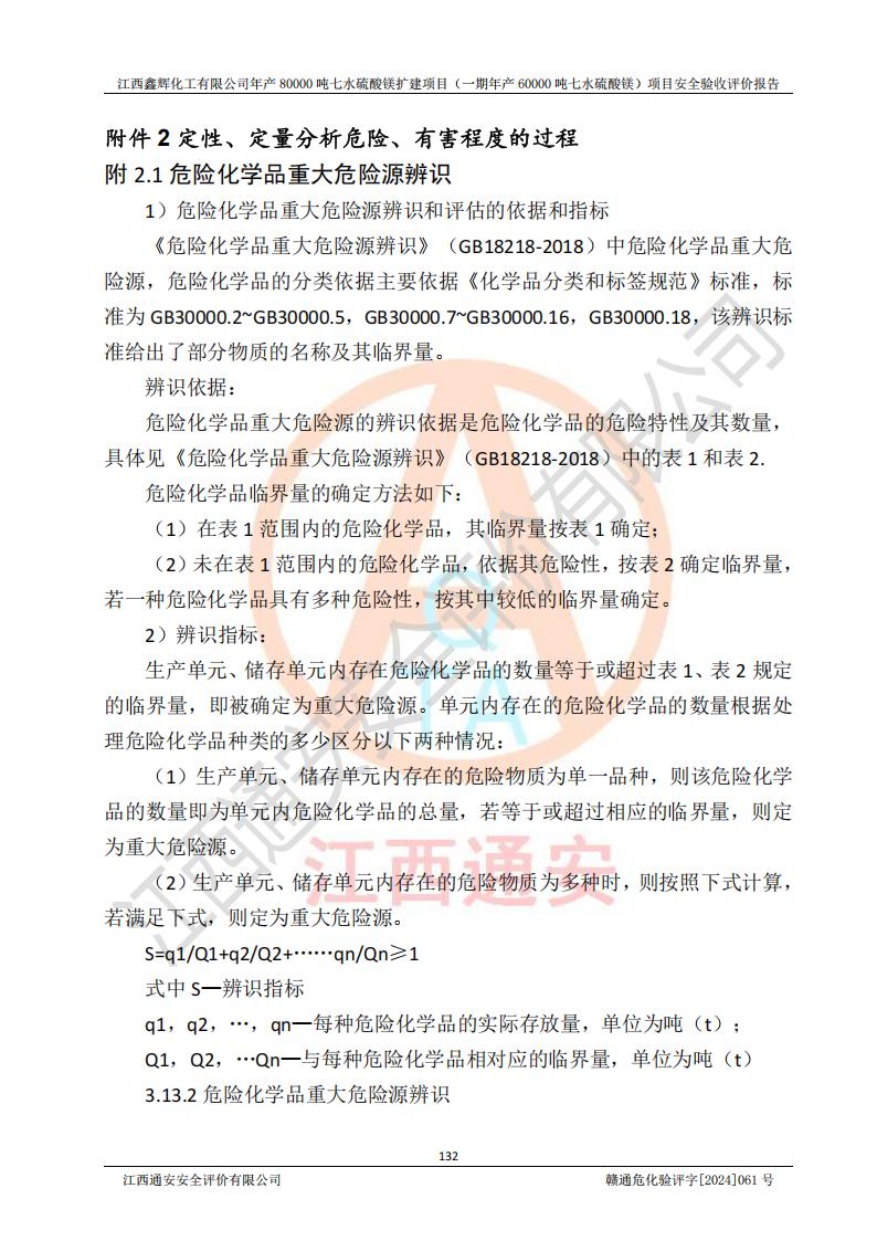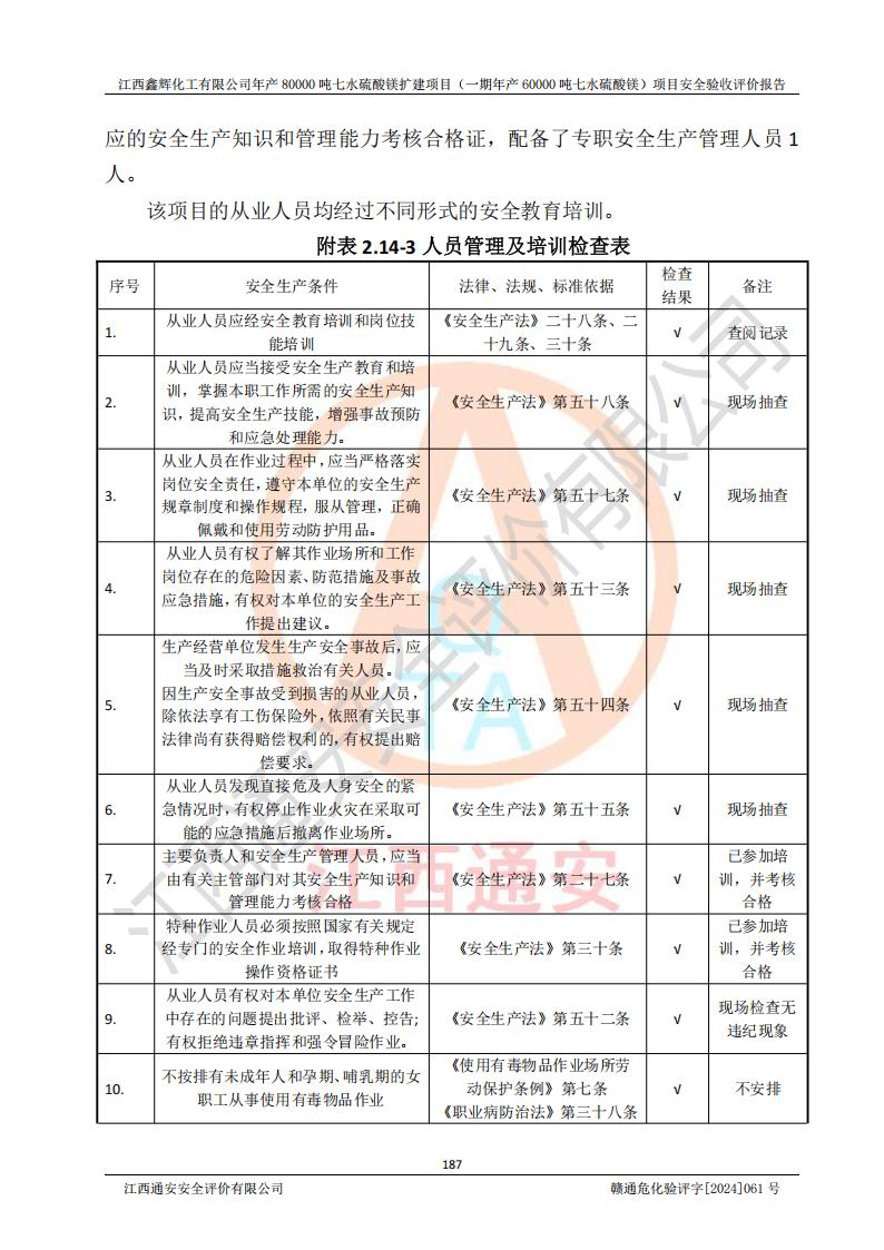 評價報告名稱 | 江西鑫輝化工有限公司年產(chǎn)80000噸七水硫酸鎂擴建項目(一期年產(chǎn)60000噸七水硫酸鎂)項目安全驗收評價 | |||