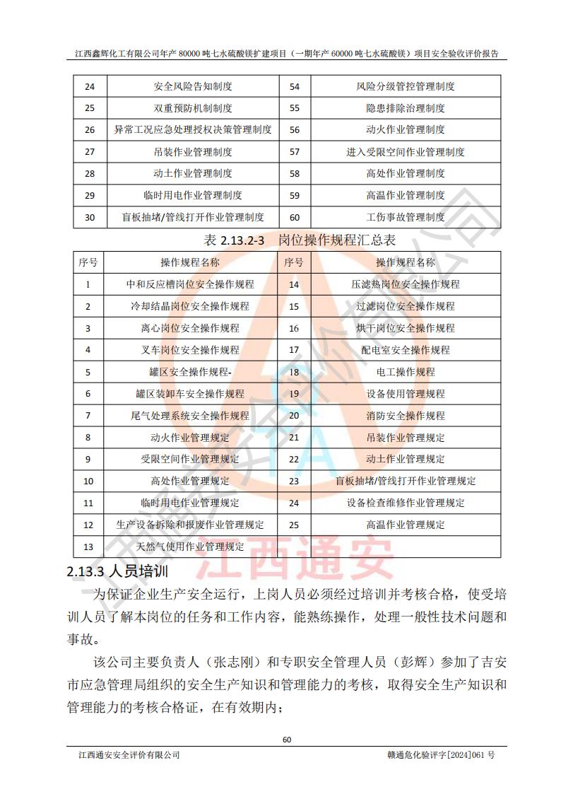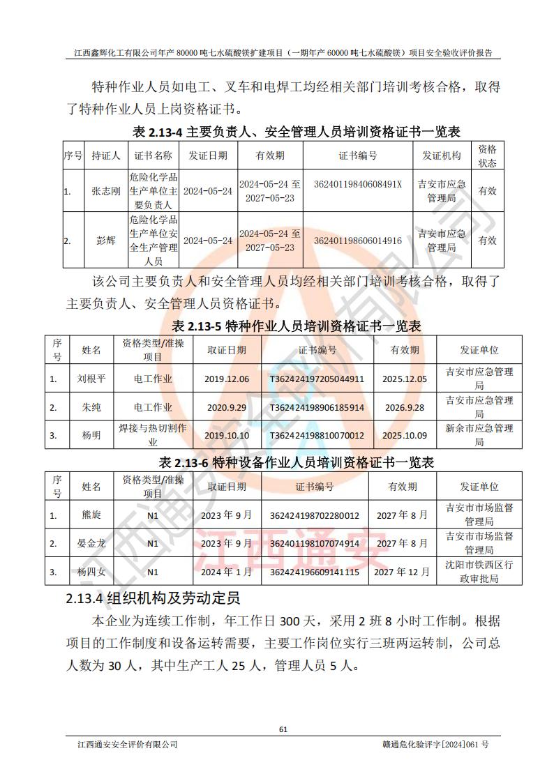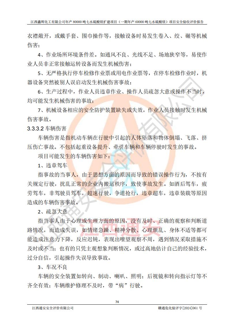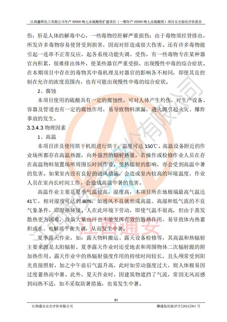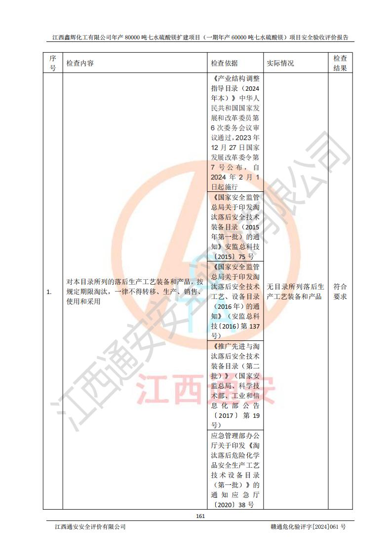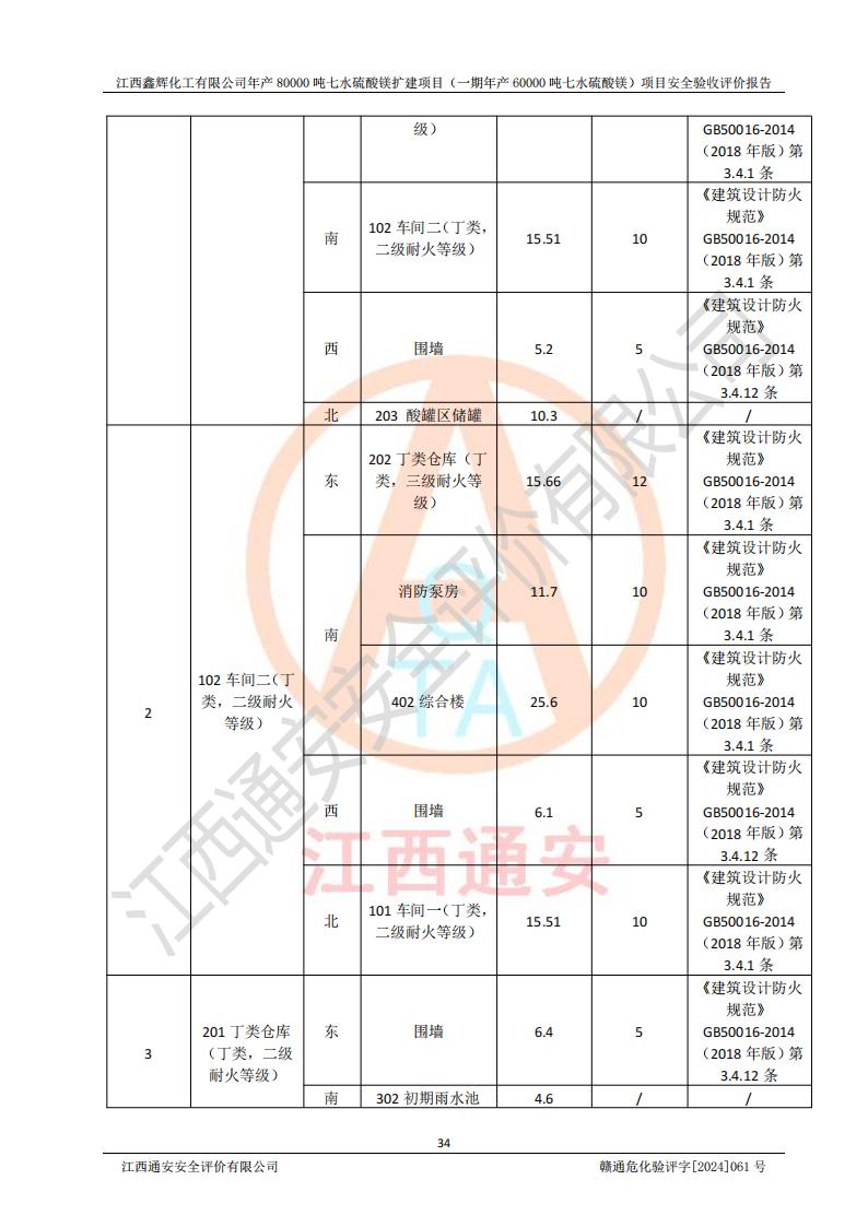 評價報告名稱 | 江西鑫輝化工有限公司年產(chǎn)80000噸七水硫酸鎂擴建項目(一期年產(chǎn)60000噸七水硫酸鎂)項目安全驗收評價 | |||