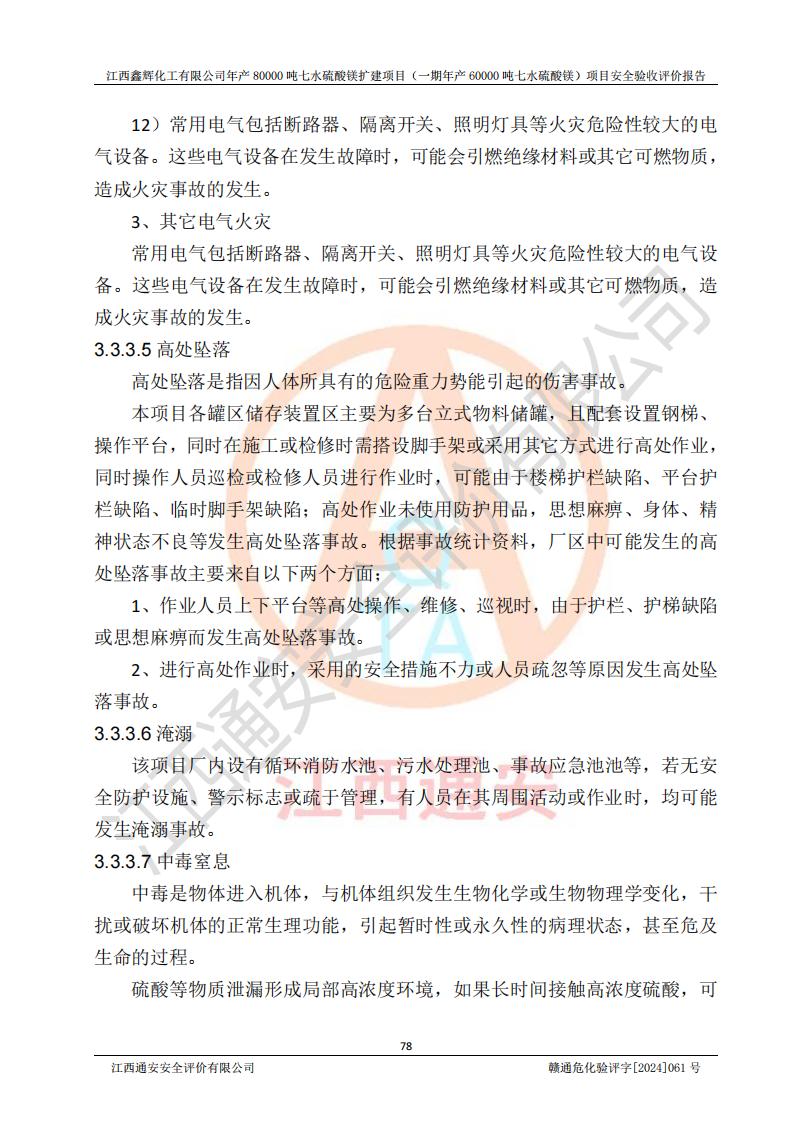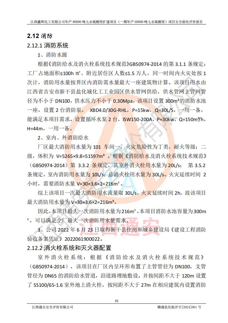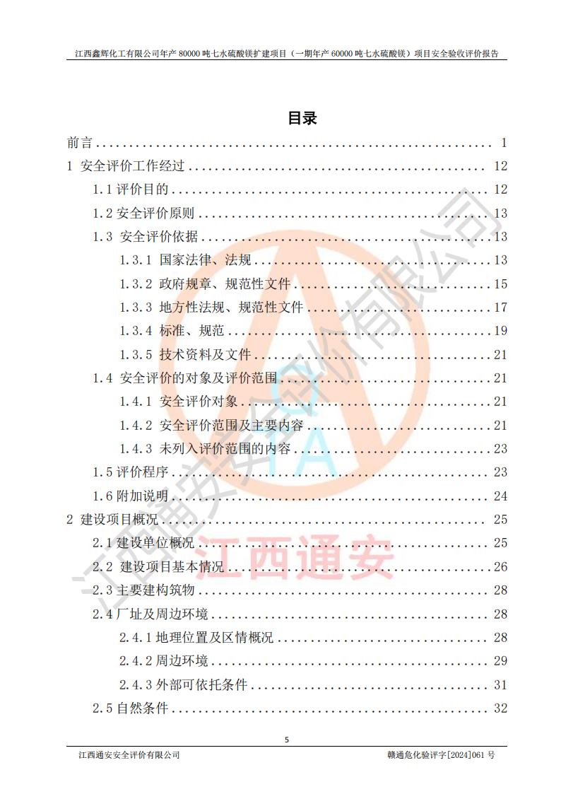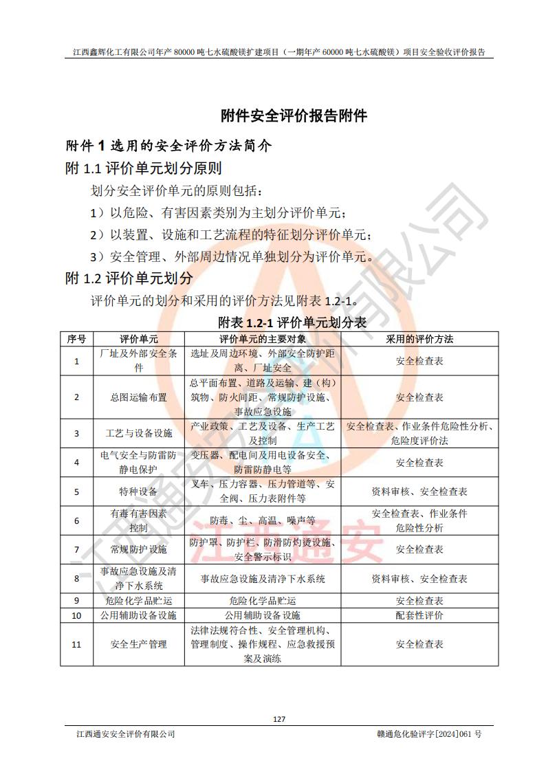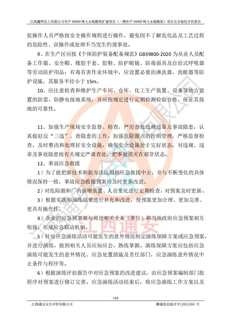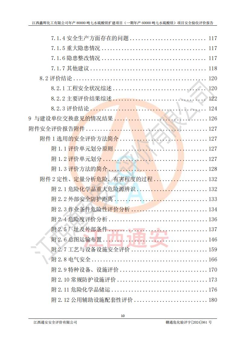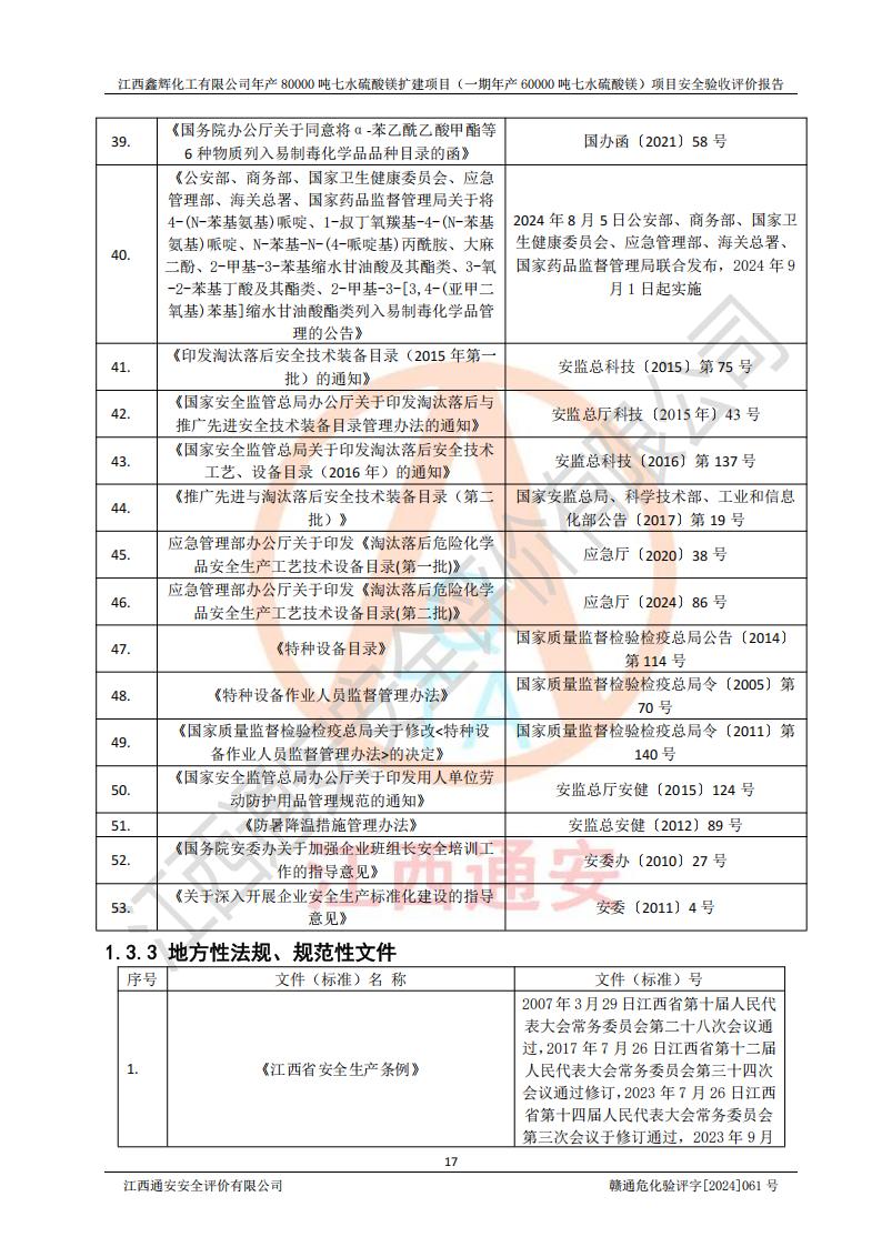 評價報告名稱 | 江西鑫輝化工有限公司年產(chǎn)80000噸七水硫酸鎂擴建項目(一期年產(chǎn)60000噸七水硫酸鎂)項目安全驗收評價 | |||