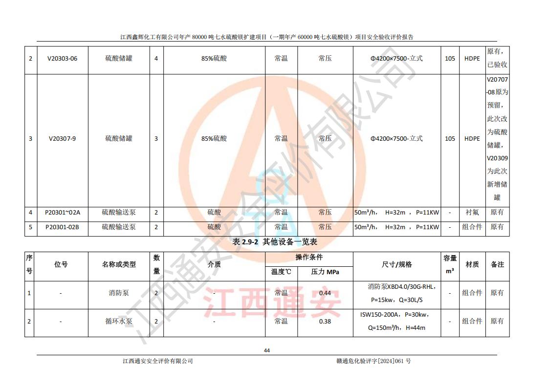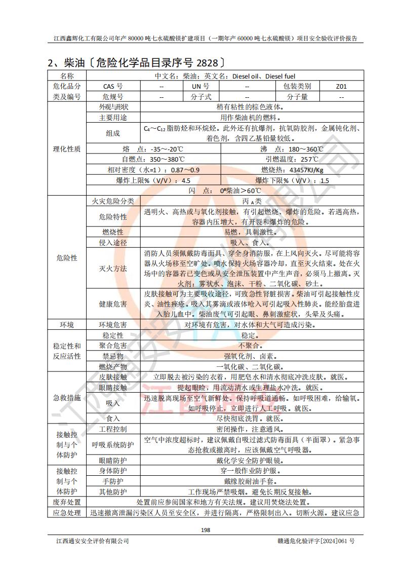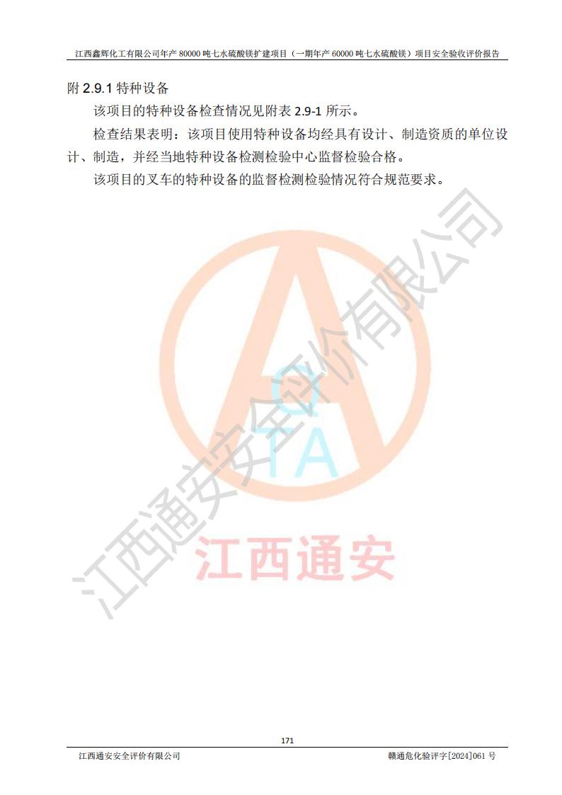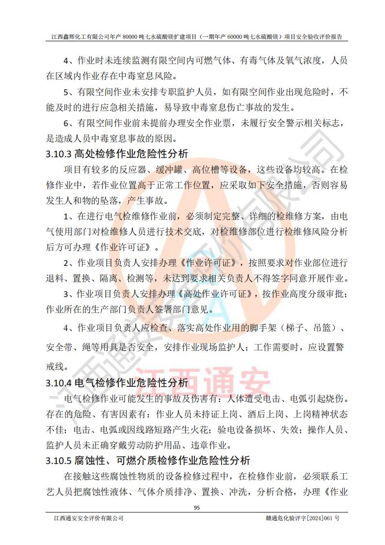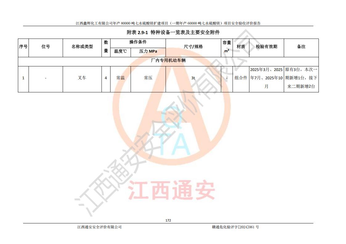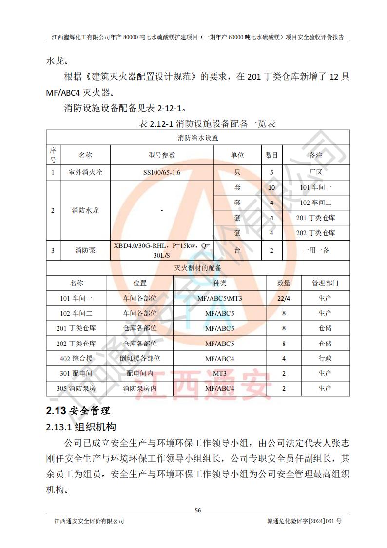 評價報告名稱 | 江西鑫輝化工有限公司年產(chǎn)80000噸七水硫酸鎂擴建項目(一期年產(chǎn)60000噸七水硫酸鎂)項目安全驗收評價 | |||